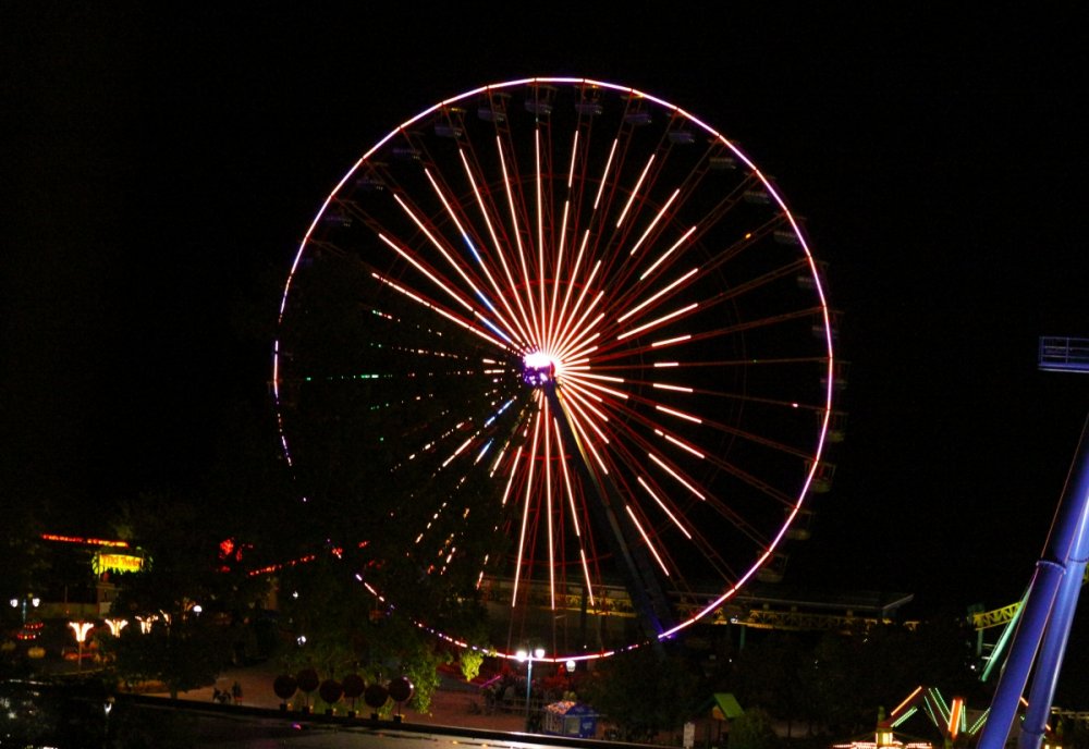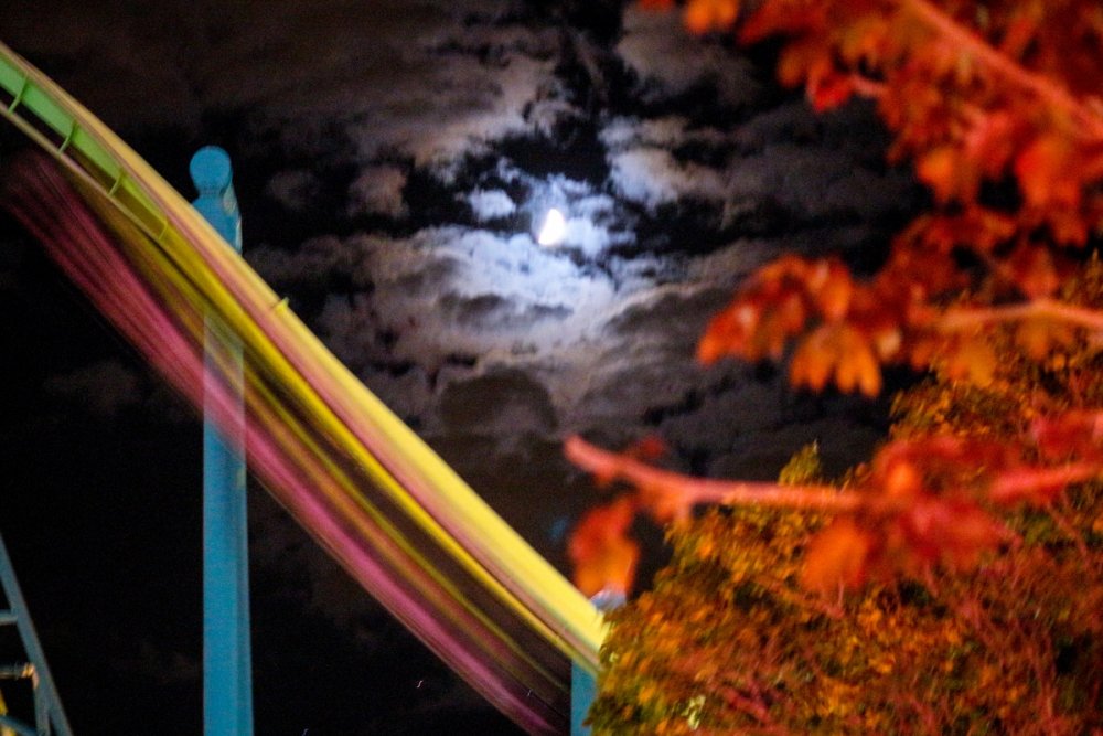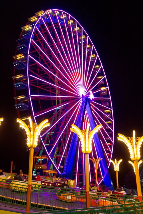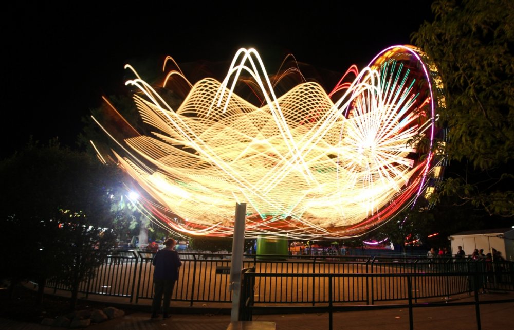 I used a trash can and my camera bag as a tripod and shot in shutter priority. I played with a bunch of different times during the ride cycle. This one ended up being 1.6 seconds. Auto ISO which was 125. I wish I had the know-how to just calculate this on the first shot - but it is trial and error sometimes - I'm pretty comfortable with these type of shots now and can usually get what I have in my mind now. Just shoot a bunch and look at the settings on the good shots - then start with those settings next time. I was curious and checked - I took 13 shots during the ride cycle with various shutter speeds and the ride at various heights. Most were good - but this one just stood out a little more. The fact that the person was so still in that shot is what made me pick that one! Glad you noticed!