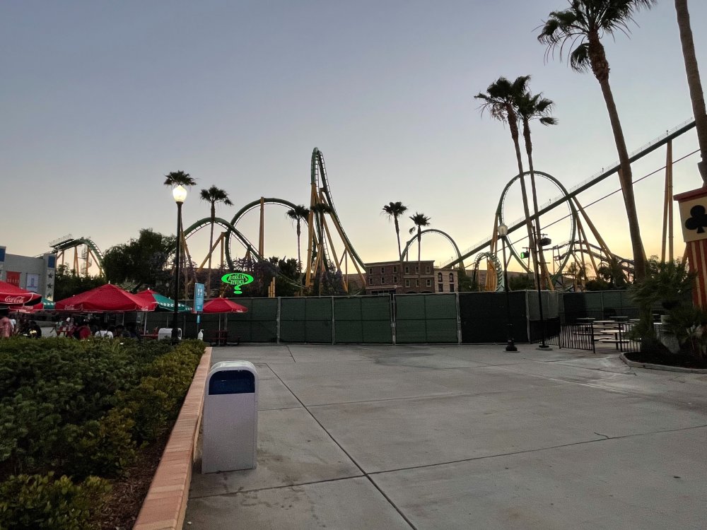 did a quick half lap of the park to see the progress on the upcoming project… for those wondering, this is the extent of the 50th anniversary decorations. Big miss IMO to not reopen sky tower and the museum they used to have up there as part of this. the new mask policy. They are not checking vaccine status, so it’s on an honor system. I saw maybe 10 people wearing masks (the employees still are), so if you’re still worried about COVID even after you’ve been vaccinated, theme parks are most certainly not somewhere you will want to visit. For those who aren’t worried, come on back and enjoy the parks back to full operation! food service still appears to be a struggle. I overheard chatter from an employee talking to another employee that the mobile app ordering may have crashed. Tidal Wave is gone and the construction fences have engulfed the entire area that used to be tidal wave, the plaza in front of RRv, and green lantern. There’s no good spots for aerial photos (follow the rules, no loose articles on rides!), so iPhone camera lens strategically placed up against the fence is the view we get. Looks like still very much in demolition mode and not construction for new ride yet.1 point