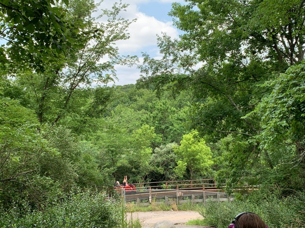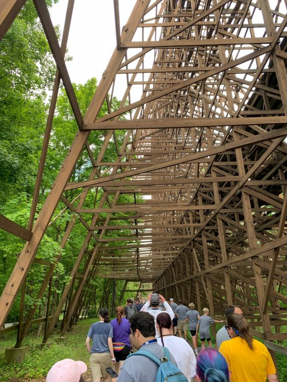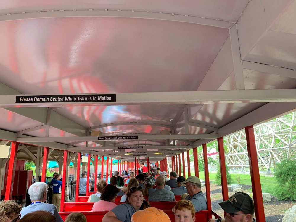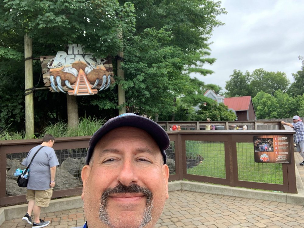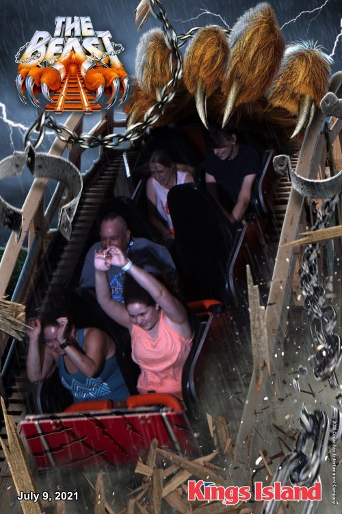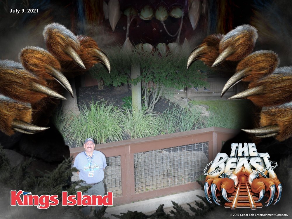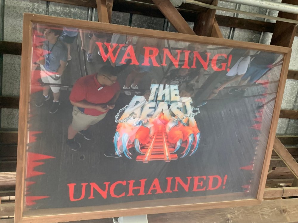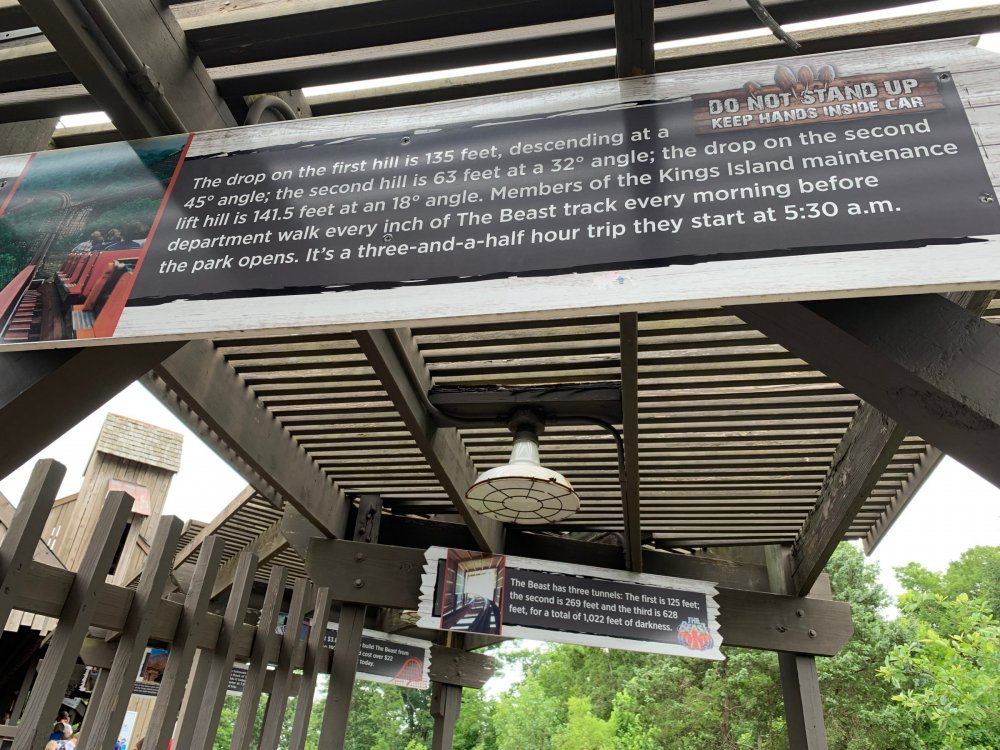 Day 1 continued. . . so it hit ~11am and we had joined what seemed like almost everyone at Coasterstock on the train - I mean, pretty much every seat was full Kim had never been on the Train at KI, and I was up for it, so while we waited to leave the station - which was about 10-15 minutes late moving out - we got to see that clearly the front gates had opened and we watched the "running of the bulls" for those coming to this side of the park for Mystic Timbers, as we could see the queue entrance to that from the train station. (as I witnessed from the front of the park the next day - where I was wanting my Starbucks at rope drop - just as many, if not more, headed to the left side of the park for Orion as headed to Mystic Timbers). see how packed this train is? it was so heavy, that the train barely - and I mean barely - could move. It was as if the train had never had so many people on it. . . as it slowly inched along, and I started muttering "i think I can, I think I can". . . .it was so hysterical when a slow moving van from Planet Snoopy was inching along next to us, seemingly trying it's best NOT to pass us, so we would seem like we were moving faster. anyways. . . as we slowly inched our way along the short, relatively unexciting track, I gave Kim a ton of crap (good naturedly) about what a waste of time this ride was. . LOL. being honest here. . it's a terrible ride, and not worth your time, tho it does have some saving grace in that you get some lovely shots of Diamondback, Mystic Timbers, and some of the woods that Beast Runs thru as you make the short circuit between the station near MT, and the Water Park. oh the engine is lovely, and the people operating it were great (tho it was very odd to me that the full train - full of Coasterstock folks, because remember, we were 1st ride of the day), still made a stop at the Waterpark - where no one exited, and a few folks did their best to squeeze on from that stop to join us on the train. I'd say the train really just functions as a mode of transportation to get to the park from the waterpark, if you don't want to walk it. so. . yeah. not worth your time, unless you really have some little ones who enjoy trains. But you can get some nice pics on the short length track - that takes a good 20 minutes due to the waterpark stop, and how slow the train was moving. you also cross over the rapids ride, which is nice, I suppose, tho this early in the day no one was riding it yet. got a pic of an empty raft tho. I had seen Chad about an hour earlier as we were exiting Mystic Timbers (and he made a valiant attempt to answer my question and explain to me why Kings Island doesn't have an apostrophe in it - the grammar nerd in me STILL disagrees, and thinks it should be "King's Dominion", LOL, but at least he tried to explain it to me in a way that made sense. .I just don't agree still), and I had asked him if the park would be opening their rapids ride, since the accident at AdventureLand was still fresh in the news. and he told me they would be operating it, so big Kudos to the park for this - they inspected their own ride, found no issues, and opened it up. what's this? OH MY GAWD. . . what's in the shed ?????? after the too short/way too long train ride, it was time to head to "the Beast" we had ERT on it later tonight, but I had held off long enough, so it was time to go over that way for a ride, and to finally - after wanting to ride it for decades - get a ride on this bucket list coaster. but first? had to stop and get some pics of Diamondback's splashdown feature as we headed towards Beast's queue. are we going the right way? these wonderful pawprints on the pavement indicate YES! still not quite to the ride yet, but the infamous sign was there, so of course I had to stop and get a pic. I noticed the lady behind me and tried to figure out what she was doing, and it turned out this was a "funpix spot" where you scan you card, and pose for the camera on your own. so I eagerly scanned the card, stood on the beast footprints like it tells you to, posed . . . . . and: um. . yeah. The camera doesn't capture the ride sign? whut? I laughed my ass off when I saw this come thru on my Funpix account about 20 minutes later. . . I mean. . what is the point if you get a shot of . . . grass ??? I guess the camera had moved and no one has ever reported it, and so you don't get the Beast sign in your picture? (it made me really glad I had taken the prior picture to get the sign). by the way, the only other self fun pix location I noticed in the park was over in Planet Snoopy, where you are supposed to pose in front of a green screen with arms up - and we did it. . but that picture never came thru. So maybe this is a thing that KI used to offer, and what's left are just the remnants of that, and the two spots are simply not maintained anymore? it was a little weird. but anyways. . . we were on our way just a little further up the hill to get in the queue for Beast! Orion across the park, certainly stands out.. whee! really love all the signage all over the station and queue for the Beast. This area of the ride/queue was really well themed and maintained. off my ride - row two - and I LOVED it (you can see Kim (in her pink hat) standing in line for Row one, as she and Joel waited for that row, while I walked onto row 2 the line was a good 20 minutes - so longer than it looks here, as the grouper was holding the line at the center of the station and only filling up each row as the prior train was getting ready to pull out. the only exception being row 1, that they were allowing folks to wait for. the girl in front of me put up her hands and that kinda blocks me. . but a big ol smile on my first ever ride on the Beast (and I kinda love how the girl sitting next to her in the front row appears to be ducking to avoid the piece of wood in the photo frame). after Kim and Joel got off their ride, I was really starting to get ready for some Starbucks - it was jus