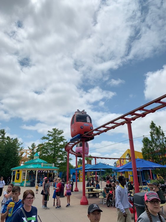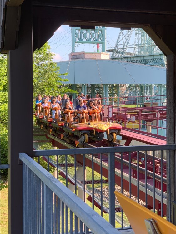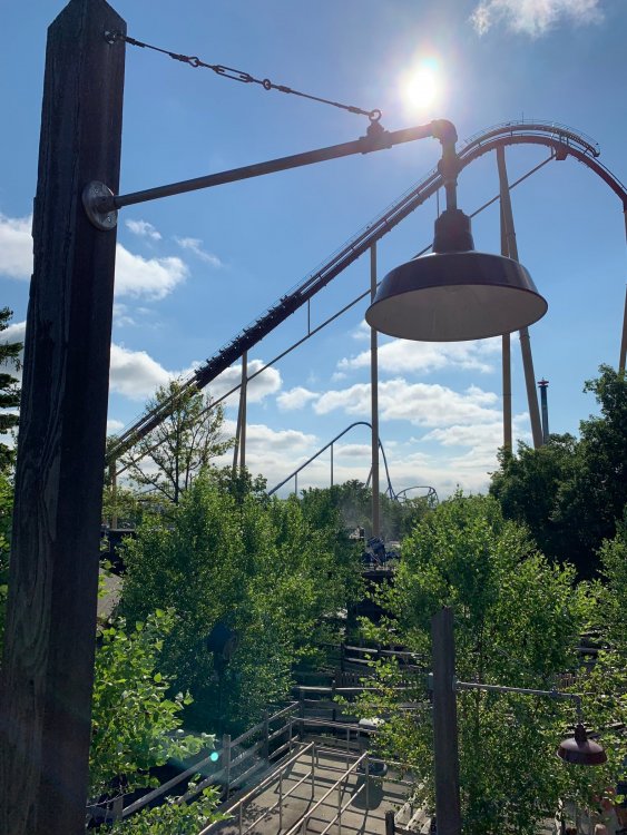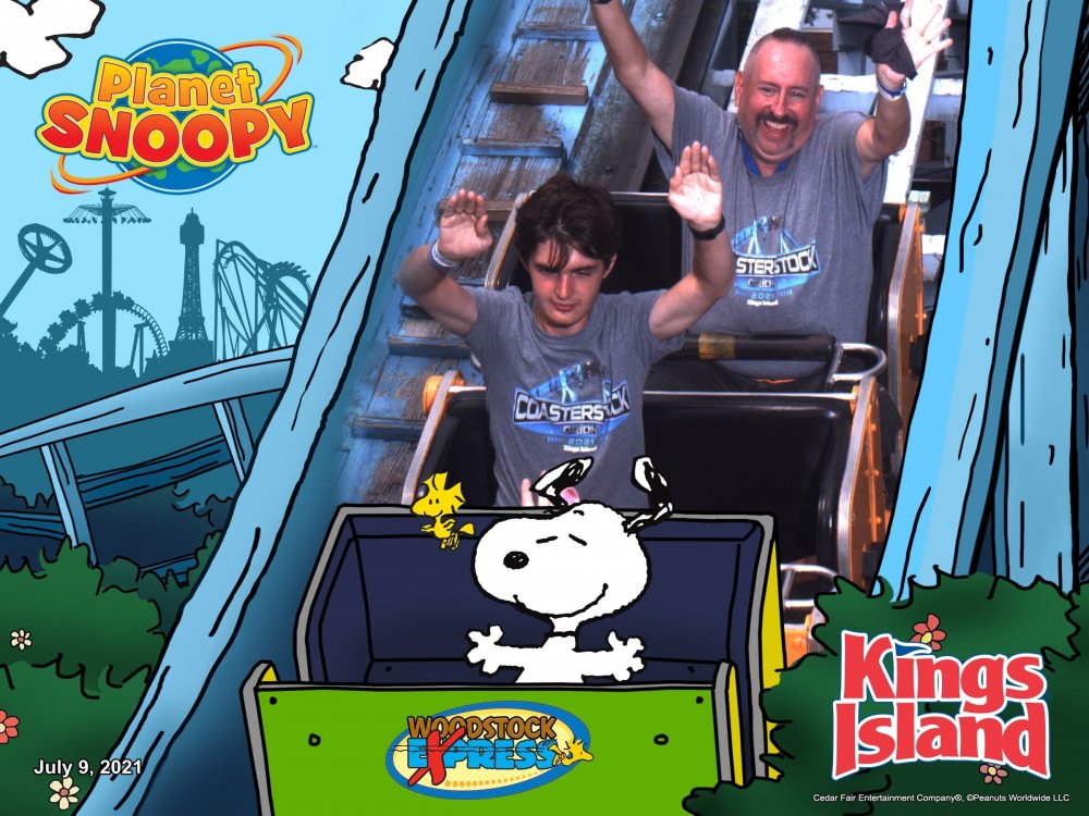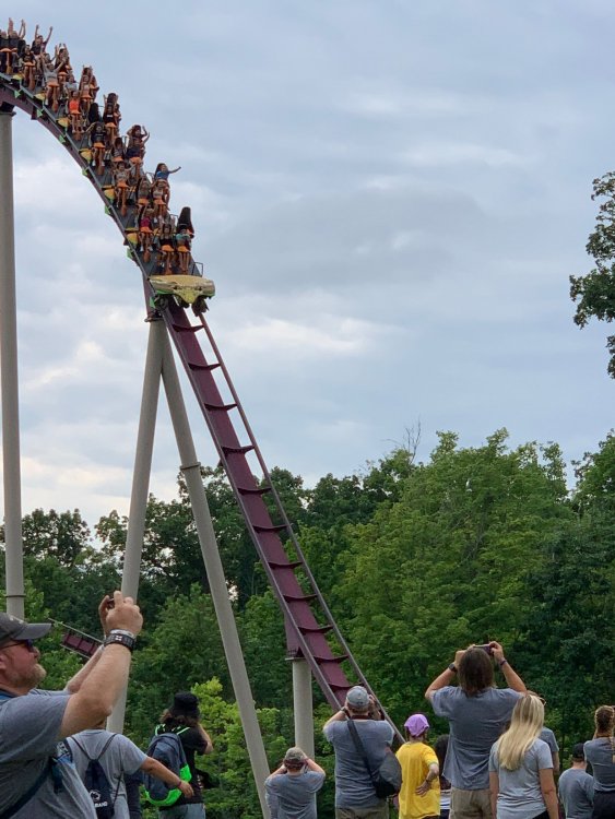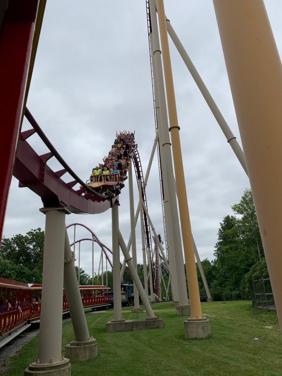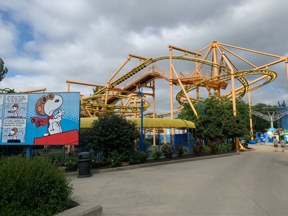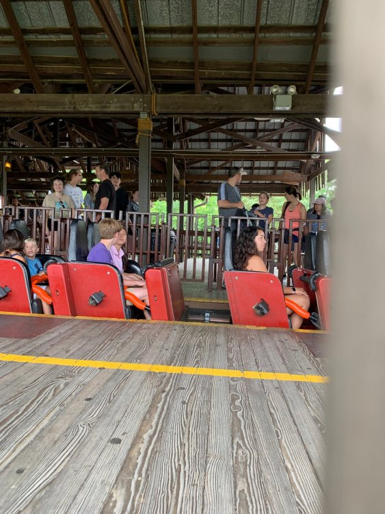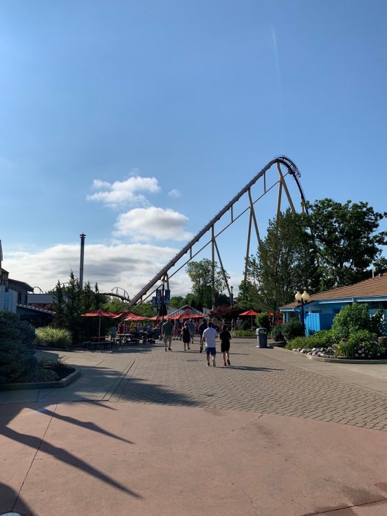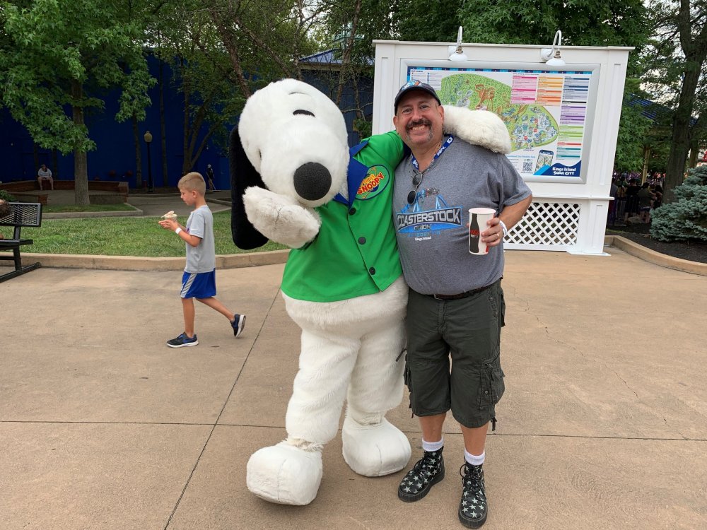 Friday, 7/9 - So I didn't sleep all that great, despite how tired I was, due to a mix of excitement & being in a room directly across from a stairwell. That typically wouldn't be much of an issue, but remember the hotel was sold out *and* one of the two elevators was not working. So that resulted in folks going in and out of that stairwell - and the resulting door slam behind them - up to ~3am. (I didn't complain, but I did, on the next night, put a towel down at the bottom of the door, so it won't slam shut, and that helped a lot. I believe we had planned to meet down in the lobby/breakfast area at 7:45, but I was up and ready by 7:15 anyways, so got ready (got peer pressured into wearing my Coasterstock shirt, even tho I felt like the kid that wears the concert shirt to school the day after the show!), and headed down to the lobby to partake in breakfast offerings. honestly, not bad at all. The Coffee left a LOT to be desired, but the omelettes (pre made, I'm sure) were decent and the hash brown patties and sausages were quite good. Lots of fresh fruit, oatmeal, dry cereal & waffles offered as well, but I didn't want to over-do it, since I tend not to be a breakfast person anyways. And we knew that there would be donuts offered at the ERT this morning by Diamondback anyways in a couple of hours. eventually Kim made her way down, then Joel, and by 8;20 we were in the car for the short trip across the freeway to Kings Island. I was so excited, I missed having my camera out to get the main entrance sign - even tho I was sitting in the back seat (thanks again for driving to the park each day, Kim!). But here's the view from the toll entrances at ~8:35 am. Coasterstock gets you free parking both days, and the parking opens ~2 1/2 hours before the park officially does. we parked pretty far up in the lot, and here's my first view of this wonderful place from the parking lot: yes, I'm a nerd. . even the Kings Island logo on the trash can excited me. . LOL we made our way up to the front gates, stopping for pics along the way (well. . I was stopping, and they kept waiting for me - hey, they'd been there before. . 1st time for me!) and we got thru the security gates eventually, and lined up for the main gates to open up for us right at 9am (during that short wait in line, Don & Chad - who organized the whole shebang went up and down the line saying good morning to everyone, and double-checking that everyone had their coaster club membership card (for whichever club/clubs they are a member of) . . Don and I briefly chatted about Carousels (we had discussed via email how excited I was about the Carousel ERT/anniversary) and then the gates were officially open, and I stepped foot into Kings Island. and who do we meet literally seconds after going thru the turnstiles into the park? Why we bump into Stacy Gretchen - who I last saw at Cedar Point on the TPR 2018 USA tour I introduced her to Kim & Joel, and we ended up seeing her (and her friends Adam & John many times during the event - including sitting with Stacy and John at dinner both nights. TPR representing! the morning's first ERT was at Mystic Timbers and Great Pumpkin Coaster (and then overlapping with Diamondback & Flying Ace Arial Chase), so I / we followed the crowd thru Camp Snoopy, and headed over to Diamondback. Yes, I rode Wilderness Run at Coastermania! at Cedar Point back in 2017, but that was historical as the 1st Intamin. I really had no interest, whatsoever, in riding a roller-skater loop kiddie coaster (tho it did get a bit of a line, as those with no shame lined up to get on it). I didn't *need* the credit tho, so we kept walking towards Diamondback. I'm not familiar with this charity "A Kid Again" but it seems to be a similar organization to "Coasting for Kids" - and I loved that they have a dedicated statue just outside the Camp Snoopy area. .so of course I snapped a pic of it. the design work on this (Boo Blasters, I think it's called) was so great. it wasn't open yet, but we would ride it the next day, and it surprisingly is an Omnimover type ride, that's also a shooting ride) as many of my friends know. . I'm a photo-op whore - it's very difficult to get me to walk past a character photo opportunity (especially at a park i've never been to before). and remember, we were getting to Diamondback THRU Camp Snoopy. . . soooooooo edit: just noticed you can see the line for Great Pumpkin Coaster behind me in this pic LOL but we did eventually make it to Diamondback, and got in line for my first ever ride in Kings Island. and what a great ride to start with. Diamondback is an airtime machine! especially in the front car.. wow, your butt doesn't even touch the seat for the majority of the ride after the 1st drop. for 1st ride, I waited for front row, but it was so good, that we immediately got off and got back in line (something that's rather odd for me. . I usually ride once, move on to next thing, and then go back for rerides on things I liked later. . but this one was so good? twice in a row!) Front Row: and Row 2 (which was a little more rattly, due to wheel I think, but still amazing): after two rides (and a quick hop into the Donut line - which had gotten way shorter by now. . they had lots of varieties too - I had an eclair - and I remembered to pop some Tylenol to prepare myself for the day using the frozen orange juice they were handing out as well), we headed over to Mystic Timbers. it was time to find out what was in the shed! a peek at Race For Your Life, Charlie Brown's flume. . still empty this early in the morning. .but looked like a fun flume ride (and wet, as we would find out the next day) Ok, so "what's in the shed?" is way, way overhyped - even if Kim was disappointed that I didnt' get the full "experience" - although the tape deck lit up, there was no 80's music playing, and it didn't play for the whole time we were there, even tho I got multiple rides (I think 16 total) on MT. But I did get to see all 3 ending 