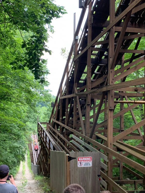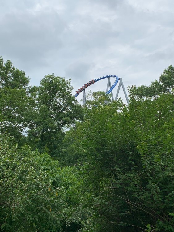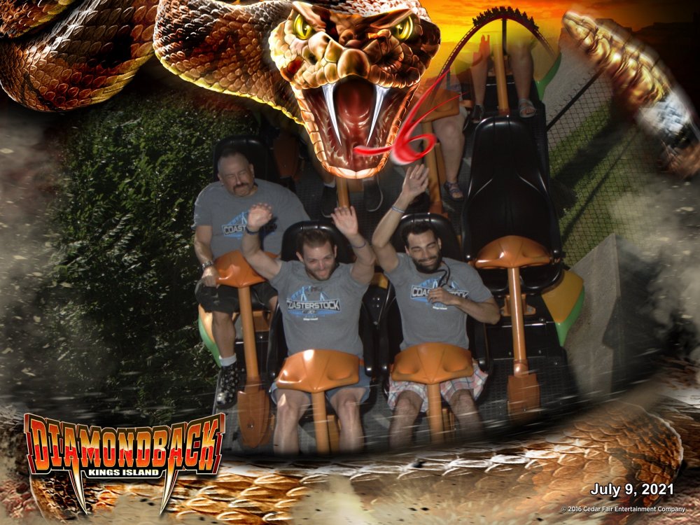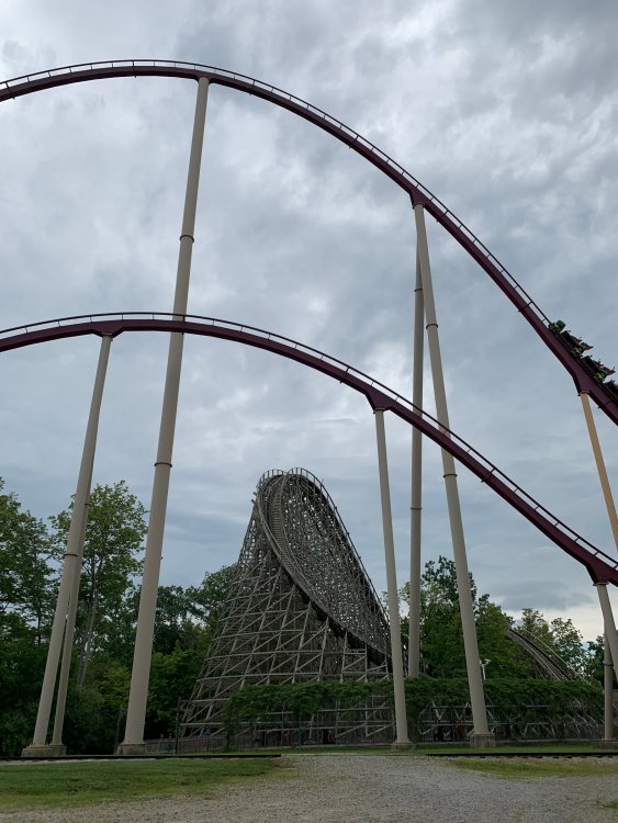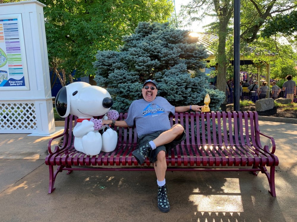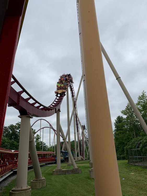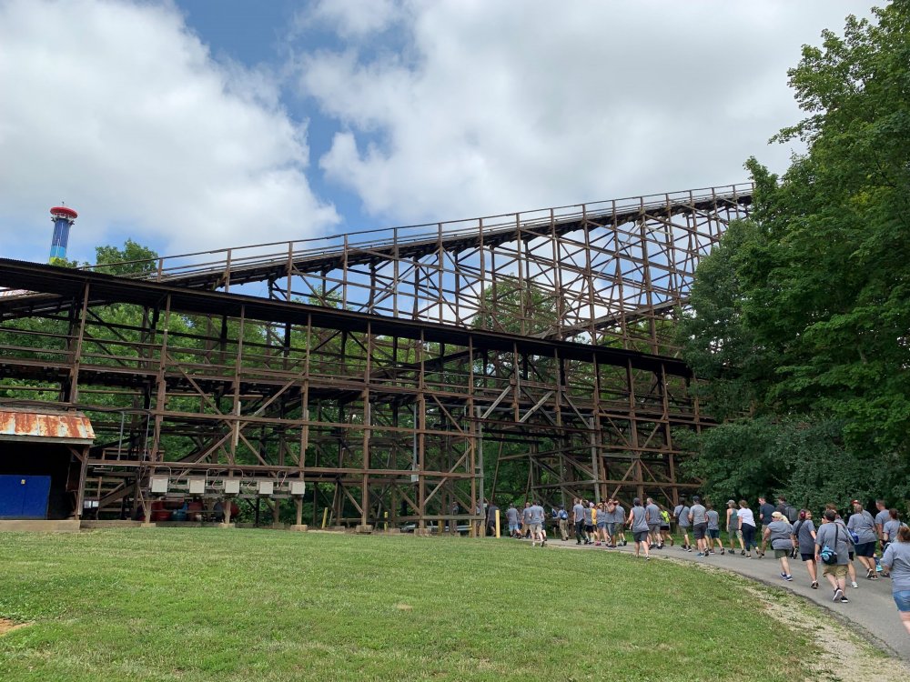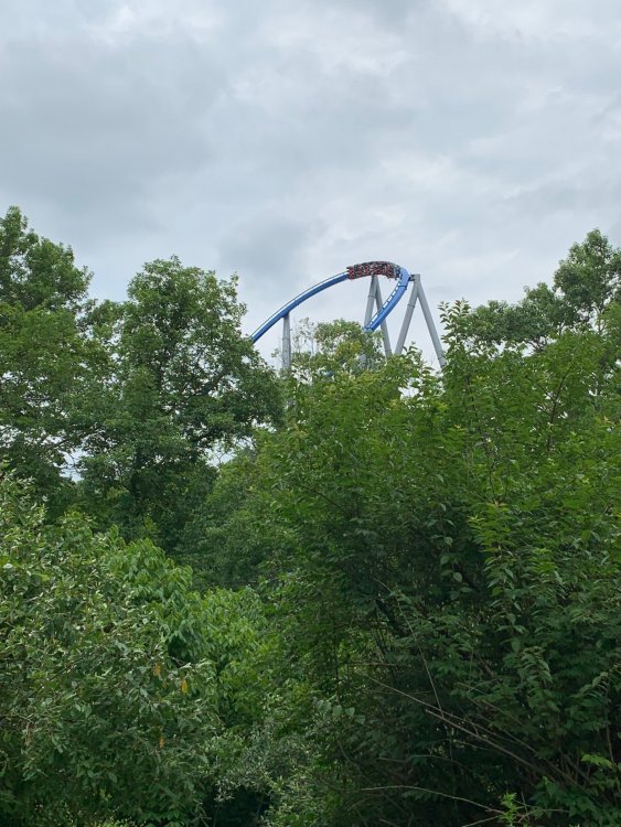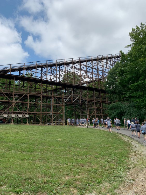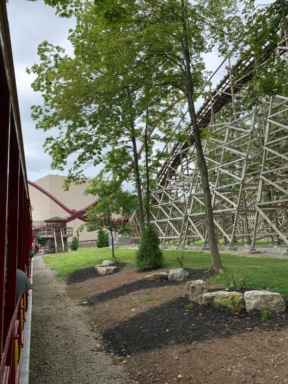 Friday, 7/9 - So I didn't sleep all that great, despite how tired I was, due to a mix of excitement & being in a room directly across from a stairwell. That typically wouldn't be much of an issue, but remember the hotel was sold out *and* one of the two elevators was not working. So that resulted in folks going in and out of that stairwell - and the resulting door slam behind them - up to ~3am. (I didn't complain, but I did, on the next night, put a towel down at the bottom of the door, so it won't slam shut, and that helped a lot. I believe we had planned to meet down in the lobby/breakfast area at 7:45, but I was up and ready by 7:15 anyways, so got ready (got peer pressured into wearing my Coasterstock shirt, even tho I felt like the kid that wears the concert shirt to school the day after the show!), and headed down to the lobby to partake in breakfast offerings. honestly, not bad at all. The Coffee left a LOT to be desired, but the omelettes (pre made, I'm sure) were decent and the hash brown patties and sausages were quite good. Lots of fresh fruit, oatmeal, dry cereal & waffles offered as well, but I didn't want to over-do it, since I tend not to be a breakfast person anyways. And we knew that there would be donuts offered at the ERT this morning by Diamondback anyways in a couple of hours. eventually Kim made her way down, then Joel, and by 8;20 we were in the car for the short trip across the freeway to Kings Island. I was so excited, I missed having my camera out to get the main entrance sign - even tho I was sitting in the back seat (thanks again for driving to the park each day, Kim!). But here's the view from the toll entrances at ~8:35 am. Coasterstock gets you free parking both days, and the parking opens ~2 1/2 hours before the park officially does. we parked pretty far up in the lot, and here's my first view of this wonderful place from the parking lot: yes, I'm a nerd. . even the Kings Island logo on the trash can excited me. . LOL we made our way up to the front gates, stopping for pics along the way (well. . I was stopping, and they kept waiting for me - hey, they'd been there before. . 1st time for me!) and we got thru the security gates eventually, and lined up for the main gates to open up for us right at 9am (during that short wait in line, Don & Chad - who organized the whole shebang went up and down the line saying good morning to everyone, and double-checking that everyone had their coaster club membership card (for whichever club/clubs they are a member of) . . Don and I briefly chatted about Carousels (we had discussed via email how excited I was about the Carousel ERT/anniversary) and then the gates were officially open, and I stepped foot into Kings Island. and who do we meet literally seconds after going thru the turnstiles into the park? Why we bump into Stacy Gretchen - who I last saw at Cedar Point on the TPR 2018 USA tour I introduced her to Kim & Joel, and we ended up seeing her (and her friends Adam & John many times during the event - including sitting with Stacy and John at dinner both nights. TPR representing! the morning's first ERT was at Mystic Timbers and Great Pumpkin Coaster (and then overlapping with Diamondback & Flying Ace Arial Chase), so I / we followed the crowd thru Camp Snoopy, and headed over to Diamondback. Yes, I rode Wilderness Run at Coastermania! at Cedar Point back in 2017, but that was historical as the 1st Intamin. I really had no interest, whatsoever, in riding a roller-skater loop kiddie coaster (tho it did get a bit of a line, as those with no shame lined up to get on it). I didn't *need* the credit tho, so we kept walking towards Diamondback. I'm not familiar with this charity "A Kid Again" but it seems to be a similar organization to "Coasting for Kids" - and I loved that they have a dedicated statue just outside the Camp Snoopy area. .so of course I snapped a pic of it. the design work on this (Boo Blasters, I think it's called) was so great. it wasn't open yet, but we would ride it the next day, and it surprisingly is an Omnimover type ride, that's also a shooting ride) as many of my friends know. . I'm a photo-op whore - it's very difficult to get me to walk past a character photo opportunity (especially at a park i've never been to before). and remember, we were getting to Diamondback THRU Camp Snoopy. . . soooooooo edit: just noticed you can see the line for Great Pumpkin Coaster behind me in this pic LOL but we did eventually make it to Diamondback, and got in line for my first ever ride in Kings Island. and what a great ride to start with. Diamondback is an airtime machine! especially in the front car.. wow, your butt doesn't even touch the seat for the majority of the ride after the 1st drop. for 1st ride, I waited for front row, but it was so good, that we immediately got off and got back in line (something that's rather odd for me. . I usually ride once, move on to next thing, and then go back for rerides on things I liked later. . but this one was so good? twice in a row!) Front Row: and Row 2 (which was a little more rattly, due to wheel I think, but still amazing): after two rides (and a quick hop into the Donut line - which had gotten way shorter by now. . they had lots of varieties too - I had an eclair - and I remembered to pop some Tylenol to prepare myself for the day using the frozen orange juice they were handing out as well), we headed over to Mystic Timbers. it was time to find out what was in the shed! a peek at Race For Your Life, Charlie Brown's flume. . still empty this early in the morning. .but looked like a fun flume ride (and wet, as we would find out the next day) Ok, so "what's in the shed?" is way, way overhyped - even if Kim was disappointed that I didnt' get the full "experience" - although the tape deck lit up, there was no 80's music playing, and it didn't play for the whole time we were there, even tho I got multiple rides (I think 16 total) on MT. But I did get to see all 3 ending 