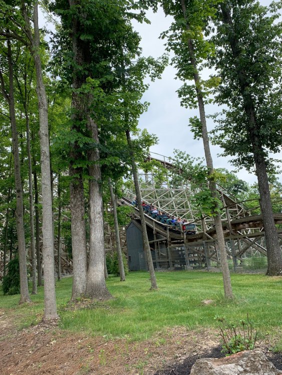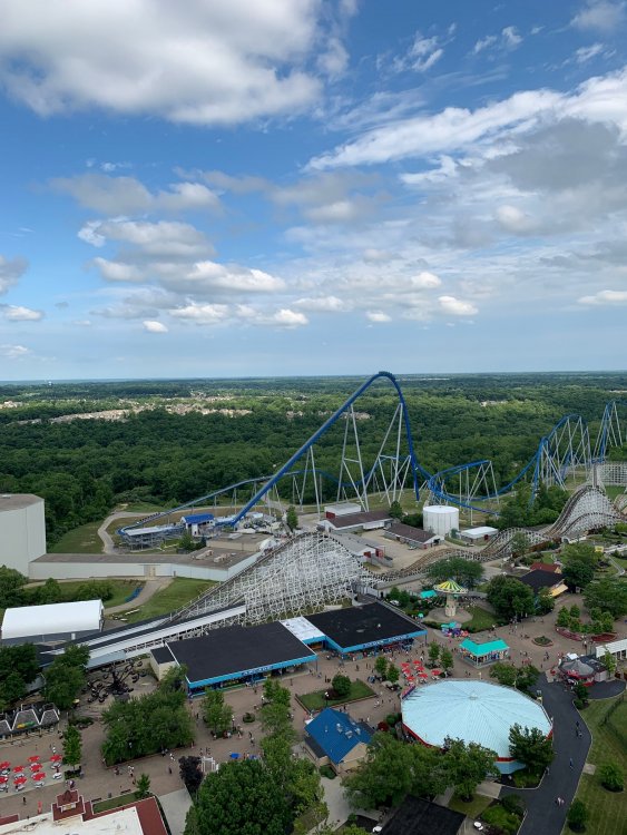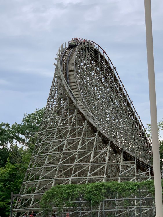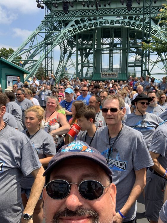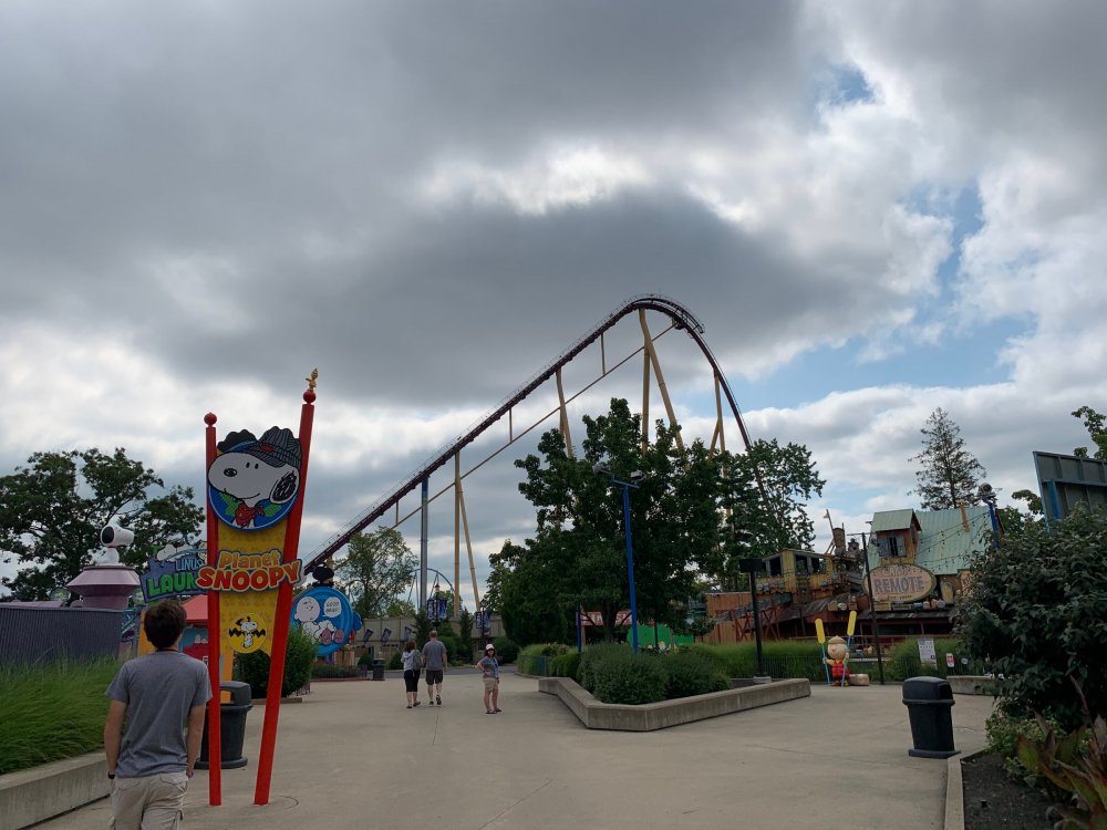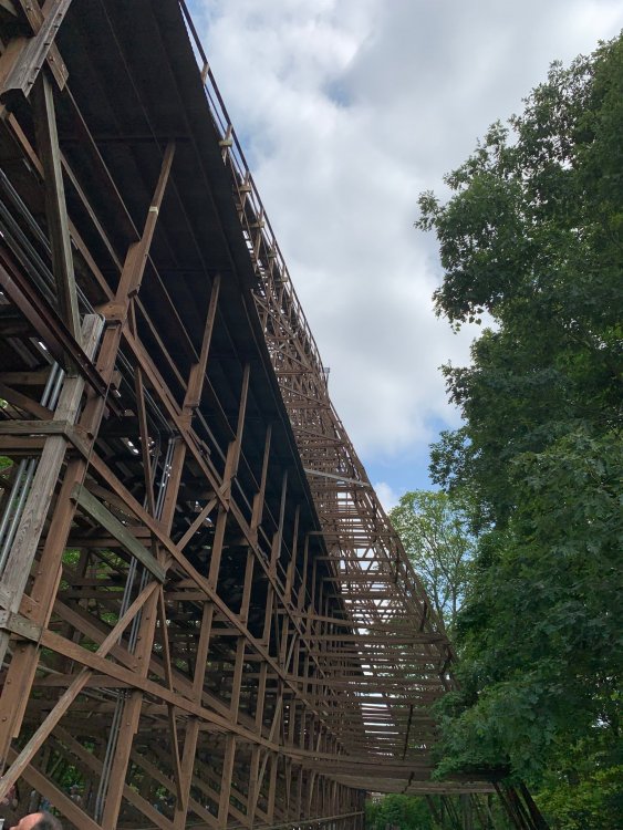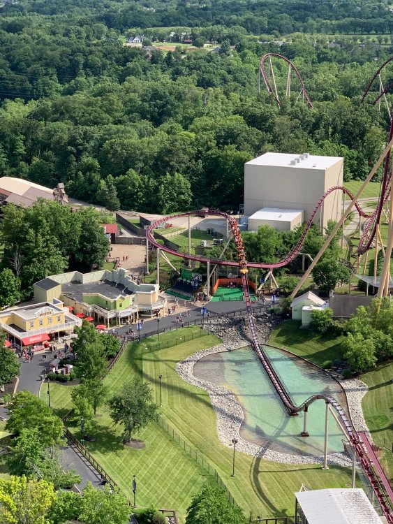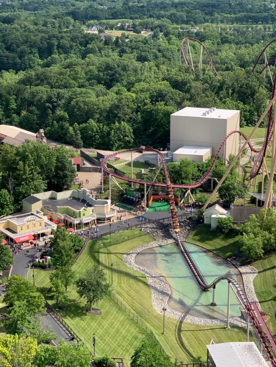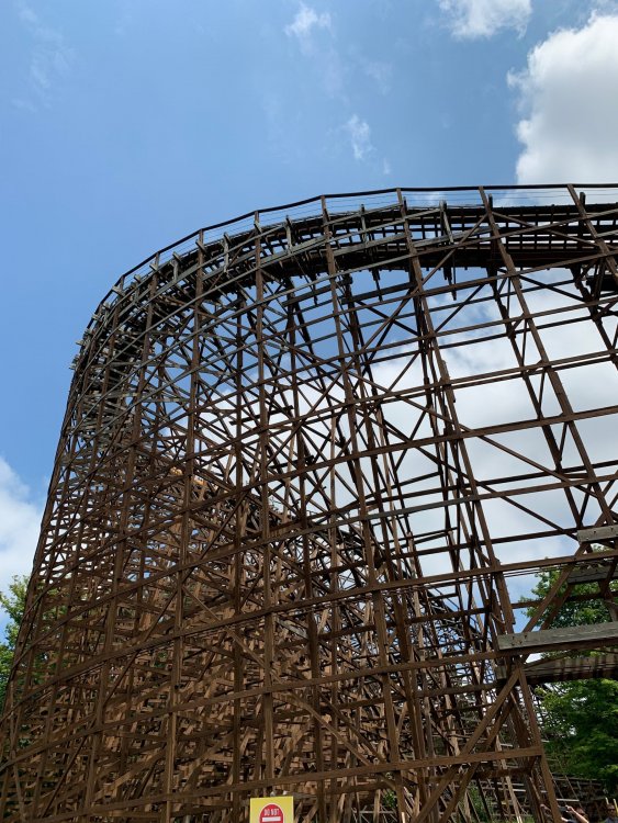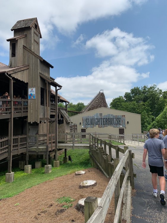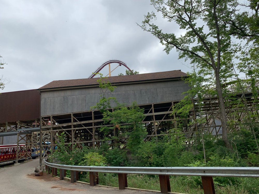 Friday, 7/9 - So I didn't sleep all that great, despite how tired I was, due to a mix of excitement & being in a room directly across from a stairwell. That typically wouldn't be much of an issue, but remember the hotel was sold out *and* one of the two elevators was not working. So that resulted in folks going in and out of that stairwell - and the resulting door slam behind them - up to ~3am. (I didn't complain, but I did, on the next night, put a towel down at the bottom of the door, so it won't slam shut, and that helped a lot. I believe we had planned to meet down in the lobby/breakfast area at 7:45, but I was up and ready by 7:15 anyways, so got ready (got peer pressured into wearing my Coasterstock shirt, even tho I felt like the kid that wears the concert shirt to school the day after the show!), and headed down to the lobby to partake in breakfast offerings. honestly, not bad at all. The Coffee left a LOT to be desired, but the omelettes (pre made, I'm sure) were decent and the hash brown patties and sausages were quite good. Lots of fresh fruit, oatmeal, dry cereal & waffles offered as well, but I didn't want to over-do it, since I tend not to be a breakfast person anyways. And we knew that there would be donuts offered at the ERT this morning by Diamondback anyways in a couple of hours. eventually Kim made her way down, then Joel, and by 8;20 we were in the car for the short trip across the freeway to Kings Island. I was so excited, I missed having my camera out to get the main entrance sign - even tho I was sitting in the back seat (thanks again for driving to the park each day, Kim!). But here's the view from the toll entrances at ~8:35 am. Coasterstock gets you free parking both days, and the parking opens ~2 1/2 hours before the park officially does. we parked pretty far up in the lot, and here's my first view of this wonderful place from the parking lot: yes, I'm a nerd. . even the Kings Island logo on the trash can excited me. . LOL we made our way up to the front gates, stopping for pics along the way (well. . I was stopping, and they kept waiting for me - hey, they'd been there before. . 1st time for me!) and we got thru the security gates eventually, and lined up for the main gates to open up for us right at 9am (during that short wait in line, Don & Chad - who organized the whole shebang went up and down the line saying good morning to everyone, and double-checking that everyone had their coaster club membership card (for whichever club/clubs they are a member of) . . Don and I briefly chatted about Carousels (we had discussed via email how excited I was about the Carousel ERT/anniversary) and then the gates were officially open, and I stepped foot into Kings Island. and who do we meet literally seconds after going thru the turnstiles into the park? Why we bump into Stacy Gretchen - who I last saw at Cedar Point on the TPR 2018 USA tour I introduced her to Kim & Joel, and we ended up seeing her (and her friends Adam & John many times during the event - including sitting with Stacy and John at dinner both nights. TPR representing! the morning's first ERT was at Mystic Timbers and Great Pumpkin Coaster (and then overlapping with Diamondback & Flying Ace Arial Chase), so I / we followed the crowd thru Camp Snoopy, and headed over to Diamondback. Yes, I rode Wilderness Run at Coastermania! at Cedar Point back in 2017, but that was historical as the 1st Intamin. I really had no interest, whatsoever, in riding a roller-skater loop kiddie coaster (tho it did get a bit of a line, as those with no shame lined up to get on it). I didn't *need* the credit tho, so we kept walking towards Diamondback. I'm not familiar with this charity "A Kid Again" but it seems to be a similar organization to "Coasting for Kids" - and I loved that they have a dedicated statue just outside the Camp Snoopy area. .so of course I snapped a pic of it. the design work on this (Boo Blasters, I think it's called) was so great. it wasn't open yet, but we would ride it the next day, and it surprisingly is an Omnimover type ride, that's also a shooting ride) as many of my friends know. . I'm a photo-op whore - it's very difficult to get me to walk past a character photo opportunity (especially at a park i've never been to before). and remember, we were getting to Diamondback THRU Camp Snoopy. . . soooooooo edit: just noticed you can see the line for Great Pumpkin Coaster behind me in this pic LOL but we did eventually make it to Diamondback, and got in line for my first ever ride in Kings Island. and what a great ride to start with. Diamondback is an airtime machine! especially in the front car.. wow, your butt doesn't even touch the seat for the majority of the ride after the 1st drop. for 1st ride, I waited for front row, but it was so good, that we immediately got off and got back in line (something that's rather odd for me. . I usually ride once, move on to next thing, and then go back for rerides on things I liked later. . but this one was so good? twice in a row!) Front Row: and Row 2 (which was a little more rattly, due to wheel I think, but still amazing): after two rides (and a quick hop into the Donut line - which had gotten way shorter by now. . they had lots of varieties too - I had an eclair - and I remembered to pop some Tylenol to prepare myself for the day using the frozen orange juice they were handing out as well), we headed over to Mystic Timbers. it was time to find out what was in the shed! a peek at Race For Your Life, Charlie Brown's flume. . still empty this early in the morning. .but looked like a fun flume ride (and wet, as we would find out the next day) Ok, so "what's in the shed?" is way, way overhyped - even if Kim was disappointed that I didnt' get the full "experience" - although the tape deck lit up, there was no 80's music playing, and it didn't play for the whole time we were there, even tho I got multiple rides (I think 16 total) on MT. But I did get to see all 3 ending 