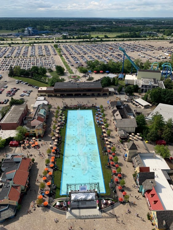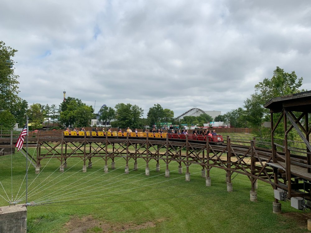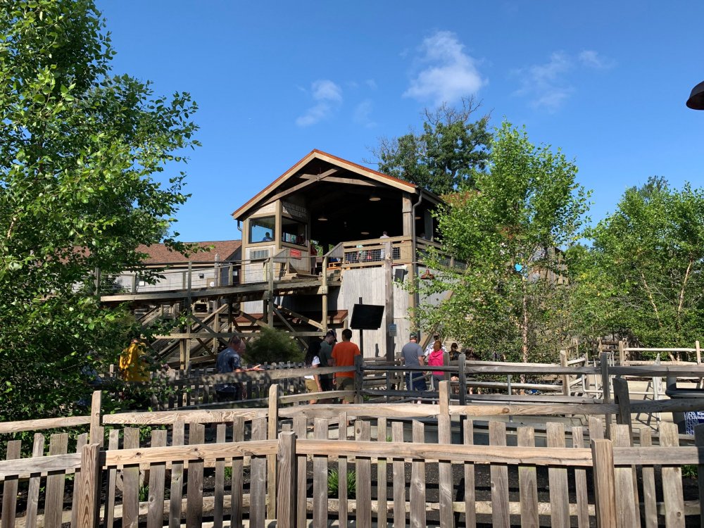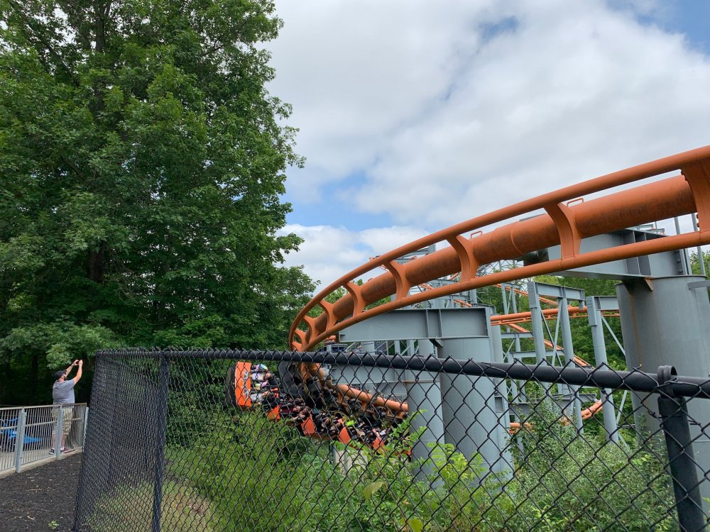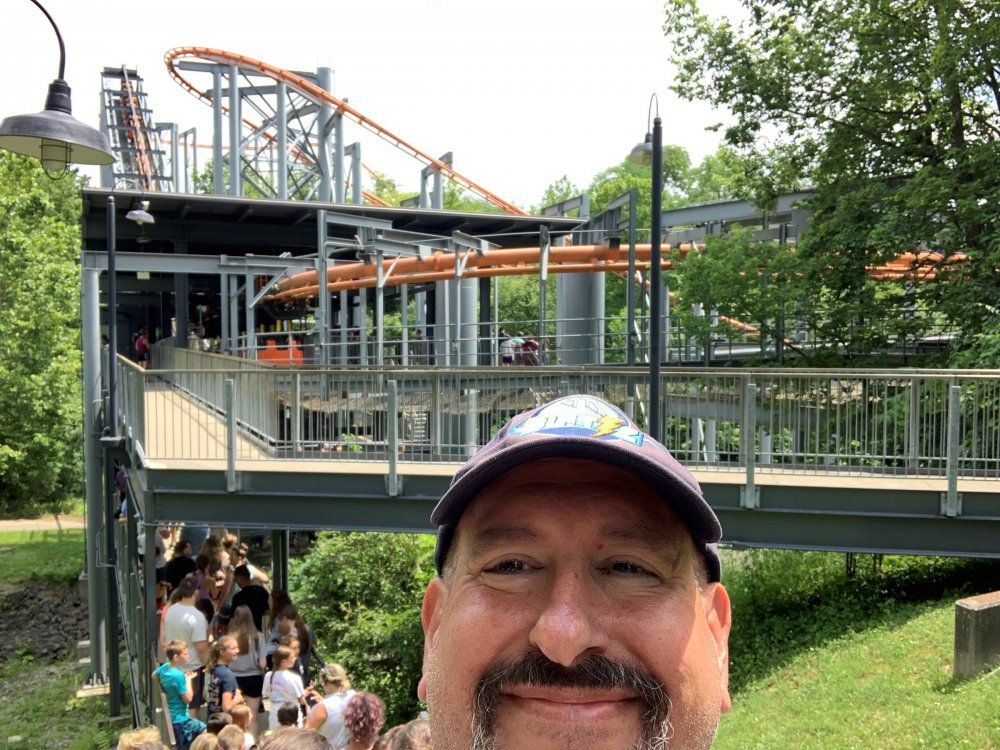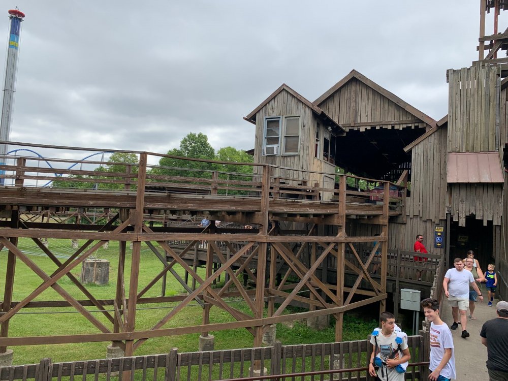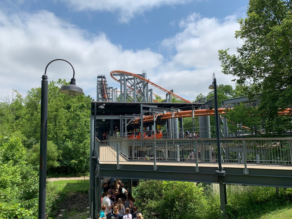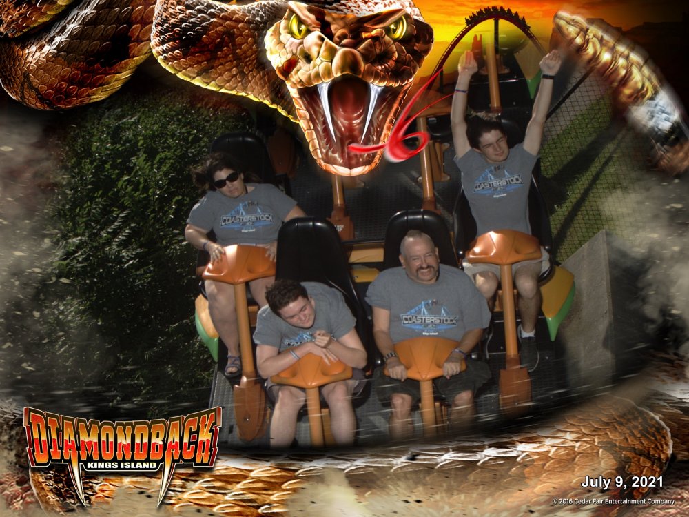 Friday, 7/9 - So I didn't sleep all that great, despite how tired I was, due to a mix of excitement & being in a room directly across from a stairwell. That typically wouldn't be much of an issue, but remember the hotel was sold out *and* one of the two elevators was not working. So that resulted in folks going in and out of that stairwell - and the resulting door slam behind them - up to ~3am. (I didn't complain, but I did, on the next night, put a towel down at the bottom of the door, so it won't slam shut, and that helped a lot. I believe we had planned to meet down in the lobby/breakfast area at 7:45, but I was up and ready by 7:15 anyways, so got ready (got peer pressured into wearing my Coasterstock shirt, even tho I felt like the kid that wears the concert shirt to school the day after the show!), and headed down to the lobby to partake in breakfast offerings. honestly, not bad at all. The Coffee left a LOT to be desired, but the omelettes (pre made, I'm sure) were decent and the hash brown patties and sausages were quite good. Lots of fresh fruit, oatmeal, dry cereal & waffles offered as well, but I didn't want to over-do it, since I tend not to be a breakfast person anyways. And we knew that there would be donuts offered at the ERT this morning by Diamondback anyways in a couple of hours. eventually Kim made her way down, then Joel, and by 8;20 we were in the car for the short trip across the freeway to Kings Island. I was so excited, I missed having my camera out to get the main entrance sign - even tho I was sitting in the back seat (thanks again for driving to the park each day, Kim!). But here's the view from the toll entrances at ~8:35 am. Coasterstock gets you free parking both days, and the parking opens ~2 1/2 hours before the park officially does. we parked pretty far up in the lot, and here's my first view of this wonderful place from the parking lot: yes, I'm a nerd. . even the Kings Island logo on the trash can excited me. . LOL we made our way up to the front gates, stopping for pics along the way (well. . I was stopping, and they kept waiting for me - hey, they'd been there before. . 1st time for me!) and we got thru the security gates eventually, and lined up for the main gates to open up for us right at 9am (during that short wait in line, Don & Chad - who organized the whole shebang went up and down the line saying good morning to everyone, and double-checking that everyone had their coaster club membership card (for whichever club/clubs they are a member of) . . Don and I briefly chatted about Carousels (we had discussed via email how excited I was about the Carousel ERT/anniversary) and then the gates were officially open, and I stepped foot into Kings Island. and who do we meet literally seconds after going thru the turnstiles into the park? Why we bump into Stacy Gretchen - who I last saw at Cedar Point on the TPR 2018 USA tour I introduced her to Kim & Joel, and we ended up seeing her (and her friends Adam & John many times during the event - including sitting with Stacy and John at dinner both nights. TPR representing! the morning's first ERT was at Mystic Timbers and Great Pumpkin Coaster (and then overlapping with Diamondback & Flying Ace Arial Chase), so I / we followed the crowd thru Camp Snoopy, and headed over to Diamondback. Yes, I rode Wilderness Run at Coastermania! at Cedar Point back in 2017, but that was historical as the 1st Intamin. I really had no interest, whatsoever, in riding a roller-skater loop kiddie coaster (tho it did get a bit of a line, as those with no shame lined up to get on it). I didn't *need* the credit tho, so we kept walking towards Diamondback. I'm not familiar with this charity "A Kid Again" but it seems to be a similar organization to "Coasting for Kids" - and I loved that they have a dedicated statue just outside the Camp Snoopy area. .so of course I snapped a pic of it. the design work on this (Boo Blasters, I think it's called) was so great. it wasn't open yet, but we would ride it the next day, and it surprisingly is an Omnimover type ride, that's also a shooting ride) as many of my friends know. . I'm a photo-op whore - it's very difficult to get me to walk past a character photo opportunity (especially at a park i've never been to before). and remember, we were getting to Diamondback THRU Camp Snoopy. . . soooooooo edit: just noticed you can see the line for Great Pumpkin Coaster behind me in this pic LOL but we did eventually make it to Diamondback, and got in line for my first ever ride in Kings Island. and what a great ride to start with. Diamondback is an airtime machine! especially in the front car.. wow, your butt doesn't even touch the seat for the majority of the ride after the 1st drop. for 1st ride, I waited for front row, but it was so good, that we immediately got off and got back in line (something that's rather odd for me. . I usually ride once, move on to next thing, and then go back for rerides on things I liked later. . but this one was so good? twice in a row!) Front Row: and Row 2 (which was a little more rattly, due to wheel I think, but still amazing): after two rides (and a quick hop into the Donut line - which had gotten way shorter by now. . they had lots of varieties too - I had an eclair - and I remembered to pop some Tylenol to prepare myself for the day using the frozen orange juice they were handing out as well), we headed over to Mystic Timbers. it was time to find out what was in the shed! a peek at Race For Your Life, Charlie Brown's flume. . still empty this early in the morning. .but looked like a fun flume ride (and wet, as we would find out the next day) Ok, so "what's in the shed?" is way, way overhyped - even if Kim was disappointed that I didnt' get the full "experience" - although the tape deck lit up, there was no 80's music playing, and it didn't play for the whole time we were there, even tho I got multiple rides (I think 16 total) on MT. But I did get to see all 3 ending 