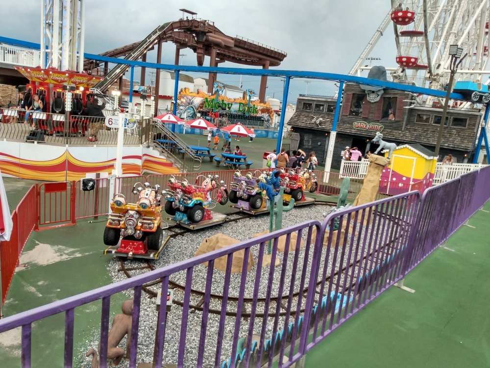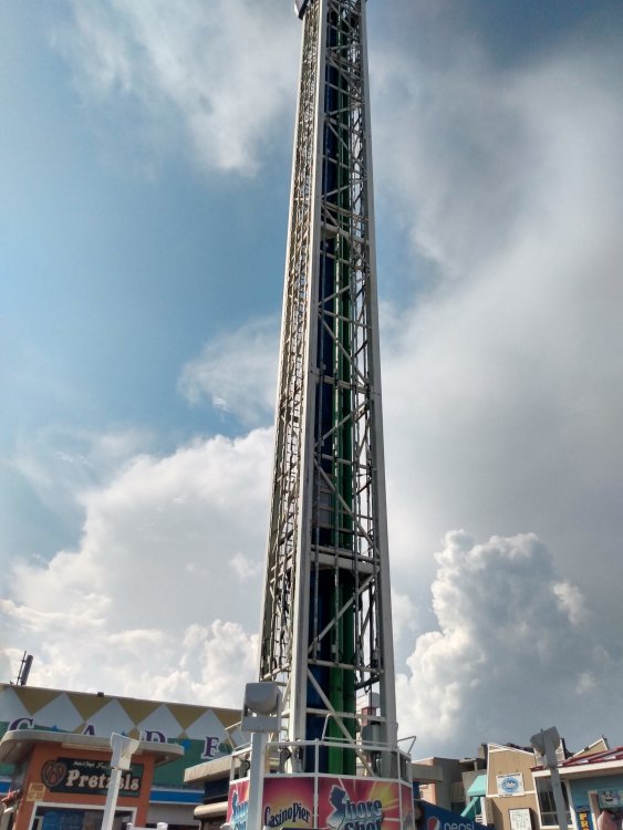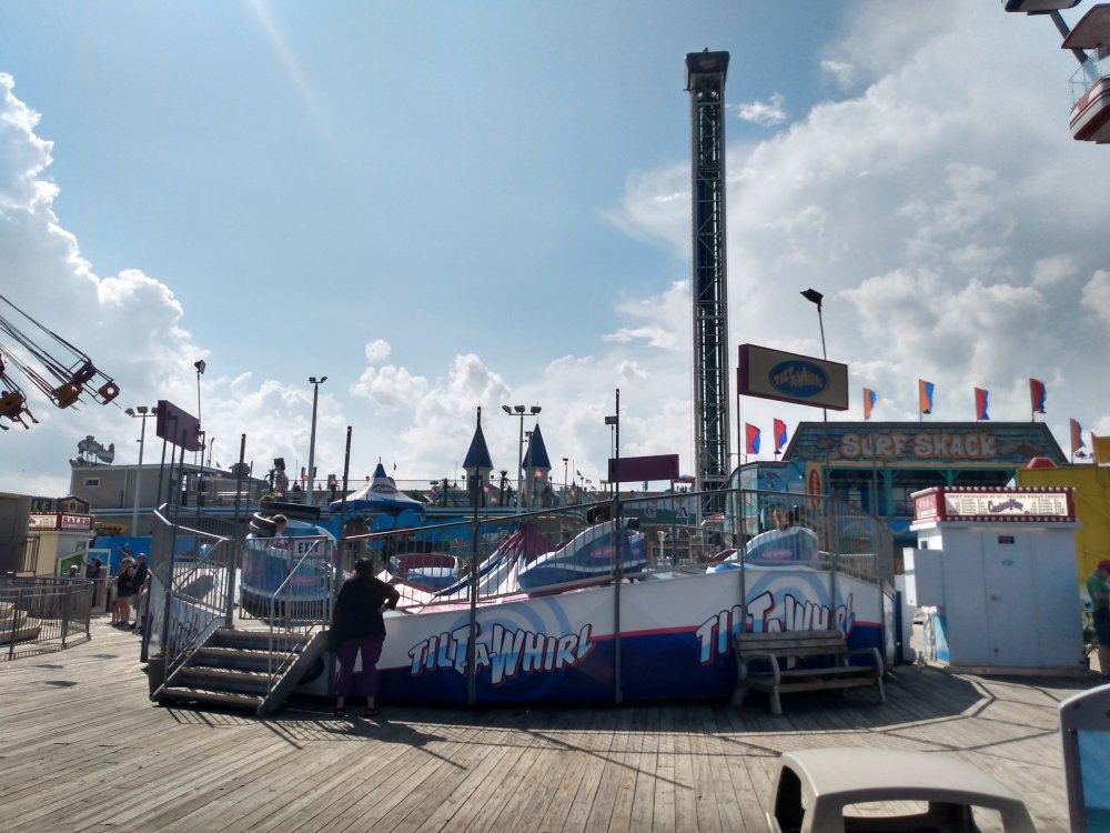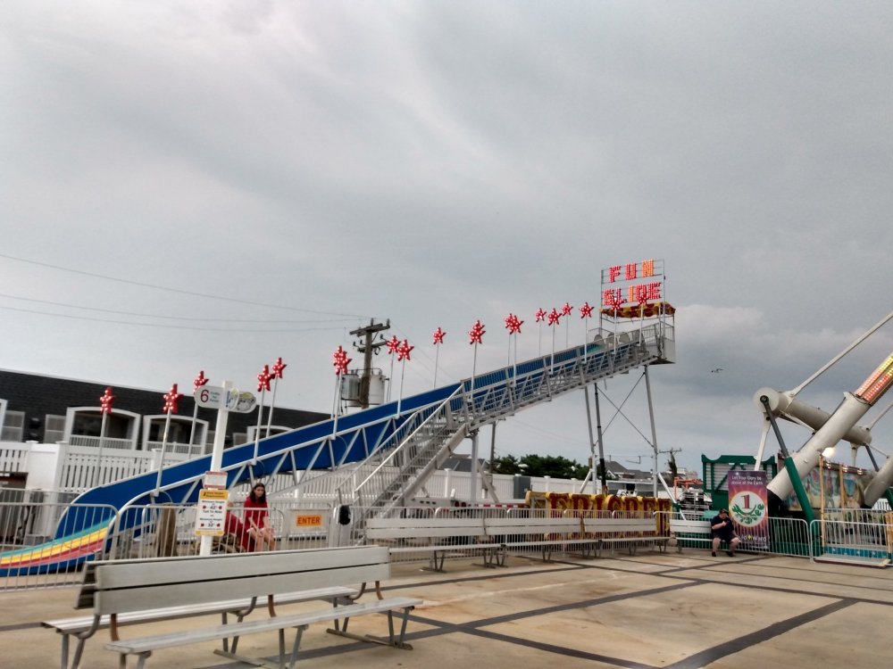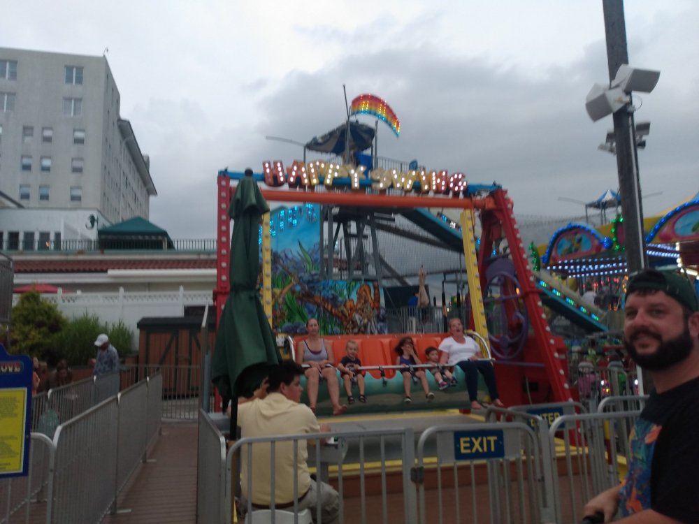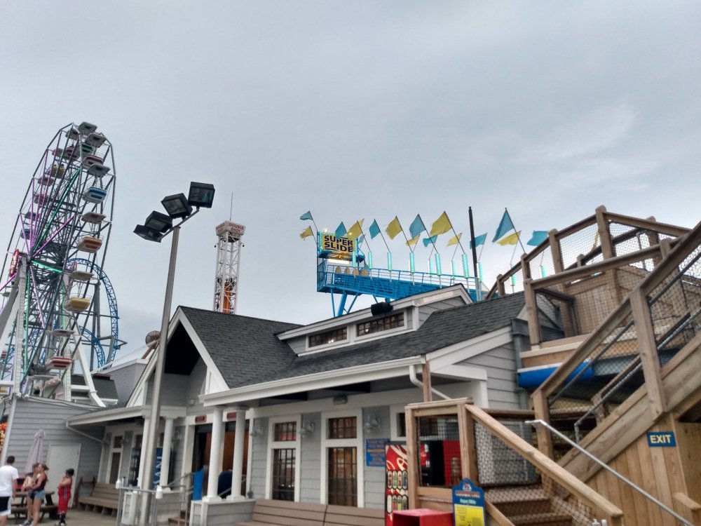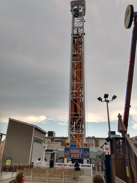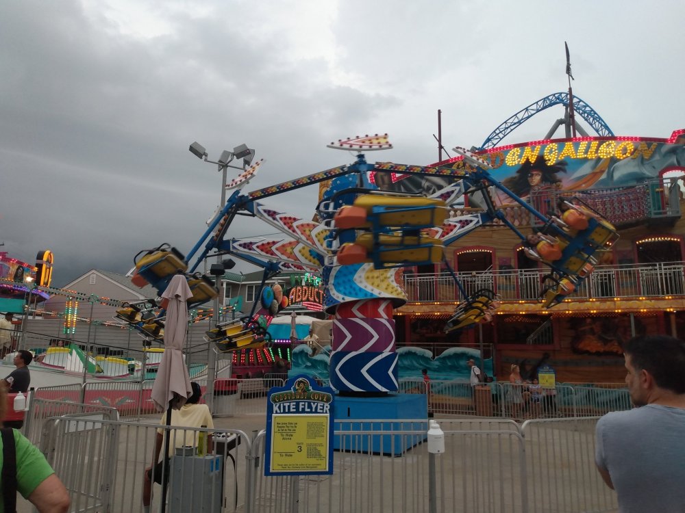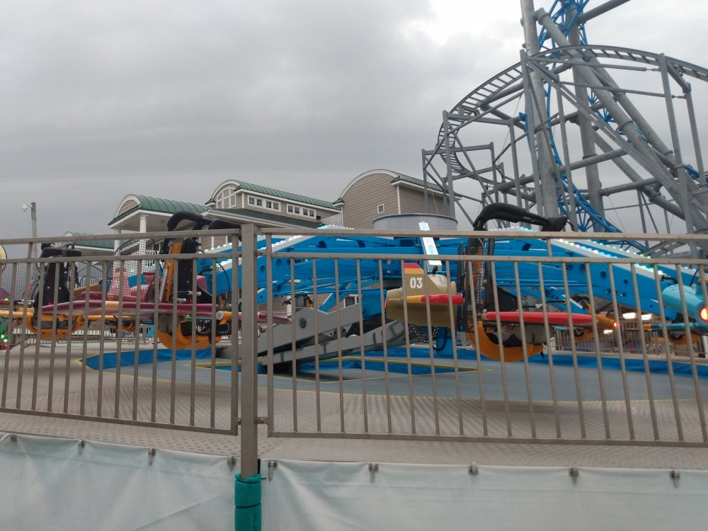 A town that I haven't been to for probably 30 years... Ocean City, NJ Yes, I know I skipped Atlantic City and Beach Haven (for now) - that's because, as you can see in the photos, a wicked storm was approaching and I was desperately trying to get Gale Force before it hit. Did I make it? Read on to find out! So, Ocean City is unique amongst NJ beach towns that have boardwalks in that it's the only one that's dry. Yes, no alcohol - no bars, no liquor stores, no beer stores, no nothing. You can bring in your own, and recently some BYOB restaurants have popped up, but yeah. Needless to say, this town is focused on attracting families. That's why I find it so odd that one of the parks built perhaps the most insane coaster I've ever been on. But I'll get to that later. First, some pictures from the boardwalk itself. They have designated lanes for bikes, walkers, and trams. A pretty sizeable water park. Did not go in. Partially-under-the-boardwalk go-karts. See, Morey's, you can still have this! Bring 'em back! This arcade featured nothing but real video games, no redemption whatsoever! Lots of classics as well as some modern games. Anyway, on to park #1: Gillian's Wonderland This park is partially indoors and partially outdoors, and features a cool castle-motif entrance. Each of the letters that spell out "Gillian's Wonderland" spin; it's quite a cool retro thing to keep around. And first, the indoor rides, which are all kid-targeting. Carousel Boats-go-round Crazy Bus themed to a submarine; first time I'd seen one of these. Balloons-go-round Fire trucks-go-round. Amusingly, some of them have trailers, which I'd never seen before. Kiddie Whip Dumbo-go-round A variant on the Zamperla buggy bouncer that I hadn't seen before. Cars-go-round Moving outside, we start with a standard climbing structure. Glass maze Zamperla spinning flyer Kiddie bumper cars A variant of the Dizzy Dragons, themed to the park's mascot. Wave Swinger Bungie Bounce. Been a while since I've seen one of these at a park. Musk Express Larson drop tower A train ride themed to chopper motor-tricyles. First time I've seen one of these. Standard burlap-sack slide. Big spinny-swingy-thingy that is not for me. An elevated monorail train ride, also goes around the inside part. Adult bumper cars Log flume that is also a dark ride. I really wanted to go on this, but I also really did not want to get wet with a lot of trip left to go, so I passed after seeing some people coming off it considerably dampened. Decently sized Ferris Wheel Standard Moby Dick, without the full backdrop. And a Ring of Fire. Waiting to be assembled, or waiting to be shipped off? I don't know. And now, the rides I did ride: Yep, that's right, I rode a Wacky Worm. Probably the low point of my coaster-riding career. But hey, I really wanted to get to 200, and a credit is a credit, right? Right...?! Anyway, it sucked. Two laps, and one little tiny barely perceivable pop of airtime on the one actual drop on the course in the back row. You know what else kinda sucked? Their dark ride, literally named "Dark Ride." Despite the name, it was full of large rooms and neon-painted decorations. Very little animatronics. Only one story despite the two-story building. I mean, I've been on *worse* dark rides (see my report from the Delaware State Fair), but yeah this was not that good. After those two at Gillian's, I headed down to Playland's Castaway Cove, definitely the more balanced park of the two, grabbing a small cup of Kohr's Brothers orange custand (with rainbow sprinkles), my staple, on the way. No NJ boardwalk trip is complete with out it. This place is cool in that everything is right on top of each other, sometimes literally on an upper deck. First, I'll showcase the rides I didn't ride: Wave Swinger Kiddie swing Kinda a jumbo-sized Kanga-Bounce from Morey's. Drive-'em cars. Tank-control bumper cars!!! I would have ridden these if I weren't alone...bumper cars with strangers is always kinda weird. But, I LOVED the gas-powered ones that were at Dorney Park before Demon Drop got installed. These were electric, but probably still tons of fun. Pirate's Gold Rush, their kiddie coaster. Would have ridden it (adults-sans-kids were allowed), but....you'll see. Burlap-sack slide. Cars-go-round Kiddie whip Kiddie drop tower Helicopters-go-round Standard climbing structure Zamperla spinning flyer Two-drop log flume Tilt-a-Whirl, with the new style cars. A Musik Express called "Rock-n-Roll." Guys, that name is already taken for a different type of ride... Gravitron Moby Dick themed to a Hurricane. Seriously guys, too soon. KMG claw ride Bumper cars Train ride, pretty sure it's the same model as is in Jenkinson's. S&S tower. Nope, still not the smallest one I saw on this trip. Pirate ship Carousel Balloons-go-round Okay, so what did I ride? I first tried to ride Gale Force, but upon arrival at the station, was promptly informed that it was shut down due to impending lightning. Here's some pictures anyway: Bummer. I figured Wild Waves was the same way, so I went to this: I had never seen something like this before. Apparently, it's a Technical Park brand ride model called "Aerobat" (click here for their website and better pictures/video). Castaway Cove calls it "Squadron 33". The wheel spins, and raises like a Zamperla Endeavor, but at a point the longitudinal rotation of the cars unlocks, and the rider controls it by angling the wings to divert airflow. My god was this thing nuts. At first, I was having trouble getting the car to flip, but once I did I could barely get the thing to stop. I must have flipped a half-dozen times before I got it to stop doing full rotations, and this is all while spinning around, coming what felt to be dangerously close to the platform while upside down. It felt like a super-long cycle, and once I got the hang of it I was able to do one or two flips and then recover. Insane, great ride. Why more of these don't exist, I can't fathom. 11/10, 6-stars, 