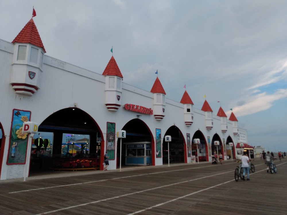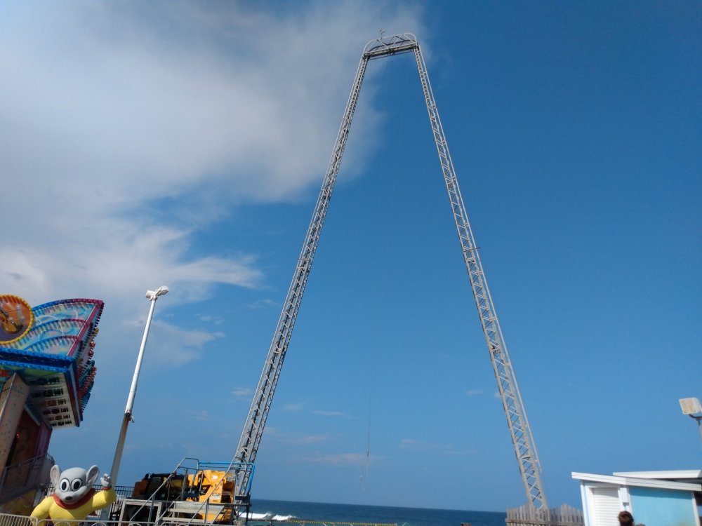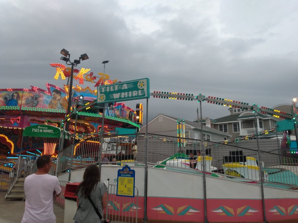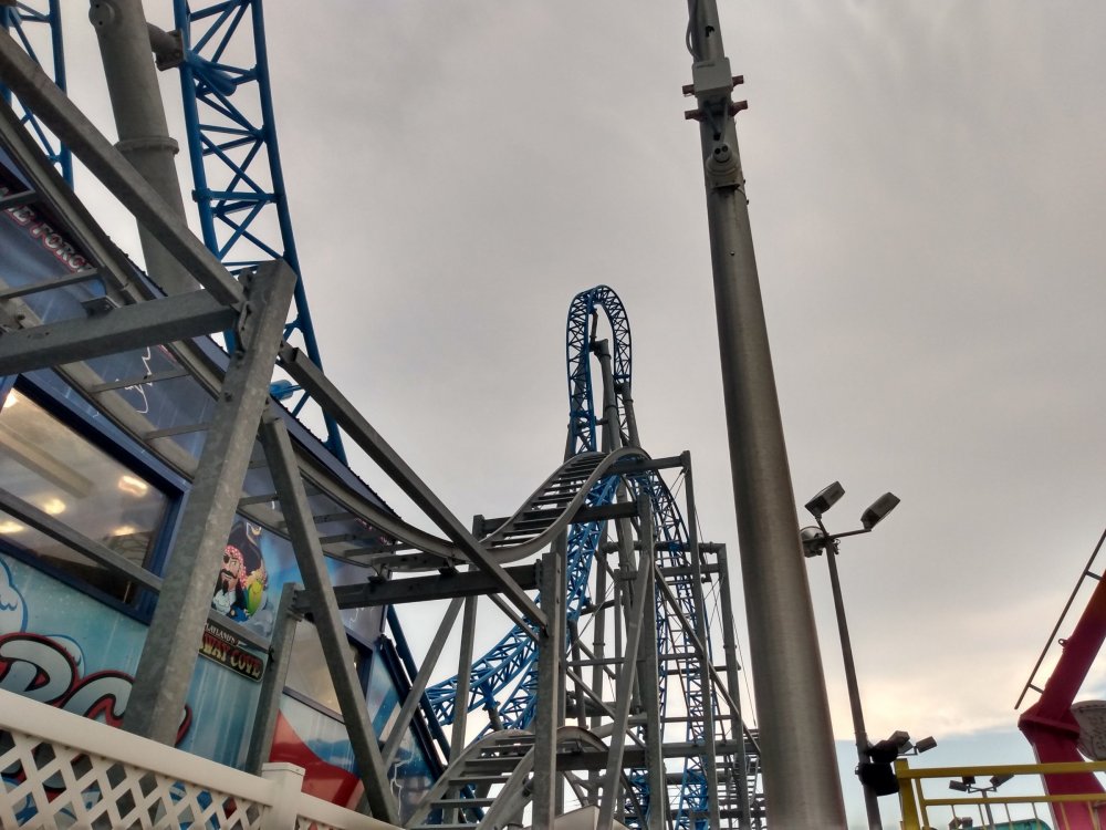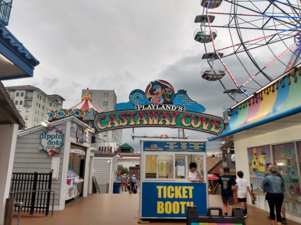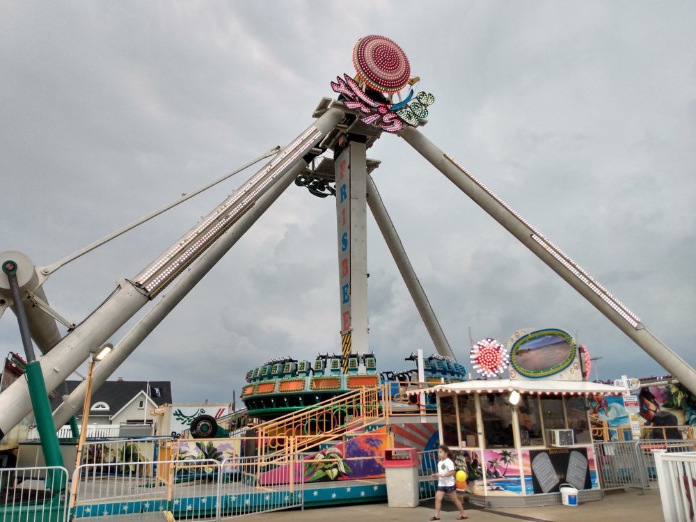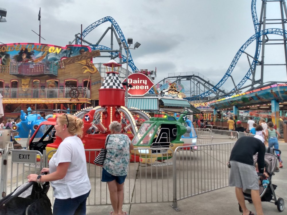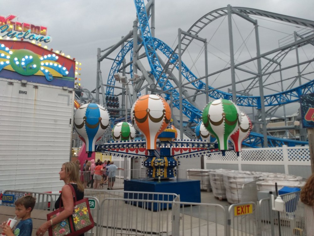 A town that I haven't been to for probably 30 years... Ocean City, NJ Yes, I know I skipped Atlantic City and Beach Haven (for now) - that's because, as you can see in the photos, a wicked storm was approaching and I was desperately trying to get Gale Force before it hit. Did I make it? Read on to find out! So, Ocean City is unique amongst NJ beach towns that have boardwalks in that it's the only one that's dry. Yes, no alcohol - no bars, no liquor stores, no beer stores, no nothing. You can bring in your own, and recently some BYOB restaurants have popped up, but yeah. Needless to say, this town is focused on attracting families. That's why I find it so odd that one of the parks built perhaps the most insane coaster I've ever been on. But I'll get to that later. First, some pictures from the boardwalk itself. They have designated lanes for bikes, walkers, and trams. A pretty sizeable water park. Did not go in. Partially-under-the-boardwalk go-karts. See, Morey's, you can still have this! Bring 'em back! This arcade featured nothing but real video games, no redemption whatsoever! Lots of classics as well as some modern games. Anyway, on to park #1: Gillian's Wonderland This park is partially indoors and partially outdoors, and features a cool castle-motif entrance. Each of the letters that spell out "Gillian's Wonderland" spin; it's quite a cool retro thing to keep around. And first, the indoor rides, which are all kid-targeting. Carousel Boats-go-round Crazy Bus themed to a submarine; first time I'd seen one of these. Balloons-go-round Fire trucks-go-round. Amusingly, some of them have trailers, which I'd never seen before. Kiddie Whip Dumbo-go-round A variant on the Zamperla buggy bouncer that I hadn't seen before. Cars-go-round Moving outside, we start with a standard climbing structure. Glass maze Zamperla spinning flyer Kiddie bumper cars A variant of the Dizzy Dragons, themed to the park's mascot. Wave Swinger Bungie Bounce. Been a while since I've seen one of these at a park. Musk Express Larson drop tower A train ride themed to chopper motor-tricyles. First time I've seen one of these. Standard burlap-sack slide. Big spinny-swingy-thingy that is not for me. An elevated monorail train ride, also goes around the inside part. Adult bumper cars Log flume that is also a dark ride. I really wanted to go on this, but I also really did not want to get wet with a lot of trip left to go, so I passed after seeing some people coming off it considerably dampened. Decently sized Ferris Wheel Standard Moby Dick, without the full backdrop. And a Ring of Fire. Waiting to be assembled, or waiting to be shipped off? I don't know. And now, the rides I did ride: Yep, that's right, I rode a Wacky Worm. Probably the low point of my coaster-riding career. But hey, I really wanted to get to 200, and a credit is a credit, right? Right...?! Anyway, it sucked. Two laps, and one little tiny barely perceivable pop of airtime on the one actual drop on the course in the back row. You know what else kinda sucked? Their dark ride, literally named "Dark Ride." Despite the name, it was full of large rooms and neon-painted decorations. Very little animatronics. Only one story despite the two-story building. I mean, I've been on *worse* dark rides (see my report from the Delaware State Fair), but yeah this was not that good. After those two at Gillian's, I headed down to Playland's Castaway Cove, definitely the more balanced park of the two, grabbing a small cup of Kohr's Brothers orange custand (with rainbow sprinkles), my staple, on the way. No NJ boardwalk trip is complete with out it. This place is cool in that everything is right on top of each other, sometimes literally on an upper deck. First, I'll showcase the rides I didn't ride: Wave Swinger Kiddie swing Kinda a jumbo-sized Kanga-Bounce from Morey's. Drive-'em cars. Tank-control bumper cars!!! I would have ridden these if I weren't alone...bumper cars with strangers is always kinda weird. But, I LOVED the gas-powered ones that were at Dorney Park before Demon Drop got installed. These were electric, but probably still tons of fun. Pirate's Gold Rush, their kiddie coaster. Would have ridden it (adults-sans-kids were allowed), but....you'll see. Burlap-sack slide. Cars-go-round Kiddie whip Kiddie drop tower Helicopters-go-round Standard climbing structure Zamperla spinning flyer Two-drop log flume Tilt-a-Whirl, with the new style cars. A Musik Express called "Rock-n-Roll." Guys, that name is already taken for a different type of ride... Gravitron Moby Dick themed to a Hurricane. Seriously guys, too soon. KMG claw ride Bumper cars Train ride, pretty sure it's the same model as is in Jenkinson's. S&S tower. Nope, still not the smallest one I saw on this trip. Pirate ship Carousel Balloons-go-round Okay, so what did I ride? I first tried to ride Gale Force, but upon arrival at the station, was promptly informed that it was shut down due to impending lightning. Here's some pictures anyway: Bummer. I figured Wild Waves was the same way, so I went to this: I had never seen something like this before. Apparently, it's a Technical Park brand ride model called "Aerobat" (click here for their website and better pictures/video). Castaway Cove calls it "Squadron 33". The wheel spins, and raises like a Zamperla Endeavor, but at a point the longitudinal rotation of the cars unlocks, and the rider controls it by angling the wings to divert airflow. My god was this thing nuts. At first, I was having trouble getting the car to flip, but once I did I could barely get the thing to stop. I must have flipped a half-dozen times before I got it to stop doing full rotations, and this is all while spinning around, coming what felt to be dangerously close to the platform while upside down. It felt like a super-long cycle, and once I got the hang of it I was able to do one or two flips and then recover. Insane, great ride. Why more of these don't exist, I can't fathom. 11/10, 6-stars, 