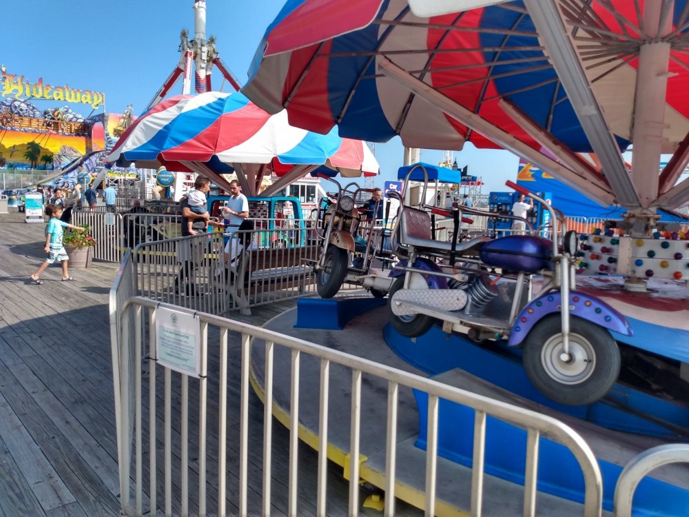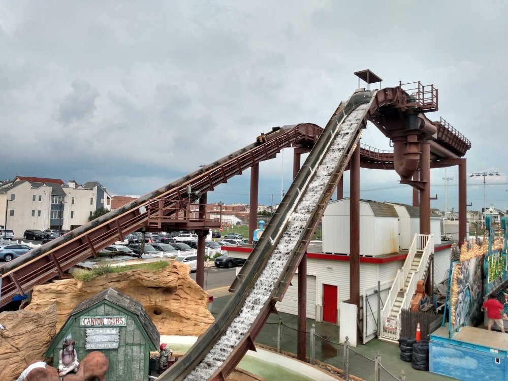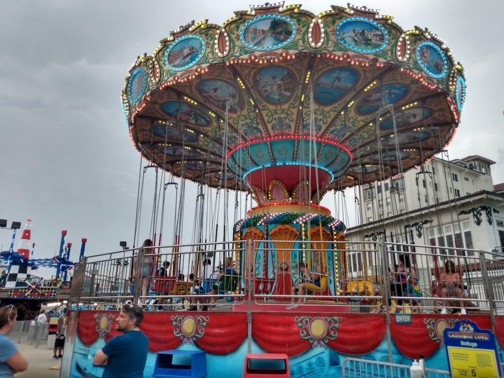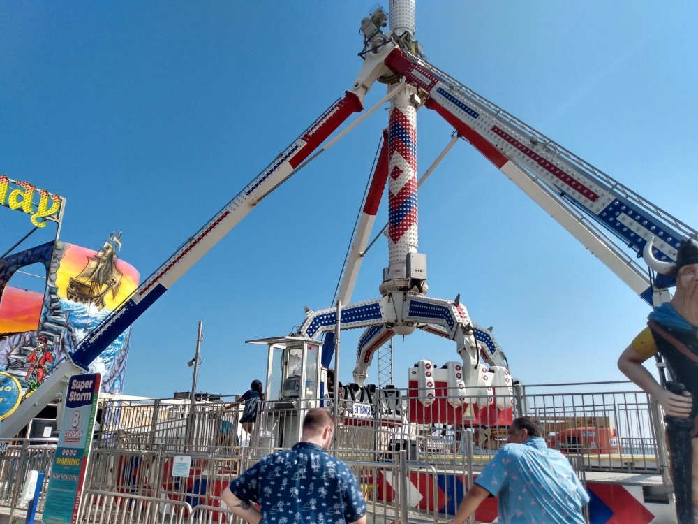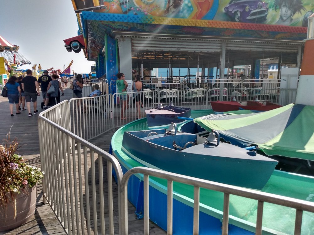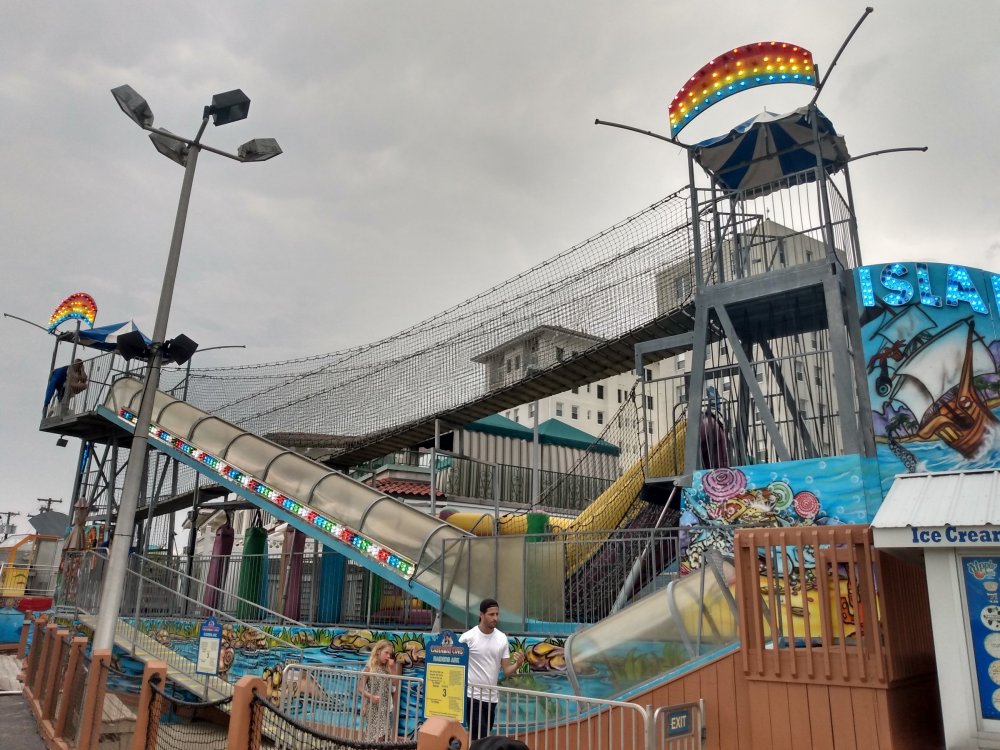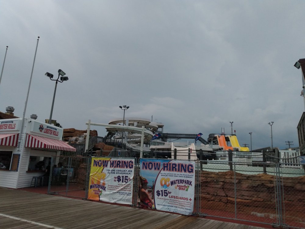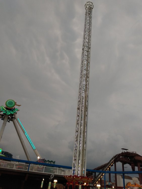 A town that I haven't been to for probably 30 years... Ocean City, NJ Yes, I know I skipped Atlantic City and Beach Haven (for now) - that's because, as you can see in the photos, a wicked storm was approaching and I was desperately trying to get Gale Force before it hit. Did I make it? Read on to find out! So, Ocean City is unique amongst NJ beach towns that have boardwalks in that it's the only one that's dry. Yes, no alcohol - no bars, no liquor stores, no beer stores, no nothing. You can bring in your own, and recently some BYOB restaurants have popped up, but yeah. Needless to say, this town is focused on attracting families. That's why I find it so odd that one of the parks built perhaps the most insane coaster I've ever been on. But I'll get to that later. First, some pictures from the boardwalk itself. They have designated lanes for bikes, walkers, and trams. A pretty sizeable water park. Did not go in. Partially-under-the-boardwalk go-karts. See, Morey's, you can still have this! Bring 'em back! This arcade featured nothing but real video games, no redemption whatsoever! Lots of classics as well as some modern games. Anyway, on to park #1: Gillian's Wonderland This park is partially indoors and partially outdoors, and features a cool castle-motif entrance. Each of the letters that spell out "Gillian's Wonderland" spin; it's quite a cool retro thing to keep around. And first, the indoor rides, which are all kid-targeting. Carousel Boats-go-round Crazy Bus themed to a submarine; first time I'd seen one of these. Balloons-go-round Fire trucks-go-round. Amusingly, some of them have trailers, which I'd never seen before. Kiddie Whip Dumbo-go-round A variant on the Zamperla buggy bouncer that I hadn't seen before. Cars-go-round Moving outside, we start with a standard climbing structure. Glass maze Zamperla spinning flyer Kiddie bumper cars A variant of the Dizzy Dragons, themed to the park's mascot. Wave Swinger Bungie Bounce. Been a while since I've seen one of these at a park. Musk Express Larson drop tower A train ride themed to chopper motor-tricyles. First time I've seen one of these. Standard burlap-sack slide. Big spinny-swingy-thingy that is not for me. An elevated monorail train ride, also goes around the inside part. Adult bumper cars Log flume that is also a dark ride. I really wanted to go on this, but I also really did not want to get wet with a lot of trip left to go, so I passed after seeing some people coming off it considerably dampened. Decently sized Ferris Wheel Standard Moby Dick, without the full backdrop. And a Ring of Fire. Waiting to be assembled, or waiting to be shipped off? I don't know. And now, the rides I did ride: Yep, that's right, I rode a Wacky Worm. Probably the low point of my coaster-riding career. But hey, I really wanted to get to 200, and a credit is a credit, right? Right...?! Anyway, it sucked. Two laps, and one little tiny barely perceivable pop of airtime on the one actual drop on the course in the back row. You know what else kinda sucked? Their dark ride, literally named "Dark Ride." Despite the name, it was full of large rooms and neon-painted decorations. Very little animatronics. Only one story despite the two-story building. I mean, I've been on *worse* dark rides (see my report from the Delaware State Fair), but yeah this was not that good. After those two at Gillian's, I headed down to Playland's Castaway Cove, definitely the more balanced park of the two, grabbing a small cup of Kohr's Brothers orange custand (with rainbow sprinkles), my staple, on the way. No NJ boardwalk trip is complete with out it. This place is cool in that everything is right on top of each other, sometimes literally on an upper deck. First, I'll showcase the rides I didn't ride: Wave Swinger Kiddie swing Kinda a jumbo-sized Kanga-Bounce from Morey's. Drive-'em cars. Tank-control bumper cars!!! I would have ridden these if I weren't alone...bumper cars with strangers is always kinda weird. But, I LOVED the gas-powered ones that were at Dorney Park before Demon Drop got installed. These were electric, but probably still tons of fun. Pirate's Gold Rush, their kiddie coaster. Would have ridden it (adults-sans-kids were allowed), but....you'll see. Burlap-sack slide. Cars-go-round Kiddie whip Kiddie drop tower Helicopters-go-round Standard climbing structure Zamperla spinning flyer Two-drop log flume Tilt-a-Whirl, with the new style cars. A Musik Express called "Rock-n-Roll." Guys, that name is already taken for a different type of ride... Gravitron Moby Dick themed to a Hurricane. Seriously guys, too soon. KMG claw ride Bumper cars Train ride, pretty sure it's the same model as is in Jenkinson's. S&S tower. Nope, still not the smallest one I saw on this trip. Pirate ship Carousel Balloons-go-round Okay, so what did I ride? I first tried to ride Gale Force, but upon arrival at the station, was promptly informed that it was shut down due to impending lightning. Here's some pictures anyway: Bummer. I figured Wild Waves was the same way, so I went to this: I had never seen something like this before. Apparently, it's a Technical Park brand ride model called "Aerobat" (click here for their website and better pictures/video). Castaway Cove calls it "Squadron 33". The wheel spins, and raises like a Zamperla Endeavor, but at a point the longitudinal rotation of the cars unlocks, and the rider controls it by angling the wings to divert airflow. My god was this thing nuts. At first, I was having trouble getting the car to flip, but once I did I could barely get the thing to stop. I must have flipped a half-dozen times before I got it to stop doing full rotations, and this is all while spinning around, coming what felt to be dangerously close to the platform while upside down. It felt like a super-long cycle, and once I got the hang of it I was able to do one or two flips and then recover. Insane, great ride. Why more of these don't exist, I can't fathom. 11/10, 6-stars, 