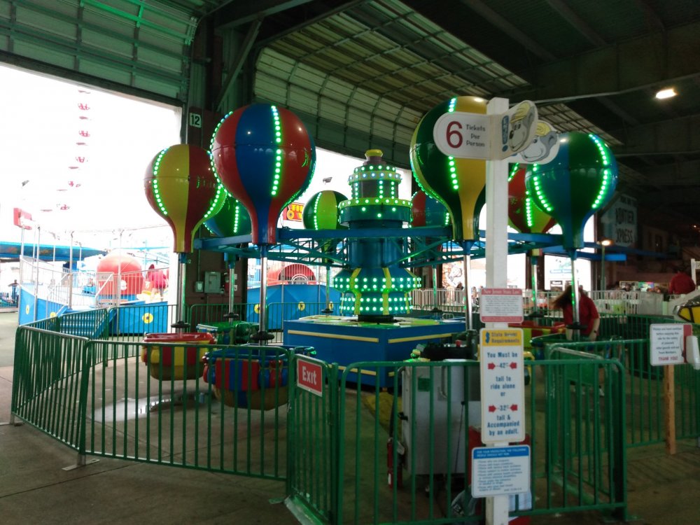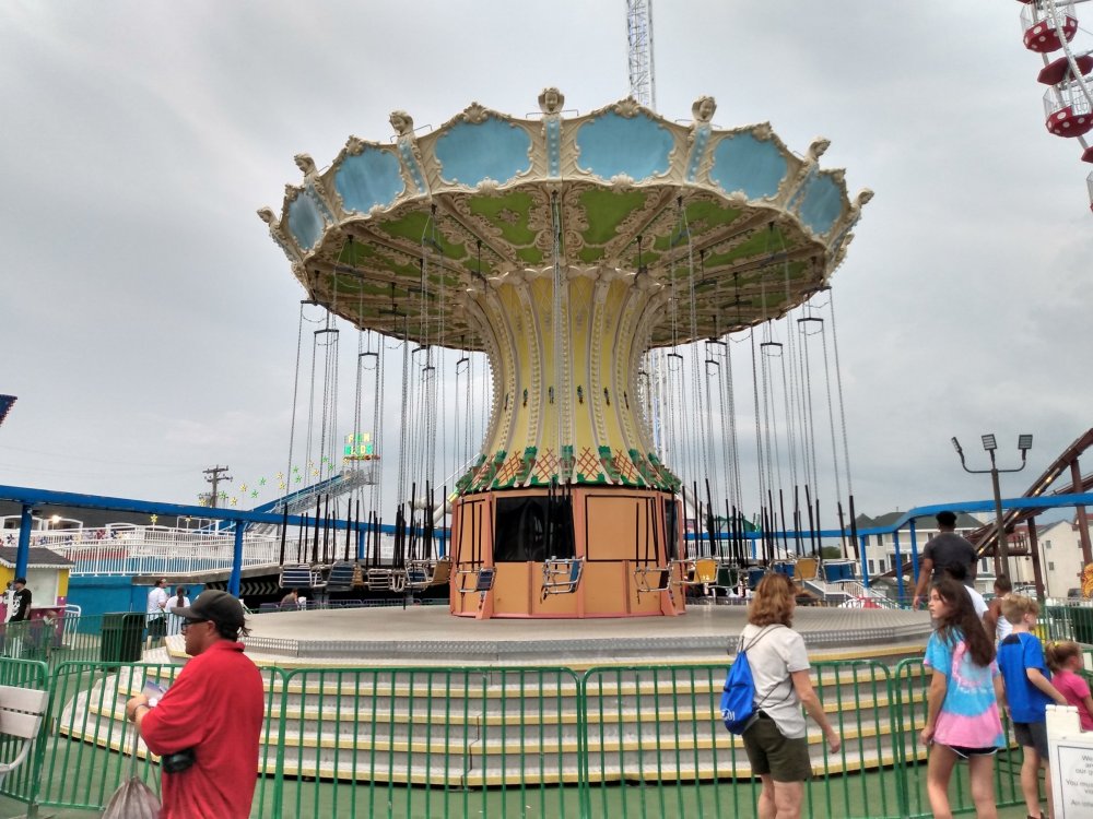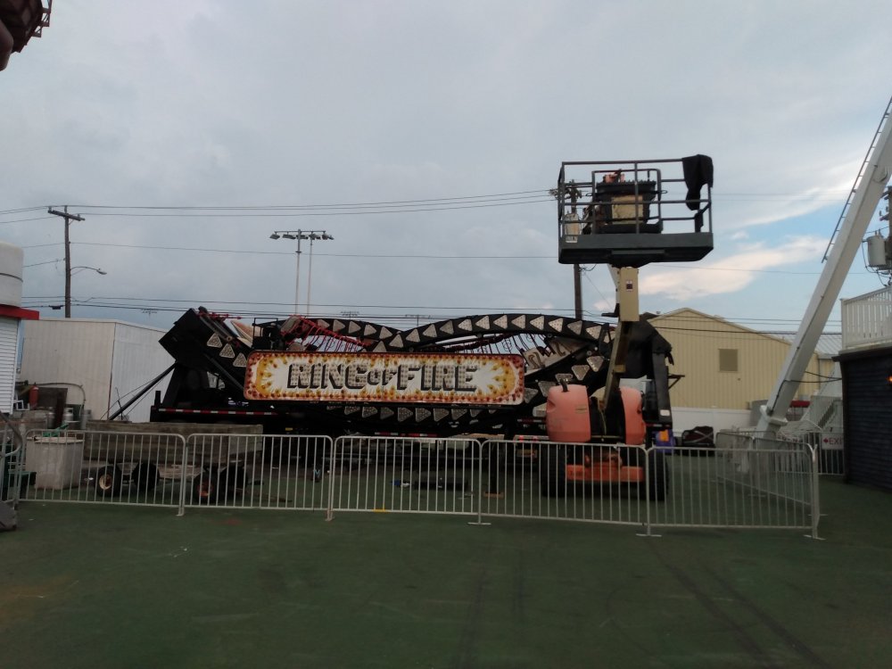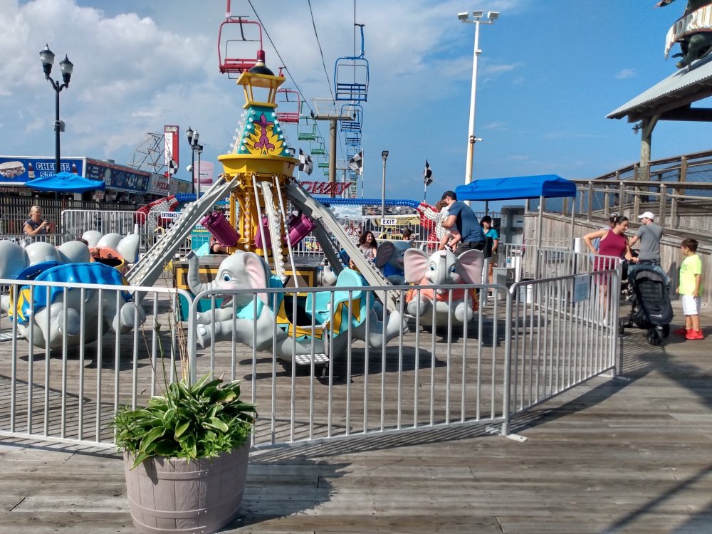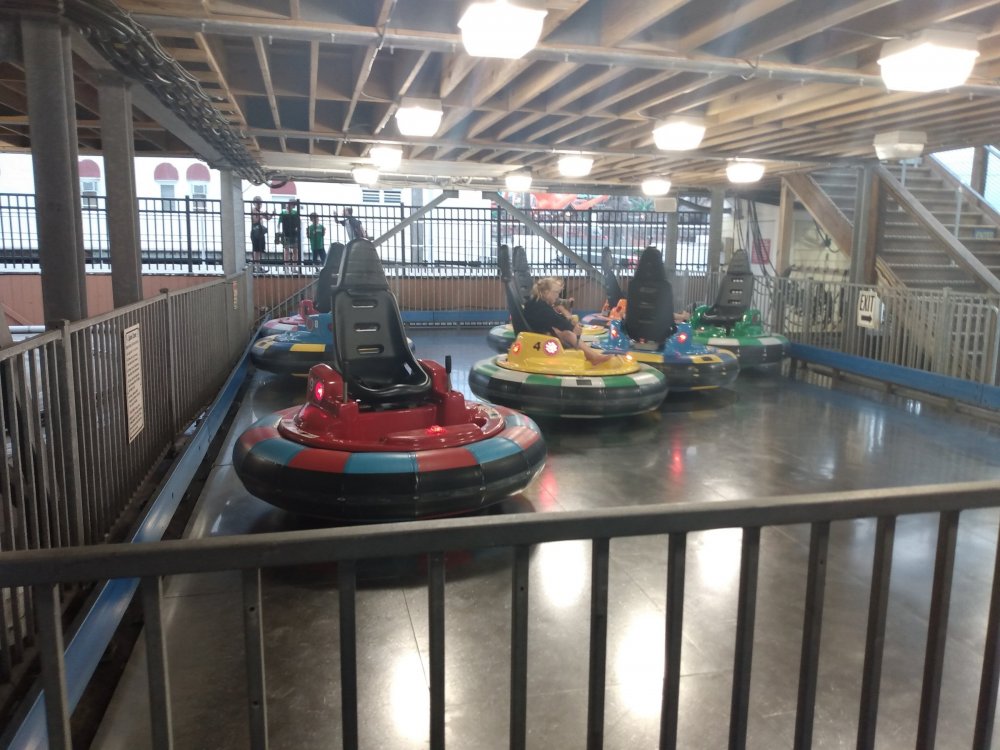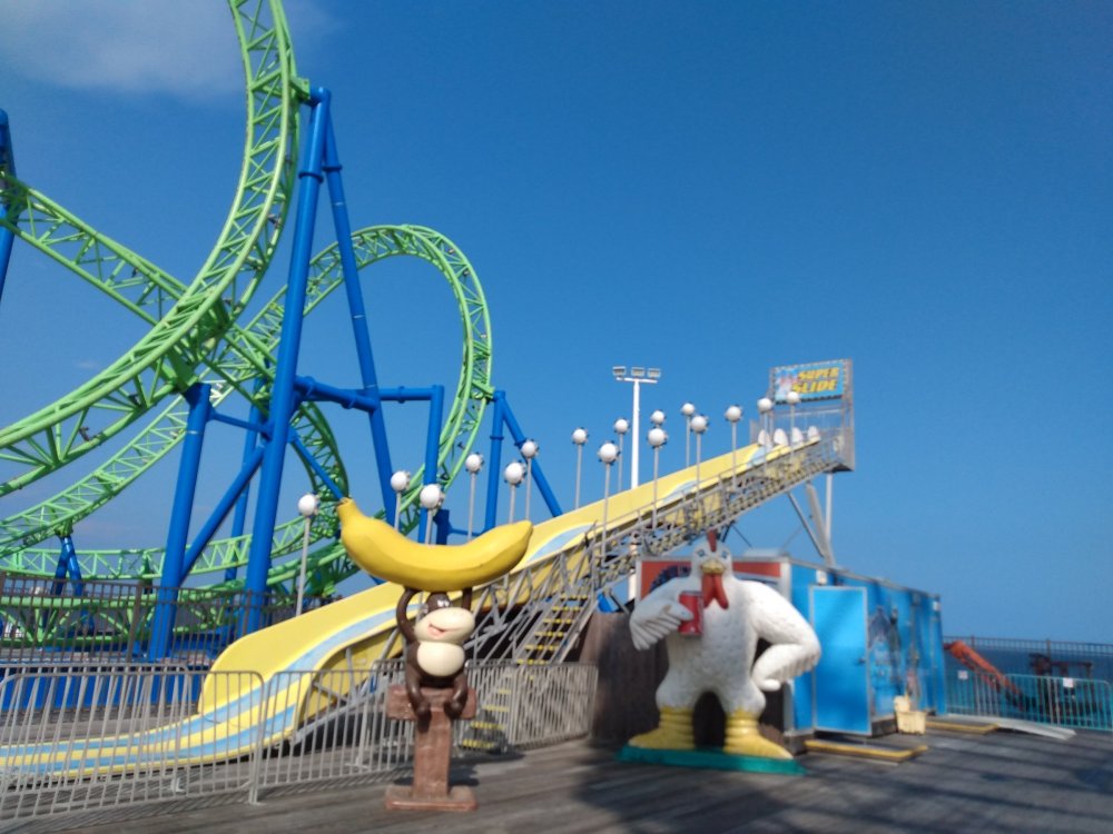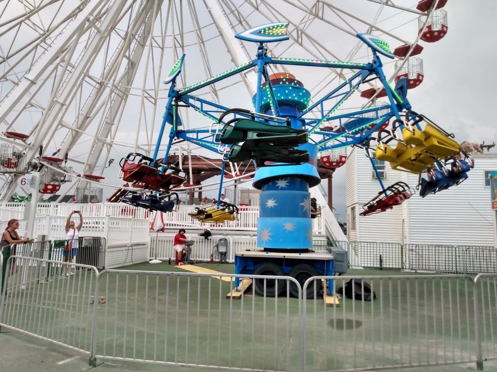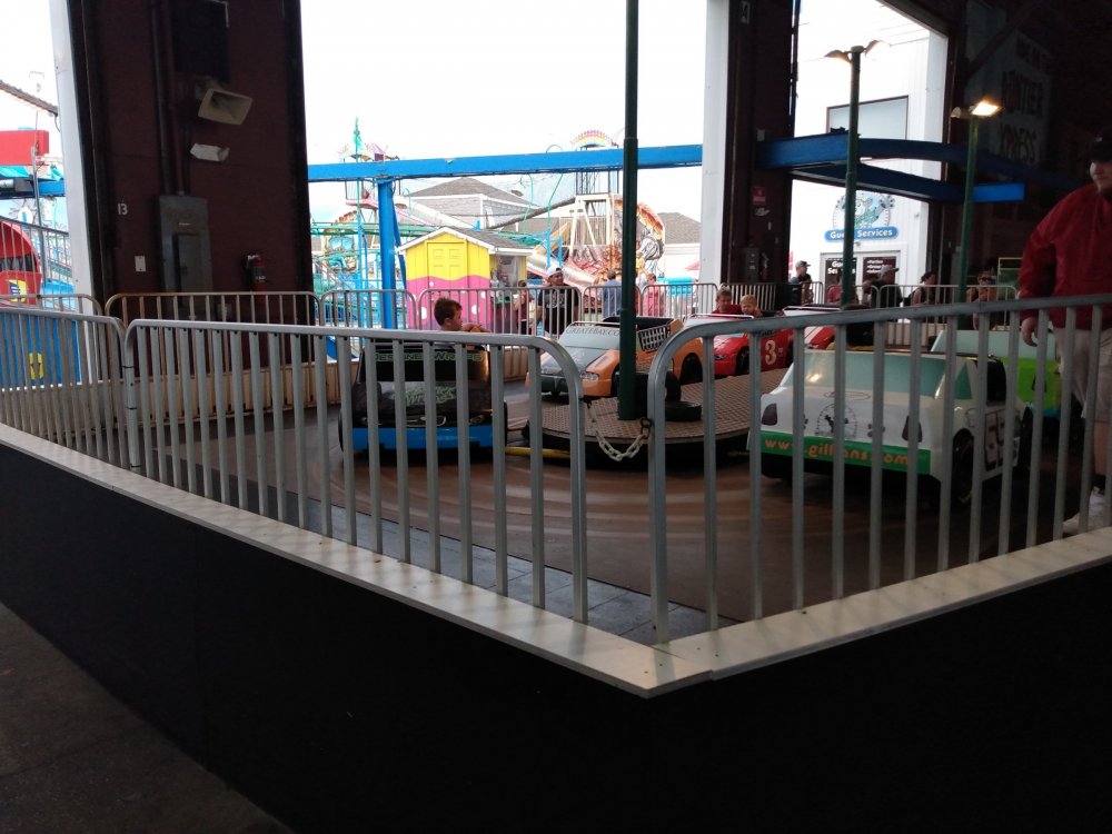 A town that I haven't been to for probably 30 years... Ocean City, NJ Yes, I know I skipped Atlantic City and Beach Haven (for now) - that's because, as you can see in the photos, a wicked storm was approaching and I was desperately trying to get Gale Force before it hit. Did I make it? Read on to find out! So, Ocean City is unique amongst NJ beach towns that have boardwalks in that it's the only one that's dry. Yes, no alcohol - no bars, no liquor stores, no beer stores, no nothing. You can bring in your own, and recently some BYOB restaurants have popped up, but yeah. Needless to say, this town is focused on attracting families. That's why I find it so odd that one of the parks built perhaps the most insane coaster I've ever been on. But I'll get to that later. First, some pictures from the boardwalk itself. They have designated lanes for bikes, walkers, and trams. A pretty sizeable water park. Did not go in. Partially-under-the-boardwalk go-karts. See, Morey's, you can still have this! Bring 'em back! This arcade featured nothing but real video games, no redemption whatsoever! Lots of classics as well as some modern games. Anyway, on to park #1: Gillian's Wonderland This park is partially indoors and partially outdoors, and features a cool castle-motif entrance. Each of the letters that spell out "Gillian's Wonderland" spin; it's quite a cool retro thing to keep around. And first, the indoor rides, which are all kid-targeting. Carousel Boats-go-round Crazy Bus themed to a submarine; first time I'd seen one of these. Balloons-go-round Fire trucks-go-round. Amusingly, some of them have trailers, which I'd never seen before. Kiddie Whip Dumbo-go-round A variant on the Zamperla buggy bouncer that I hadn't seen before. Cars-go-round Moving outside, we start with a standard climbing structure. Glass maze Zamperla spinning flyer Kiddie bumper cars A variant of the Dizzy Dragons, themed to the park's mascot. Wave Swinger Bungie Bounce. Been a while since I've seen one of these at a park. Musk Express Larson drop tower A train ride themed to chopper motor-tricyles. First time I've seen one of these. Standard burlap-sack slide. Big spinny-swingy-thingy that is not for me. An elevated monorail train ride, also goes around the inside part. Adult bumper cars Log flume that is also a dark ride. I really wanted to go on this, but I also really did not want to get wet with a lot of trip left to go, so I passed after seeing some people coming off it considerably dampened. Decently sized Ferris Wheel Standard Moby Dick, without the full backdrop. And a Ring of Fire. Waiting to be assembled, or waiting to be shipped off? I don't know. And now, the rides I did ride: Yep, that's right, I rode a Wacky Worm. Probably the low point of my coaster-riding career. But hey, I really wanted to get to 200, and a credit is a credit, right? Right...?! Anyway, it sucked. Two laps, and one little tiny barely perceivable pop of airtime on the one actual drop on the course in the back row. You know what else kinda sucked? Their dark ride, literally named "Dark Ride." Despite the name, it was full of large rooms and neon-painted decorations. Very little animatronics. Only one story despite the two-story building. I mean, I've been on *worse* dark rides (see my report from the Delaware State Fair), but yeah this was not that good. After those two at Gillian's, I headed down to Playland's Castaway Cove, definitely the more balanced park of the two, grabbing a small cup of Kohr's Brothers orange custand (with rainbow sprinkles), my staple, on the way. No NJ boardwalk trip is complete with out it. This place is cool in that everything is right on top of each other, sometimes literally on an upper deck. First, I'll showcase the rides I didn't ride: Wave Swinger Kiddie swing Kinda a jumbo-sized Kanga-Bounce from Morey's. Drive-'em cars. Tank-control bumper cars!!! I would have ridden these if I weren't alone...bumper cars with strangers is always kinda weird. But, I LOVED the gas-powered ones that were at Dorney Park before Demon Drop got installed. These were electric, but probably still tons of fun. Pirate's Gold Rush, their kiddie coaster. Would have ridden it (adults-sans-kids were allowed), but....you'll see. Burlap-sack slide. Cars-go-round Kiddie whip Kiddie drop tower Helicopters-go-round Standard climbing structure Zamperla spinning flyer Two-drop log flume Tilt-a-Whirl, with the new style cars. A Musik Express called "Rock-n-Roll." Guys, that name is already taken for a different type of ride... Gravitron Moby Dick themed to a Hurricane. Seriously guys, too soon. KMG claw ride Bumper cars Train ride, pretty sure it's the same model as is in Jenkinson's. S&S tower. Nope, still not the smallest one I saw on this trip. Pirate ship Carousel Balloons-go-round Okay, so what did I ride? I first tried to ride Gale Force, but upon arrival at the station, was promptly informed that it was shut down due to impending lightning. Here's some pictures anyway: Bummer. I figured Wild Waves was the same way, so I went to this: I had never seen something like this before. Apparently, it's a Technical Park brand ride model called "Aerobat" (click here for their website and better pictures/video). Castaway Cove calls it "Squadron 33". The wheel spins, and raises like a Zamperla Endeavor, but at a point the longitudinal rotation of the cars unlocks, and the rider controls it by angling the wings to divert airflow. My god was this thing nuts. At first, I was having trouble getting the car to flip, but once I did I could barely get the thing to stop. I must have flipped a half-dozen times before I got it to stop doing full rotations, and this is all while spinning around, coming what felt to be dangerously close to the platform while upside down. It felt like a super-long cycle, and once I got the hang of it I was able to do one or two flips and then recover. Insane, great ride. Why more of these don't exist, I can't fathom. 11/10, 6-stars, 