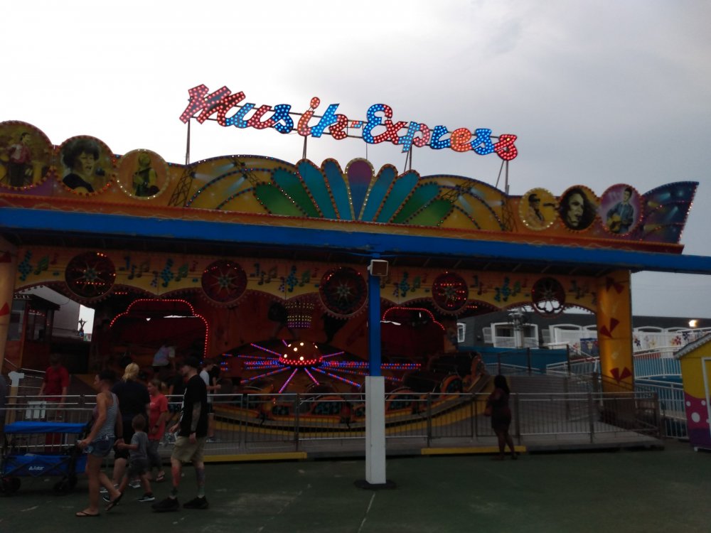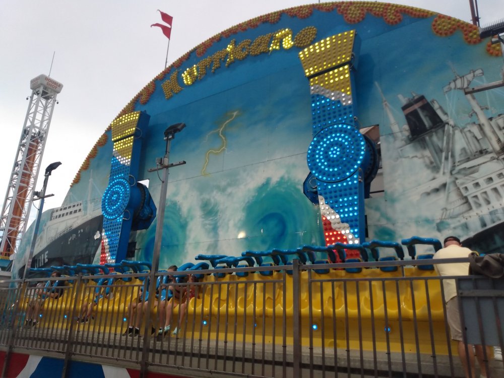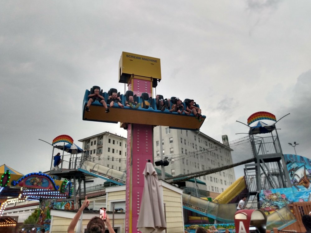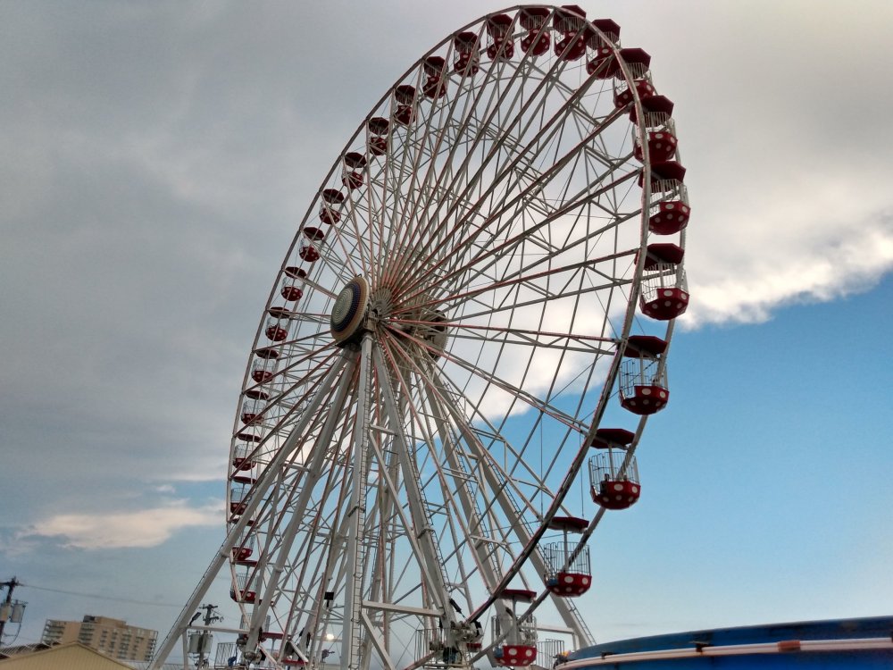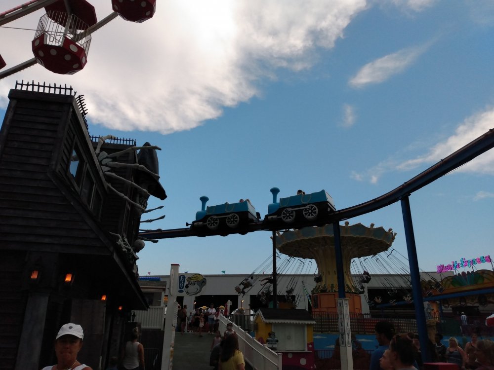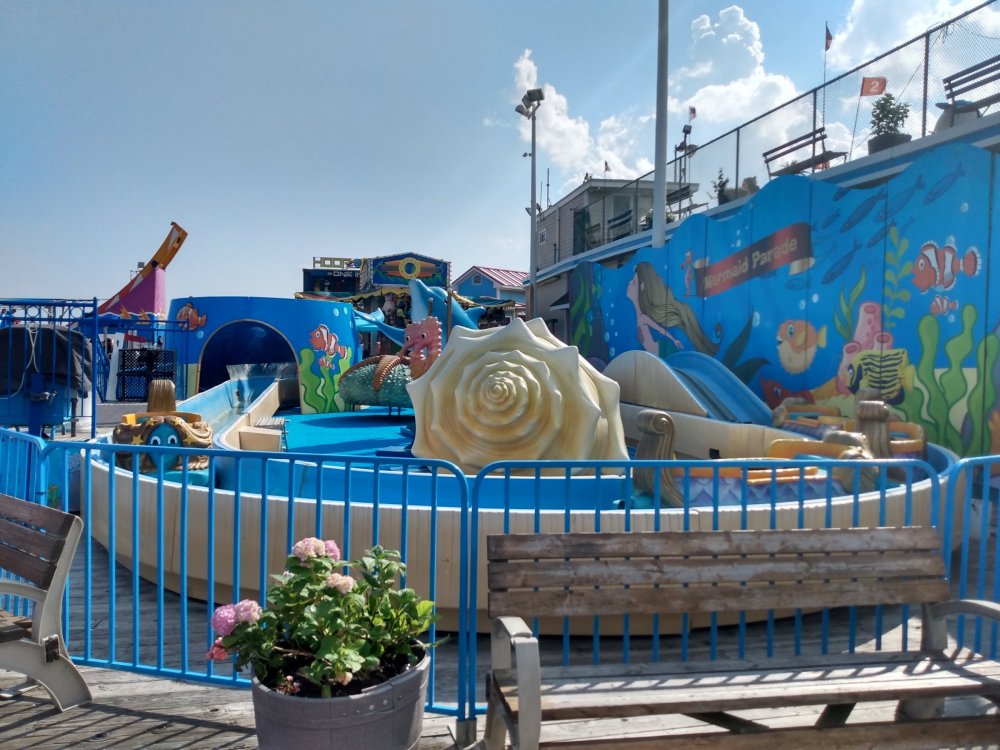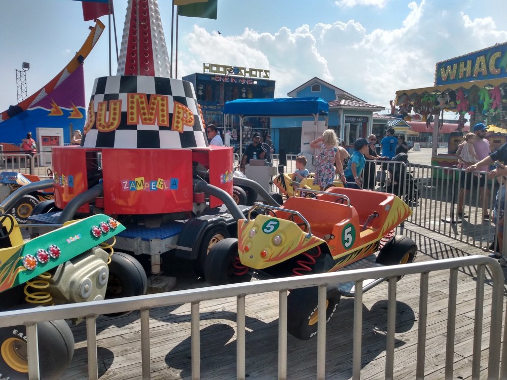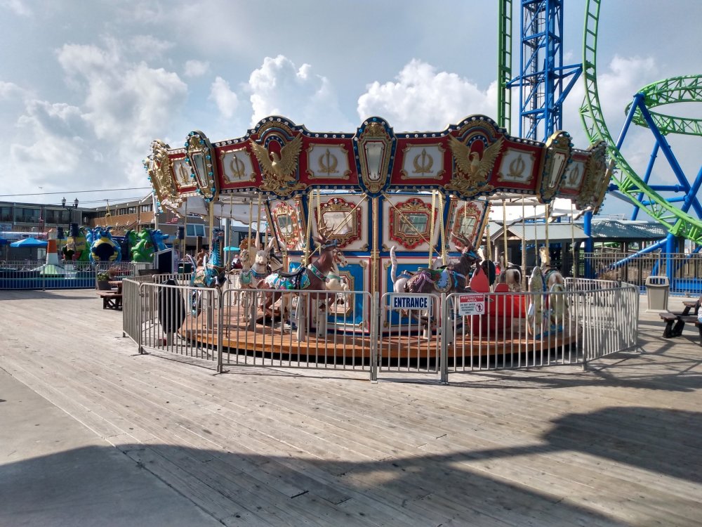 A town that I haven't been to for probably 30 years... Ocean City, NJ Yes, I know I skipped Atlantic City and Beach Haven (for now) - that's because, as you can see in the photos, a wicked storm was approaching and I was desperately trying to get Gale Force before it hit. Did I make it? Read on to find out! So, Ocean City is unique amongst NJ beach towns that have boardwalks in that it's the only one that's dry. Yes, no alcohol - no bars, no liquor stores, no beer stores, no nothing. You can bring in your own, and recently some BYOB restaurants have popped up, but yeah. Needless to say, this town is focused on attracting families. That's why I find it so odd that one of the parks built perhaps the most insane coaster I've ever been on. But I'll get to that later. First, some pictures from the boardwalk itself. They have designated lanes for bikes, walkers, and trams. A pretty sizeable water park. Did not go in. Partially-under-the-boardwalk go-karts. See, Morey's, you can still have this! Bring 'em back! This arcade featured nothing but real video games, no redemption whatsoever! Lots of classics as well as some modern games. Anyway, on to park #1: Gillian's Wonderland This park is partially indoors and partially outdoors, and features a cool castle-motif entrance. Each of the letters that spell out "Gillian's Wonderland" spin; it's quite a cool retro thing to keep around. And first, the indoor rides, which are all kid-targeting. Carousel Boats-go-round Crazy Bus themed to a submarine; first time I'd seen one of these. Balloons-go-round Fire trucks-go-round. Amusingly, some of them have trailers, which I'd never seen before. Kiddie Whip Dumbo-go-round A variant on the Zamperla buggy bouncer that I hadn't seen before. Cars-go-round Moving outside, we start with a standard climbing structure. Glass maze Zamperla spinning flyer Kiddie bumper cars A variant of the Dizzy Dragons, themed to the park's mascot. Wave Swinger Bungie Bounce. Been a while since I've seen one of these at a park. Musk Express Larson drop tower A train ride themed to chopper motor-tricyles. First time I've seen one of these. Standard burlap-sack slide. Big spinny-swingy-thingy that is not for me. An elevated monorail train ride, also goes around the inside part. Adult bumper cars Log flume that is also a dark ride. I really wanted to go on this, but I also really did not want to get wet with a lot of trip left to go, so I passed after seeing some people coming off it considerably dampened. Decently sized Ferris Wheel Standard Moby Dick, without the full backdrop. And a Ring of Fire. Waiting to be assembled, or waiting to be shipped off? I don't know. And now, the rides I did ride: Yep, that's right, I rode a Wacky Worm. Probably the low point of my coaster-riding career. But hey, I really wanted to get to 200, and a credit is a credit, right? Right...?! Anyway, it sucked. Two laps, and one little tiny barely perceivable pop of airtime on the one actual drop on the course in the back row. You know what else kinda sucked? Their dark ride, literally named "Dark Ride." Despite the name, it was full of large rooms and neon-painted decorations. Very little animatronics. Only one story despite the two-story building. I mean, I've been on *worse* dark rides (see my report from the Delaware State Fair), but yeah this was not that good. After those two at Gillian's, I headed down to Playland's Castaway Cove, definitely the more balanced park of the two, grabbing a small cup of Kohr's Brothers orange custand (with rainbow sprinkles), my staple, on the way. No NJ boardwalk trip is complete with out it. This place is cool in that everything is right on top of each other, sometimes literally on an upper deck. First, I'll showcase the rides I didn't ride: Wave Swinger Kiddie swing Kinda a jumbo-sized Kanga-Bounce from Morey's. Drive-'em cars. Tank-control bumper cars!!! I would have ridden these if I weren't alone...bumper cars with strangers is always kinda weird. But, I LOVED the gas-powered ones that were at Dorney Park before Demon Drop got installed. These were electric, but probably still tons of fun. Pirate's Gold Rush, their kiddie coaster. Would have ridden it (adults-sans-kids were allowed), but....you'll see. Burlap-sack slide. Cars-go-round Kiddie whip Kiddie drop tower Helicopters-go-round Standard climbing structure Zamperla spinning flyer Two-drop log flume Tilt-a-Whirl, with the new style cars. A Musik Express called "Rock-n-Roll." Guys, that name is already taken for a different type of ride... Gravitron Moby Dick themed to a Hurricane. Seriously guys, too soon. KMG claw ride Bumper cars Train ride, pretty sure it's the same model as is in Jenkinson's. S&S tower. Nope, still not the smallest one I saw on this trip. Pirate ship Carousel Balloons-go-round Okay, so what did I ride? I first tried to ride Gale Force, but upon arrival at the station, was promptly informed that it was shut down due to impending lightning. Here's some pictures anyway: Bummer. I figured Wild Waves was the same way, so I went to this: I had never seen something like this before. Apparently, it's a Technical Park brand ride model called "Aerobat" (click here for their website and better pictures/video). Castaway Cove calls it "Squadron 33". The wheel spins, and raises like a Zamperla Endeavor, but at a point the longitudinal rotation of the cars unlocks, and the rider controls it by angling the wings to divert airflow. My god was this thing nuts. At first, I was having trouble getting the car to flip, but once I did I could barely get the thing to stop. I must have flipped a half-dozen times before I got it to stop doing full rotations, and this is all while spinning around, coming what felt to be dangerously close to the platform while upside down. It felt like a super-long cycle, and once I got the hang of it I was able to do one or two flips and then recover. Insane, great ride. Why more of these don't exist, I can't fathom. 11/10, 6-stars, 