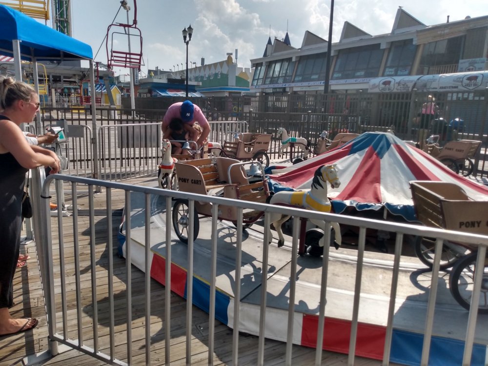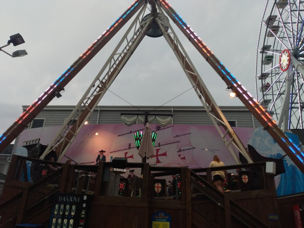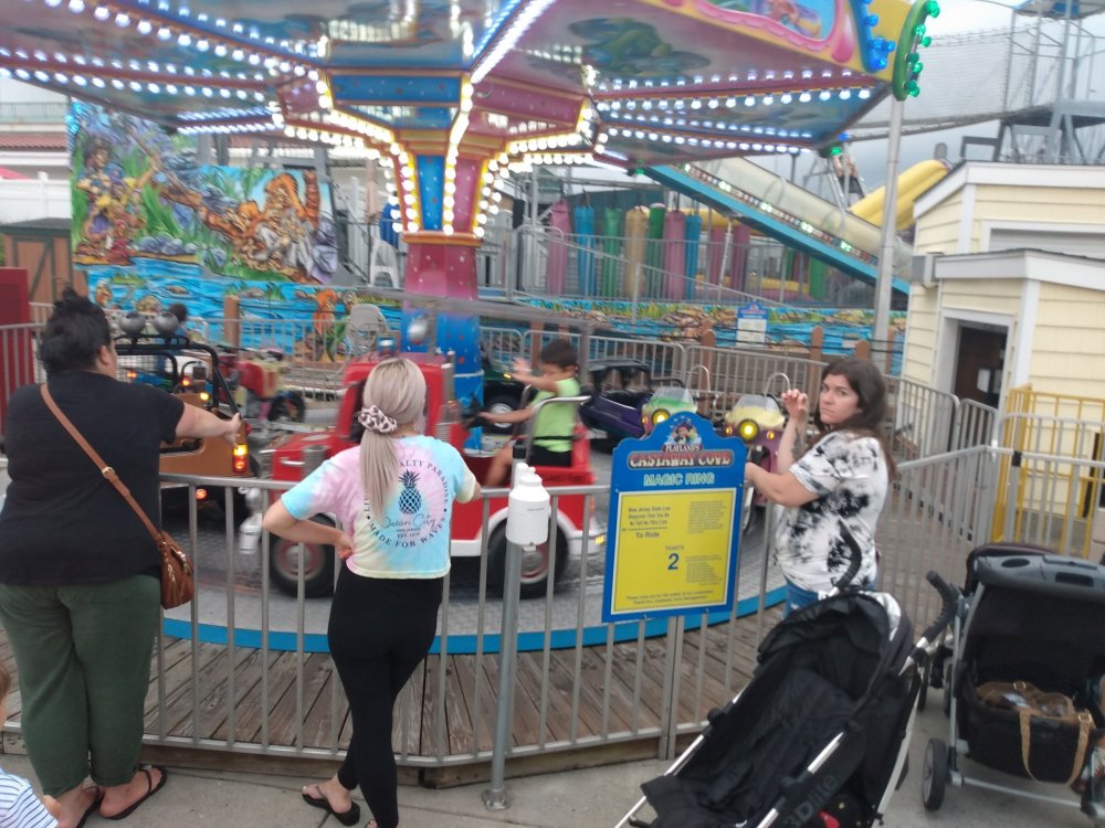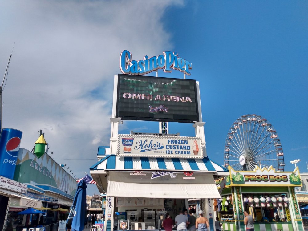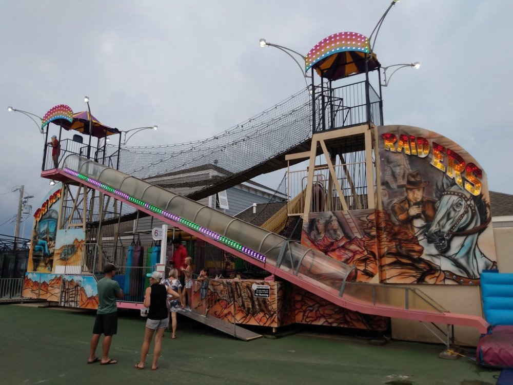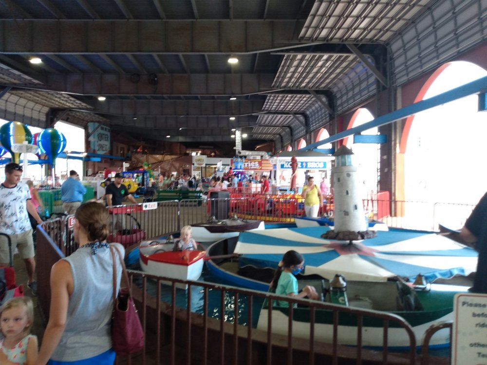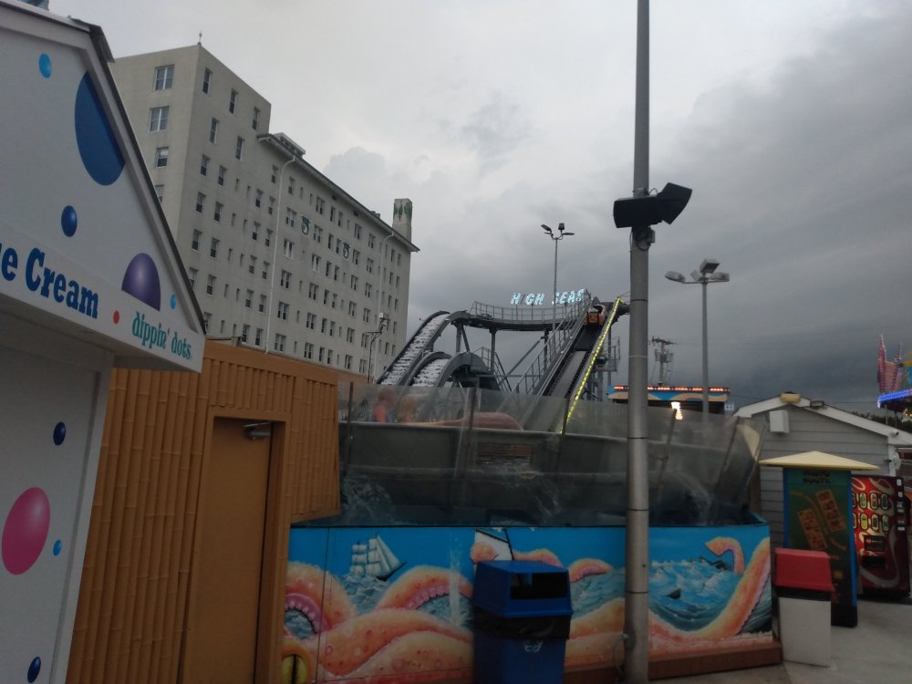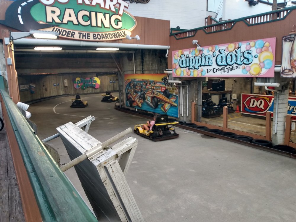 A town that I haven't been to for probably 30 years... Ocean City, NJ Yes, I know I skipped Atlantic City and Beach Haven (for now) - that's because, as you can see in the photos, a wicked storm was approaching and I was desperately trying to get Gale Force before it hit. Did I make it? Read on to find out! So, Ocean City is unique amongst NJ beach towns that have boardwalks in that it's the only one that's dry. Yes, no alcohol - no bars, no liquor stores, no beer stores, no nothing. You can bring in your own, and recently some BYOB restaurants have popped up, but yeah. Needless to say, this town is focused on attracting families. That's why I find it so odd that one of the parks built perhaps the most insane coaster I've ever been on. But I'll get to that later. First, some pictures from the boardwalk itself. They have designated lanes for bikes, walkers, and trams. A pretty sizeable water park. Did not go in. Partially-under-the-boardwalk go-karts. See, Morey's, you can still have this! Bring 'em back! This arcade featured nothing but real video games, no redemption whatsoever! Lots of classics as well as some modern games. Anyway, on to park #1: Gillian's Wonderland This park is partially indoors and partially outdoors, and features a cool castle-motif entrance. Each of the letters that spell out "Gillian's Wonderland" spin; it's quite a cool retro thing to keep around. And first, the indoor rides, which are all kid-targeting. Carousel Boats-go-round Crazy Bus themed to a submarine; first time I'd seen one of these. Balloons-go-round Fire trucks-go-round. Amusingly, some of them have trailers, which I'd never seen before. Kiddie Whip Dumbo-go-round A variant on the Zamperla buggy bouncer that I hadn't seen before. Cars-go-round Moving outside, we start with a standard climbing structure. Glass maze Zamperla spinning flyer Kiddie bumper cars A variant of the Dizzy Dragons, themed to the park's mascot. Wave Swinger Bungie Bounce. Been a while since I've seen one of these at a park. Musk Express Larson drop tower A train ride themed to chopper motor-tricyles. First time I've seen one of these. Standard burlap-sack slide. Big spinny-swingy-thingy that is not for me. An elevated monorail train ride, also goes around the inside part. Adult bumper cars Log flume that is also a dark ride. I really wanted to go on this, but I also really did not want to get wet with a lot of trip left to go, so I passed after seeing some people coming off it considerably dampened. Decently sized Ferris Wheel Standard Moby Dick, without the full backdrop. And a Ring of Fire. Waiting to be assembled, or waiting to be shipped off? I don't know. And now, the rides I did ride: Yep, that's right, I rode a Wacky Worm. Probably the low point of my coaster-riding career. But hey, I really wanted to get to 200, and a credit is a credit, right? Right...?! Anyway, it sucked. Two laps, and one little tiny barely perceivable pop of airtime on the one actual drop on the course in the back row. You know what else kinda sucked? Their dark ride, literally named "Dark Ride." Despite the name, it was full of large rooms and neon-painted decorations. Very little animatronics. Only one story despite the two-story building. I mean, I've been on *worse* dark rides (see my report from the Delaware State Fair), but yeah this was not that good. After those two at Gillian's, I headed down to Playland's Castaway Cove, definitely the more balanced park of the two, grabbing a small cup of Kohr's Brothers orange custand (with rainbow sprinkles), my staple, on the way. No NJ boardwalk trip is complete with out it. This place is cool in that everything is right on top of each other, sometimes literally on an upper deck. First, I'll showcase the rides I didn't ride: Wave Swinger Kiddie swing Kinda a jumbo-sized Kanga-Bounce from Morey's. Drive-'em cars. Tank-control bumper cars!!! I would have ridden these if I weren't alone...bumper cars with strangers is always kinda weird. But, I LOVED the gas-powered ones that were at Dorney Park before Demon Drop got installed. These were electric, but probably still tons of fun. Pirate's Gold Rush, their kiddie coaster. Would have ridden it (adults-sans-kids were allowed), but....you'll see. Burlap-sack slide. Cars-go-round Kiddie whip Kiddie drop tower Helicopters-go-round Standard climbing structure Zamperla spinning flyer Two-drop log flume Tilt-a-Whirl, with the new style cars. A Musik Express called "Rock-n-Roll." Guys, that name is already taken for a different type of ride... Gravitron Moby Dick themed to a Hurricane. Seriously guys, too soon. KMG claw ride Bumper cars Train ride, pretty sure it's the same model as is in Jenkinson's. S&S tower. Nope, still not the smallest one I saw on this trip. Pirate ship Carousel Balloons-go-round Okay, so what did I ride? I first tried to ride Gale Force, but upon arrival at the station, was promptly informed that it was shut down due to impending lightning. Here's some pictures anyway: Bummer. I figured Wild Waves was the same way, so I went to this: I had never seen something like this before. Apparently, it's a Technical Park brand ride model called "Aerobat" (click here for their website and better pictures/video). Castaway Cove calls it "Squadron 33". The wheel spins, and raises like a Zamperla Endeavor, but at a point the longitudinal rotation of the cars unlocks, and the rider controls it by angling the wings to divert airflow. My god was this thing nuts. At first, I was having trouble getting the car to flip, but once I did I could barely get the thing to stop. I must have flipped a half-dozen times before I got it to stop doing full rotations, and this is all while spinning around, coming what felt to be dangerously close to the platform while upside down. It felt like a super-long cycle, and once I got the hang of it I was able to do one or two flips and then recover. Insane, great ride. Why more of these don't exist, I can't fathom. 11/10, 6-stars, 