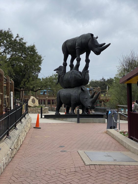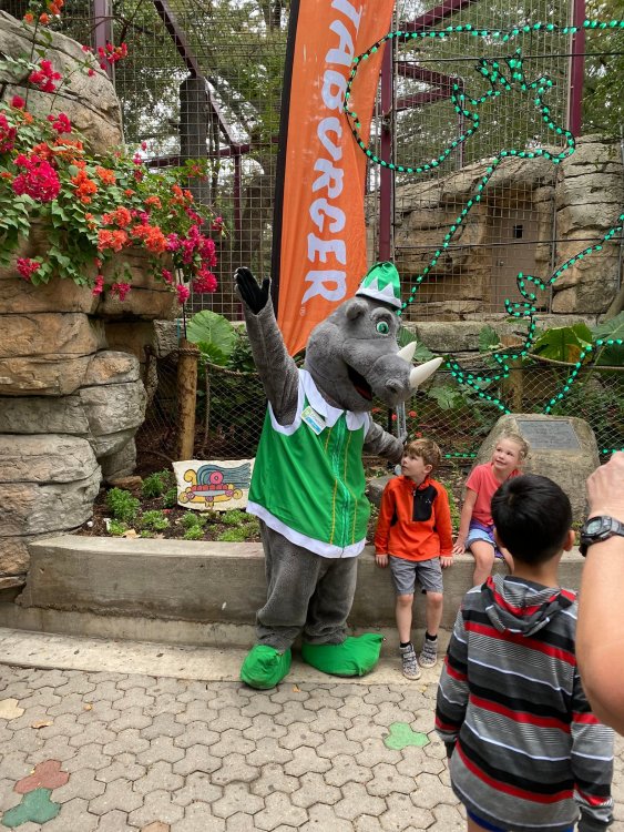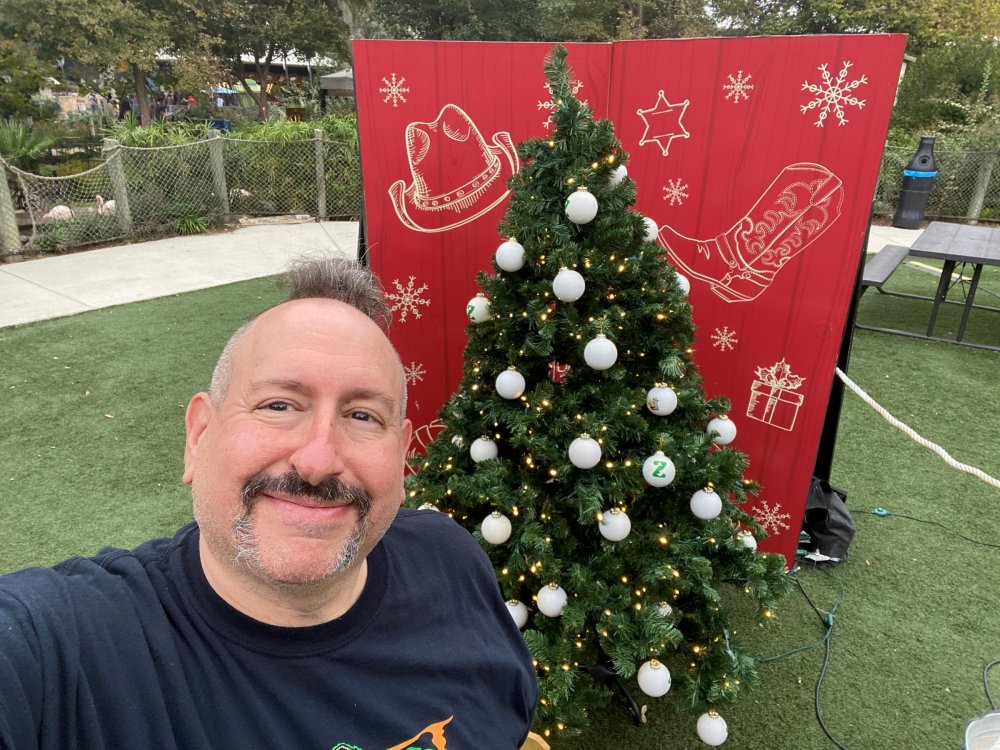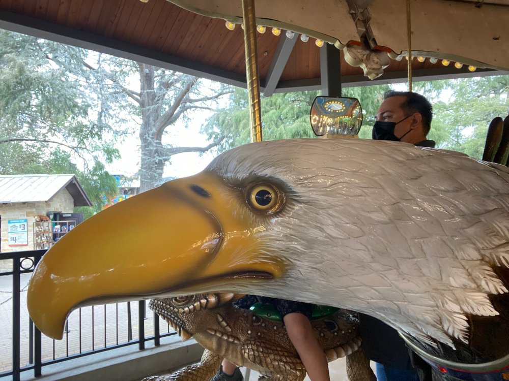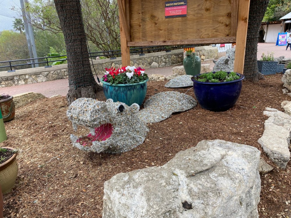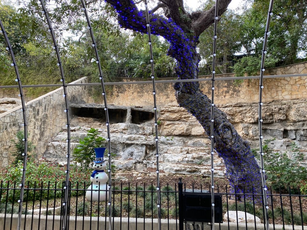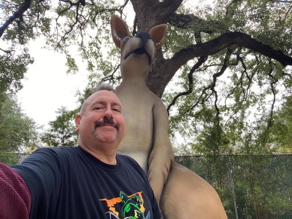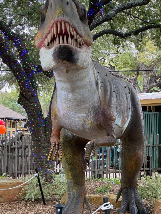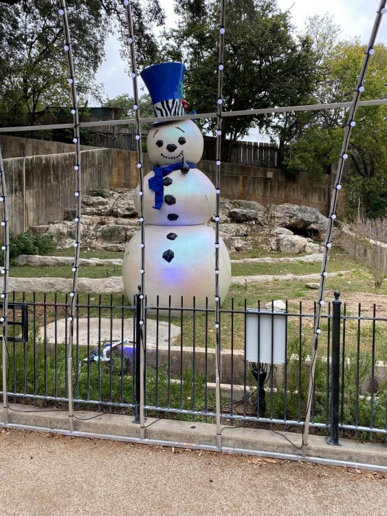 More zoo.. . still in Africa section: the Elephants were all out, and were pretty active today too and just up the pathway? FEEEEEED MEEEEEEEEE the San Antonio Zoo has gotten in on the trend of places charging for every possible extra. . so yeah, you can feed the Elephants, or fish, or Birds, or Giraffes (if you pay extra) or walk with the flamingos, or kangaroos, or take behind the scenes tours. . if you pay. i TOTALLY get that they are raising additional cash this way, and good on them. but is sucks that things like the Giraffe Enclosure - that used to let you get up pretty close to that barrier, no longer lets you do that - unless you want to pay to feed them lettuce. oh well, still got some pretty good pictures. the Giraffe Enclosure also has Zebras and some Emus in it. . some of those guys just don't wanna deal with people, and preferred to hang out towards the back of the enclosure eating the provided food, instead of having to intermingle with HUMANS to get it: the Emu was hiding underneath the platform. .but can still see them from certain angles More of that really nice artwork that's around the San Antonio Zoo.. this one just outside the Rhino enclosure who were also all out and about. . .and eating. They must have just done a feeding after the zoo opened. these were put up for the Zoo Lights. . so temporary art. but love the signs warning the kids to keep off "Santa's Watching". . . . LOL and a Rhino that also lights up Warthogs recall I noted that one can really tell where the "old zoo" starts and the "new zoo" ends? yeah. . getting over into the older zoo section now with the old skool enclosures: for some reason, this display wasn't near the Giraffes. .but was in front of the Lion enclosure. I thought Lions didn't tend to go after Giraffes since they are so big? the Giant Anteater was actually out. think it's the first time I've ever seen him! I saw these suckers in Japan. .they are MEAN. and they look mean! just look at those claws. amusingly. . as so many of the animals that are never active were active today? the big cats - that usually are prowling - were sleeping, and kinda hidden, today. here's the Lions: and here's the Tiger - hanging out in the hammock even the Kangaroos were kinda lazy this afternoon. tho the Porcupines were quite active yeah. . older section of the zoos.. but at least this enclosure seems to be getting a bit of love. (some of them have sat empty for years, and one of them even just has a giant tree in it) how does *this* bear measure up? hahahaha. .that sad enclosure that I just mentioned that only has a tree in it? they "festive-ed" it up, by putting lights on it, and a snowman! HA! again, the enclosures in the "older" section of the zoo, can be a little bit depressing. but I guess Fish (and birds) that tend to be over in this section, don't really care. Mean. . . so mean. and just waiting for a small child to fall lin. another "repurposed" empty enclosure. HO HO HO way way back at the very end of a dead end. . is the Kangaroo encounter (no feeding tho). the zoo put this big Kanga at the end of the main path to at least draw people over, so they would see what's over there. it worked for me. . even if I didn't bother with the paid "Encounter" [Kennywood] Turrrrrrrr-tullllllllllle [/Kennywood] wow. . BOTH Eagles were out. one perched: and one on the ground eating what looked like a dead mouse: moving out of the older section back into the newer areas as I make my way around the zoo. . ther really are some lovely areas. think this is an older part still tho.. as it's not ADA compliant, and several sections of this path were closed-off and way overgrown. but you can get some nice pics from this "bridge" another one of those huge "I'm not scared of humans" Black Squirrels I'd held it off long enough.. time for a ride on the Zoo Carousel. Strangely, NOT called the "Conservation Carousel" here. I wonder if the National Zoo Association knows they broke precedent? at only $3 a ride, it's a fairly good deal. I had really wanted to ride the Eagle. . but once I got to it, I quickly realized that any adult is gonna have an issue. . as the way they did the wings? there's no place for one's legs to go! so I settled for the Tree Frog next to the Eagle. Whee! It really is quite lovely. . if not the greatest Carousel I've ever been on. Still. .it's a nice one. and a *really* nice job on the animals/reptiles on it. it was getting past 2pm by this point, and SFFT had opened at 2. . so I headed over to the last sections of the Zoo I'd not yet been to - mainly Amphibia, for the frogs/creatures. and they had this area all done up for the Zoo Lights with a few displays up. " so I stopped in front of a few of the decorated trees/backgrounds that I liked for some selfies. it was so quiet over here, I took my mask off for the pics. (this area is really sorta hidden off the main pathway around the zoo, since the Kiddie Amusement area cuts it off from the front gates of the zoo) as noted. .it's really sorta hidden back here. So imagine my surprise when I realized that over here is where they had put Santa and "Twinkle Penguin the Elf" for photos. Twinkle saw me taking pics and called/waved me over to them. She said "So what would you like for Christmas?" and I responded: "Well, I'm Jewish, and Chanukah starts soon. . so what I'd really like for Chanukah is a free photo with you and Santa on my phone, instead of paying for a picture" She and Santa both laughed. . and: Ta-Da! there was no one else around, so I hung out and talked to them for a few minutes - she liked my shirt, and my hair.. and we just BSed until some families showed up to purchase photos - at which point I took a quick pic of them, and went on into the Amphibia display. not sure what kind of sea-snakes these are. .but they freaked me out. NOPE Big, ol, fat, frog. there's a nice play area out back over here with some lovely mosaics too. Some small animal enclosures. .but I think they might rent this area out 