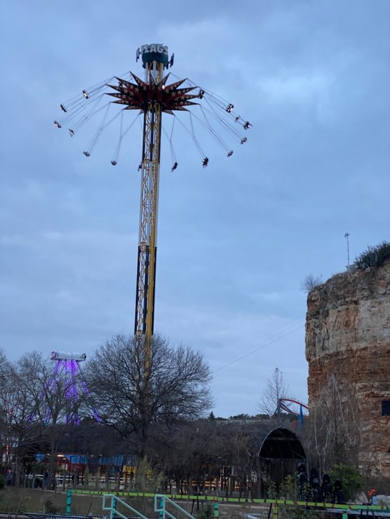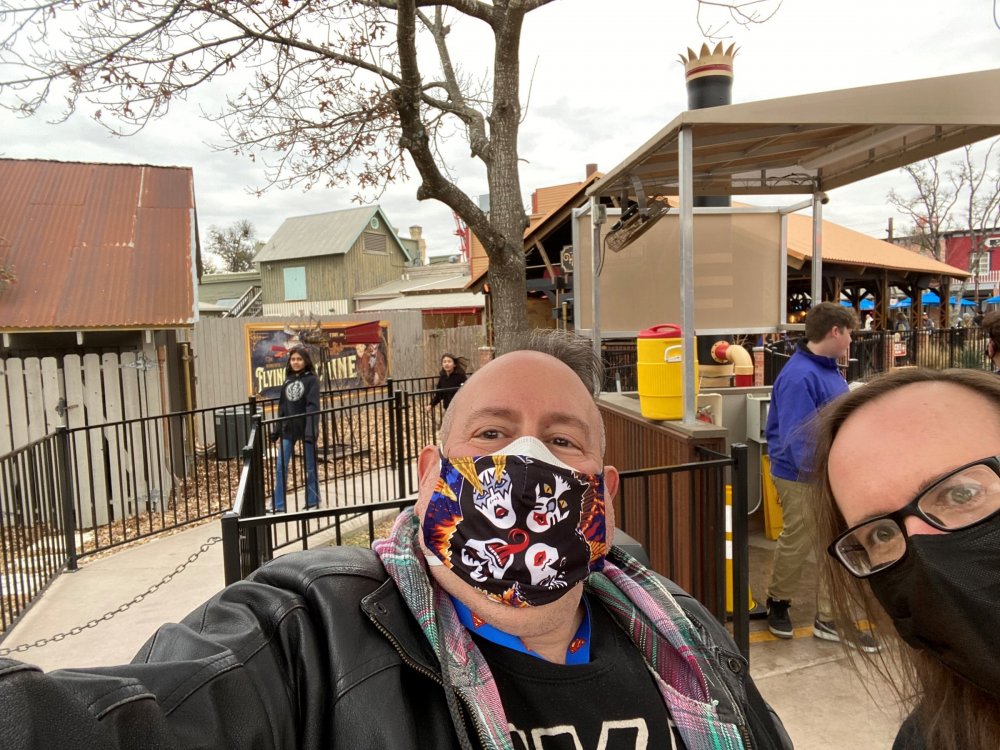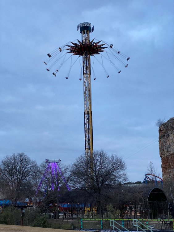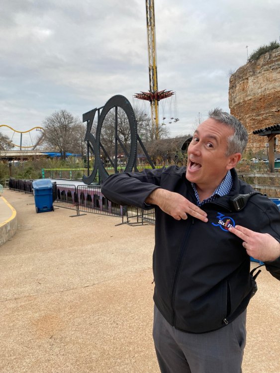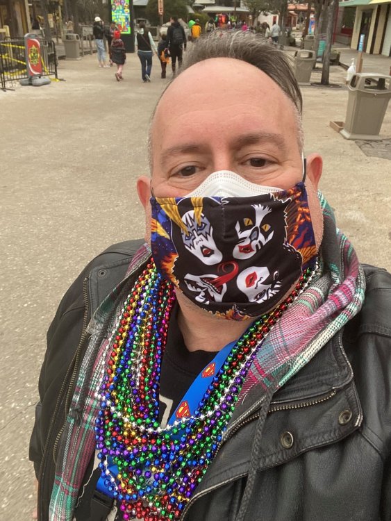 in the park yesterday for an event - where many parks presented their 2022 plans (and beyond) which was a lot of fun, and I'll get up a report on that at some point (hopefully). . . .tho we did manage to get two walk on rides to Iron Rattler Back Seat, Superman, and a walk on to DareDevilDive (which broke down for 10 minutes as we were about to get on it. . . .but once reset, we got a ride, and it *IS* now going back up to the top of the tower before it starts flipping the planes so yay for that). Guess it paid to go to the park on a cold and overcast day - and everything was operating despite the weather and the light crowds, *except* for Poltergeist. we were inside Zaragoza theater almost the entire operating day tho. . so didn't get to get into the park itself until ~4pm when it closed at 6. . and take out for the time watching the Parade (which was full on and fun, even with the light crowd due to weather), and a backstage tour of construction on Dr. Diabolical Cliffhanger. So that's not a bad ride count considering we really only spent ~1 hour available to do "rides". . . . We got an hour after close to ride WonderWoman tho and taste lots of the MardiGras food offerings. but. . what I think is some of the bigger news? Skyscreamer is still offering the "Harness" option. (it was supposed to only run for 3 weeks and be gone as of 1/6/22). I asked a few of the Mgmt folks on the construction tour, as I noticed the harnesses on it. Most of them were cagey about it. . . "yeah, we're still offering it until we dont". . . but i did get someone to kind of admit that (and take this with a grain of salt, but it's from a horse's mouth, if not THE horse's mouth (ie: not from Park President): "it will continue running for free as an option thru the end of this week" (which I guess means today), "and then will be offered as a pay option" no idea how much it will cost, but I guess they have the infrastructure in place to support it as a paid option (separate line for it, and area to get in the harness). . i I suspect this will be a true statement. so there ya go . and to give you an idea of how crowds were yesterday ~4:30 pm: post parade bert: (and no you dirty minds. . I didn't have to show anything to get all these beads - it was too cold to anyways - but if you want lots of beads? catch the parade on a day without much crowd. . every float will have folks tossing beads to you) and can't post pics from SFFT without including the incredible Park President: Mr. Jeffrey Siebert1 point
