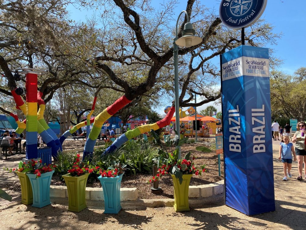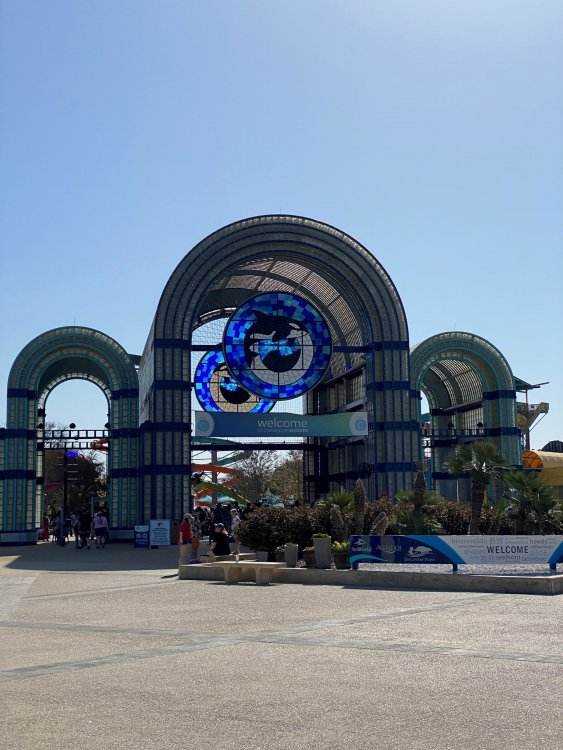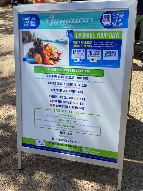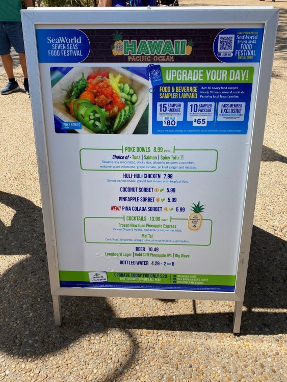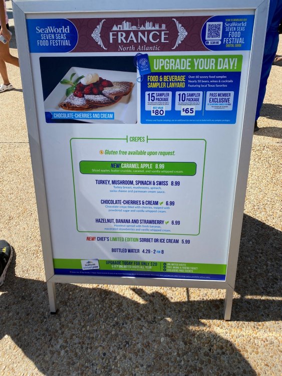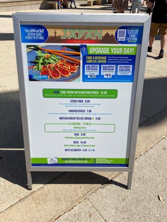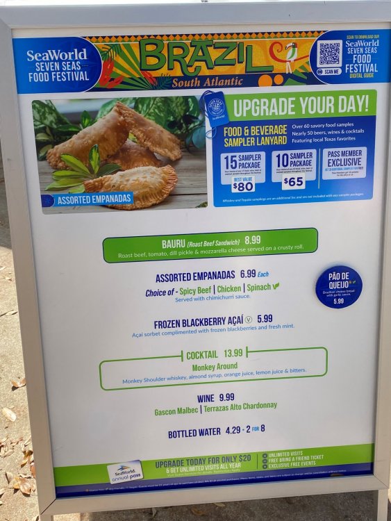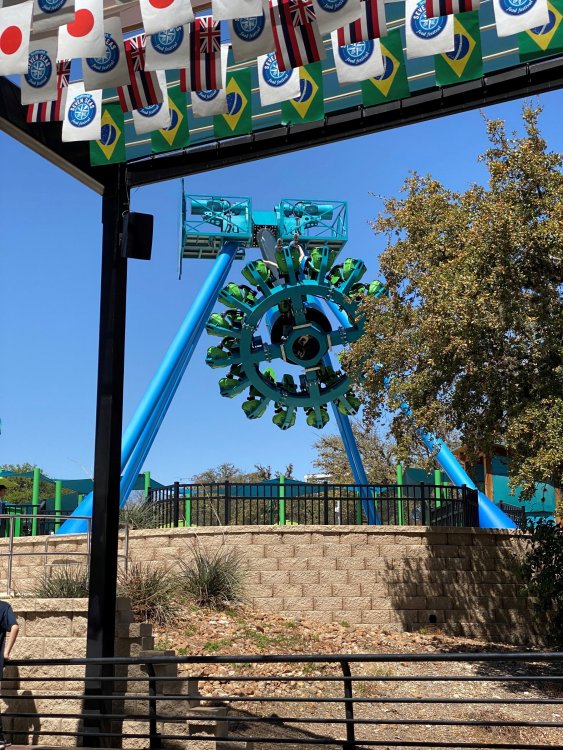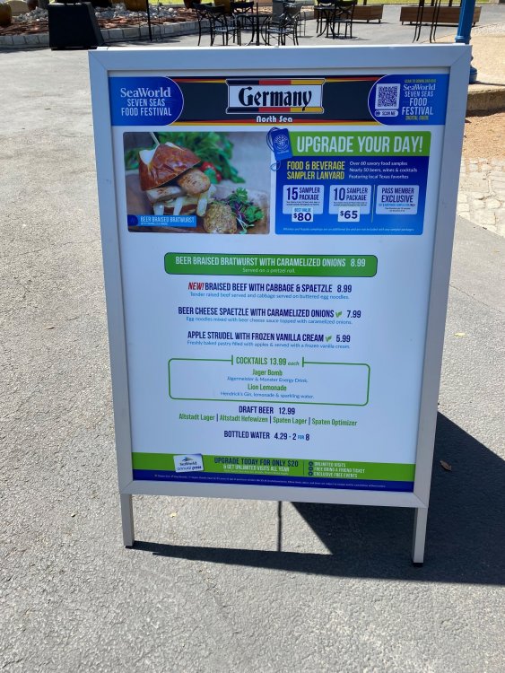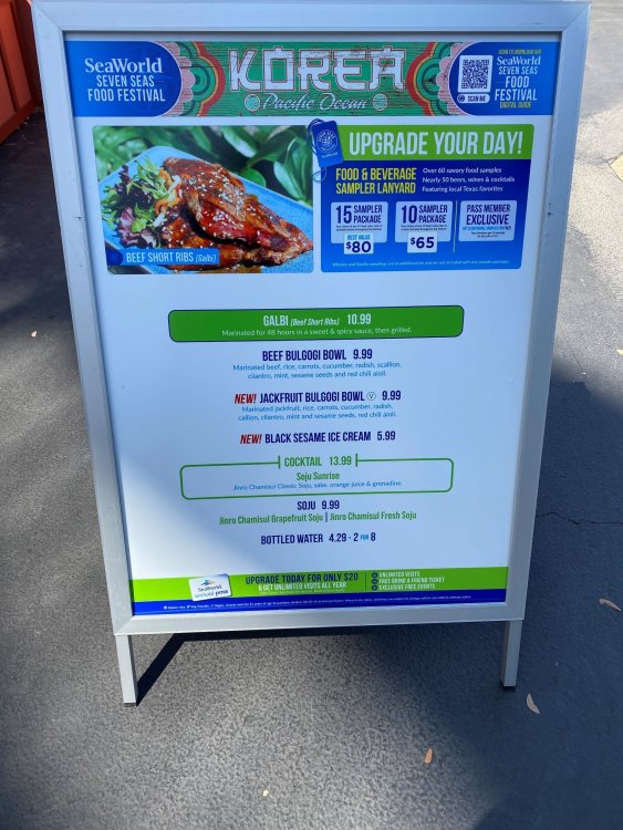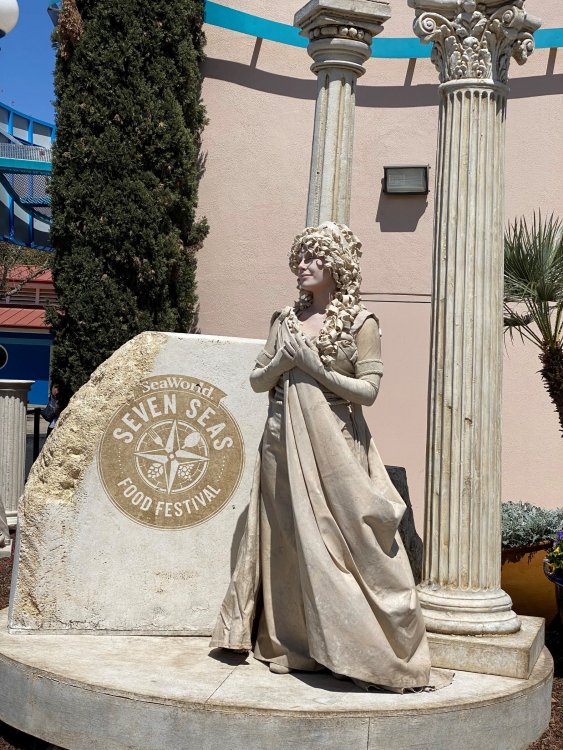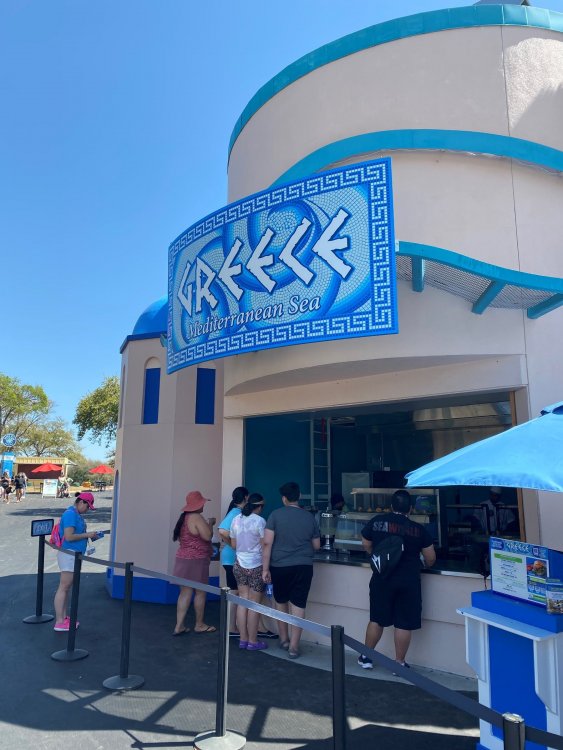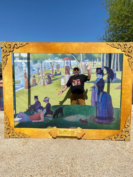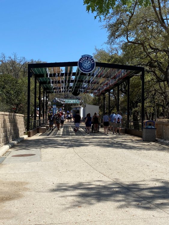 So yesterday, I went up to SeaWorld San Antonio to enjoy the 1st weekend of Seven Seas Food Festival. had a really good time, although dealing with some Med interaction issues, that made me take it pretty slow when moving between Food Stands (resulting in one loop around the lagoon taking ~5 hours to stop at each stand), and tho it was a GORGEOUS day, the ride I did the most was "Bench" Here's how the day went. . and please keep in mind that I didn't try anything from Hawaii, Japan, Italy, or Greece (yet. . was just too full! So those will get tried, along with my favorites from Saturday, when I'm back in 2 weeks to help celebrate Great White's Birthday). let's take a look at the Seven Seas Food Festival at SeaWorld San Antonio! Lovely drive from Austin to San Antonio today. . . SW is a bit further than SFFT for me, so it takes ~1:40 to get there from my house. but I arrived just before opening to a bit of a back up at the parking gates, and a LOT of cars in the lot already. Luckily, because my Season Pass has a hard time reading, the gentleman at the parking booth apologized for the extended wait, and gave me an Up Close Parking pass. I'll take it, even tho a day at SWSA involves a lot of walking anyways - it's a big park! hmmm. . . doesn't look too busy just before opening. oh. . . on the OTHER side of the main arch. yeah. . . Luckily it turned out the vast majority of these folks were either heading to Aquatica, or were going into the SW side for some sort of cheer competition that was taking place at one of the large auditoriums. so it meant that we had lovely weather, and really short lines for both the food, and the rides (tho as noted, I skipped pretty much all rides due to concern about my BP being low) Once the main gates opened, the lines moved fast tho, and before long was at the main Welcome booth - where i decided to wait in the short line to pick up my Seven Seas Food Festival Badge - which would have been WAY quicker, if both registers were only selling that. However, the registers also were selling meal plan. .and almost everyone in front of me were large groups buying meal plan for the day, and unlimited Drink Cups. So . . yeah, that took a while. On the website it notes you can pick up your prebought Seven Seas badge at any booth. . but I only saw one other booth (Korea) that actually had them available, so I was glad I waited here to pick mine up. To be fair, it's the 1st weekend. . I'm sure as it progresses, more booths will have the lanyards/badges available for pickup. one thing I noticed as well. . many folks were paying cash for the daily meal plan. So SWSA is still a cash *and* credit park. once i had my lanyard/punch badge, I headed to Mexico. . where I was meeting up with several folks from the "local" / Texas Based: Thrill Seekers United Group. and my Friend Amy, who had helped organize the casual meet up to tour the world of food, wanted to start at Mexico (I suspect for the Margaritas :p) Unfortunately for me, alcohol is a no-no for me at he moment. But everyone that tried the drinks said they were excellent at every booth. here's the offerings at Mexico: these are the Baja Grilled Shrimp Street Tacos. the shrimp were great, as was the tortilla, but I found the red cabbage way too dry. . I think the fix for that would be to either add more of that Aioli, or toss it in a vinaigrette - or a quick pickle - would have made it better, I think. But it was good. the top are the Chicken Tacos (which I was told were good) and below are the Sopapillas - which I tried one of and were really great. Just sweet enough with the brown sugar & honey, and pillowy soft. this is the Deep Fried Elote - which I was told I must try when I go back (so I will). . it looks great. and below is the Braised Beef taco, which got the comment to "pick off the jalepeno, as they are super spicy" While waiting for some to get Margaritas (with edible flavored straws!), I peeked over a construction fence. what in the world is THIS?? . . .hmmm. . . . we discussed among ourselves, and we think we know exactly what this foundation is for. . but wont' say in public, as we wouldn't want to ruin the park's big 2023 announcement! then it was onward to France! this is the Chocolate Cherries & Cream on the left, and the Caramel Apple on the right. I'm not an apple fan, but was told it was good. The Chocolate Cherry is excellent, but a little bit too sweet for my tastes (tho others with us loved it) the winner of the day for me: the savory Turkey, Mushroom, Spinach and Swiss Crepe. this thing was AMAZING. . .I could have had several more of them. Favorite thing I tasted today, and highly recommended. oh looks. . some of the Countries have entertainment, and some of them have Photo Ops set up. how fun. . I'm in a Seurat painting! (A Sunday Afternoon on the Island of La Grande Jatte) Seurat, knew a lot, about dots While sitting eating the crepes, we got a lovely view of Steel Eel & Wave Breaker across the lagoon. . look at that Lovely Weather! It got a little warm, but beautiful. (tho by now I was really feeling "off" and knew I wasn't going to be riding anything "extreme" today) Sad that Tidal Surge had very little line, but no way could I chance a ride on it. So I focused on the food, and visiting with friends - which were the main reasons I had come today anyways. onwards to Germany! this is the Beer Braised Bratwurst with Caramelized onions. the Bratwurst itself was very good. The onions simply didnt' have enough to counteract the amount of mustard on this thing, and therefore couldn't really taste them. but the real sad part was the pretzel bun just was not good. . it tasted a bit stale. Top is the Braised Beef Spaetzle, and bottom is the Beer Cheese (without the Onions) the folks who got this said it was "ok" but it doesn't look like a "must try" to me, which is a shame. and this is the Apple Strudel - which I was told was fantastic, and the best offering on the Germany menu (didn't try, as I don't l