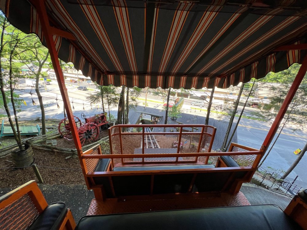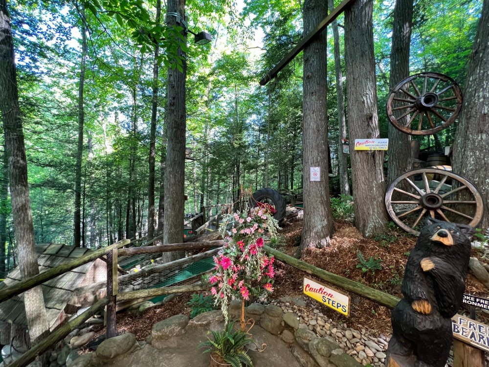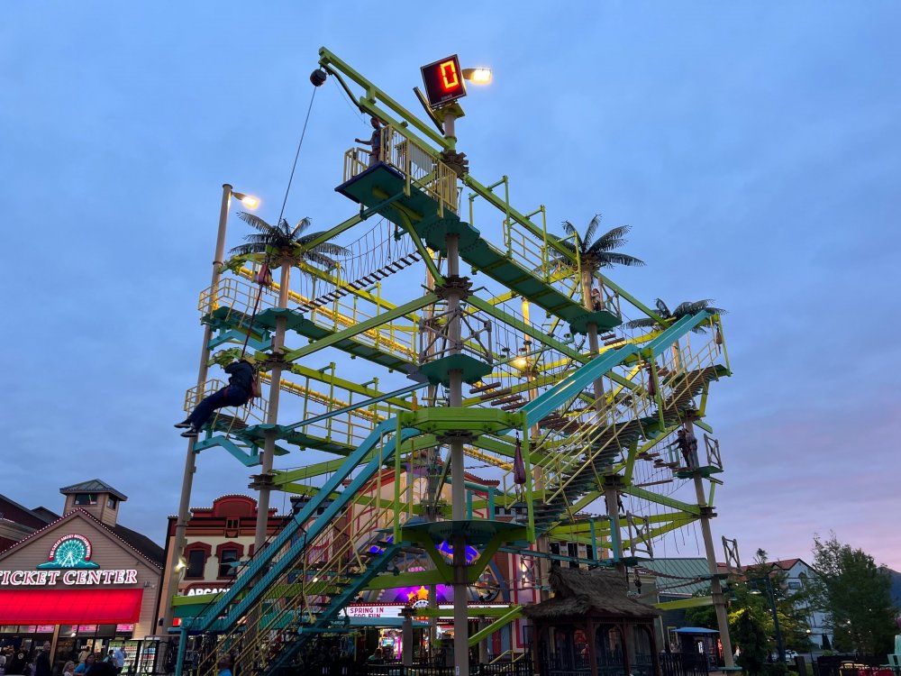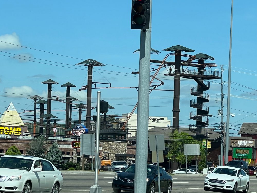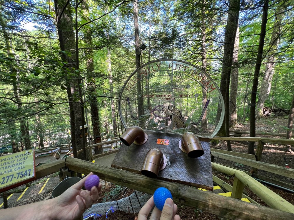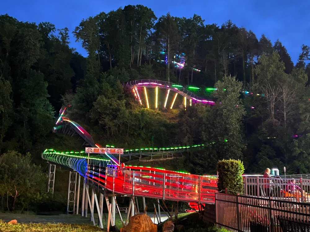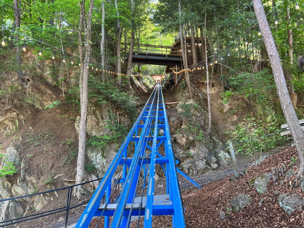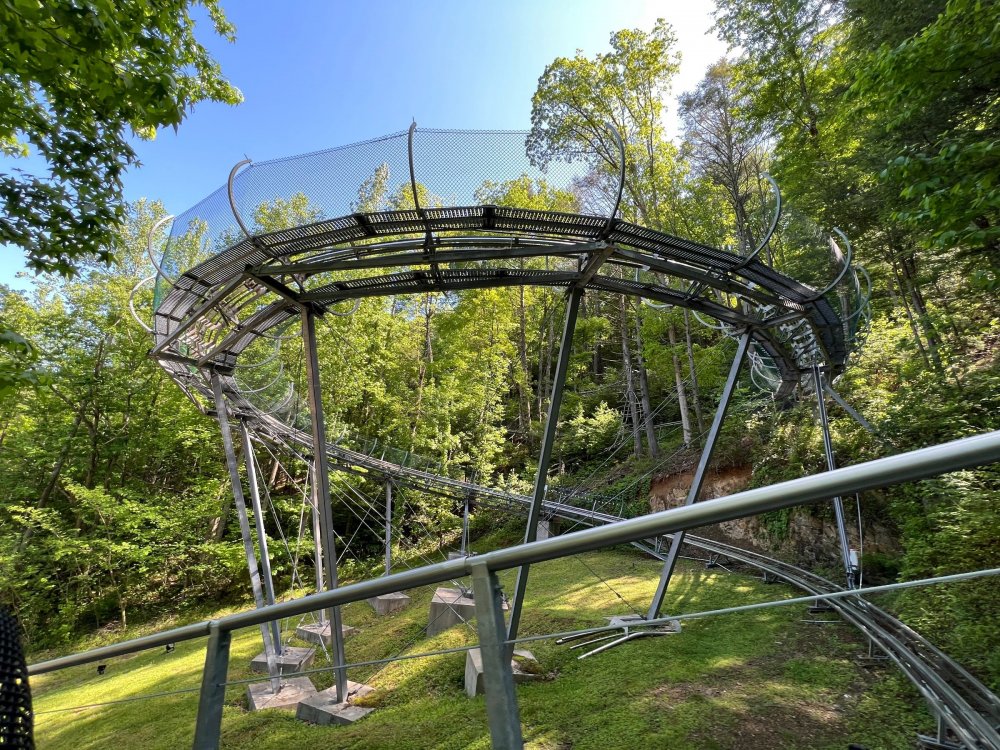 After our time at Dollywood we rushed over to The Island at Pigeon Forge to experience a little more kitsch, a little more moonshine. It would be our last evening in town and the following morning we'd have just a little bit more time before we'd have to drive back to Knoxville for our flight. An anchor attraction in The Island at Pigeon Forge, SkyFly Soar America is kind of like Soarin' but focused entirely on American destinations. The experience lasts 20-30 minutes and includes several pre-shows that add to the steampunk-ish story that bookends the soaring-over-America portion of the experience. I appreciate the nods to the World's Fairs of the past. This pre-show was a clever way to pulse groups before the main show. You take a "tram" that bullets you across rails to the station where dirigible in which you'll be flying over America is found. Pardon my finger. The experience has a fun set of hosts, a father and his daughter who are your hosts for the journey. There's a classic Soarin'-style preshow... Complete with a "Nice job, pal!" nod. The experience is familiar but different to Soarin'. Unlike Soarin' where the riders are raised up into the screen, in this attraction, the platform that holds the seats rotates to a vertical position, moving the front row to the bottom portion of the screen, mid-to-mid and the third row to the top of the screen. The film itself was fine--about 6-7 minutes in length with some real footage shot with drones and some CGI elements. My main complaint is that the visuals, whether real or CGI did not seem to be made for large-scale use. This was 720p-1080p footage at best stretched onto a massive screen where inevitably, the pixels would be easily seen. It was probably relatively cheap to produce but it makes this somewhat-new attraction feel dated because it looks less clear than the 2001 film-based attraction it was inspired by did when it debuted. The majority experience is derivative for those that have been on Soarin', from the safety video to the ending where you soar over the attraction's home (in this case The Island at Pigeon Forge, poorly animated in CGI) into the sky, only to be met by CGI fireworks that actually pop in the same formation as Mickey ears. You can get a better idea of how the platform moves from this angle. I needed a drink after that experience... And as fate would have it, I could sample a bunch of Ole Smokey Tennessee Moonshine for $5 across the way. The good stuff. They had amaretto too and it was bliss! They had some small flat rides and a spinning coaster here but I didn't feel the need to bother with any of them. They have a giant ropes course here that even had two of those glider tracks that we used to see at IAAPA. A brave soul takes the plunge at the end of the ropes course! I don't often find that cities with a giant wheel merit the need or have a view that would make it worthwhile, but in this mountain setting, I think it would be worth it for some visitors. Not something we felt compelled to try but I understand the appeal. The Island at Pigeon Forge is filled with shops, experiences and restaurants and features a really nice fountain show out front. Nothing Bellagio or World of Color-level but still a nice plus in the evening. That night we went back to the Rocky Top Mountain Coaster and the Smoky Mountain Alpine Coaster for night rides on each. While daytime rides are fun, you need to experience these at night thanks to the unique lighting! The next morning we woke up to a beautiful day, loaded up the car and drove back to Gatlinburg for a few final stops... It had been closed due to the rain two days before, so we were intent on trying to get back to Hillbilly Mini Golf if we could before we headed home. We were among the first golfers of the day, so we took the inclined railway up... Which is a unique experience in and of itself. You arrive at the top of the incline railway where you can choose to play one of two 18 hole courses. While the holes are a little more standard from a mini golf standpoint, there are some neat added options along the courses to throw in a little more fun. To their credit though, the setting is super unique. We had a great time roaming the course and it should be noted that the employees working here were the nicest out of anyone we encountered the entire trip, and that includes at Dollywood. Feels like I have to share this. With our flight just a few hours away, we made the quick call to drive from Hillbilly Mini Golf to the Moonshine Mountain Coaster for one more run. This was the first alpine coaster we had done on our trip and the one that set us off to go ride as many as we could throughout the weekend. One more time would be appropriate. And with that it was time to head home. One last drive through the Smoky Mountain National Park. We waved farewell to one of the greatest of Pigeon Forge's attractions and saw Jurassic Jungle Boat Ride next to it. I really wrestled with whether or not we should pay the insane price to go experience Paula Deen's Lumberjack Fued, if only to try the zipline coaster. Maybe next time... But probably not. Country roads, take me home... Oh, and I might have brought a loaf of Dollywood Cinnamon Bread home with us.1 point