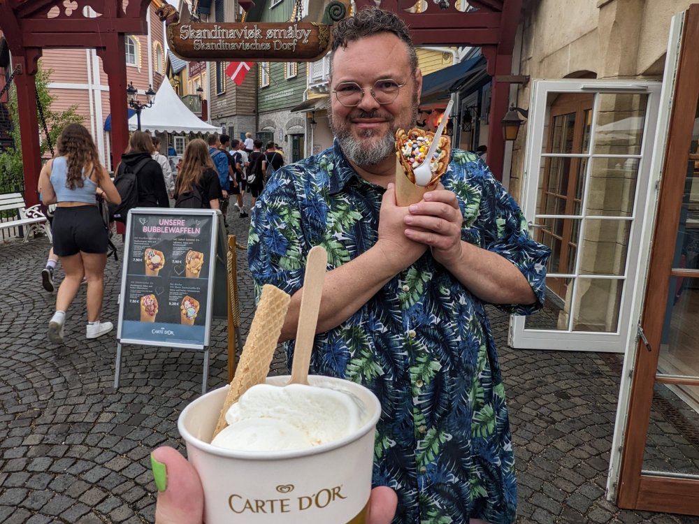 Bonjour! Erik & Smisty here. You may remember us from such trip reports as Erik & Smisty & TPR do Holland, Poland, and Swedeland. Travel has been kind of weird the past 3 years--and still is--but if TPR was ready to give organized trips a go again, we were down. We went to 12 new-to-us theme parks, rode something like 40-45 new roller coasters (I don't really count) and 30-40 new dark rides. There was less sightseeing on our own this trip, both because of timing and the fact that we flew in and out of the same city this time. But we still got in a few extra things. As a reminder, in addition to being overweight, I have scoliosis. And while my condition has never (to my knowledge) been exacerbated by riding roller coasters, and I can generally fit on most everything, how a particular ride's restraints fit me will often greatly affect my opinion of the ride in a way that often won't make a lot of sense to other people. On the other hand, I tend to be pretty forgiving of general roughness or violence as long as it's not specifically targeting me. So, for example, I find Helix (at Liseberg) awful, but I love Desperado (at Buffalo Bill's). So, just because I don't like a particular ride certainly doesn't mean that you won't love it. Everybody good with that? Okay, great! Also, please bear in mind that I am crafting the first part of this trip report whilst under the influence of European Brand COVID™, so my already often strange captions may or may not end up being total gibberish. Off we go...! Part 1: France in Germany Part 2: Germany in Germany Part 3: Exotic Belgium Part 4: America in France Paris! Okay, enough of that. Wait, this is my first coaster of the trip?! I don't even ride s#!t like this! But the park was so nice to us that I didn't want to appear rude. Which, I guess I'm kind of being rude now. Sorry. Let's start again. The first official park of the trip was originally meant to be Europa. But since that's a 10-hour drive from Paris, and European labor laws required a fairly lengthy break in the middle of that for our bus driver (fair enough) it just made sense to stop at Walygator Grand Est. Just one problem: Walygator was closed that day. But Robb somehow convinced them to bring in a few people to walk us around and let us ride a couple of their coasters. So that's kind of amazing. This is Anaconda. A William Cobb woodie with a super-interesting layout and a super-bad reputation. However, the park has recently put quite a bit of work into it, and that reputation needs to be reexamined. Sure, it's not particularly wild, but it's very smooth. How smooth? Well, I started with a front seat ride to get a feel for it, and then happily hopped into a wheel seat towards the back--which was also good. This ride is tons of fun! I mean, it doesn't really have airtime or significant laterals or anything, but it's certainly not the second-worst coaster in Europe or whatever. Great job, Walygator! I skipped this, but Misty loved it! Here you can see her having convinced the poor Walygator PR guy to ride with her. If Anaconda is not intense, it's only because this ride has sucked all the intensity to itself. I'm not sure that makes sense, but basically this is Raptor except somebody forgot to install brakes on the mid-course brake platform, resulting in a first half of Raptor-ish intensity, followed by a second half of holy-crap-Raptor-is-a-kiddie-ride intensity. I respect it, but once was enough for me. It wasn't part of the plan, but Smisty asked Elissa if she could talk the park into letting her by a stuffed Waly Gator. So they opened up a gift shop for us. Now, I had pretty much convinced Misty to buy a gator that would fit into her bag. But then Elissa (who is now dead to me) was all Satanic-influence with, "Hey, they opened this gift shop for, you have to get the big one!" But it gets worse. See, Misty was then talking to one of the park managers and thanked him for opening up the gift shop so she could buy a stuffed alligator, and he responded by gifting her a frigging Monster road wheel. Happily, they also gave 9 other wheels to the group, and I'm pretty sure that everyone who wanted one got one, so I'm not the only one who knows the joy of trying to get what (out of context) looks a bit like part of a nuclear reactor through airport security. But hold on, there's lots more parks before we start worrying about heading home! Our first day at Europa began with ERT on the indoor CanCan Coaster, followed by Silver Star (in the rain). CanCan Coaster (inside the golf ball) was fun and well-themed, though the restraints/seat horns weren't entirely ideal for me. Still, I rode it three times (once with the lights on) so they weren't that bad. I liked Silver Star a lot, despite a bit of rattle. That rattle was a deal-breaker for Misty, though. And yes, the golf ball is rather Epcot-like--except they put a roller coaster in it. Good artists borrow. Great artists steal. Now on our own, we headed for the park's newest dark ride, Arthur. But, really, Arthur is more than a dark ride. It's an indoor/outdoor powered coaster dark ride with a whole indoor area built around it. And it's great. We rode it 3 or 4 times over our 2 days at Europa, which required some effort and commitment considering how popular it is. I honestly had no idea that Europa had a fairy tell walk-through and push-button area! See, after the last trip, I was left with a conundrum: did I prefer Efteling or Gröna Lund? Thankfully, I now have an answer: I prefer Europa. Look, they even have self-operated rides! (Well, one. ) It pretty much rained the entire first day. But that was fine by me! It kept it from getting too hot and scared most of the locals away. No lightning, though. So we rode lots of stuff, including some water rides--including this splash battle, which also had indoor dark ride sections. Because everything at Europa is a dark ride. Of course, the weather wasn't ideal for photography. But that just gives me an excu