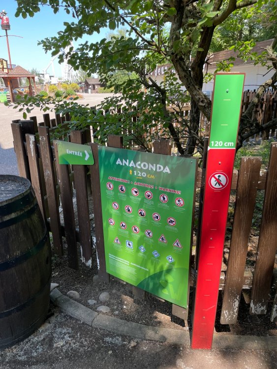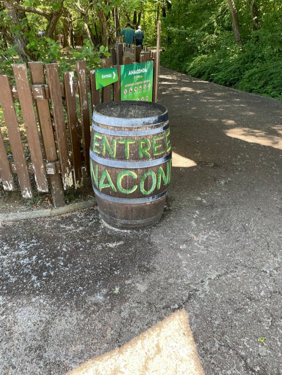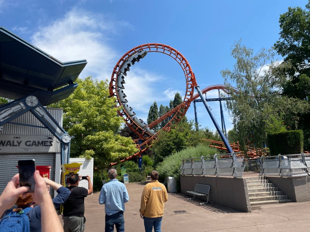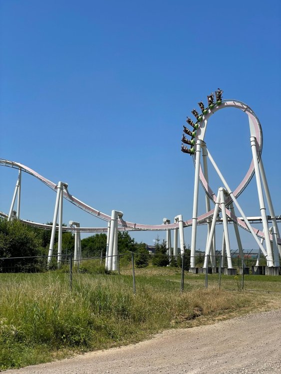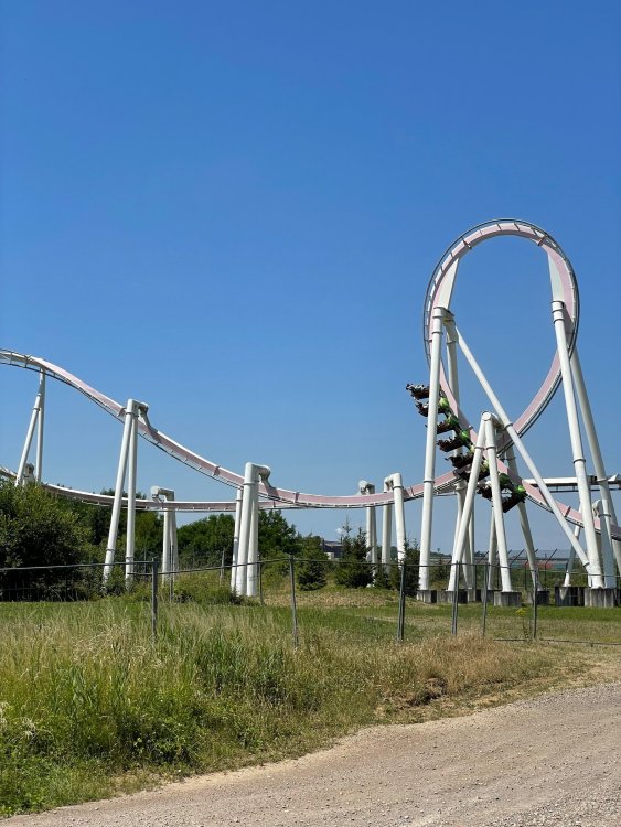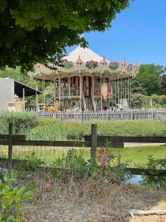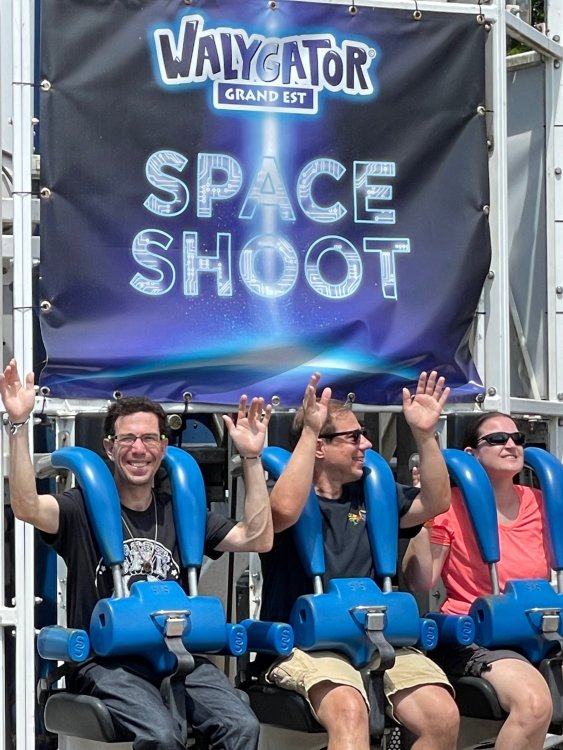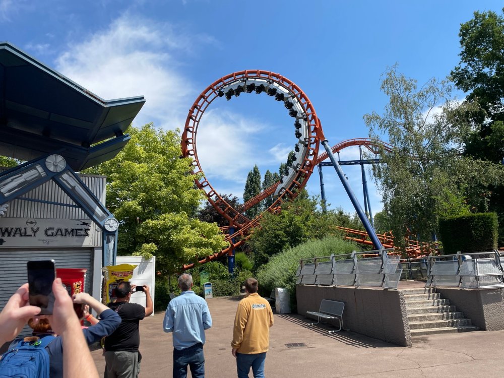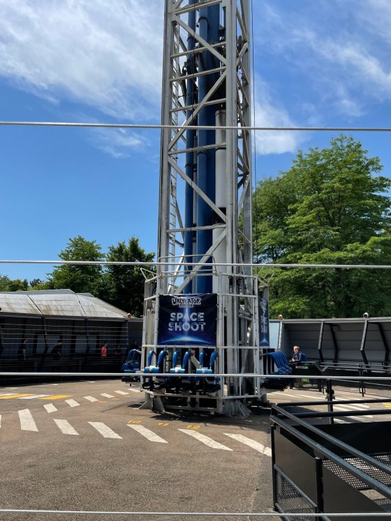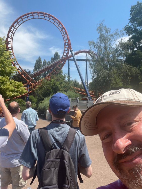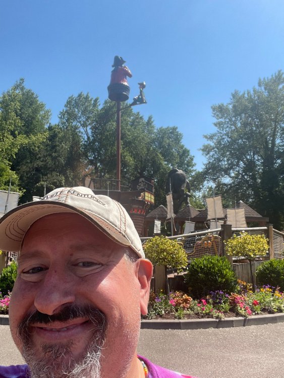 On to the official day one of the trip! this was a packed day, out of the lobby and on the bus at 8:30am, driving from France to Germany (with a bonus surprise park along the way) and checking into hotel El Andaluz at Europa park post 7pm - too late to go into the park (closed around 6pm this day), but early enough to explore the hotel and surrounding hotels - which were all super neat. so I will break up day 1 into two parts. first off, let's have a look at the hotel at the Airport in Paris where we had stayed, Hotel Ibis. it was very typical of a European Hotel (so I was told). . fairly small room, with two small single beds (with very thin mattresses). oh, it was fine for staying in overnight, but glad we weren't here for multiple nights, as the beds were probably the most uncomfortable out of all the hotels we stayed in on the trip. But hey, at the end of the day? I'm in Paris (at the airport, but in Paris. .so I'm not complaining!). the view of the hotel area at this stop for the airport shuttles as we were walking to the bus that would be our main mode of transportation for this trip. The Paris airport is HUGE! on the bus! and ready to go! I think there were 36 of us, on a bus that sat 50? so plenty of space to spread out and move around. . although I ended up sharing a row with my roomie James for the entire time we were on the bus thruout the trip (such a wonderful guy, and he put up with me as I got more and more stressed about what was going on at home during the trip. Both on the bus, in Disney, and in the room). Really. . James is gold. The TPR crew on official day one of the trip, as we're leaving the CDG airport in Paris. Photo courtesy of Robb this was on the window, and just cracked me up, every time i looked up at it. I mean, I know it's directing you how to use the emergency "crowbar" thing to break the window out in case of an accident. . but "Nooduitgang" makes me giggle. some pics of the French Countryside as we began our trip! windmills, windmills everywhere. . so many windmills. and really, rather soothing and pretty. huh. . what's this? empty parking lot? Tho I really like how the shade for the parking is made from Solar Panels. hmmmm. . what could they be generating electricity for? this is a LOT of parking. . I feel like I'm Charlie on "Lost". . "where AREEEE we?" I spot a roller coaster thru the trees! yup, we're at Wallygator Parc in Maizières-les-Metz, Lorraine, France ! but ..why is it empty? wow. . this is Tuesday, and the park is not actually open! But Robb made some magic happen, and the park opened just for us on the trip for a few hours so we could experience their 3 big coasters: Comet (a Vekoma Corkscrew), Anaconda (an infamously rough woodie) and Monster (a Raptor clone, relocated from Japan, but it runs with no midcourse). OMG. .thanks Robb! (or should that be "thanks?". . a Vekoma and a rough woodie as the first two coasters of the trip. . . after they haven't been running for a few days since the park hadn't been open since Sat). lol. .I'm teasing. . this was WONDERFUL! a couple of folks from the park met us at the front, and along with a couple of operators - who led us from ride to ride to run them for us - we headed into the closed park! so strange to be walking into a closed park. . . it was eerily quiet, and such a gorgeous day. I spy a carousel! wow..another absolutely stunning Carousel. 2nd day in a row, I didn't ride tho. . as this wasn't what the operators and the park had opened for us to ride. But it was so pretty I stopped to take a picture anyways, just happy to get to see it. how about a picture of Erik taking a picture of Ian taking a picture of me who was taking a picture of them? because? why not? the park is absolutely lovely. . there is some really nice theming thruout the park (which is odd because the theming is so nice, but then a lot of the rides themselves didn't seem to have much theming put into them). But still a lovely park.. . and this river cruise ride (which ended up being a very popular ride in most of the parks we visited) was very pretty, even with not a whole lot of theming. oh, I spoke a little too soon. . . entering Jurassic Park..sorta the dinos are part of the themed Raft ride, which has the rafts going thru a dinosaur enclosure while trying to survive escaped dinos. it looked really well done, but as the park was closed today it wasn't operating. I think this was a haunted house attraction? the exterior was interesting. . . but left me a little confused on what the theming/storyline was supposed to be. Celtic spirits perhaps? oooo..they have a Zamperla Air Race? I love the one at SFFT, although that one goes up. this is a park that has a nice assortment of flats and thrill rides! and then we came around the corner and this came into view.. our first coaster of the official trip: Comet. a Vekoma Corkscrew. the operators ran a couple of test trains while we watched nervously and took pics. it sure LOOKS pretty. . . Crossing Fingers and ready for a ride! (pic courtesy or either Robb or Elissa) whee! front row! know what? it was really . . . good ? OMG. .it was good! I think I rode it three times before I stepped off to take some pics of my own. Never thought I'd enjoy a Vekoma Corkscrew. . but maybe because it *hadn't* warmed up? it was very enjoyable the pics I took of it.. with the "Space Shoot" tower threading the needle the park reps were really excited that we were enjoying ourselves. . and they offered to open up the Space Shoot tower if anyone wanted to ride for us, before we headed over to the next coaster. i think there was complete agreement that, "yes, please". . . so they tested it a few times, and opened it up for us to get a ride or two. it was a really fun S&S Space Shot tower . . I enjoyed it. and this one had a little bit of theming too. I mean, not much, but a little bit in the queue and around it. (pics courtesy of AJ or Brad, I believe in this case) as we headed over to the parks woodie, An