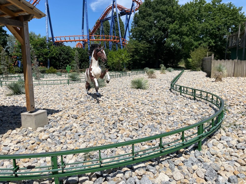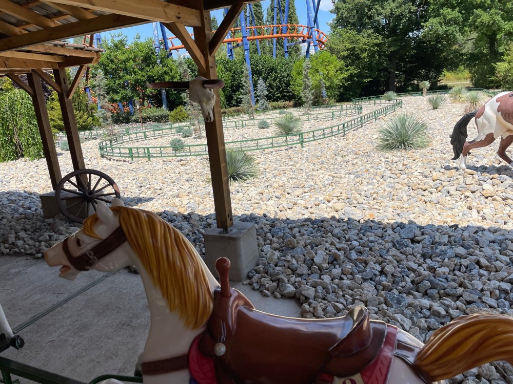 part 2, photos. Wonder Woman has murals on what used to be blank walls. I also felt at least a hint of air conditioning in the room. And Woman Woman has more lockers. Now it at least has enough to stop sending half empty trains. And it almost has landscaping? This was a giant hole in the dirt on opening day, so... Progress! Oktoberfest menu (served at Ace Of Clubs). There were also a few different beers and a cider. I think the $30 options is a pretty good deal depending on which food you get. This might have something to do with why Apocalypse was running only 1 train. Clocked three 3+ min dispatches in a row too. Love that for us. Best maze of the night for me. We love a cute little dark magic ritual altar moment. Skipped this maze because it's mid-tier and I've been through it so many times. But this is a fun shot. That's one hell of a jump scare.1 point