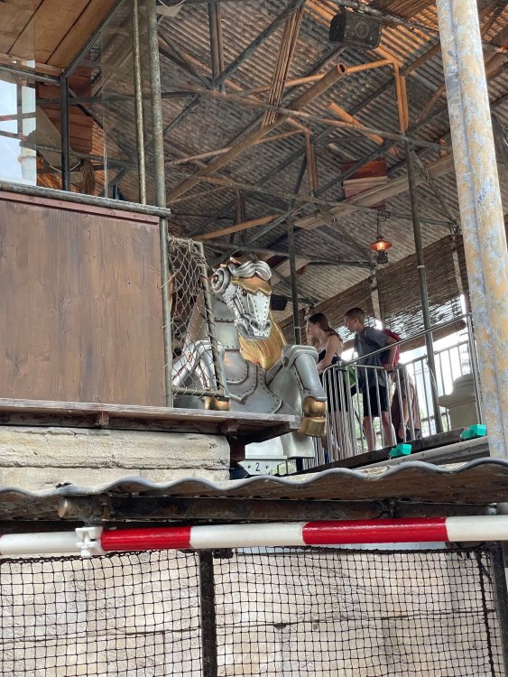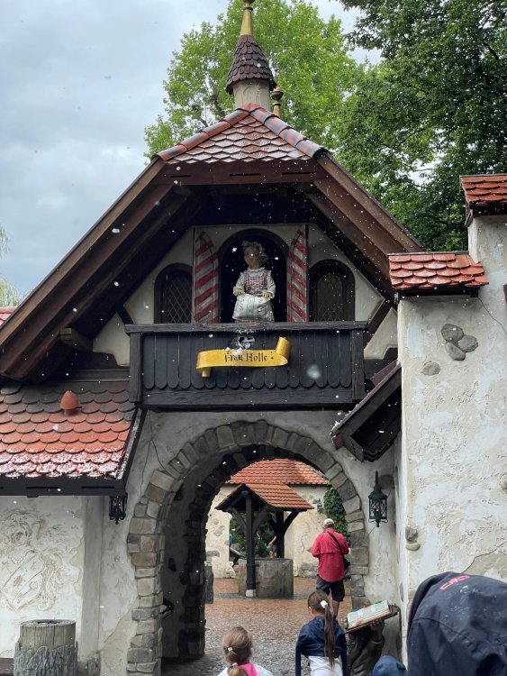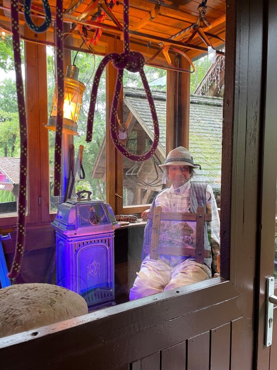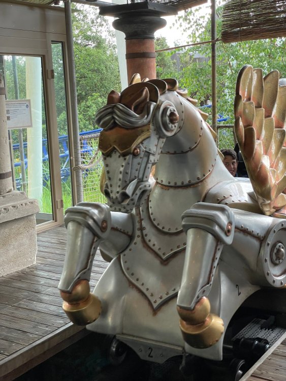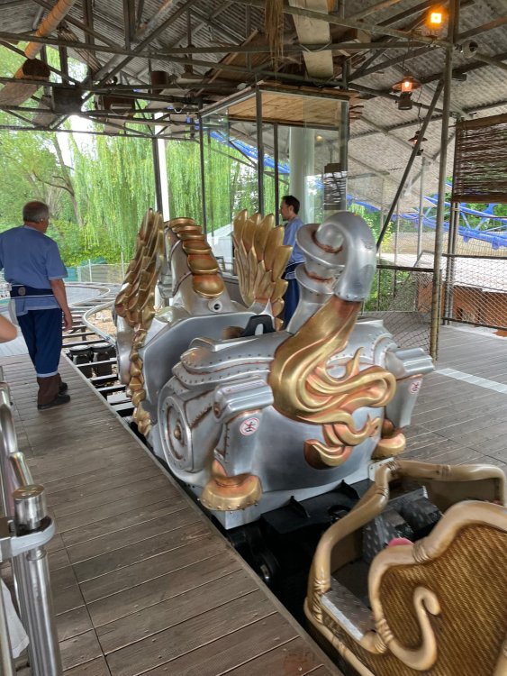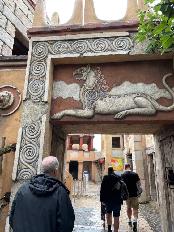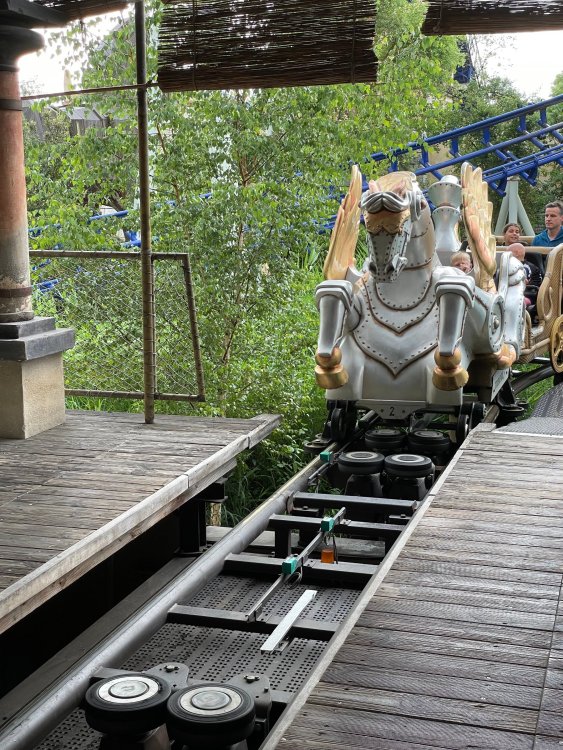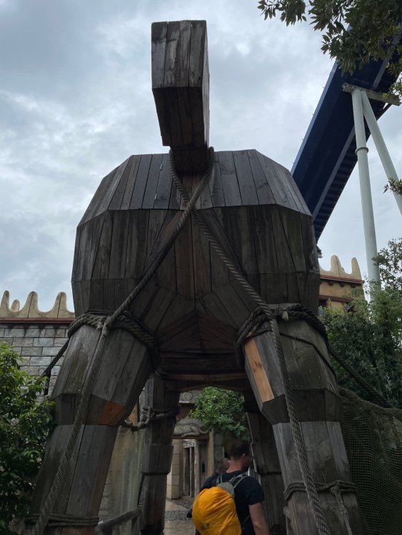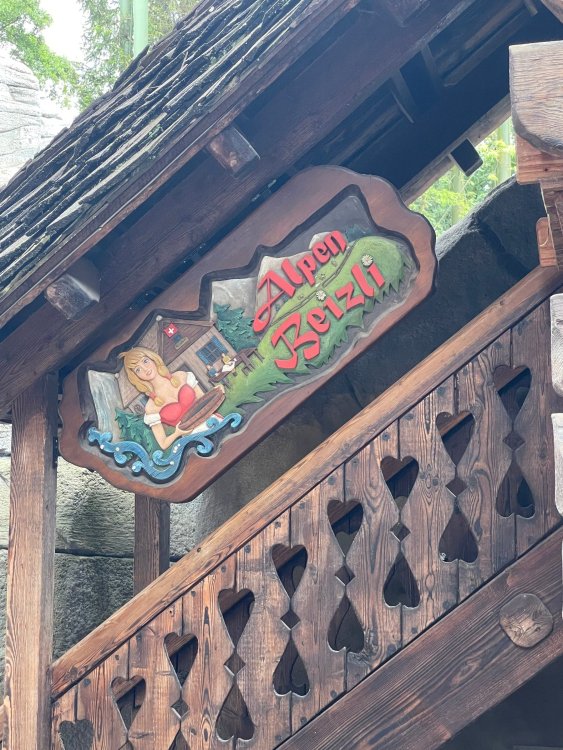 Europa Park, Day 1 continued . . . after snacks at pirates. . we headed over to the Greece section. I had no interest in the Atlantica Supersplash over in the Portugal section, as that is the exact same design as the Journey To Atlantis ride at SeaWorld San Antonio, so i've ridden that tons of time (and honestly don't think it's worth the line, just for that short backwards "coaster" section). I don't think anyone in the group I was hanging around with wanted to ride it anyways. but we all were interested in what was over here in Greece: Poseidon: the Water Coaster: (and oh, look, I actually did get a picture of Sliver Star - in the back on the right. Funny. . thought I had missed it). saving the best for last tho, we went to hit the other attractions in this section before heading to Poseidon (and they have construction walls over here, for the new coaster being built that was part of the presentation, but I dont' think I actually did get pics of those). 1st stop was "Curse of Cassandra" - a really cool Madhouse. before this trip, I never had ridden any type of Madhouse, and this being the first one, I was really super impressed with it. But like SeaStorms, and slow boat rides around lagoons, it seemed that *every* park had it's own Madhouse.. so I ended up riding 7 or 8 of them during the trip. Curse of Cassandra was a pretty good one, and if I'm recalling correctly, the "benches" had moving parts in them to indicate creatures/bugs moving beneath you as the whole room spun. I enjoyed it. but only got a picture of a statue outside it. we then walked around the Poseidon lagoon area to head to Pegasus - a powered junior coaster. but managed to perfectly capture the big monorail passing by (reminding me that I hadn't ridden it yet, and sadly never got to it on this trip. . . even tho it passed right in front of our hotel room!). as noted, Pegasus is a junior powered coaster. it reminded me a lot of the Flight of the Hippogriff, tho maybe slightly more exciting in the layout. the entrance certainly is more interesting. not just a horse's ass. . you enter under a Trojan Horse's ass. . . and the train certainly is pretty exciting. . .at least the front car. for some reason, the queue is themed around an Archeological Dig. . .complete with animatronics. . . and holding up of Medusa's head (ok ???). . . LOL but yeah, the trains sure are pretty! tho I had to laugh, in that the kids who were lined up to ride in the Pegasus front car? yeah. .they can't see ANYTHING. . . LOL great view of the "coaster section" of Poseidon next door from Pegasus' loading area tho again. . as with every other section of this park, the theming is pretty immersive. this was the way to get to the Poseidon queue. . .I don't have any decent pics, so won't share, but we did get more than a little "moist" on the splashdown section. and tho I bought the picture and we're mostly smiling (this is the presplashdown), I must admit that the coaster part of the ride, was quite a bit jerky. it wrenched my back a good bit, and I did have to get into my travel medical kit to take some Aleve after. . . . but overall it was fun, if a bit painful. (so no, didn't ride it again on this visit) good pic tho. clockwork from front left: Andrew (happy Bday! today), Ian, John, Ryan, Jon, and me. (and two other folks park visitors in the back seat) we had another pass for Arthur, so we headed back thru fairytale land. . but first we had to move out of the way for some street entertainment rolling thru (I believe this was passing thru the England section)? she comes out and fluffs a pillow. .that fills the air with foam. the kiddos were having a BALL underneath playing in the foam coming down. back to the weirdness that is Arthur. WTF are these? I dunno. . but I like them. I really, really like them. a little blurry, but coming into the loading platform from the dark section. and the folks pushing the buttons and discussing why they didn't turn around as the other cars did (I'm assuming that's what they were discussing, and the answer is that you have to all hit the buttons to break the alien's mirrors if you want the car to flip around backwards. . I think? who knows! but it's brilliant). exiting the ride, there were lifesize fairies !! OMG. . am I gonna pose with them? what do you think?? (as Elissa put it when i shared this pic: "Nightmare fuel" a Rastafarian bee. why? Arthur !!! we were starting to get a little hungry, so we headed over to Switezerland (just LOOK how lovely) .. . but first, stopping in France to get a fresh Baguette. why? RACLETTE of course! yep, it was time to finally try the famous Europa Park Raclette. mmmmmmmmmm OMG. . looks amazing. oooy, and gooey, and so, so good. . slurp!!! the view we had while eating. the Swiss Bob Run - a bobsled coaster, that actually has a pretty steep "roller coaster" style drop, hadn't been running all day. . but while we were eating, we heard the unmistakable noises of a chain lift. So after we finished our Raclette, we headed down the street to check out if it was open. But first. . . . yes! not only was it open, but it had *just* opened. . whatever they had been working on (we saw guys on the chain lift earlier) they had gotten it going. So the line wasn't bad at all..maybe 10 minutes. lots of interesting wood carvings in this queue: yeah. . I took this picture for the uniform. (I'll be honest. . .we all have our types, and this is one of mine. . so yes, this counts as eye candy too.. . tho the uniform IS rather cute) Ian and I actually spent a lot of the trip sending each other pictures of "interesting" things we saw in the parks. . . but I won't share most of those. . LOL Naughty Naughty, but still. . just some clean fun for the most part. I actually thought this was a real guy in the operating booth. . but when we got closer? nope, Europa Park found a way to squeeze an animatronic in, even in THIS open queue. . James got to ride without someone sitting in his lap! so did Ian and John. . .