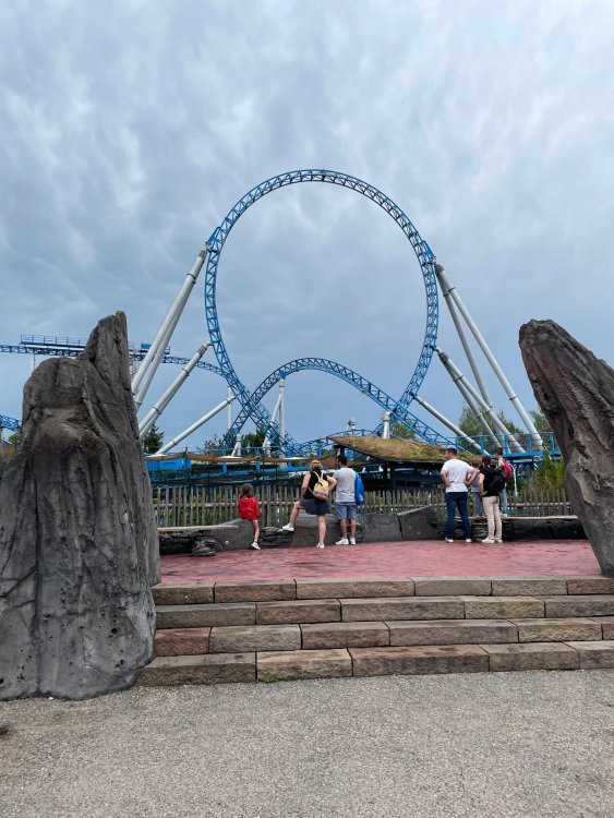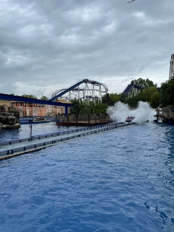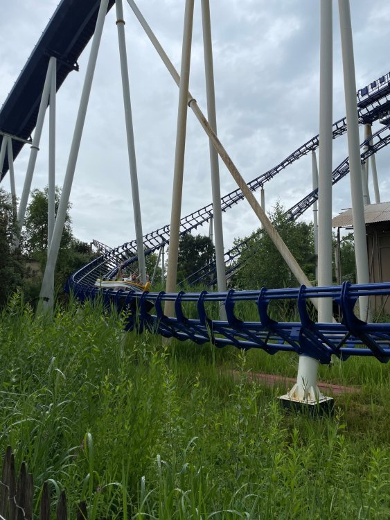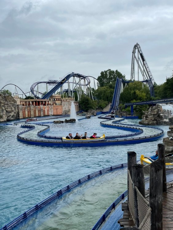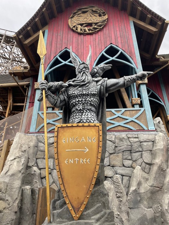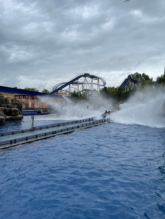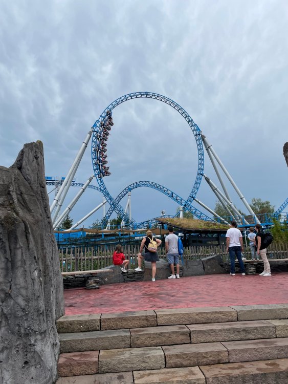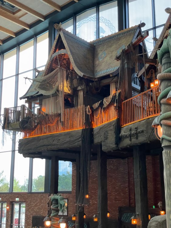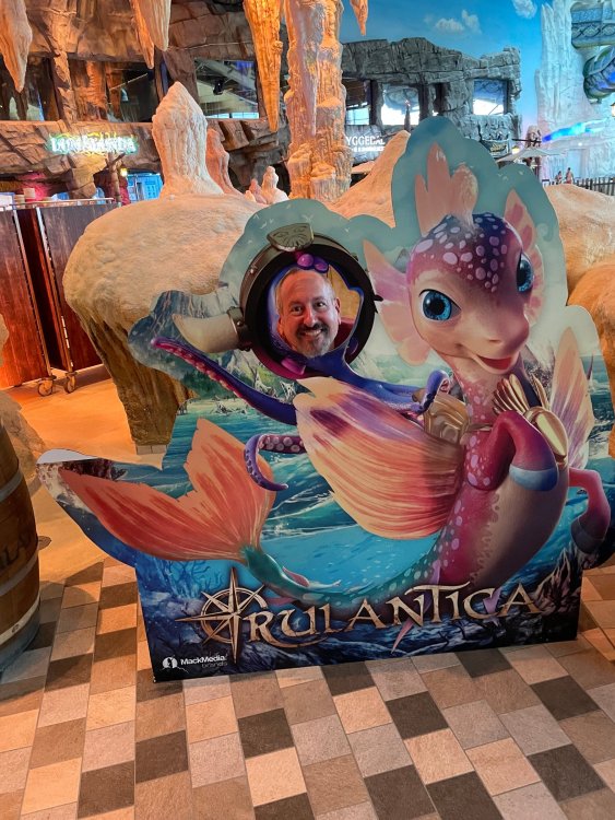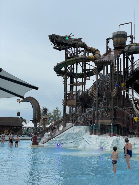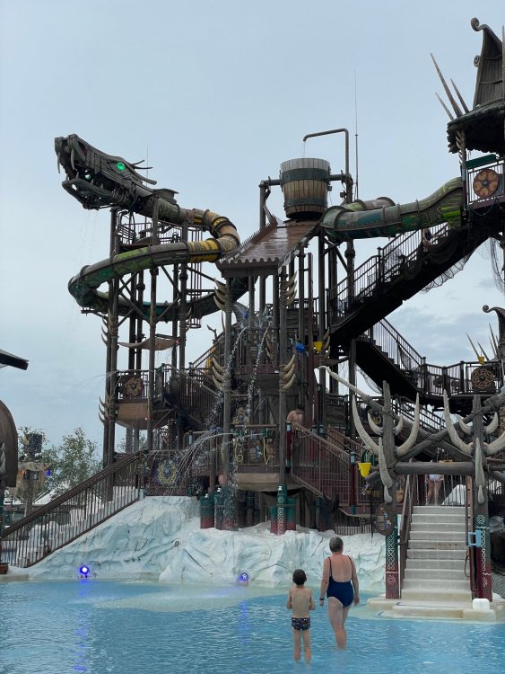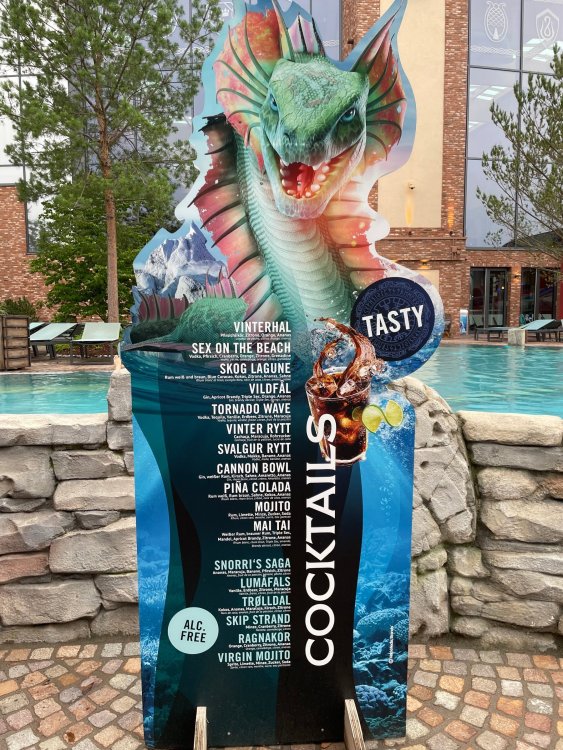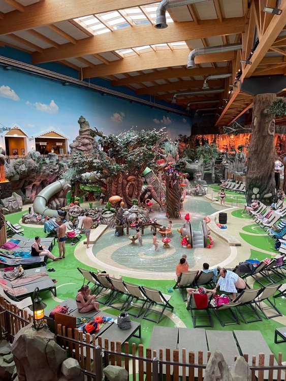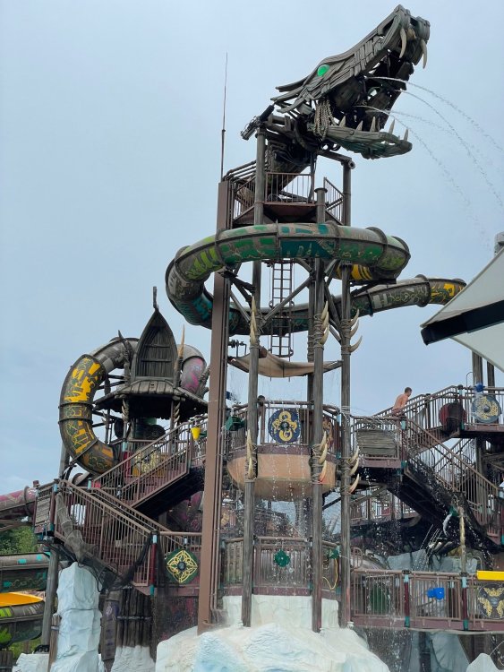 Europa Park, Day 1, part III (Rulantica!) so after getting back to the room, and changing to swimwear. . we headed out to the shuttle bus stop, and took the short ride over to Hotel KRØNASÅR - which is themed to a Museum of Natural History (and also contains the connected "Rulantica" - a HUGE indoor/outdoor waterpark that Europa Park is continuing to add on to. it's also very heavily themed. I wasn't sure I was going to actually swim, as I'm not a waterpark fan. . and once I saw the actual inside of the park? yeah, I kept my phone/camera with me, and decided to just take pics rather than get wet. enjoy: the lobby here is quite impressive! and this sea-creature skeleton? really cool. up the stairs and across the bridgeway gets you into the main Rulantica lobby. But before we head down to the entry booths, let's check out the really neat models they have on display here. . . (honestly worth the trip over here just to look at these, even if not a waterpark fan) I believe this is a model for the reimagined Pirates a peek inside EuroSat (pre CanCan coaster overlay) a super cool model of Wodan. . . with Blue Fire cutting thru it on the end there! Atlantica Supersplash. . and how it interacts with Wodan at the turnaround. after drooling over the models, we went thru entrance, and down into the locker rooms - you walk thru the locker rooms (which are huge. . and turns out there are two completely separate ones, so really pay attention where you put your clothes, or good luck finding your locker after a few cocktails (as I found out later.. . LOL). then you pass thru the shower rooms, and bathroom areas. . and you come out into the main atrium of Rulantica. STUNNING: a photo op? where I can put my face in Snorri? don't mind if I do! the main Wave Pool which is the center of the indoor section of the waterpark. big ol Dragon-slide on the left. . along with one of those "we're gonna fly off it!" triangle shaped tornado type slides. outside is a whole other section with a play area - and they are building more slides over there too. and on the right are the big bars/food areas. . as well as the lazy river, a "rapids" river, and more super steep hidden slides. and just beyond the wave pool (between the wave pool and the outside sections). . . water obstacle course. That many on the TPR trip braved (Robb put up footage on their insta) . .but only the super light (ie: skinny) folks made it across the floating islands easily. as I was nursing a bad ankle on this trip (injured it ~1 month prior to going and still had a brace on the entire trip). . I didnt' even attempt. but was fun to watch others wipe out. stepping out back - as it was SUPER humid in there, as one would expect an indoor water park to be. . what's this? oooo. . they are smart! big outdoor bar by the kids play area outside. the options all look pretty good. . and they were. Tho all came from a machine, that seemed to mix all from the same spout (so I do wonder if some of them might taste off if it "bleeds" some of the other mixed drinks coming thru). still. . what I got (and I can't recall. . tho I had 3 of them, and yep, was feeling it by the time I left. .LOL), but it was GOOOD. drinks in hand, started to explore the outdoor area.. . here's the map . . everything in the "triangle" is indoors. and they are adding new stuff both to the left and the right of the outdoors area at the bottom of the map. as you can tell, they have a lot of room for expansion and new attractions here. yeah.. you are gonna get WET at Rulantica. . .everything sprays and shoots water! something new that was just about to open. . .as super splash battle crossed with a Tilt a Whirl looked like to me. huge, and looks like it's a TON of fun. pretty close to being open, but wasn't open yet on our visit. new concept from Mack rides: sand volleyball, and more room for expansion. (it was already close to 9pm I think, and just look how light it still is.) back inside, to meet up with some TPR folks, and James and Ryan wanted to ride the Dragon Slide theming everywhere. . and so well done. .this was over the lazy river. and just to the right here, was a lagoon you could leave the lazy river to hang out in. . as it had a swim up bar with in-pool seating. if you went up a few levels, was a large restaurant/bar that overlooked the entire indoors area. and also had these really rather cool "clear sections" of the steepest "drop" flumes. . so you could watch the riders zoom by while you relaxed with your drink or food. yeah. .it was a hell of a climb on the stairs to get up to these flumes. . but those that rode them said it was well worth the treck up there. the bottom of the steepest "tube" slides skloosh! James and Jon enjoying the slides. . . and a blurry pic. . but probably THE most thankless job in Rulantica. She stood at the end of the slide catch pool. . and squeegied back in all the water that sklooshed out all over the area after every batch of tubes cam crashing down. she looked miserable. . but repeated this every 15 seconds or so. . . a peek at the indoors kiddie section that's to the right of the lazy river entrance. which is this middle ramp down. yeah. .it can get a bit confusing. . especially after a few drinks! LOL this seemed to be the entrance to a great hall / party room that can be rented. . . loved the design here. the giant screens behind the eating area (connected to the "fast food" option. . pizza/italian stuff. rather soothing. and occasionally an octopus (or Snorri) or some Mermaids would swim by and stop to interact with those sitting at the tables and eating. at the top of the wave pool.. looking out. I was getting tired - it had been a full day, and was ready to head back to our hotel, so started making my way back to the dressing rooms. . tho I hadn't realized there was more than one. and it took me an EMBARRASSINGLY long time to figure out how to get back to the level of dressing rooms that we had come in at, and where my locker was so I could