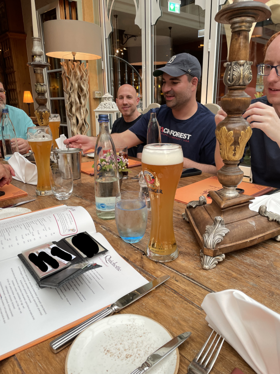part II, continuing on to Europa park: So back on the bus, and we raced a French train to IKEA. . . wait. . we're not going to Sweden on this trip! but the French Countryside is absolutely lovely charming and before we knew it? we were driving parallel to the Rhine River. . ready to cross over from France into Germany. hmmm. . appears the boarder is down to one lane here at the crossing (over a dam) a look at a closed dam gate. . and an open one. . exciting, I know! it wasn't as pretty as I had expected the Rhine river to be. . .but I must admit, it was very exciting to cross a river I had only ever read about in books. I have no idea what this sign means. . maybe the name of the township we passed thru once crossing the border? but this one I get. . . .this is actual border between Germany on the left, and France on the right. Managed to get a perfect picture as we passed it signs, signs, everywhere a sign, no idea what any of them mean, but I'm glad our driver (who was an awesome guy - even if not Franklin) did! and soon enough we pulled up in front of the incredible El Andaluz (themed to a Spanish Villa).. which would be our home for a few nights. it's one of several heavily themed hotels on property, and this one is conveniently located right next to the "Resort Entrance" gate, and also connected via underground tunnels and walkways to the other themed hotels by here, mainly Hotel Colosseo (themed as a Roman coliseum) it's also (apparently) conveniently located next to the monorail which will bring you around to the front gates of the Park. . . but that's something I never managed to do during our visit! There is simply SO much to do at Europa Parc, that I never had time to take the monorail, or even go out the front gates. (but why would I when the Resort gate is right by the hotel. . literally). tho I DID take the shuttle bus (conveniently located just outside the hotel) to go to visit Rulantica. .the giant indoor waterpark, that we were invited to check out during our visit anyways. .the hotels are all pretty heavily themed. . even the statues out front moved, and interacted with guests coming in. Impressive as hell. Elissa went and checked us all in, and came back out with room keys and entrance tickets (and other assorted goodies). . here's what the Europa Park tickets look like. the rooms at El Andaluz vary greatly, might just have one bed, and some bunk beds on the wall. . or two small beds. . or two queen size beds. it was just luck of the draw what room you ended up with. . . but James and I got a lucky straw and not only ended up with a very large room (two queen beds): with a huge bathroom: but also? right on the corner of the hotel. . . literally directly overlooking the Resort Guests Entrance to Europa Parc! that's the Resort entrance on the left of the yellow tent. wowza! we had a great view of the main Monorail too.. even if I didn't get to ride it around the park, I still go to see it in action (very much looks like Disney's, tho I haven't seen those in years) we were only the 2nd floor, so looking out of our room the other direction - towards the front of the hotel. and a view looking straight out. . at the monorail track (and of course, I didn't wait for a Monorail to be on it. . but still. . . look how lovely this is!) all settled in, we headed down to the lobby to meet a group of TPR trip participants to see what we could do about dinner, and explore the hotel (s) the chandelier in the main lobby is super impressive. hell. the whole lobby is impressive. It really is quite immersive. walking down some of the hallways to check out the restaurants available here. . . as noted. . heavily themed! even the toilets are themed, with piped in creaking sounds, and clanking of swords. yes, this is still inside our hotel! one of the eateries has outdoor seating options among the rooms/wings. we checked out the Brazillian style meat buffet in El Andaluz, but decided to skip it because we were eating there as a group the next night. And the Tapas restaurant looked good. . but let's head over to Colosseo to check out the options there, since they are supposedly very good Italian food offerings. a Model of the hotel theming in the tunnel headed over there from El Andaluz coming out to the front entrance of Hotel Colosseo yup. .heavily themed here too. . . cool manikins guarding the front entrance. and bewbs. . I mean. . art. . . stepping out into the main Courtyard of this hotel is impressive as hell. I mean, I loved our rooms, and very much enjoyed our hotel. . but this one is incredible too. (and there are people sitting up there in the section of the Colosseum ? wow.. will have to check that out later for the view) most of the group came over here to check out dinner options. . just like Disney tho, most everything here was booked solid (or had a long, long wait). . I guess when the park closes between 6-7, the restaurants are gonna get full, since all the guests staying are back from the park. so we headed back to the Tapas restaurant in El Andaluz, as that one we had checked out earlier and didn't have any waitlist. we joined a group from the trip of 7-8 people, and really enjoyed the meal, as well as getting to get to know everyone. we were seated in a covered "patio/greenhouse" section of the restaurant. with nice views of the surrounding hotel while we ate. (El Andaluz interior courtyard, gardens, and pool in the back there) interesting "rural" chandelier. . not sure if it was wood, or animal horns. . but I think horns? the menu, which I wish I had a picture of the inside of. .as I know the offerings all looked really good, and i know I really LOVED what I got. But I can't really remember exactly what it was. (no big worries tho.. of course I took pictures) the group at our table. . . . . .and going back to *edit*. . because just noticed that Jon had his wallet open, and dont' want anyone to zoom and get his personal info. . LOL I do recall this was a Terrine of tartar, t