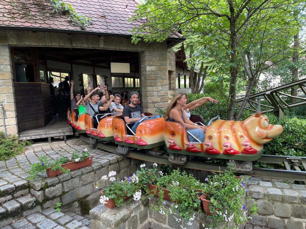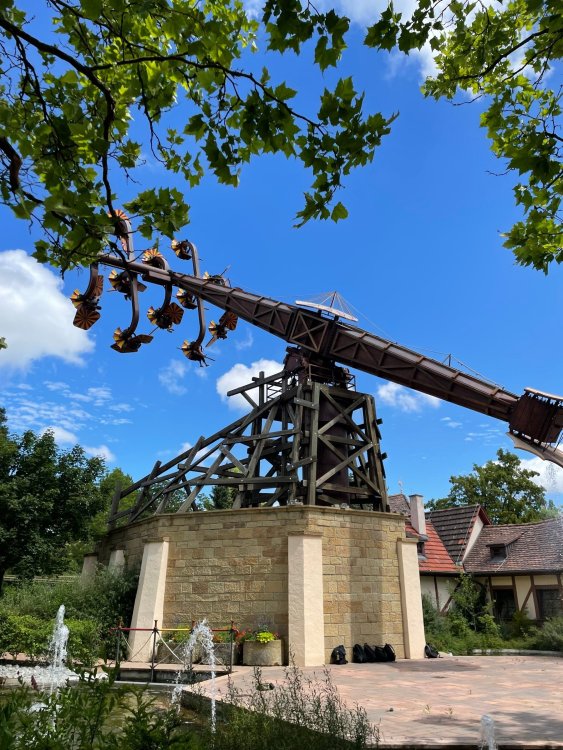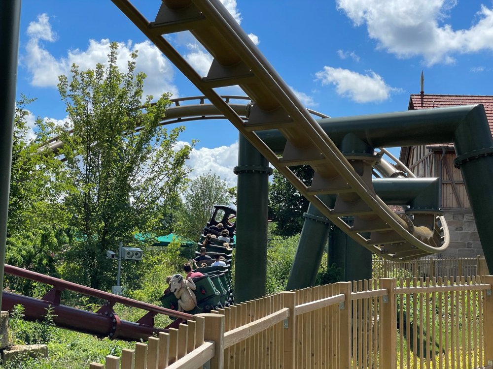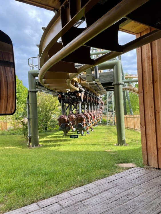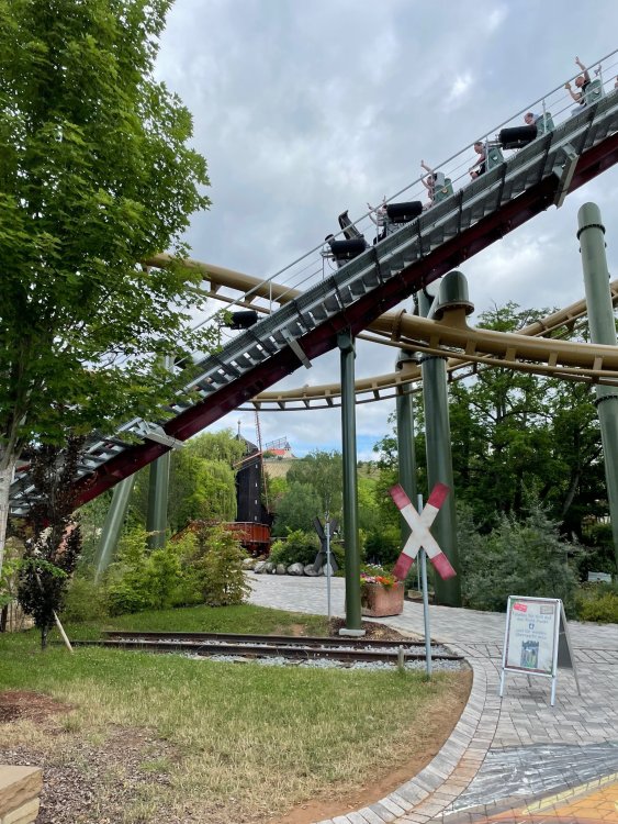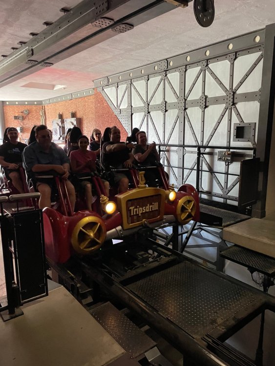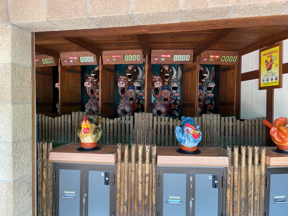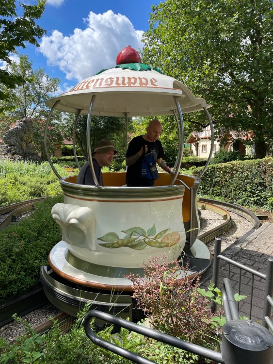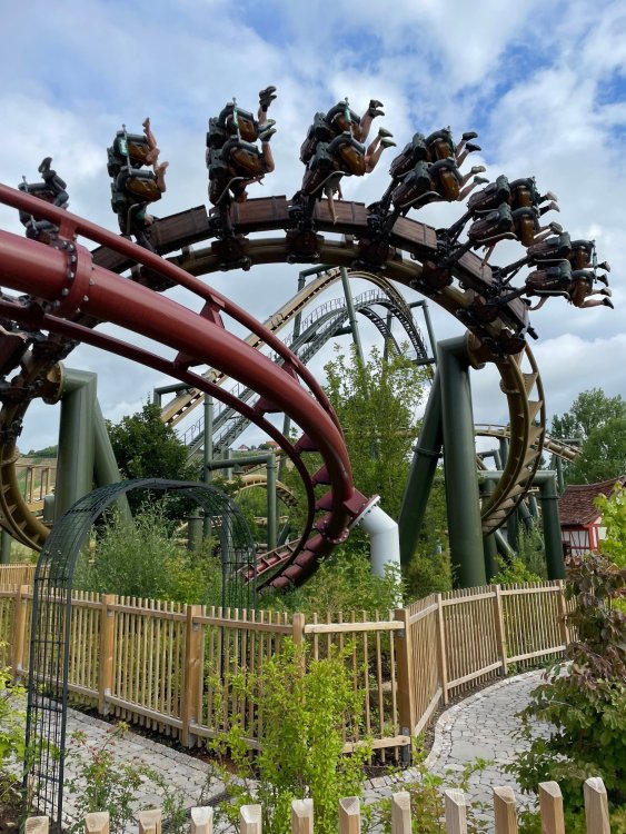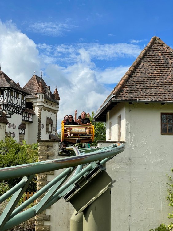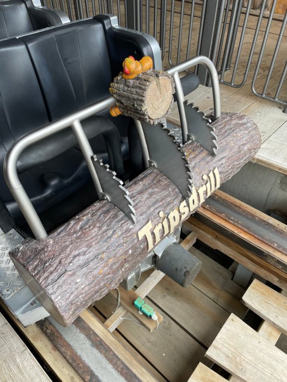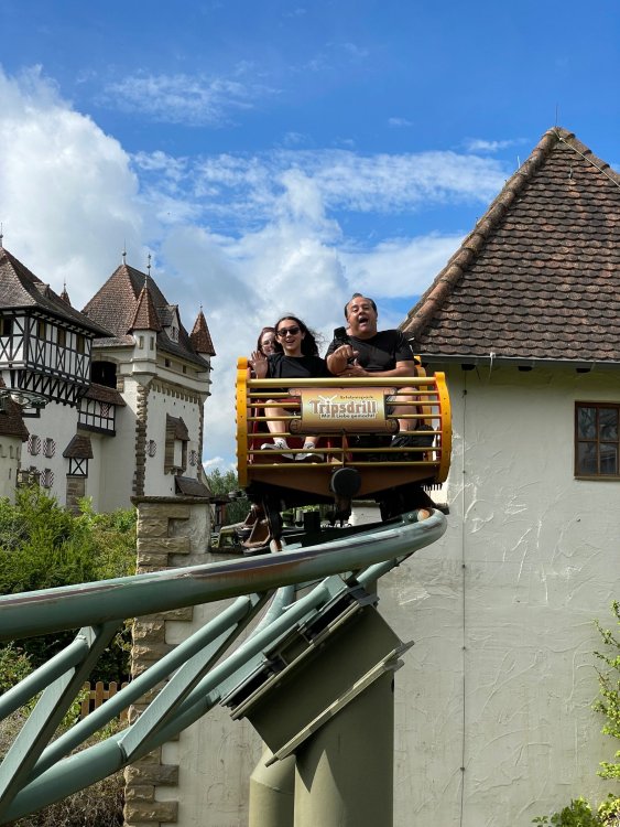 Day 4, part 1: Tripsdrill ! so this day was the earliest "up and out" of the entire trip. . .we had a very full day ahead of us: leaving Europa Park at 6am, spending a good chunk of the the day at Tripsdrill, and then heading out to Holiday Park in the afternoon for some night-time ERT on Expedition GeForce! so we were all up and in our hotel lobby bright and early. can't say that I was super perky, but I still stopped to snap a pic of the beautiful chandelier in the hotel lobby at Europa Park. and then we got the bus loaded up, and said goodbye to Rust. . and headed out towards Tripsdrill. the Countryside is very pretty. . I had to keep reminding myself we were in Germany, and not France any longer. (less windmills) and before too long. . in the middle of rolling green hills, and beautiful farmhouses, we made a turn and I spotted this sign: and moments later? this. a brand new, suspended Vekoma rollercoaster peeking thru the trees. (with the "spike" of a shuttle coaster sticking up in the middle of it???) we made it here for park open - before park open, actually. . . but shortly, the park folks met the group, and led us over to the newest ride in the park (the above coaster) This is the station for Volldampf - the shuttle coaster that has the red track. we'd come back to this in a bit, but yeah, my eyes hadnt' been playing tricks on me - the family Boomerang shuttle coaster "Volldampf" does interact quite closely with the Vekoma suspended. . . intertwining with it and making an excellent (and exciting) option for those too small (or too scared) to ride the bigger, suspended coaster. a better look at that "spike" from the shuttle coaster, poking thru the center of the new Vekoma the front of the train has a terrified sheep hanging onto it . . .LOL but we were mainly here for this. . the newest Vekoma Suspended: Hals Uber Kopf - I believe they said it opened in 2021. tho I'm not exactly sure what the theming was - this was a weird park, and I loved the hell out of it! - much of the theming here SEEMED to be set around German folk tales? So probably something to do with that? 7 guys slaying a bear? not sure how it tied to a suspended coaster with a few inversions. . but it's still a great coaster! and I love how the queue brings you thru the structure. I was a bit wary about riding what I knew was a Vekoma. . . but I absolutely adored that they have the park name/logo on every row hanging between the seats. really COMFORTABLE seats too. wheeee!!! what did I think of it? AMAZING. . and I think my favorite coaster in the park (tho there were some rides in the park that absolutely make this a must visit park). This coaster in particular? high on that "must visit" list - it has AIR TIME! Yes. . . Airtime. On a Suspended coaster! on a VEKOMA Suspended coaster. so smooth, and fun, and so many great elements. . .color me super impressed. and look at that near miss with Volldampf track right here. . . (we were the only ones in the park at the moment, so no chance right now to get the trains together) tho later in the day when we came back to ride again? did manage to get the Boomerang with people on it. speaking of Volldampf. . . after our morning ERT rides, the park had just opened, and the Park Reps walked us over to Volldampf to give TPR a ride. the seats were comfy, and the atmosphere on this is so incredible (since you're moving in and out of the other coaster). . but at the end of the day? it's a family Boomerang, that is really just kinda "meh" . . which is fine, as the Vekoma is so A+ level. since I see Brad and AJ on this train with me, this pic must be courtesy of Elissa or Robb. backwards thru the station. this park is not only full of charm (and WTF is this stuff????). . but also there were a bunch of these 3D illusion "street paintings" thruout the park. not sure if these are permanent installations, or just for a special event and they just happened to be there. . but these were so great (even if some of the illusions worked better than others) oh, I mentioned some WTF stuff in this park? how about this game: you shoot eggs out of a chicken's ass into the open mouths of the villagers (and donkeys). yeah. . . . of COURSE I loved it! the park reps were walking us back to the rear of the park - stopping along the way to ride Rasender Tausendfüßler (Raging Millipede?) the longest coaster train I've ever been on! (pics in a moment). . but that was just a quick stop along the way back to Karacho. . the park's "Smiler" clone (at least I think that's what they told me, it's a clone) EDIT: per Elissa below, it's not a Smiler clone, but it IS similar to Smiler in places it's right across the courtyard from Mamut. . . I LOVED this test seat. yes. . this is the test seat for the trains! speaking of. . these trains are incredible. . . I was glad we got some "ERT" on it, as it was one train ops . . but wow, what a train it is! I mean. . look at this! tho for me? the highlight is this animatronic guy placed in the exit queue. as the train unloads, and the riders exit? he's triggered. . . HAHAHAHAHHAHAHAHAHA. . . brilliant, right? Pic courtesy of, I think, Brad. what did I think? well, having never ridden Smiler, I had no idea what to expect. (in particular that 1st surprise in the dark after leaving the station). I liked it. due to the 1 train restriction, I think I only rode it twice, but I did enjoy it, and if that Vekoma wasn't in the park, this would easily be the #1 coaster here. Apparently this sign is infamous. . but I needed to pee anyways by this point, and it made me laugh, so I snapped a pic of it. and just LOOK at this view - out the windows over the urinal - one gets while peeing. This flat is back over here in this area as well. . I didn't realize until after I got back and saw some posts here on TPR from other parks, that this ride is just an "out of the box" one. . but I was impressed with the theming when we saw it. no time to ride it now, as we had to head over to Mammut. . but