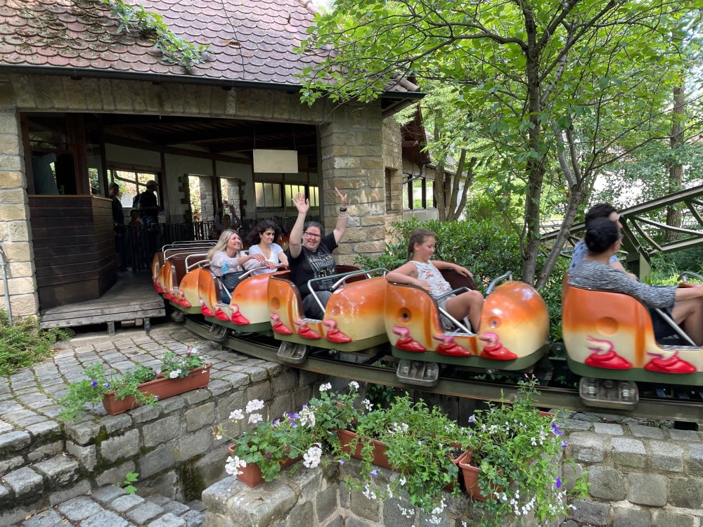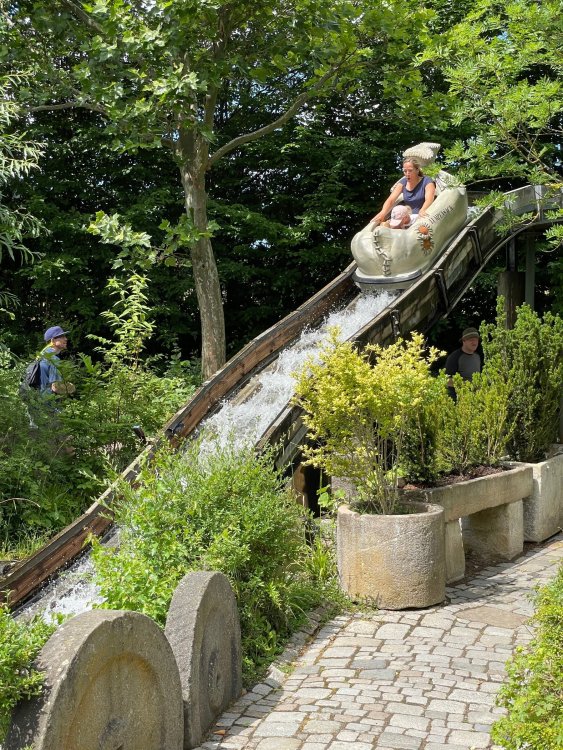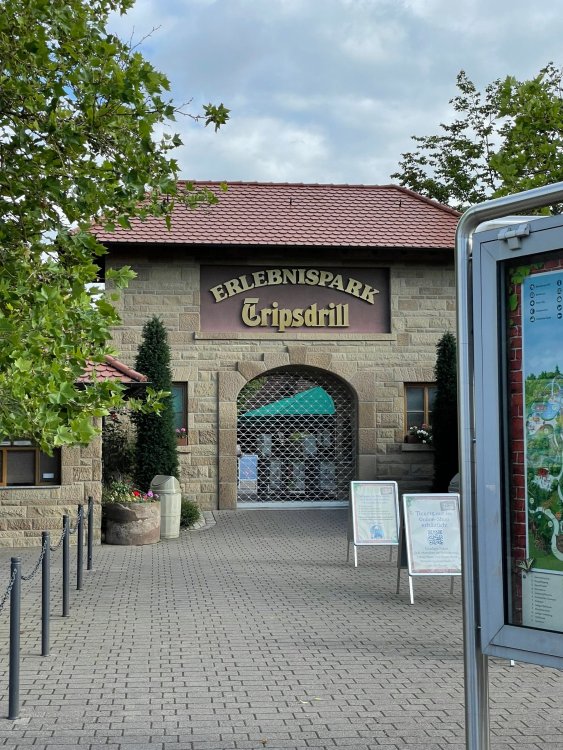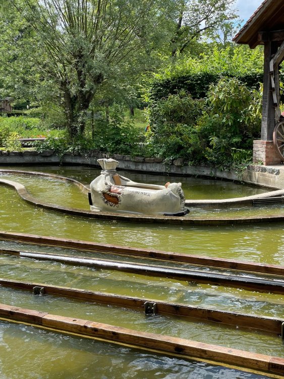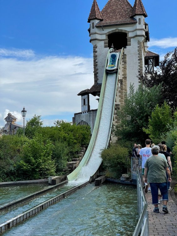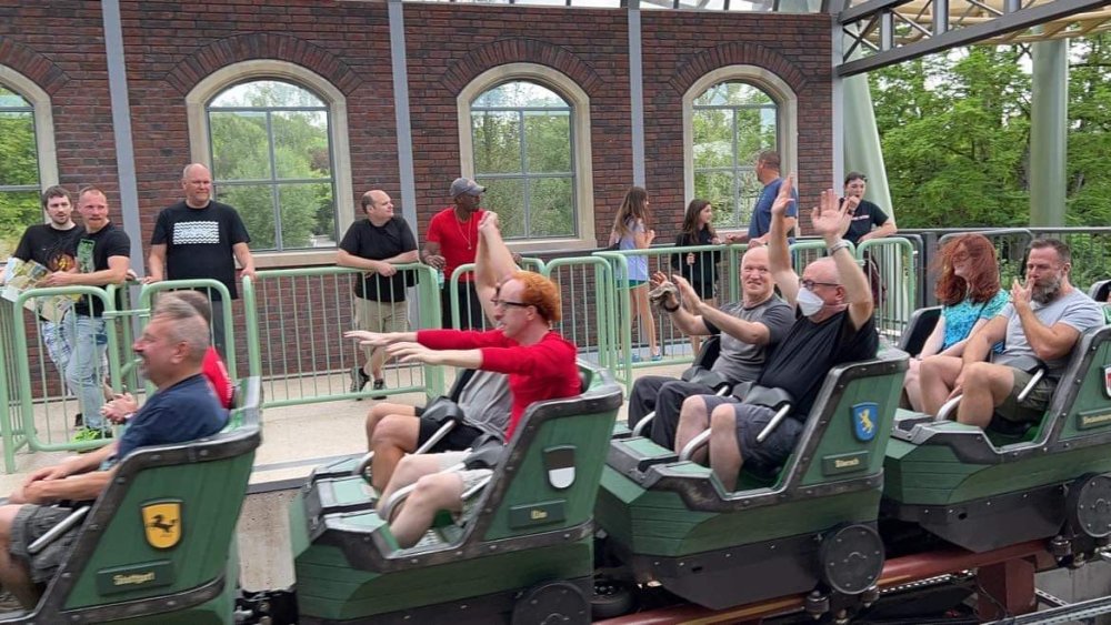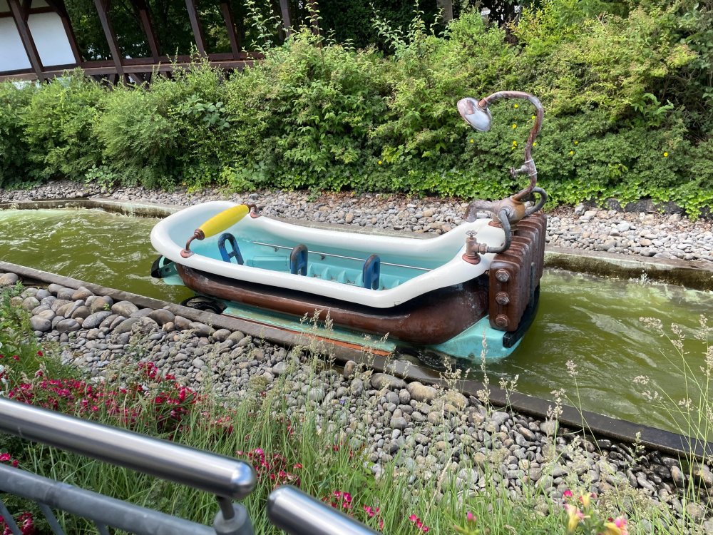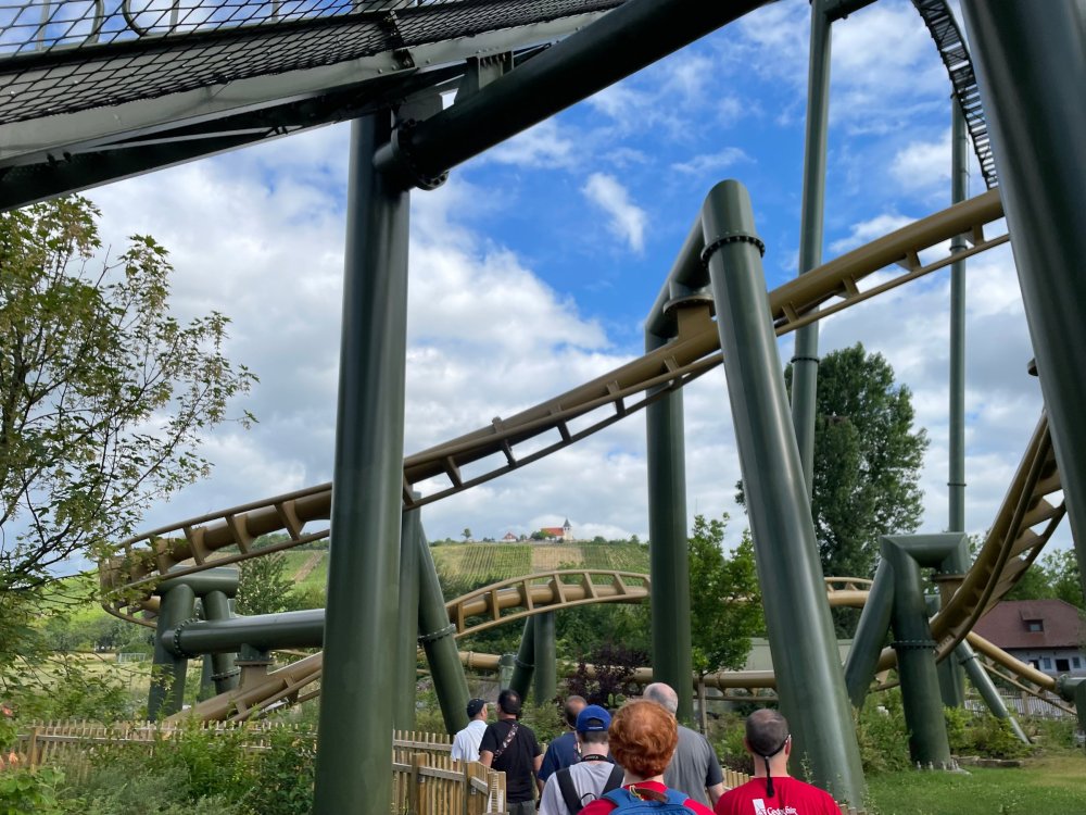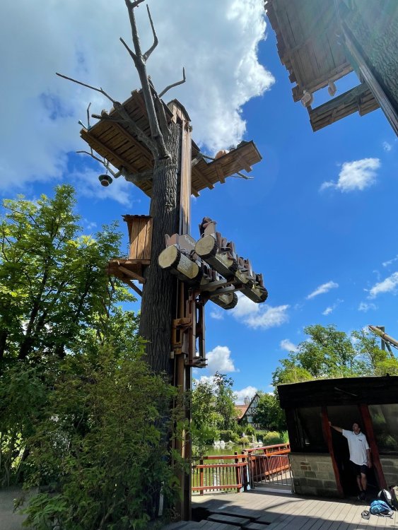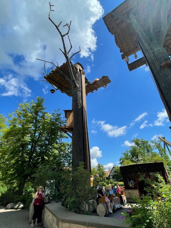 Day 4, part 1: Tripsdrill ! so this day was the earliest "up and out" of the entire trip. . .we had a very full day ahead of us: leaving Europa Park at 6am, spending a good chunk of the the day at Tripsdrill, and then heading out to Holiday Park in the afternoon for some night-time ERT on Expedition GeForce! so we were all up and in our hotel lobby bright and early. can't say that I was super perky, but I still stopped to snap a pic of the beautiful chandelier in the hotel lobby at Europa Park. and then we got the bus loaded up, and said goodbye to Rust. . and headed out towards Tripsdrill. the Countryside is very pretty. . I had to keep reminding myself we were in Germany, and not France any longer. (less windmills) and before too long. . in the middle of rolling green hills, and beautiful farmhouses, we made a turn and I spotted this sign: and moments later? this. a brand new, suspended Vekoma rollercoaster peeking thru the trees. (with the "spike" of a shuttle coaster sticking up in the middle of it???) we made it here for park open - before park open, actually. . . but shortly, the park folks met the group, and led us over to the newest ride in the park (the above coaster) This is the station for Volldampf - the shuttle coaster that has the red track. we'd come back to this in a bit, but yeah, my eyes hadnt' been playing tricks on me - the family Boomerang shuttle coaster "Volldampf" does interact quite closely with the Vekoma suspended. . . intertwining with it and making an excellent (and exciting) option for those too small (or too scared) to ride the bigger, suspended coaster. a better look at that "spike" from the shuttle coaster, poking thru the center of the new Vekoma the front of the train has a terrified sheep hanging onto it . . .LOL but we were mainly here for this. . the newest Vekoma Suspended: Hals Uber Kopf - I believe they said it opened in 2021. tho I'm not exactly sure what the theming was - this was a weird park, and I loved the hell out of it! - much of the theming here SEEMED to be set around German folk tales? So probably something to do with that? 7 guys slaying a bear? not sure how it tied to a suspended coaster with a few inversions. . but it's still a great coaster! and I love how the queue brings you thru the structure. I was a bit wary about riding what I knew was a Vekoma. . . but I absolutely adored that they have the park name/logo on every row hanging between the seats. really COMFORTABLE seats too. wheeee!!! what did I think of it? AMAZING. . and I think my favorite coaster in the park (tho there were some rides in the park that absolutely make this a must visit park). This coaster in particular? high on that "must visit" list - it has AIR TIME! Yes. . . Airtime. On a Suspended coaster! on a VEKOMA Suspended coaster. so smooth, and fun, and so many great elements. . .color me super impressed. and look at that near miss with Volldampf track right here. . . (we were the only ones in the park at the moment, so no chance right now to get the trains together) tho later in the day when we came back to ride again? did manage to get the Boomerang with people on it. speaking of Volldampf. . . after our morning ERT rides, the park had just opened, and the Park Reps walked us over to Volldampf to give TPR a ride. the seats were comfy, and the atmosphere on this is so incredible (since you're moving in and out of the other coaster). . but at the end of the day? it's a family Boomerang, that is really just kinda "meh" . . which is fine, as the Vekoma is so A+ level. since I see Brad and AJ on this train with me, this pic must be courtesy of Elissa or Robb. backwards thru the station. this park is not only full of charm (and WTF is this stuff????). . but also there were a bunch of these 3D illusion "street paintings" thruout the park. not sure if these are permanent installations, or just for a special event and they just happened to be there. . but these were so great (even if some of the illusions worked better than others) oh, I mentioned some WTF stuff in this park? how about this game: you shoot eggs out of a chicken's ass into the open mouths of the villagers (and donkeys). yeah. . . . of COURSE I loved it! the park reps were walking us back to the rear of the park - stopping along the way to ride Rasender Tausendfüßler (Raging Millipede?) the longest coaster train I've ever been on! (pics in a moment). . but that was just a quick stop along the way back to Karacho. . the park's "Smiler" clone (at least I think that's what they told me, it's a clone) EDIT: per Elissa below, it's not a Smiler clone, but it IS similar to Smiler in places it's right across the courtyard from Mamut. . . I LOVED this test seat. yes. . this is the test seat for the trains! speaking of. . these trains are incredible. . . I was glad we got some "ERT" on it, as it was one train ops . . but wow, what a train it is! I mean. . look at this! tho for me? the highlight is this animatronic guy placed in the exit queue. as the train unloads, and the riders exit? he's triggered. . . HAHAHAHAHHAHAHAHAHA. . . brilliant, right? Pic courtesy of, I think, Brad. what did I think? well, having never ridden Smiler, I had no idea what to expect. (in particular that 1st surprise in the dark after leaving the station). I liked it. due to the 1 train restriction, I think I only rode it twice, but I did enjoy it, and if that Vekoma wasn't in the park, this would easily be the #1 coaster here. Apparently this sign is infamous. . but I needed to pee anyways by this point, and it made me laugh, so I snapped a pic of it. and just LOOK at this view - out the windows over the urinal - one gets while peeing. This flat is back over here in this area as well. . I didn't realize until after I got back and saw some posts here on TPR from other parks, that this ride is just an "out of the box" one. . but I was impressed with the theming when we saw it. no time to ride it now, as we had to head over to Mammut. . but