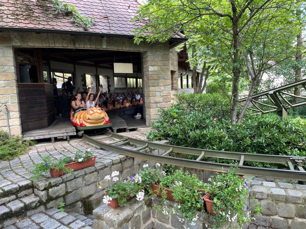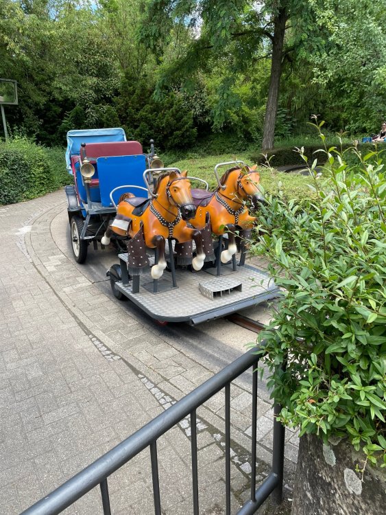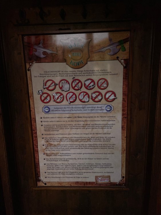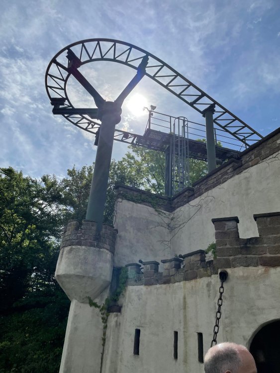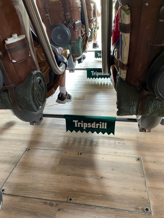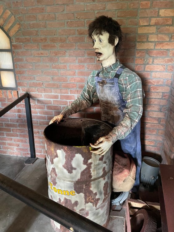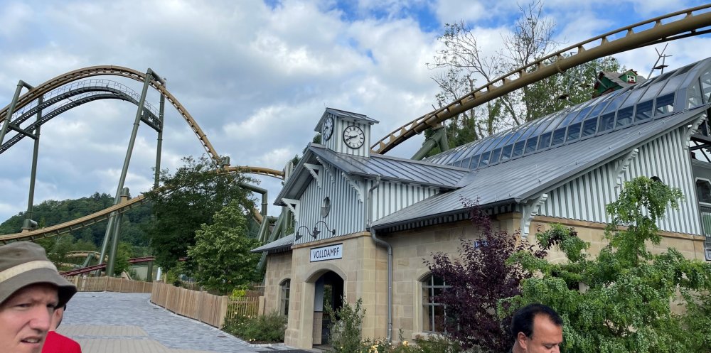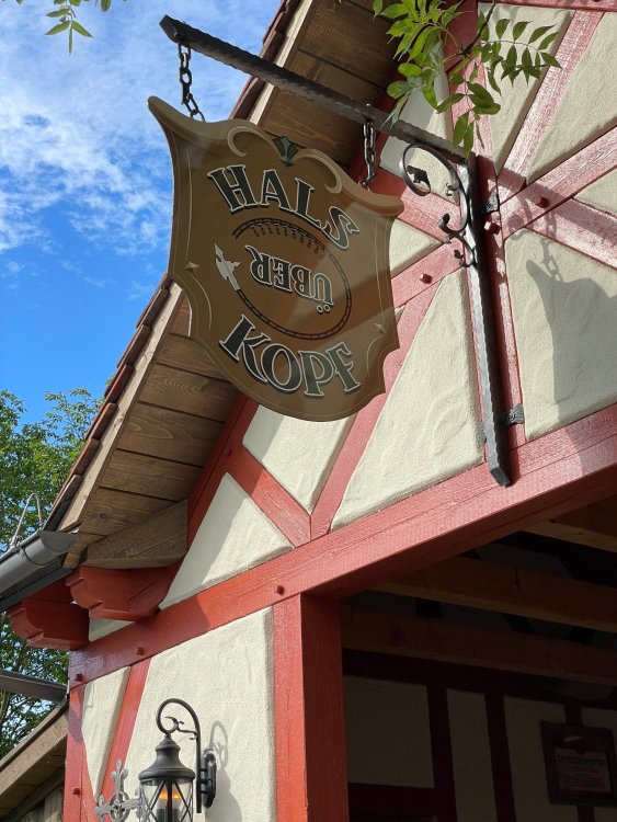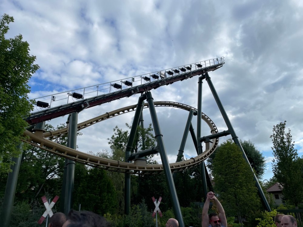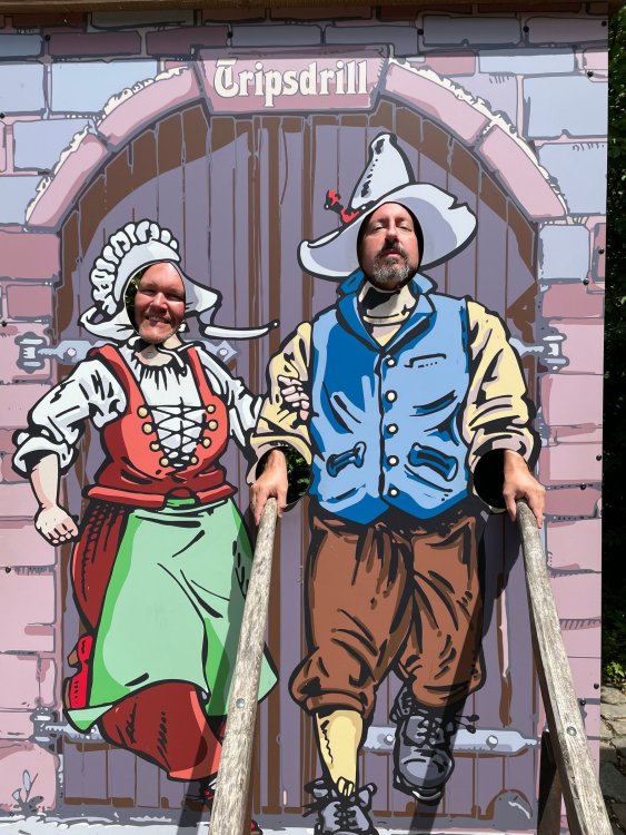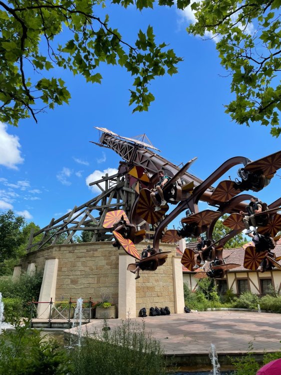 Day 4, part 1: Tripsdrill ! so this day was the earliest "up and out" of the entire trip. . .we had a very full day ahead of us: leaving Europa Park at 6am, spending a good chunk of the the day at Tripsdrill, and then heading out to Holiday Park in the afternoon for some night-time ERT on Expedition GeForce! so we were all up and in our hotel lobby bright and early. can't say that I was super perky, but I still stopped to snap a pic of the beautiful chandelier in the hotel lobby at Europa Park. and then we got the bus loaded up, and said goodbye to Rust. . and headed out towards Tripsdrill. the Countryside is very pretty. . I had to keep reminding myself we were in Germany, and not France any longer. (less windmills) and before too long. . in the middle of rolling green hills, and beautiful farmhouses, we made a turn and I spotted this sign: and moments later? this. a brand new, suspended Vekoma rollercoaster peeking thru the trees. (with the "spike" of a shuttle coaster sticking up in the middle of it???) we made it here for park open - before park open, actually. . . but shortly, the park folks met the group, and led us over to the newest ride in the park (the above coaster) This is the station for Volldampf - the shuttle coaster that has the red track. we'd come back to this in a bit, but yeah, my eyes hadnt' been playing tricks on me - the family Boomerang shuttle coaster "Volldampf" does interact quite closely with the Vekoma suspended. . . intertwining with it and making an excellent (and exciting) option for those too small (or too scared) to ride the bigger, suspended coaster. a better look at that "spike" from the shuttle coaster, poking thru the center of the new Vekoma the front of the train has a terrified sheep hanging onto it . . .LOL but we were mainly here for this. . the newest Vekoma Suspended: Hals Uber Kopf - I believe they said it opened in 2021. tho I'm not exactly sure what the theming was - this was a weird park, and I loved the hell out of it! - much of the theming here SEEMED to be set around German folk tales? So probably something to do with that? 7 guys slaying a bear? not sure how it tied to a suspended coaster with a few inversions. . but it's still a great coaster! and I love how the queue brings you thru the structure. I was a bit wary about riding what I knew was a Vekoma. . . but I absolutely adored that they have the park name/logo on every row hanging between the seats. really COMFORTABLE seats too. wheeee!!! what did I think of it? AMAZING. . and I think my favorite coaster in the park (tho there were some rides in the park that absolutely make this a must visit park). This coaster in particular? high on that "must visit" list - it has AIR TIME! Yes. . . Airtime. On a Suspended coaster! on a VEKOMA Suspended coaster. so smooth, and fun, and so many great elements. . .color me super impressed. and look at that near miss with Volldampf track right here. . . (we were the only ones in the park at the moment, so no chance right now to get the trains together) tho later in the day when we came back to ride again? did manage to get the Boomerang with people on it. speaking of Volldampf. . . after our morning ERT rides, the park had just opened, and the Park Reps walked us over to Volldampf to give TPR a ride. the seats were comfy, and the atmosphere on this is so incredible (since you're moving in and out of the other coaster). . but at the end of the day? it's a family Boomerang, that is really just kinda "meh" . . which is fine, as the Vekoma is so A+ level. since I see Brad and AJ on this train with me, this pic must be courtesy of Elissa or Robb. backwards thru the station. this park is not only full of charm (and WTF is this stuff????). . but also there were a bunch of these 3D illusion "street paintings" thruout the park. not sure if these are permanent installations, or just for a special event and they just happened to be there. . but these were so great (even if some of the illusions worked better than others) oh, I mentioned some WTF stuff in this park? how about this game: you shoot eggs out of a chicken's ass into the open mouths of the villagers (and donkeys). yeah. . . . of COURSE I loved it! the park reps were walking us back to the rear of the park - stopping along the way to ride Rasender Tausendfüßler (Raging Millipede?) the longest coaster train I've ever been on! (pics in a moment). . but that was just a quick stop along the way back to Karacho. . the park's "Smiler" clone (at least I think that's what they told me, it's a clone) EDIT: per Elissa below, it's not a Smiler clone, but it IS similar to Smiler in places it's right across the courtyard from Mamut. . . I LOVED this test seat. yes. . this is the test seat for the trains! speaking of. . these trains are incredible. . . I was glad we got some "ERT" on it, as it was one train ops . . but wow, what a train it is! I mean. . look at this! tho for me? the highlight is this animatronic guy placed in the exit queue. as the train unloads, and the riders exit? he's triggered. . . HAHAHAHAHHAHAHAHAHA. . . brilliant, right? Pic courtesy of, I think, Brad. what did I think? well, having never ridden Smiler, I had no idea what to expect. (in particular that 1st surprise in the dark after leaving the station). I liked it. due to the 1 train restriction, I think I only rode it twice, but I did enjoy it, and if that Vekoma wasn't in the park, this would easily be the #1 coaster here. Apparently this sign is infamous. . but I needed to pee anyways by this point, and it made me laugh, so I snapped a pic of it. and just LOOK at this view - out the windows over the urinal - one gets while peeing. This flat is back over here in this area as well. . I didn't realize until after I got back and saw some posts here on TPR from other parks, that this ride is just an "out of the box" one. . but I was impressed with the theming when we saw it. no time to ride it now, as we had to head over to Mammut. . but