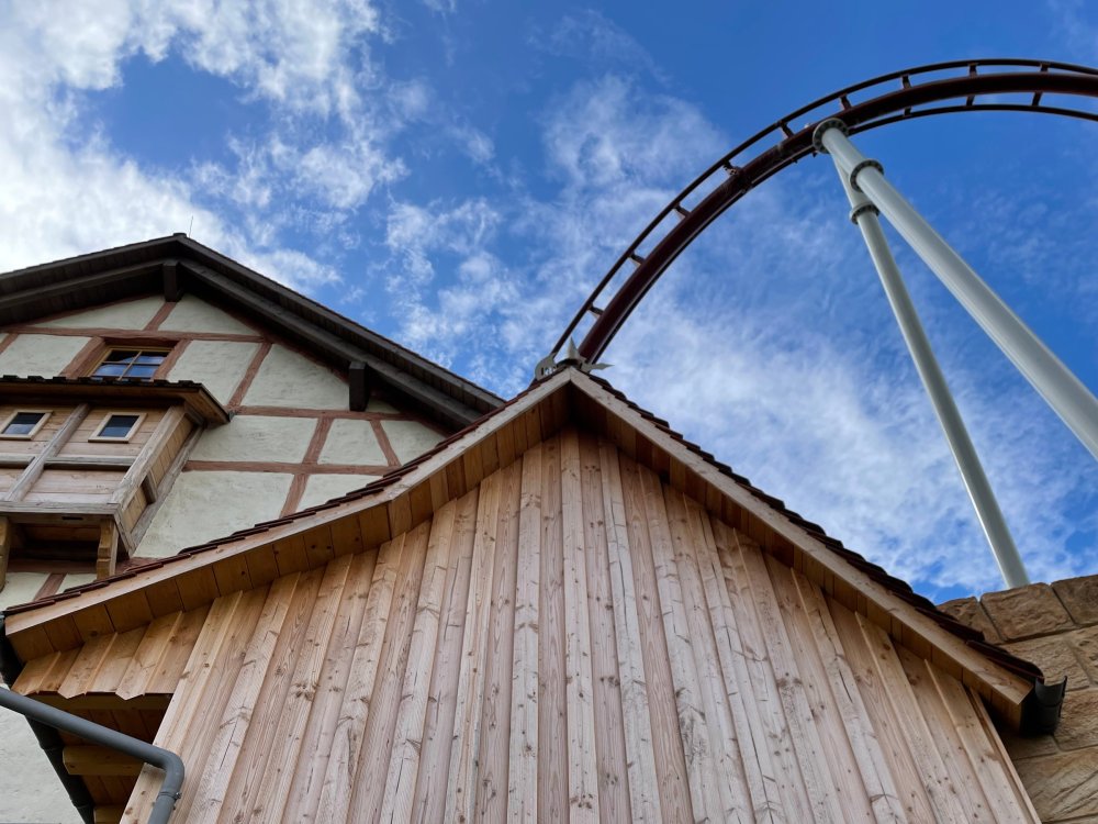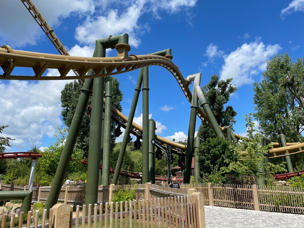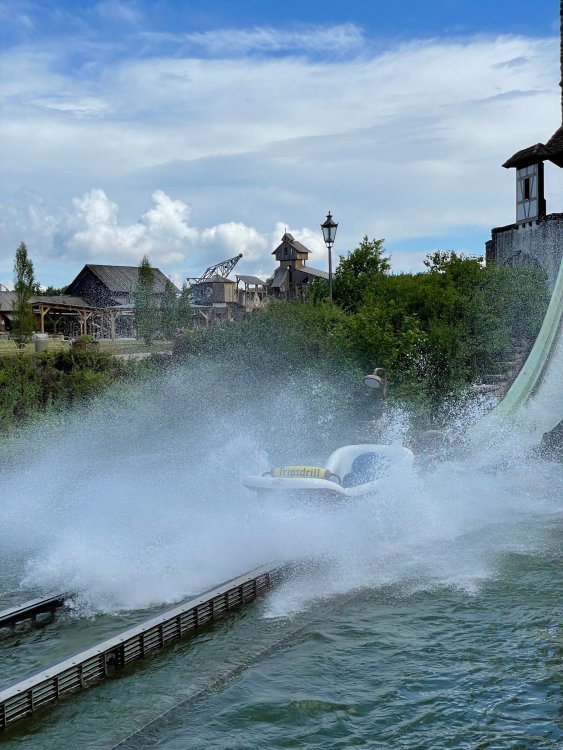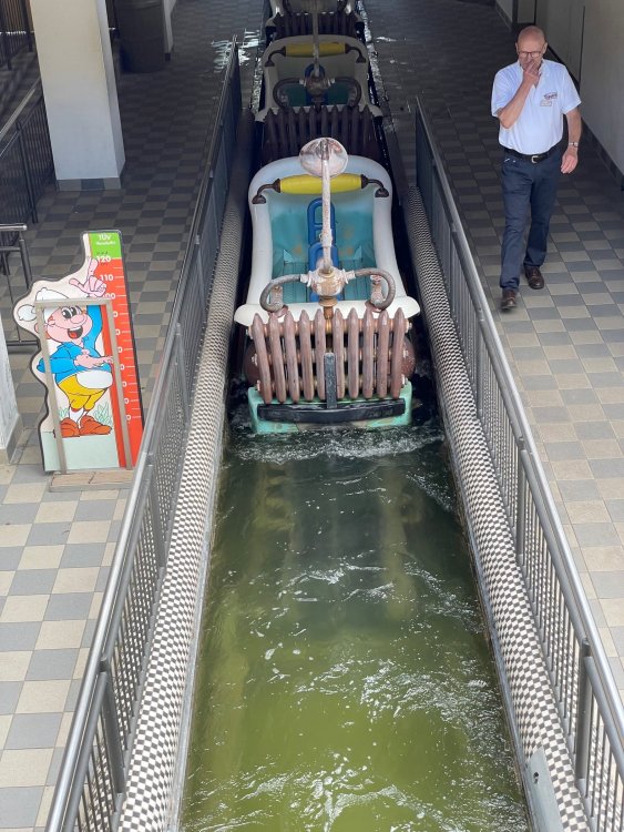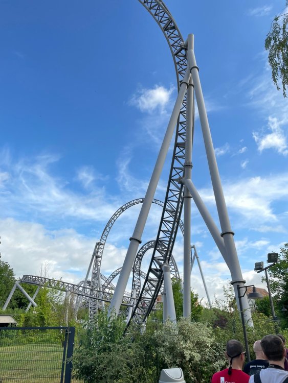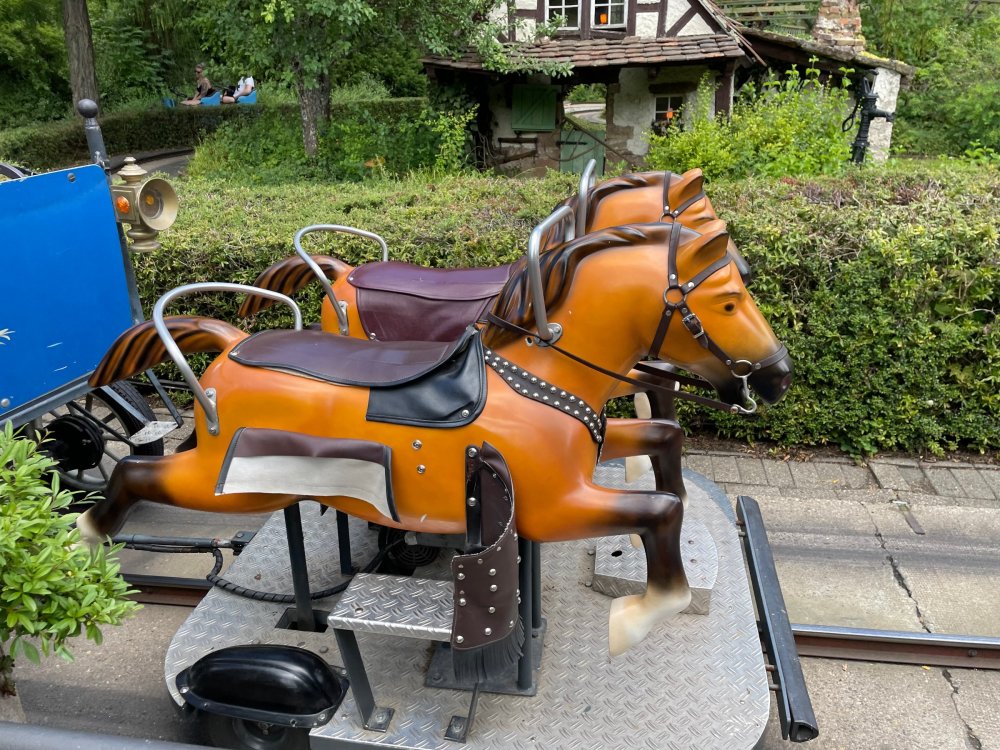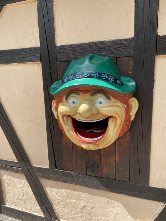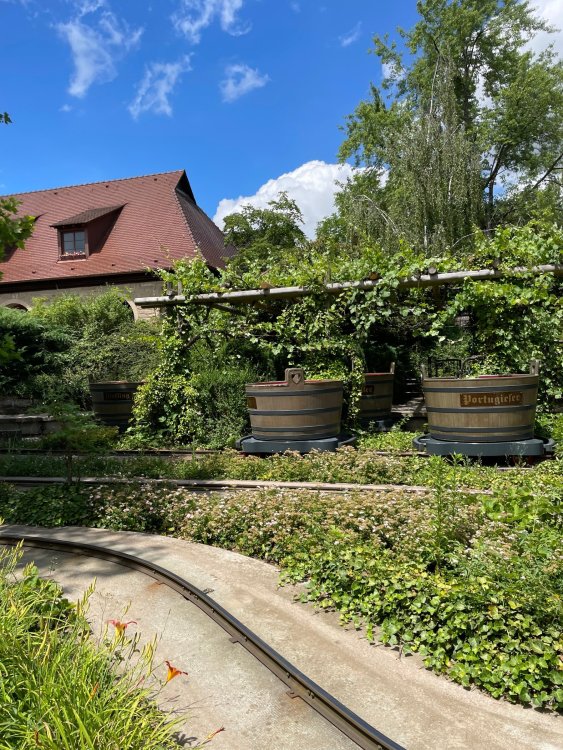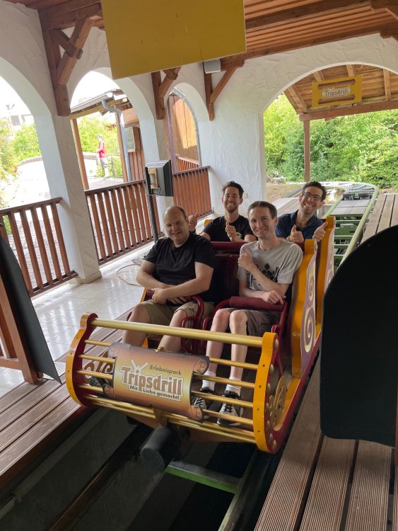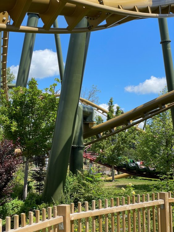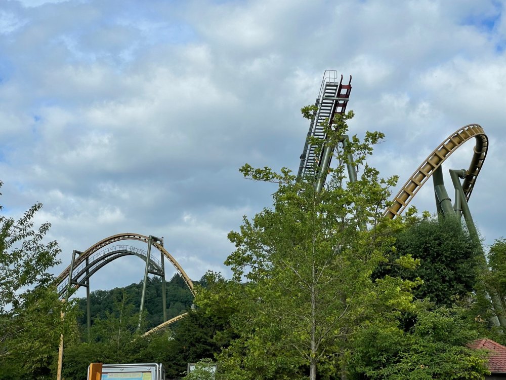 Day 4, part 1: Tripsdrill ! so this day was the earliest "up and out" of the entire trip. . .we had a very full day ahead of us: leaving Europa Park at 6am, spending a good chunk of the the day at Tripsdrill, and then heading out to Holiday Park in the afternoon for some night-time ERT on Expedition GeForce! so we were all up and in our hotel lobby bright and early. can't say that I was super perky, but I still stopped to snap a pic of the beautiful chandelier in the hotel lobby at Europa Park. and then we got the bus loaded up, and said goodbye to Rust. . and headed out towards Tripsdrill. the Countryside is very pretty. . I had to keep reminding myself we were in Germany, and not France any longer. (less windmills) and before too long. . in the middle of rolling green hills, and beautiful farmhouses, we made a turn and I spotted this sign: and moments later? this. a brand new, suspended Vekoma rollercoaster peeking thru the trees. (with the "spike" of a shuttle coaster sticking up in the middle of it???) we made it here for park open - before park open, actually. . . but shortly, the park folks met the group, and led us over to the newest ride in the park (the above coaster) This is the station for Volldampf - the shuttle coaster that has the red track. we'd come back to this in a bit, but yeah, my eyes hadnt' been playing tricks on me - the family Boomerang shuttle coaster "Volldampf" does interact quite closely with the Vekoma suspended. . . intertwining with it and making an excellent (and exciting) option for those too small (or too scared) to ride the bigger, suspended coaster. a better look at that "spike" from the shuttle coaster, poking thru the center of the new Vekoma the front of the train has a terrified sheep hanging onto it . . .LOL but we were mainly here for this. . the newest Vekoma Suspended: Hals Uber Kopf - I believe they said it opened in 2021. tho I'm not exactly sure what the theming was - this was a weird park, and I loved the hell out of it! - much of the theming here SEEMED to be set around German folk tales? So probably something to do with that? 7 guys slaying a bear? not sure how it tied to a suspended coaster with a few inversions. . but it's still a great coaster! and I love how the queue brings you thru the structure. I was a bit wary about riding what I knew was a Vekoma. . . but I absolutely adored that they have the park name/logo on every row hanging between the seats. really COMFORTABLE seats too. wheeee!!! what did I think of it? AMAZING. . and I think my favorite coaster in the park (tho there were some rides in the park that absolutely make this a must visit park). This coaster in particular? high on that "must visit" list - it has AIR TIME! Yes. . . Airtime. On a Suspended coaster! on a VEKOMA Suspended coaster. so smooth, and fun, and so many great elements. . .color me super impressed. and look at that near miss with Volldampf track right here. . . (we were the only ones in the park at the moment, so no chance right now to get the trains together) tho later in the day when we came back to ride again? did manage to get the Boomerang with people on it. speaking of Volldampf. . . after our morning ERT rides, the park had just opened, and the Park Reps walked us over to Volldampf to give TPR a ride. the seats were comfy, and the atmosphere on this is so incredible (since you're moving in and out of the other coaster). . but at the end of the day? it's a family Boomerang, that is really just kinda "meh" . . which is fine, as the Vekoma is so A+ level. since I see Brad and AJ on this train with me, this pic must be courtesy of Elissa or Robb. backwards thru the station. this park is not only full of charm (and WTF is this stuff????). . but also there were a bunch of these 3D illusion "street paintings" thruout the park. not sure if these are permanent installations, or just for a special event and they just happened to be there. . but these were so great (even if some of the illusions worked better than others) oh, I mentioned some WTF stuff in this park? how about this game: you shoot eggs out of a chicken's ass into the open mouths of the villagers (and donkeys). yeah. . . . of COURSE I loved it! the park reps were walking us back to the rear of the park - stopping along the way to ride Rasender Tausendfüßler (Raging Millipede?) the longest coaster train I've ever been on! (pics in a moment). . but that was just a quick stop along the way back to Karacho. . the park's "Smiler" clone (at least I think that's what they told me, it's a clone) EDIT: per Elissa below, it's not a Smiler clone, but it IS similar to Smiler in places it's right across the courtyard from Mamut. . . I LOVED this test seat. yes. . this is the test seat for the trains! speaking of. . these trains are incredible. . . I was glad we got some "ERT" on it, as it was one train ops . . but wow, what a train it is! I mean. . look at this! tho for me? the highlight is this animatronic guy placed in the exit queue. as the train unloads, and the riders exit? he's triggered. . . HAHAHAHAHHAHAHAHAHA. . . brilliant, right? Pic courtesy of, I think, Brad. what did I think? well, having never ridden Smiler, I had no idea what to expect. (in particular that 1st surprise in the dark after leaving the station). I liked it. due to the 1 train restriction, I think I only rode it twice, but I did enjoy it, and if that Vekoma wasn't in the park, this would easily be the #1 coaster here. Apparently this sign is infamous. . but I needed to pee anyways by this point, and it made me laugh, so I snapped a pic of it. and just LOOK at this view - out the windows over the urinal - one gets while peeing. This flat is back over here in this area as well. . I didn't realize until after I got back and saw some posts here on TPR from other parks, that this ride is just an "out of the box" one. . but I was impressed with the theming when we saw it. no time to ride it now, as we had to head over to Mammut. . but