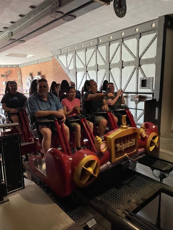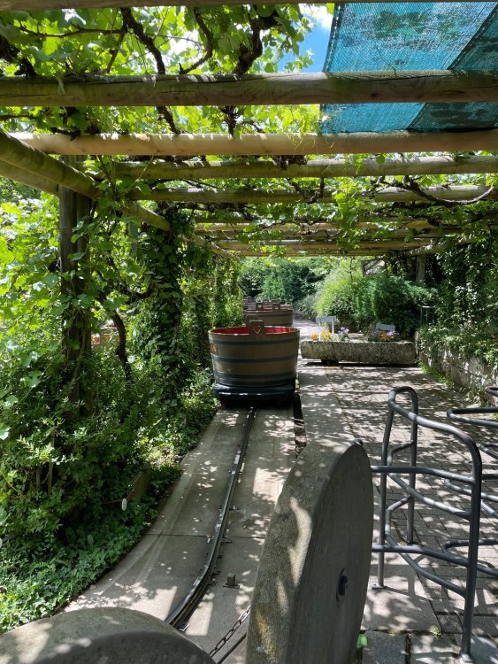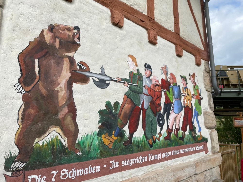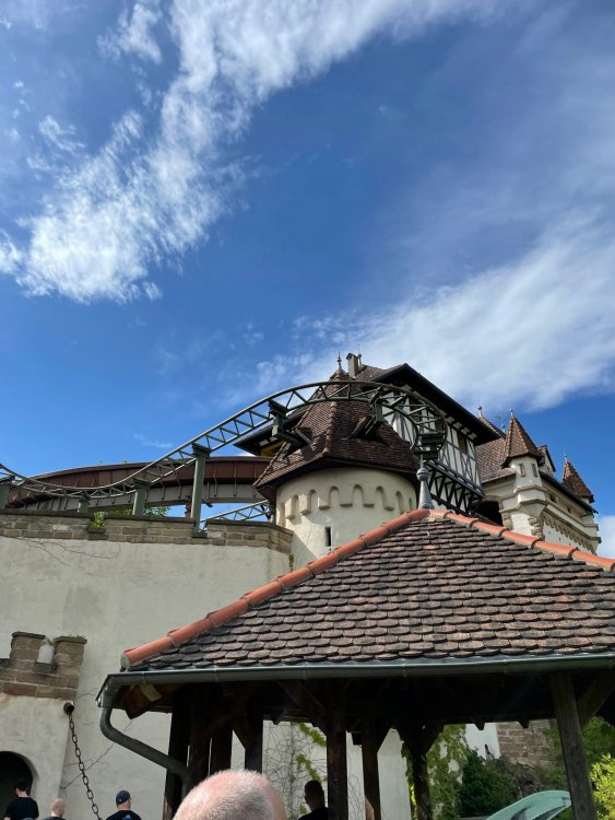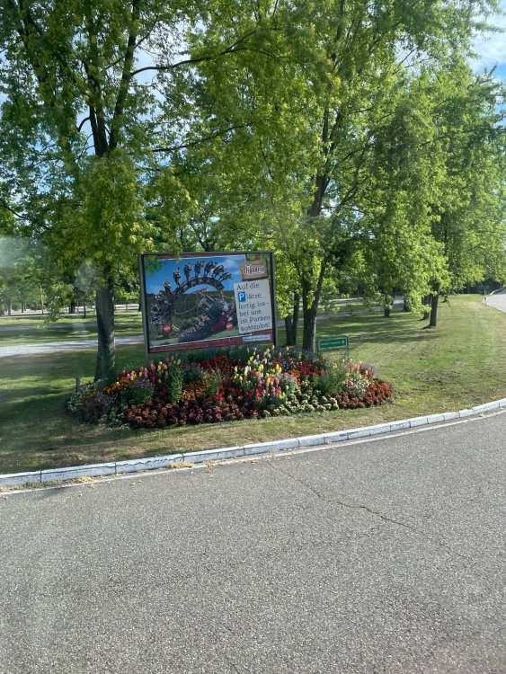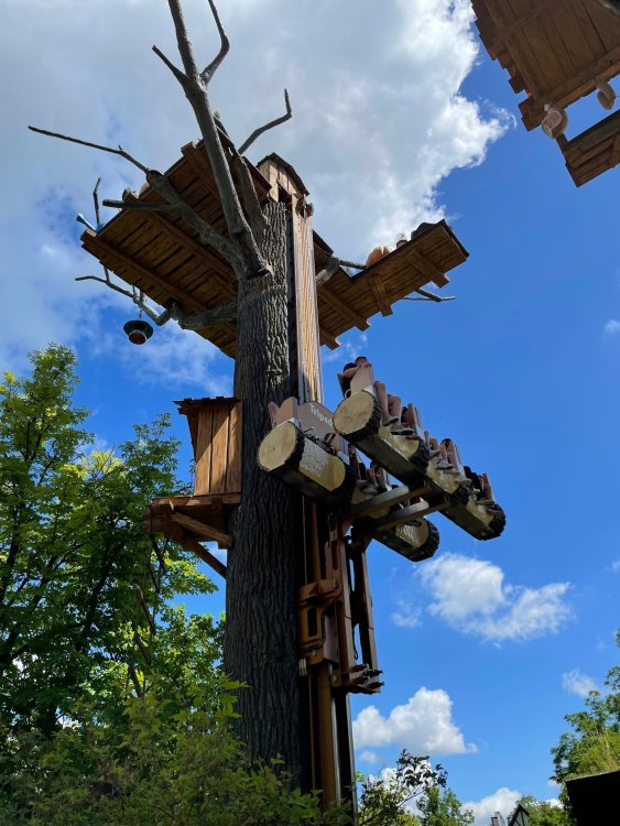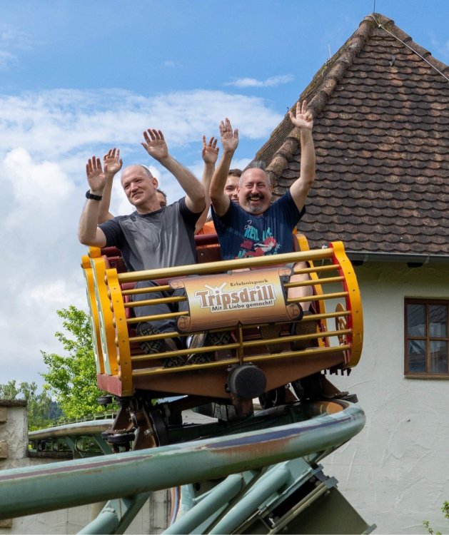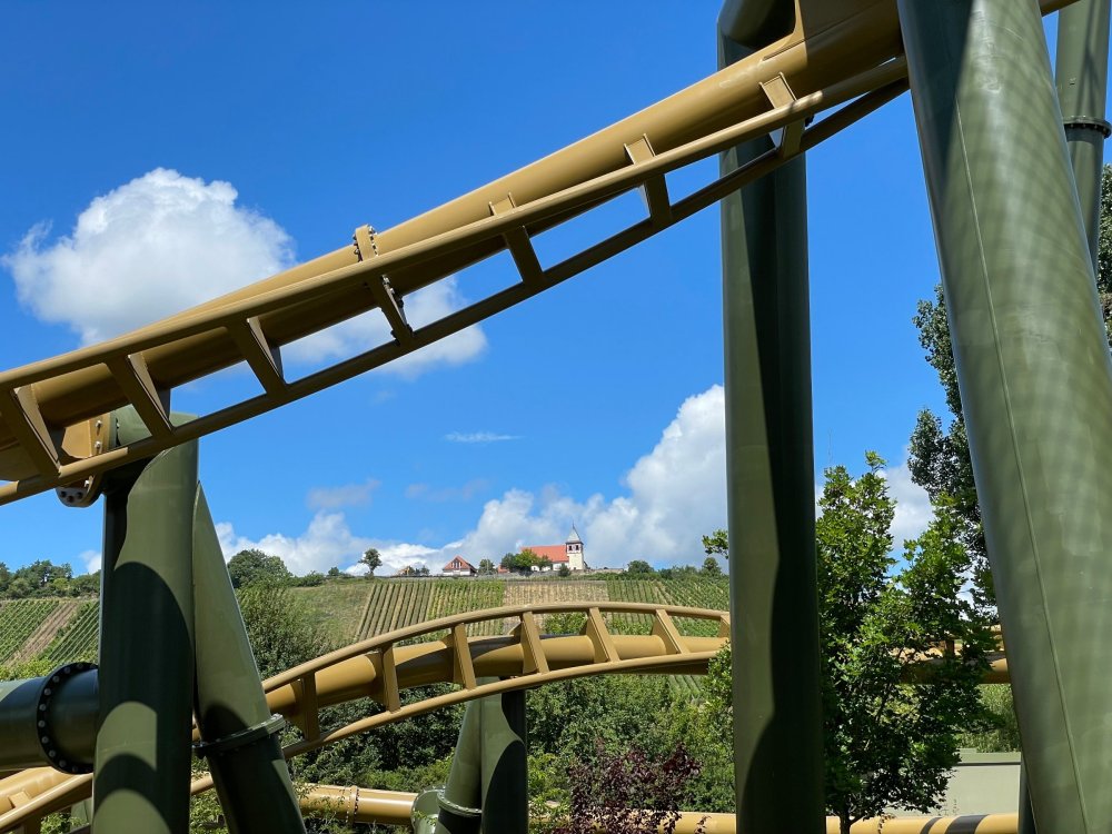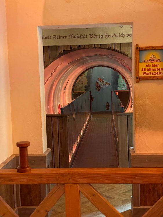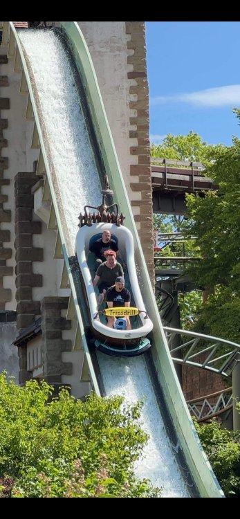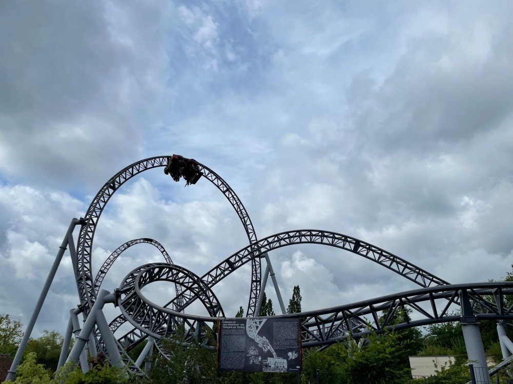 Day 4, part 1: Tripsdrill ! so this day was the earliest "up and out" of the entire trip. . .we had a very full day ahead of us: leaving Europa Park at 6am, spending a good chunk of the the day at Tripsdrill, and then heading out to Holiday Park in the afternoon for some night-time ERT on Expedition GeForce! so we were all up and in our hotel lobby bright and early. can't say that I was super perky, but I still stopped to snap a pic of the beautiful chandelier in the hotel lobby at Europa Park. and then we got the bus loaded up, and said goodbye to Rust. . and headed out towards Tripsdrill. the Countryside is very pretty. . I had to keep reminding myself we were in Germany, and not France any longer. (less windmills) and before too long. . in the middle of rolling green hills, and beautiful farmhouses, we made a turn and I spotted this sign: and moments later? this. a brand new, suspended Vekoma rollercoaster peeking thru the trees. (with the "spike" of a shuttle coaster sticking up in the middle of it???) we made it here for park open - before park open, actually. . . but shortly, the park folks met the group, and led us over to the newest ride in the park (the above coaster) This is the station for Volldampf - the shuttle coaster that has the red track. we'd come back to this in a bit, but yeah, my eyes hadnt' been playing tricks on me - the family Boomerang shuttle coaster "Volldampf" does interact quite closely with the Vekoma suspended. . . intertwining with it and making an excellent (and exciting) option for those too small (or too scared) to ride the bigger, suspended coaster. a better look at that "spike" from the shuttle coaster, poking thru the center of the new Vekoma the front of the train has a terrified sheep hanging onto it . . .LOL but we were mainly here for this. . the newest Vekoma Suspended: Hals Uber Kopf - I believe they said it opened in 2021. tho I'm not exactly sure what the theming was - this was a weird park, and I loved the hell out of it! - much of the theming here SEEMED to be set around German folk tales? So probably something to do with that? 7 guys slaying a bear? not sure how it tied to a suspended coaster with a few inversions. . but it's still a great coaster! and I love how the queue brings you thru the structure. I was a bit wary about riding what I knew was a Vekoma. . . but I absolutely adored that they have the park name/logo on every row hanging between the seats. really COMFORTABLE seats too. wheeee!!! what did I think of it? AMAZING. . and I think my favorite coaster in the park (tho there were some rides in the park that absolutely make this a must visit park). This coaster in particular? high on that "must visit" list - it has AIR TIME! Yes. . . Airtime. On a Suspended coaster! on a VEKOMA Suspended coaster. so smooth, and fun, and so many great elements. . .color me super impressed. and look at that near miss with Volldampf track right here. . . (we were the only ones in the park at the moment, so no chance right now to get the trains together) tho later in the day when we came back to ride again? did manage to get the Boomerang with people on it. speaking of Volldampf. . . after our morning ERT rides, the park had just opened, and the Park Reps walked us over to Volldampf to give TPR a ride. the seats were comfy, and the atmosphere on this is so incredible (since you're moving in and out of the other coaster). . but at the end of the day? it's a family Boomerang, that is really just kinda "meh" . . which is fine, as the Vekoma is so A+ level. since I see Brad and AJ on this train with me, this pic must be courtesy of Elissa or Robb. backwards thru the station. this park is not only full of charm (and WTF is this stuff????). . but also there were a bunch of these 3D illusion "street paintings" thruout the park. not sure if these are permanent installations, or just for a special event and they just happened to be there. . but these were so great (even if some of the illusions worked better than others) oh, I mentioned some WTF stuff in this park? how about this game: you shoot eggs out of a chicken's ass into the open mouths of the villagers (and donkeys). yeah. . . . of COURSE I loved it! the park reps were walking us back to the rear of the park - stopping along the way to ride Rasender Tausendfüßler (Raging Millipede?) the longest coaster train I've ever been on! (pics in a moment). . but that was just a quick stop along the way back to Karacho. . the park's "Smiler" clone (at least I think that's what they told me, it's a clone) EDIT: per Elissa below, it's not a Smiler clone, but it IS similar to Smiler in places it's right across the courtyard from Mamut. . . I LOVED this test seat. yes. . this is the test seat for the trains! speaking of. . these trains are incredible. . . I was glad we got some "ERT" on it, as it was one train ops . . but wow, what a train it is! I mean. . look at this! tho for me? the highlight is this animatronic guy placed in the exit queue. as the train unloads, and the riders exit? he's triggered. . . HAHAHAHAHHAHAHAHAHA. . . brilliant, right? Pic courtesy of, I think, Brad. what did I think? well, having never ridden Smiler, I had no idea what to expect. (in particular that 1st surprise in the dark after leaving the station). I liked it. due to the 1 train restriction, I think I only rode it twice, but I did enjoy it, and if that Vekoma wasn't in the park, this would easily be the #1 coaster here. Apparently this sign is infamous. . but I needed to pee anyways by this point, and it made me laugh, so I snapped a pic of it. and just LOOK at this view - out the windows over the urinal - one gets while peeing. This flat is back over here in this area as well. . I didn't realize until after I got back and saw some posts here on TPR from other parks, that this ride is just an "out of the box" one. . but I was impressed with the theming when we saw it. no time to ride it now, as we had to head over to Mammut. . but