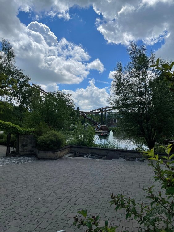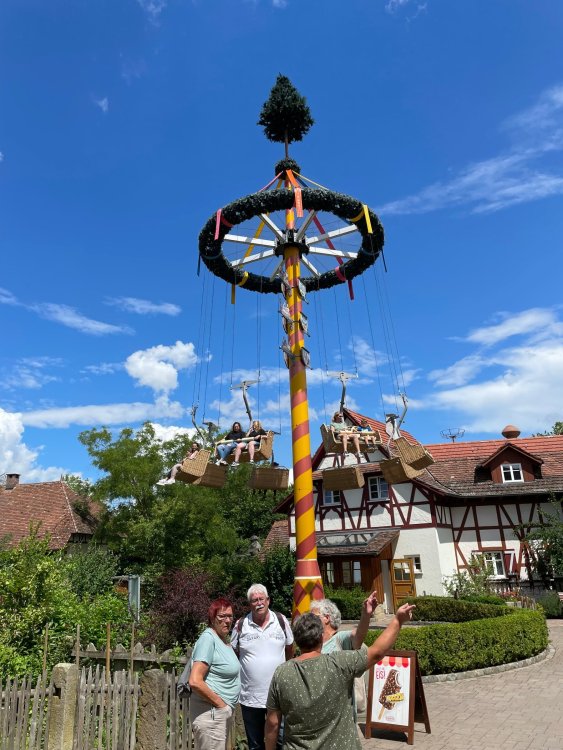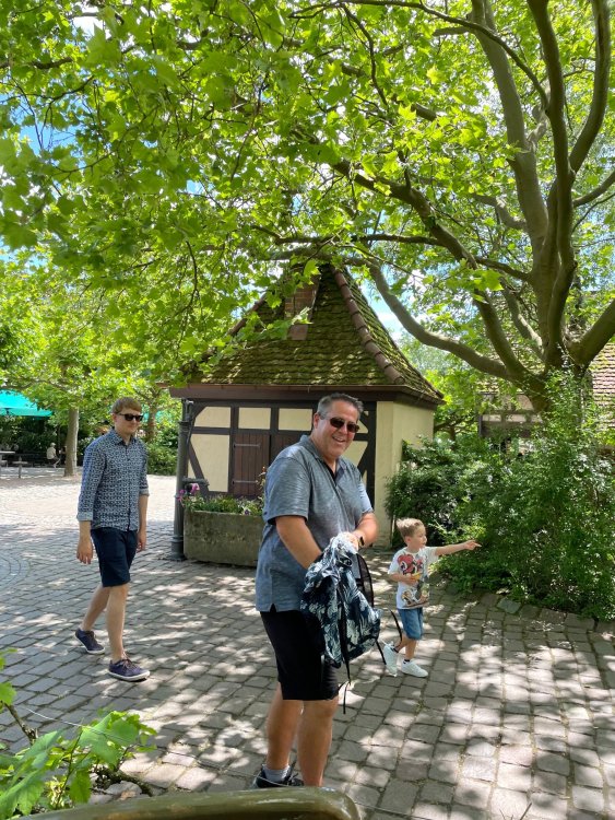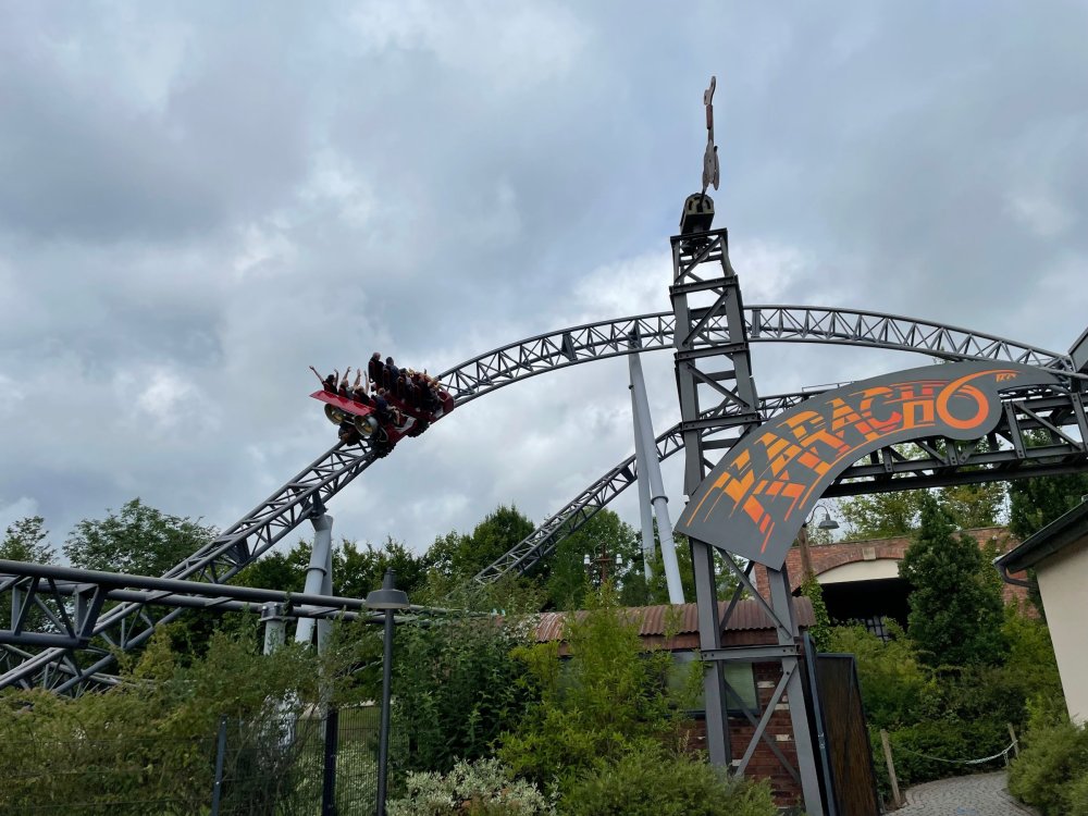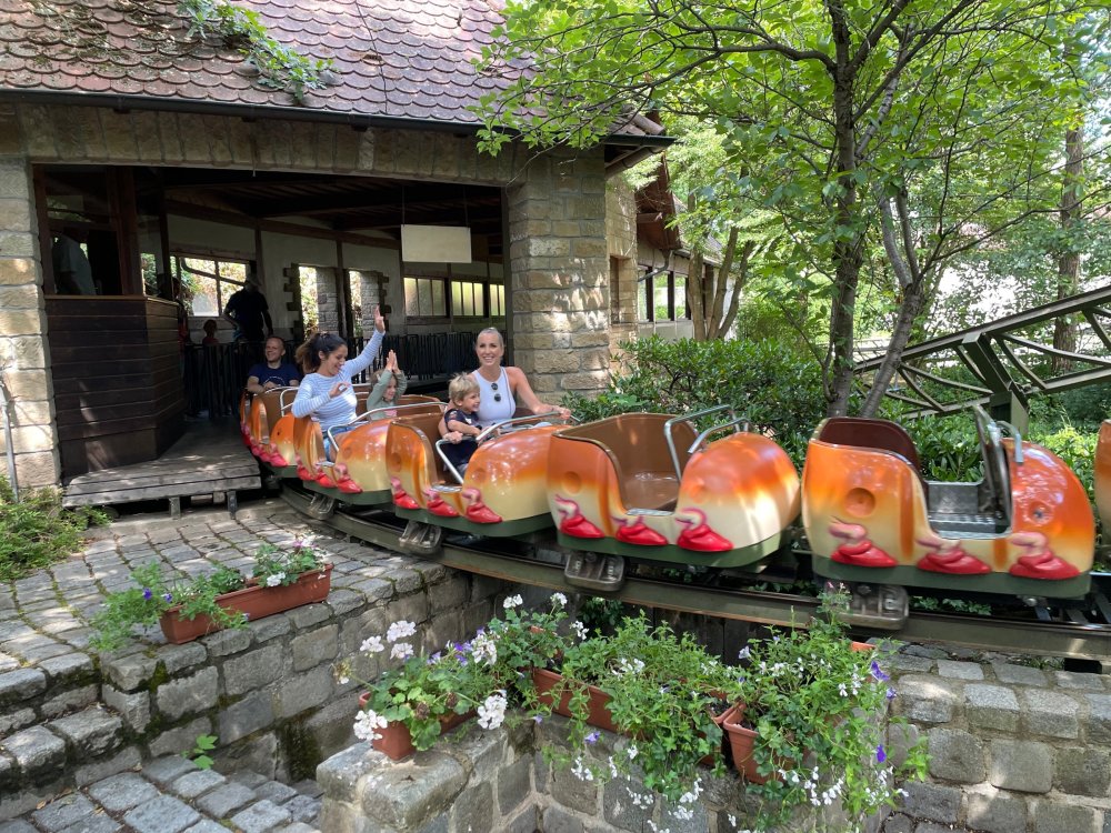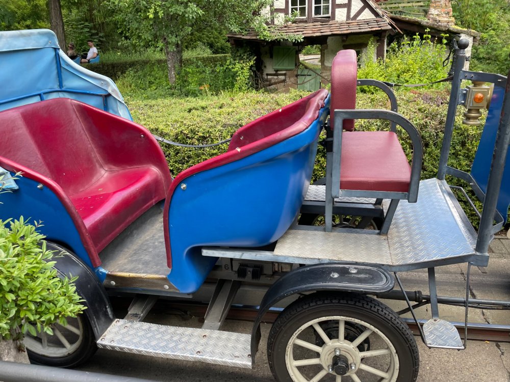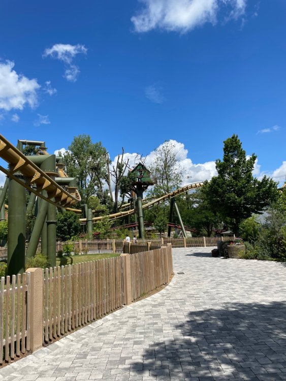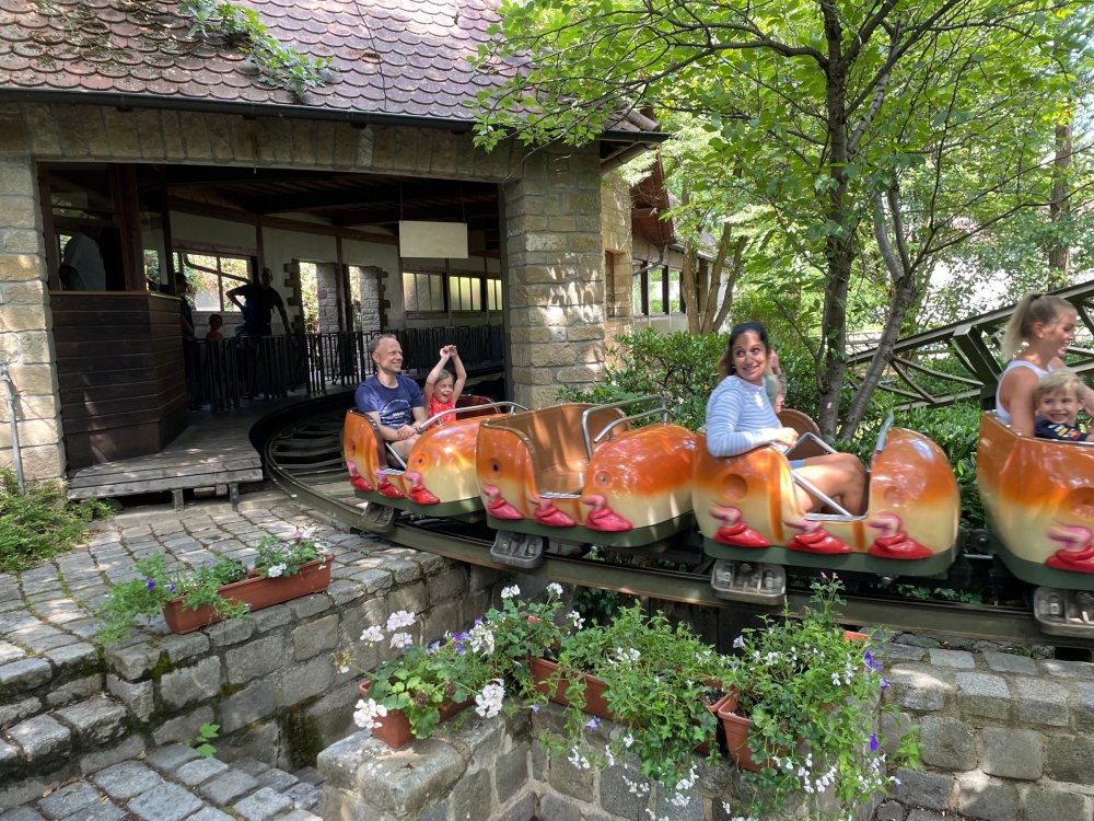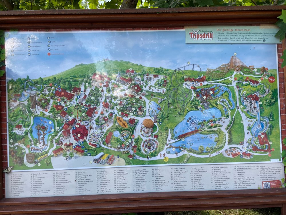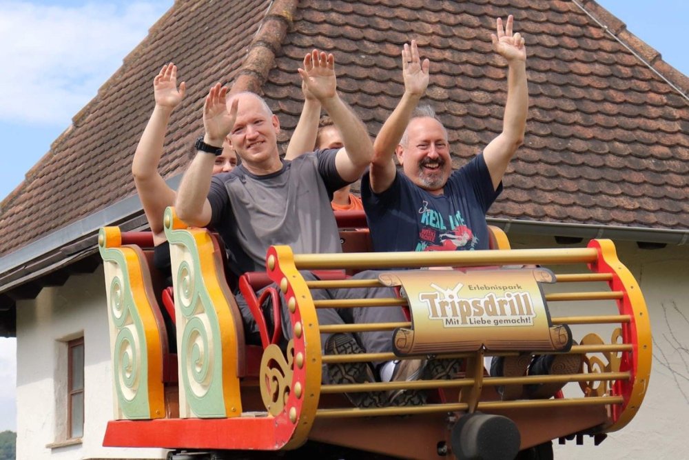 Day 4, part 1: Tripsdrill ! so this day was the earliest "up and out" of the entire trip. . .we had a very full day ahead of us: leaving Europa Park at 6am, spending a good chunk of the the day at Tripsdrill, and then heading out to Holiday Park in the afternoon for some night-time ERT on Expedition GeForce! so we were all up and in our hotel lobby bright and early. can't say that I was super perky, but I still stopped to snap a pic of the beautiful chandelier in the hotel lobby at Europa Park. and then we got the bus loaded up, and said goodbye to Rust. . and headed out towards Tripsdrill. the Countryside is very pretty. . I had to keep reminding myself we were in Germany, and not France any longer. (less windmills) and before too long. . in the middle of rolling green hills, and beautiful farmhouses, we made a turn and I spotted this sign: and moments later? this. a brand new, suspended Vekoma rollercoaster peeking thru the trees. (with the "spike" of a shuttle coaster sticking up in the middle of it???) we made it here for park open - before park open, actually. . . but shortly, the park folks met the group, and led us over to the newest ride in the park (the above coaster) This is the station for Volldampf - the shuttle coaster that has the red track. we'd come back to this in a bit, but yeah, my eyes hadnt' been playing tricks on me - the family Boomerang shuttle coaster "Volldampf" does interact quite closely with the Vekoma suspended. . . intertwining with it and making an excellent (and exciting) option for those too small (or too scared) to ride the bigger, suspended coaster. a better look at that "spike" from the shuttle coaster, poking thru the center of the new Vekoma the front of the train has a terrified sheep hanging onto it . . .LOL but we were mainly here for this. . the newest Vekoma Suspended: Hals Uber Kopf - I believe they said it opened in 2021. tho I'm not exactly sure what the theming was - this was a weird park, and I loved the hell out of it! - much of the theming here SEEMED to be set around German folk tales? So probably something to do with that? 7 guys slaying a bear? not sure how it tied to a suspended coaster with a few inversions. . but it's still a great coaster! and I love how the queue brings you thru the structure. I was a bit wary about riding what I knew was a Vekoma. . . but I absolutely adored that they have the park name/logo on every row hanging between the seats. really COMFORTABLE seats too. wheeee!!! what did I think of it? AMAZING. . and I think my favorite coaster in the park (tho there were some rides in the park that absolutely make this a must visit park). This coaster in particular? high on that "must visit" list - it has AIR TIME! Yes. . . Airtime. On a Suspended coaster! on a VEKOMA Suspended coaster. so smooth, and fun, and so many great elements. . .color me super impressed. and look at that near miss with Volldampf track right here. . . (we were the only ones in the park at the moment, so no chance right now to get the trains together) tho later in the day when we came back to ride again? did manage to get the Boomerang with people on it. speaking of Volldampf. . . after our morning ERT rides, the park had just opened, and the Park Reps walked us over to Volldampf to give TPR a ride. the seats were comfy, and the atmosphere on this is so incredible (since you're moving in and out of the other coaster). . but at the end of the day? it's a family Boomerang, that is really just kinda "meh" . . which is fine, as the Vekoma is so A+ level. since I see Brad and AJ on this train with me, this pic must be courtesy of Elissa or Robb. backwards thru the station. this park is not only full of charm (and WTF is this stuff????). . but also there were a bunch of these 3D illusion "street paintings" thruout the park. not sure if these are permanent installations, or just for a special event and they just happened to be there. . but these were so great (even if some of the illusions worked better than others) oh, I mentioned some WTF stuff in this park? how about this game: you shoot eggs out of a chicken's ass into the open mouths of the villagers (and donkeys). yeah. . . . of COURSE I loved it! the park reps were walking us back to the rear of the park - stopping along the way to ride Rasender Tausendfüßler (Raging Millipede?) the longest coaster train I've ever been on! (pics in a moment). . but that was just a quick stop along the way back to Karacho. . the park's "Smiler" clone (at least I think that's what they told me, it's a clone) EDIT: per Elissa below, it's not a Smiler clone, but it IS similar to Smiler in places it's right across the courtyard from Mamut. . . I LOVED this test seat. yes. . this is the test seat for the trains! speaking of. . these trains are incredible. . . I was glad we got some "ERT" on it, as it was one train ops . . but wow, what a train it is! I mean. . look at this! tho for me? the highlight is this animatronic guy placed in the exit queue. as the train unloads, and the riders exit? he's triggered. . . HAHAHAHAHHAHAHAHAHA. . . brilliant, right? Pic courtesy of, I think, Brad. what did I think? well, having never ridden Smiler, I had no idea what to expect. (in particular that 1st surprise in the dark after leaving the station). I liked it. due to the 1 train restriction, I think I only rode it twice, but I did enjoy it, and if that Vekoma wasn't in the park, this would easily be the #1 coaster here. Apparently this sign is infamous. . but I needed to pee anyways by this point, and it made me laugh, so I snapped a pic of it. and just LOOK at this view - out the windows over the urinal - one gets while peeing. This flat is back over here in this area as well. . I didn't realize until after I got back and saw some posts here on TPR from other parks, that this ride is just an "out of the box" one. . but I was impressed with the theming when we saw it. no time to ride it now, as we had to head over to Mammut. . but