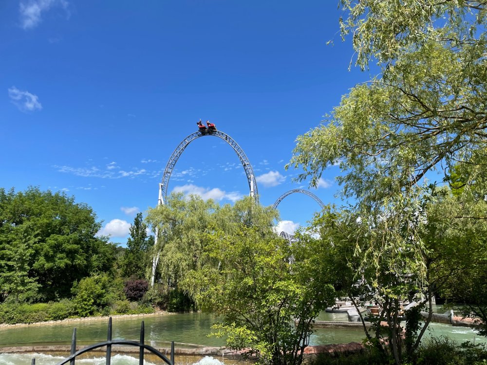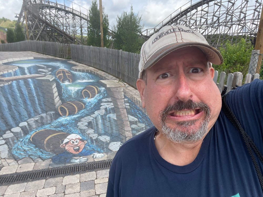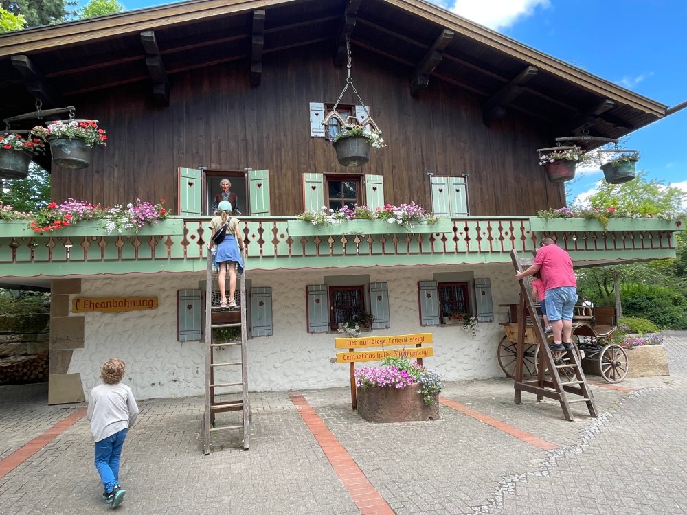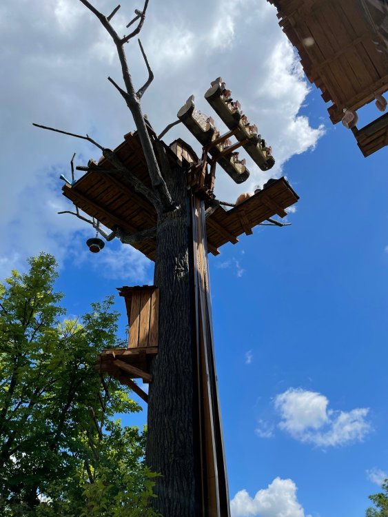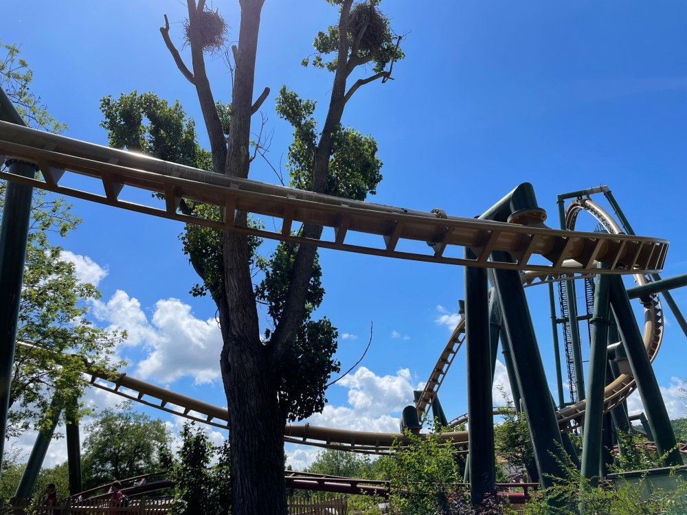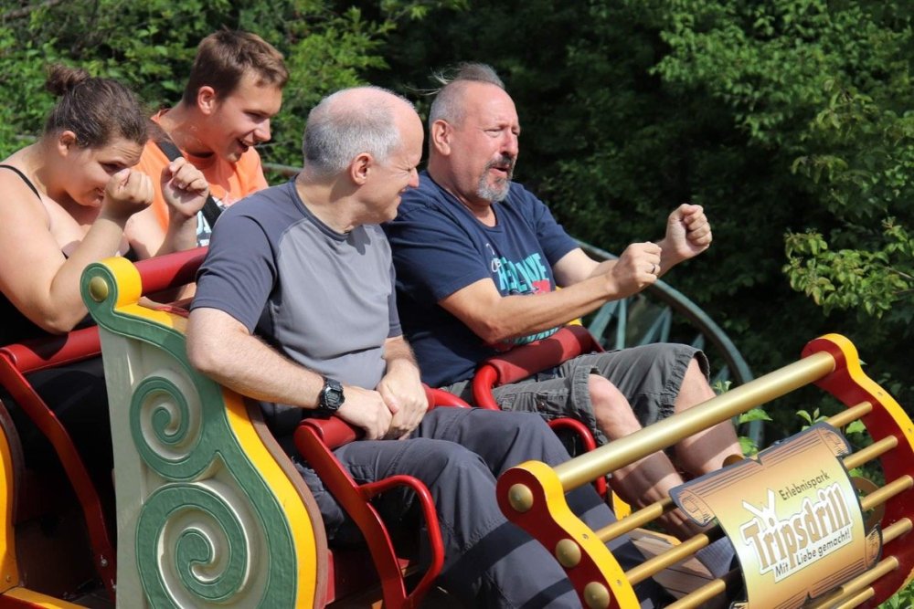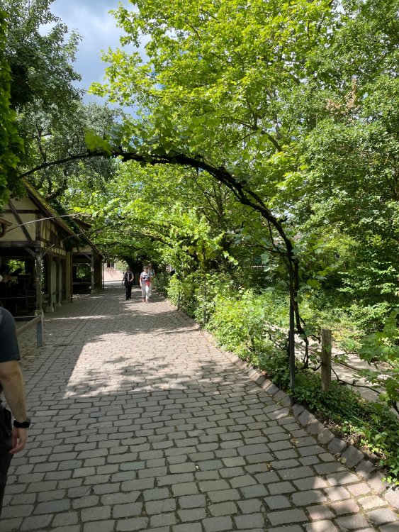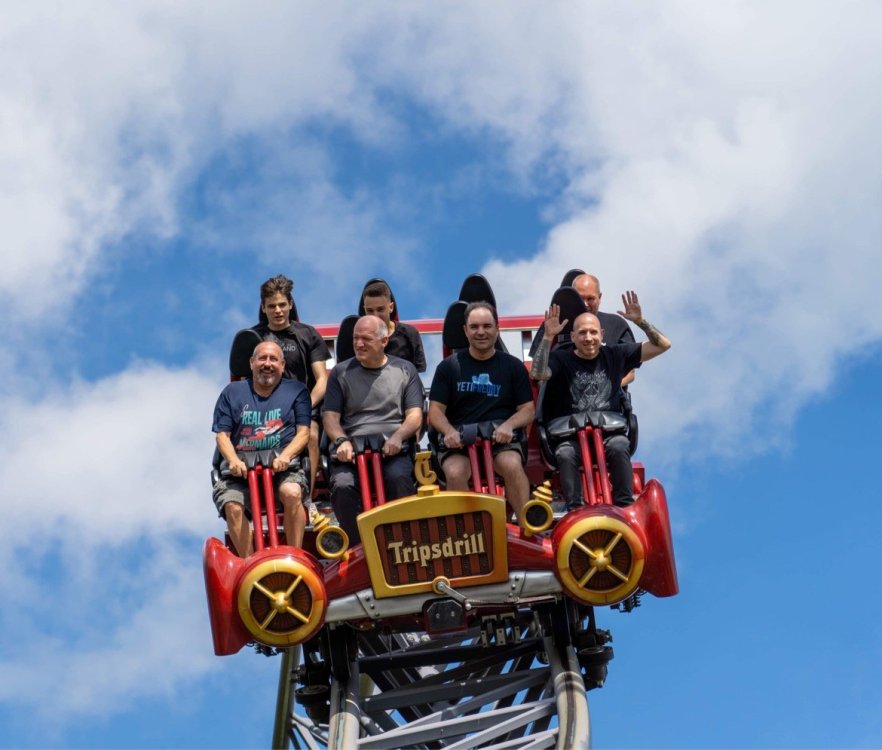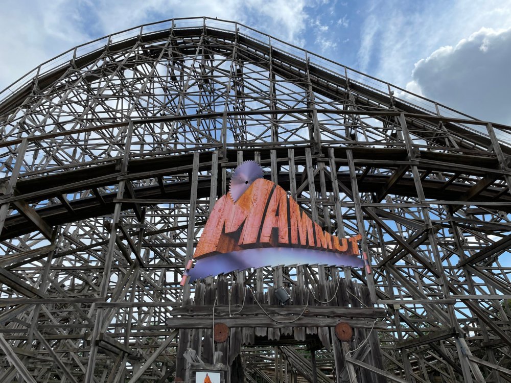 Day 4, part 1: Tripsdrill ! so this day was the earliest "up and out" of the entire trip. . .we had a very full day ahead of us: leaving Europa Park at 6am, spending a good chunk of the the day at Tripsdrill, and then heading out to Holiday Park in the afternoon for some night-time ERT on Expedition GeForce! so we were all up and in our hotel lobby bright and early. can't say that I was super perky, but I still stopped to snap a pic of the beautiful chandelier in the hotel lobby at Europa Park. and then we got the bus loaded up, and said goodbye to Rust. . and headed out towards Tripsdrill. the Countryside is very pretty. . I had to keep reminding myself we were in Germany, and not France any longer. (less windmills) and before too long. . in the middle of rolling green hills, and beautiful farmhouses, we made a turn and I spotted this sign: and moments later? this. a brand new, suspended Vekoma rollercoaster peeking thru the trees. (with the "spike" of a shuttle coaster sticking up in the middle of it???) we made it here for park open - before park open, actually. . . but shortly, the park folks met the group, and led us over to the newest ride in the park (the above coaster) This is the station for Volldampf - the shuttle coaster that has the red track. we'd come back to this in a bit, but yeah, my eyes hadnt' been playing tricks on me - the family Boomerang shuttle coaster "Volldampf" does interact quite closely with the Vekoma suspended. . . intertwining with it and making an excellent (and exciting) option for those too small (or too scared) to ride the bigger, suspended coaster. a better look at that "spike" from the shuttle coaster, poking thru the center of the new Vekoma the front of the train has a terrified sheep hanging onto it . . .LOL but we were mainly here for this. . the newest Vekoma Suspended: Hals Uber Kopf - I believe they said it opened in 2021. tho I'm not exactly sure what the theming was - this was a weird park, and I loved the hell out of it! - much of the theming here SEEMED to be set around German folk tales? So probably something to do with that? 7 guys slaying a bear? not sure how it tied to a suspended coaster with a few inversions. . but it's still a great coaster! and I love how the queue brings you thru the structure. I was a bit wary about riding what I knew was a Vekoma. . . but I absolutely adored that they have the park name/logo on every row hanging between the seats. really COMFORTABLE seats too. wheeee!!! what did I think of it? AMAZING. . and I think my favorite coaster in the park (tho there were some rides in the park that absolutely make this a must visit park). This coaster in particular? high on that "must visit" list - it has AIR TIME! Yes. . . Airtime. On a Suspended coaster! on a VEKOMA Suspended coaster. so smooth, and fun, and so many great elements. . .color me super impressed. and look at that near miss with Volldampf track right here. . . (we were the only ones in the park at the moment, so no chance right now to get the trains together) tho later in the day when we came back to ride again? did manage to get the Boomerang with people on it. speaking of Volldampf. . . after our morning ERT rides, the park had just opened, and the Park Reps walked us over to Volldampf to give TPR a ride. the seats were comfy, and the atmosphere on this is so incredible (since you're moving in and out of the other coaster). . but at the end of the day? it's a family Boomerang, that is really just kinda "meh" . . which is fine, as the Vekoma is so A+ level. since I see Brad and AJ on this train with me, this pic must be courtesy of Elissa or Robb. backwards thru the station. this park is not only full of charm (and WTF is this stuff????). . but also there were a bunch of these 3D illusion "street paintings" thruout the park. not sure if these are permanent installations, or just for a special event and they just happened to be there. . but these were so great (even if some of the illusions worked better than others) oh, I mentioned some WTF stuff in this park? how about this game: you shoot eggs out of a chicken's ass into the open mouths of the villagers (and donkeys). yeah. . . . of COURSE I loved it! the park reps were walking us back to the rear of the park - stopping along the way to ride Rasender Tausendfüßler (Raging Millipede?) the longest coaster train I've ever been on! (pics in a moment). . but that was just a quick stop along the way back to Karacho. . the park's "Smiler" clone (at least I think that's what they told me, it's a clone) EDIT: per Elissa below, it's not a Smiler clone, but it IS similar to Smiler in places it's right across the courtyard from Mamut. . . I LOVED this test seat. yes. . this is the test seat for the trains! speaking of. . these trains are incredible. . . I was glad we got some "ERT" on it, as it was one train ops . . but wow, what a train it is! I mean. . look at this! tho for me? the highlight is this animatronic guy placed in the exit queue. as the train unloads, and the riders exit? he's triggered. . . HAHAHAHAHHAHAHAHAHA. . . brilliant, right? Pic courtesy of, I think, Brad. what did I think? well, having never ridden Smiler, I had no idea what to expect. (in particular that 1st surprise in the dark after leaving the station). I liked it. due to the 1 train restriction, I think I only rode it twice, but I did enjoy it, and if that Vekoma wasn't in the park, this would easily be the #1 coaster here. Apparently this sign is infamous. . but I needed to pee anyways by this point, and it made me laugh, so I snapped a pic of it. and just LOOK at this view - out the windows over the urinal - one gets while peeing. This flat is back over here in this area as well. . I didn't realize until after I got back and saw some posts here on TPR from other parks, that this ride is just an "out of the box" one. . but I was impressed with the theming when we saw it. no time to ride it now, as we had to head over to Mammut. . but