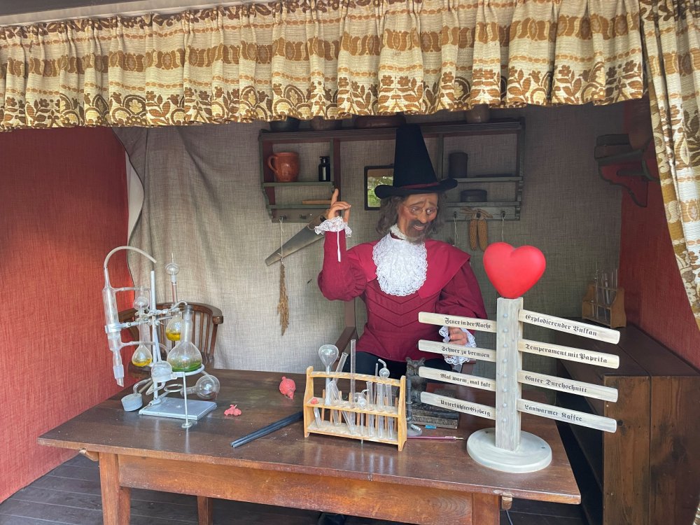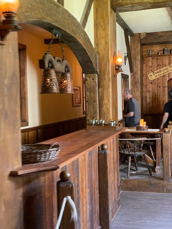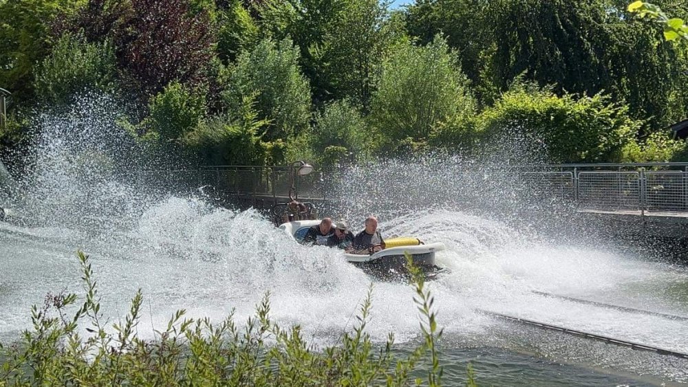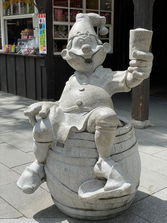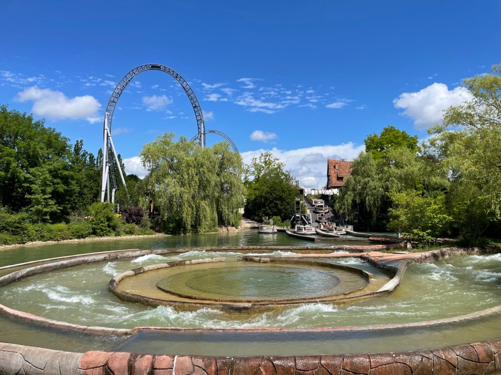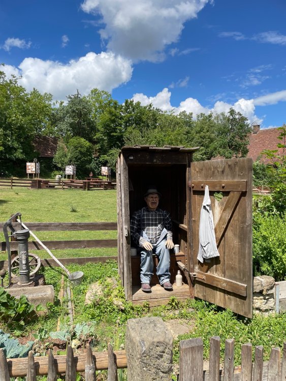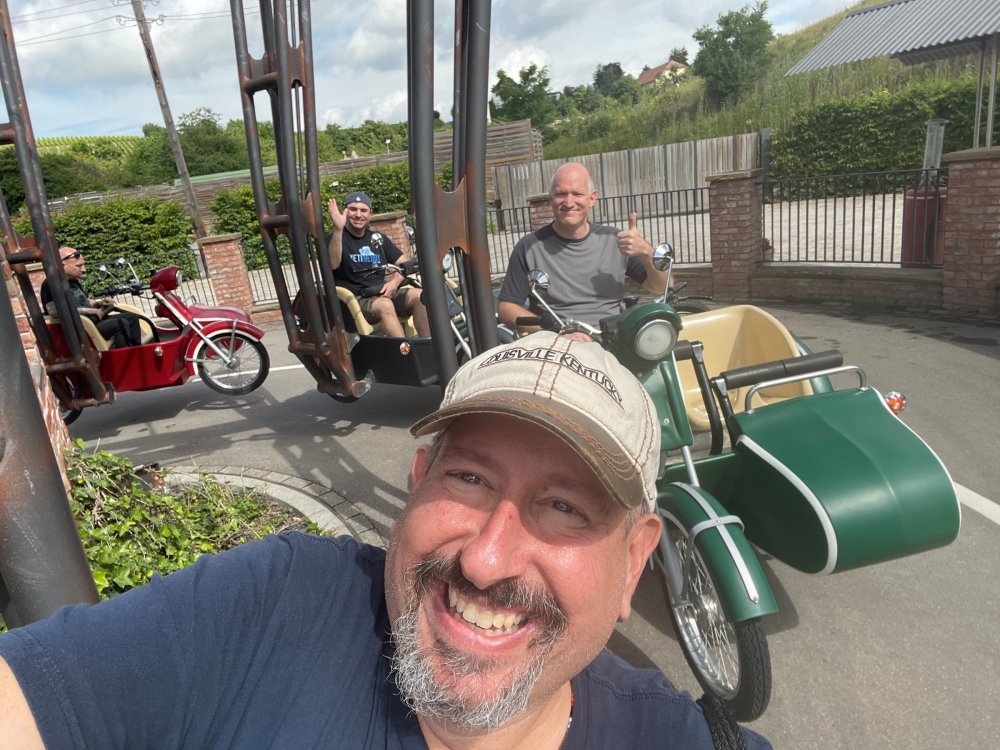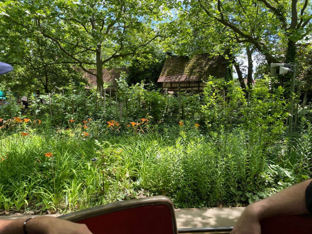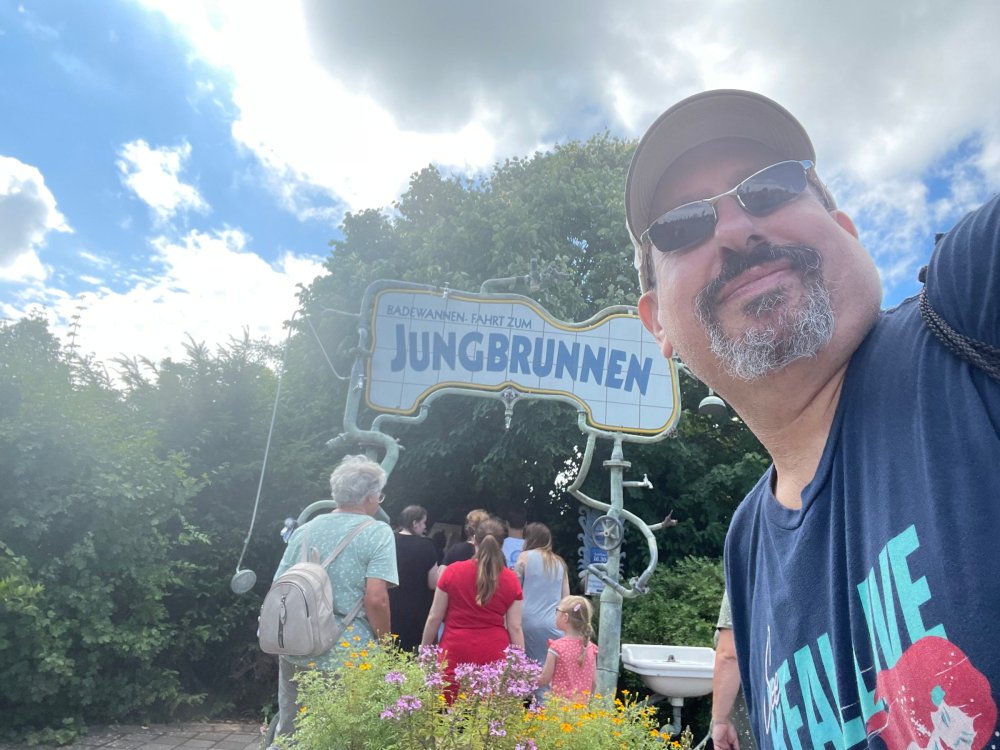 Day 4, part 1: Tripsdrill ! so this day was the earliest "up and out" of the entire trip. . .we had a very full day ahead of us: leaving Europa Park at 6am, spending a good chunk of the the day at Tripsdrill, and then heading out to Holiday Park in the afternoon for some night-time ERT on Expedition GeForce! so we were all up and in our hotel lobby bright and early. can't say that I was super perky, but I still stopped to snap a pic of the beautiful chandelier in the hotel lobby at Europa Park. and then we got the bus loaded up, and said goodbye to Rust. . and headed out towards Tripsdrill. the Countryside is very pretty. . I had to keep reminding myself we were in Germany, and not France any longer. (less windmills) and before too long. . in the middle of rolling green hills, and beautiful farmhouses, we made a turn and I spotted this sign: and moments later? this. a brand new, suspended Vekoma rollercoaster peeking thru the trees. (with the "spike" of a shuttle coaster sticking up in the middle of it???) we made it here for park open - before park open, actually. . . but shortly, the park folks met the group, and led us over to the newest ride in the park (the above coaster) This is the station for Volldampf - the shuttle coaster that has the red track. we'd come back to this in a bit, but yeah, my eyes hadnt' been playing tricks on me - the family Boomerang shuttle coaster "Volldampf" does interact quite closely with the Vekoma suspended. . . intertwining with it and making an excellent (and exciting) option for those too small (or too scared) to ride the bigger, suspended coaster. a better look at that "spike" from the shuttle coaster, poking thru the center of the new Vekoma the front of the train has a terrified sheep hanging onto it . . .LOL but we were mainly here for this. . the newest Vekoma Suspended: Hals Uber Kopf - I believe they said it opened in 2021. tho I'm not exactly sure what the theming was - this was a weird park, and I loved the hell out of it! - much of the theming here SEEMED to be set around German folk tales? So probably something to do with that? 7 guys slaying a bear? not sure how it tied to a suspended coaster with a few inversions. . but it's still a great coaster! and I love how the queue brings you thru the structure. I was a bit wary about riding what I knew was a Vekoma. . . but I absolutely adored that they have the park name/logo on every row hanging between the seats. really COMFORTABLE seats too. wheeee!!! what did I think of it? AMAZING. . and I think my favorite coaster in the park (tho there were some rides in the park that absolutely make this a must visit park). This coaster in particular? high on that "must visit" list - it has AIR TIME! Yes. . . Airtime. On a Suspended coaster! on a VEKOMA Suspended coaster. so smooth, and fun, and so many great elements. . .color me super impressed. and look at that near miss with Volldampf track right here. . . (we were the only ones in the park at the moment, so no chance right now to get the trains together) tho later in the day when we came back to ride again? did manage to get the Boomerang with people on it. speaking of Volldampf. . . after our morning ERT rides, the park had just opened, and the Park Reps walked us over to Volldampf to give TPR a ride. the seats were comfy, and the atmosphere on this is so incredible (since you're moving in and out of the other coaster). . but at the end of the day? it's a family Boomerang, that is really just kinda "meh" . . which is fine, as the Vekoma is so A+ level. since I see Brad and AJ on this train with me, this pic must be courtesy of Elissa or Robb. backwards thru the station. this park is not only full of charm (and WTF is this stuff????). . but also there were a bunch of these 3D illusion "street paintings" thruout the park. not sure if these are permanent installations, or just for a special event and they just happened to be there. . but these were so great (even if some of the illusions worked better than others) oh, I mentioned some WTF stuff in this park? how about this game: you shoot eggs out of a chicken's ass into the open mouths of the villagers (and donkeys). yeah. . . . of COURSE I loved it! the park reps were walking us back to the rear of the park - stopping along the way to ride Rasender Tausendfüßler (Raging Millipede?) the longest coaster train I've ever been on! (pics in a moment). . but that was just a quick stop along the way back to Karacho. . the park's "Smiler" clone (at least I think that's what they told me, it's a clone) EDIT: per Elissa below, it's not a Smiler clone, but it IS similar to Smiler in places it's right across the courtyard from Mamut. . . I LOVED this test seat. yes. . this is the test seat for the trains! speaking of. . these trains are incredible. . . I was glad we got some "ERT" on it, as it was one train ops . . but wow, what a train it is! I mean. . look at this! tho for me? the highlight is this animatronic guy placed in the exit queue. as the train unloads, and the riders exit? he's triggered. . . HAHAHAHAHHAHAHAHAHA. . . brilliant, right? Pic courtesy of, I think, Brad. what did I think? well, having never ridden Smiler, I had no idea what to expect. (in particular that 1st surprise in the dark after leaving the station). I liked it. due to the 1 train restriction, I think I only rode it twice, but I did enjoy it, and if that Vekoma wasn't in the park, this would easily be the #1 coaster here. Apparently this sign is infamous. . but I needed to pee anyways by this point, and it made me laugh, so I snapped a pic of it. and just LOOK at this view - out the windows over the urinal - one gets while peeing. This flat is back over here in this area as well. . I didn't realize until after I got back and saw some posts here on TPR from other parks, that this ride is just an "out of the box" one. . but I was impressed with the theming when we saw it. no time to ride it now, as we had to head over to Mammut. . but