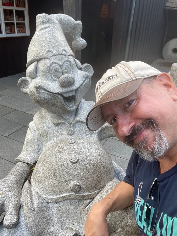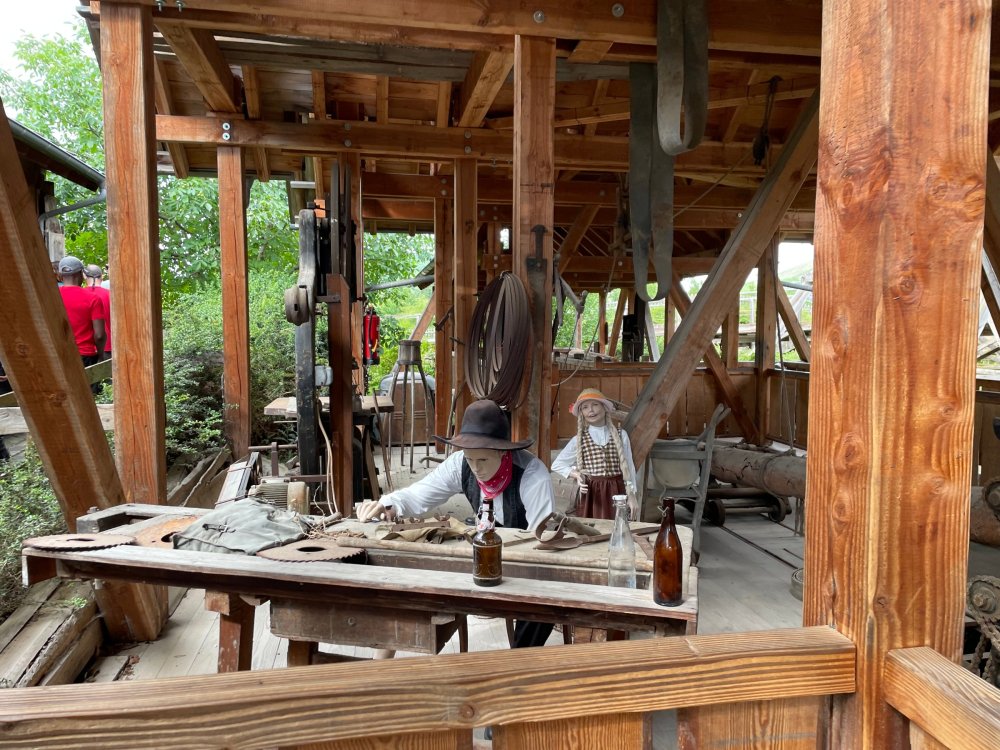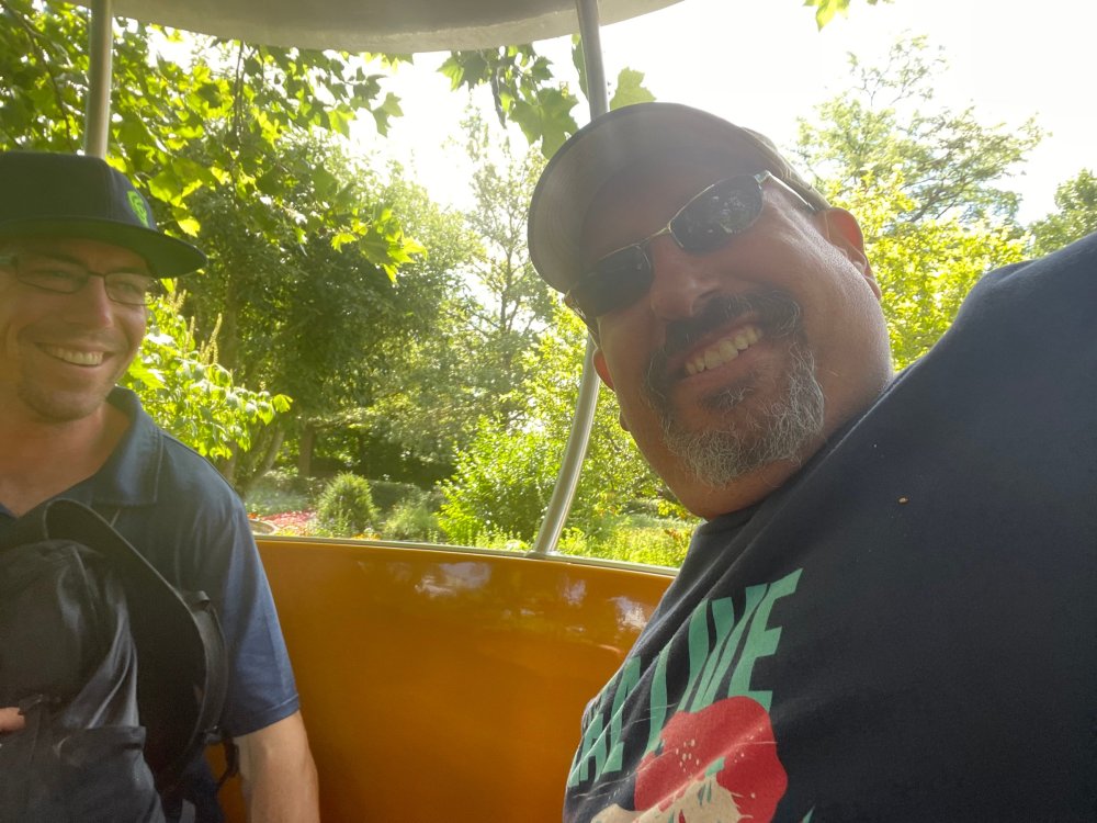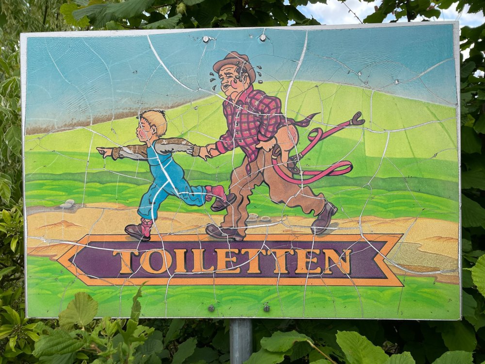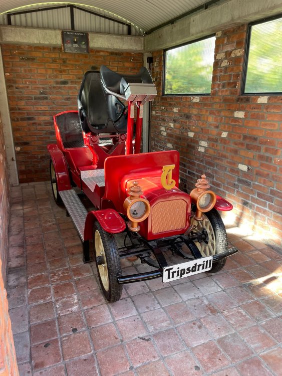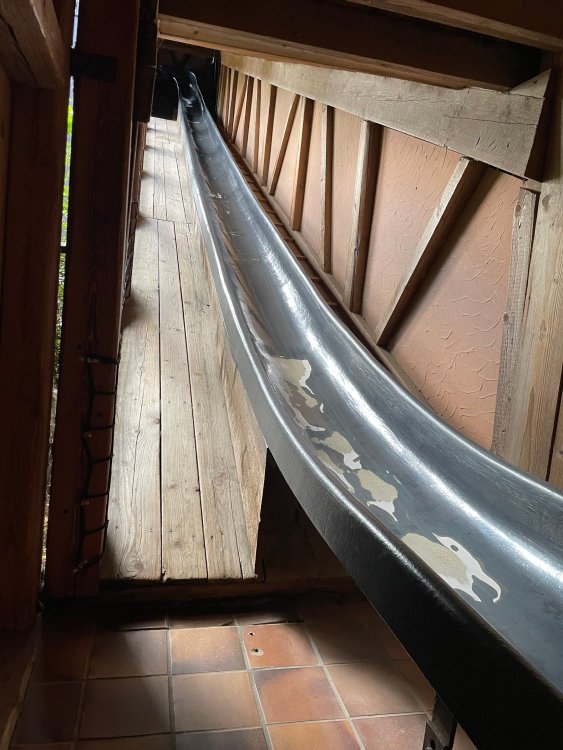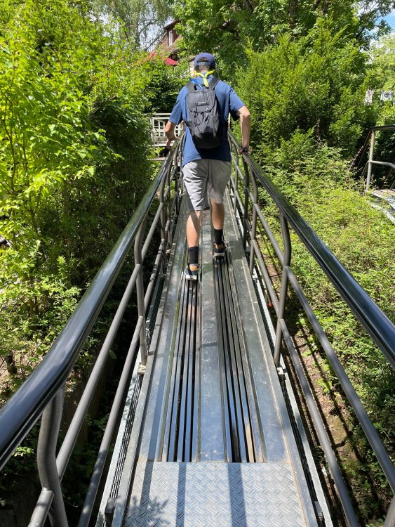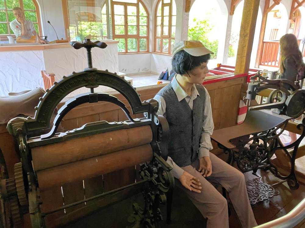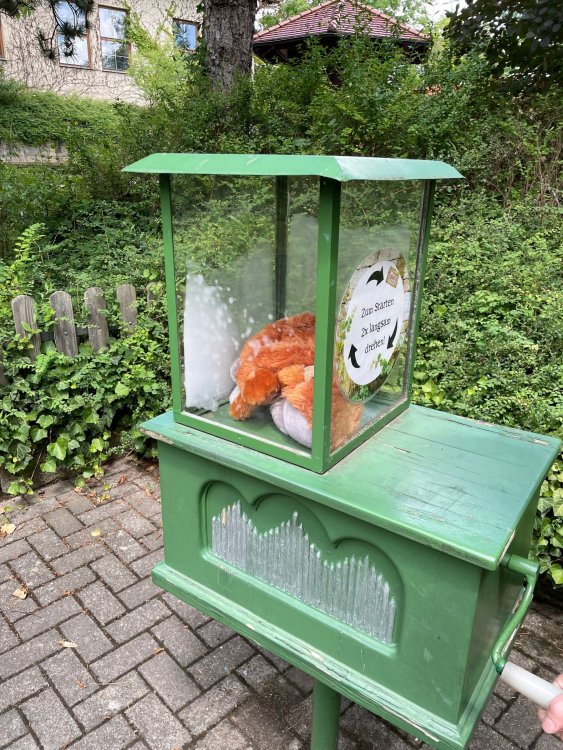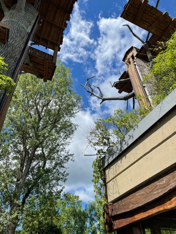 Day 4, part 1: Tripsdrill ! so this day was the earliest "up and out" of the entire trip. . .we had a very full day ahead of us: leaving Europa Park at 6am, spending a good chunk of the the day at Tripsdrill, and then heading out to Holiday Park in the afternoon for some night-time ERT on Expedition GeForce! so we were all up and in our hotel lobby bright and early. can't say that I was super perky, but I still stopped to snap a pic of the beautiful chandelier in the hotel lobby at Europa Park. and then we got the bus loaded up, and said goodbye to Rust. . and headed out towards Tripsdrill. the Countryside is very pretty. . I had to keep reminding myself we were in Germany, and not France any longer. (less windmills) and before too long. . in the middle of rolling green hills, and beautiful farmhouses, we made a turn and I spotted this sign: and moments later? this. a brand new, suspended Vekoma rollercoaster peeking thru the trees. (with the "spike" of a shuttle coaster sticking up in the middle of it???) we made it here for park open - before park open, actually. . . but shortly, the park folks met the group, and led us over to the newest ride in the park (the above coaster) This is the station for Volldampf - the shuttle coaster that has the red track. we'd come back to this in a bit, but yeah, my eyes hadnt' been playing tricks on me - the family Boomerang shuttle coaster "Volldampf" does interact quite closely with the Vekoma suspended. . . intertwining with it and making an excellent (and exciting) option for those too small (or too scared) to ride the bigger, suspended coaster. a better look at that "spike" from the shuttle coaster, poking thru the center of the new Vekoma the front of the train has a terrified sheep hanging onto it . . .LOL but we were mainly here for this. . the newest Vekoma Suspended: Hals Uber Kopf - I believe they said it opened in 2021. tho I'm not exactly sure what the theming was - this was a weird park, and I loved the hell out of it! - much of the theming here SEEMED to be set around German folk tales? So probably something to do with that? 7 guys slaying a bear? not sure how it tied to a suspended coaster with a few inversions. . but it's still a great coaster! and I love how the queue brings you thru the structure. I was a bit wary about riding what I knew was a Vekoma. . . but I absolutely adored that they have the park name/logo on every row hanging between the seats. really COMFORTABLE seats too. wheeee!!! what did I think of it? AMAZING. . and I think my favorite coaster in the park (tho there were some rides in the park that absolutely make this a must visit park). This coaster in particular? high on that "must visit" list - it has AIR TIME! Yes. . . Airtime. On a Suspended coaster! on a VEKOMA Suspended coaster. so smooth, and fun, and so many great elements. . .color me super impressed. and look at that near miss with Volldampf track right here. . . (we were the only ones in the park at the moment, so no chance right now to get the trains together) tho later in the day when we came back to ride again? did manage to get the Boomerang with people on it. speaking of Volldampf. . . after our morning ERT rides, the park had just opened, and the Park Reps walked us over to Volldampf to give TPR a ride. the seats were comfy, and the atmosphere on this is so incredible (since you're moving in and out of the other coaster). . but at the end of the day? it's a family Boomerang, that is really just kinda "meh" . . which is fine, as the Vekoma is so A+ level. since I see Brad and AJ on this train with me, this pic must be courtesy of Elissa or Robb. backwards thru the station. this park is not only full of charm (and WTF is this stuff????). . but also there were a bunch of these 3D illusion "street paintings" thruout the park. not sure if these are permanent installations, or just for a special event and they just happened to be there. . but these were so great (even if some of the illusions worked better than others) oh, I mentioned some WTF stuff in this park? how about this game: you shoot eggs out of a chicken's ass into the open mouths of the villagers (and donkeys). yeah. . . . of COURSE I loved it! the park reps were walking us back to the rear of the park - stopping along the way to ride Rasender Tausendfüßler (Raging Millipede?) the longest coaster train I've ever been on! (pics in a moment). . but that was just a quick stop along the way back to Karacho. . the park's "Smiler" clone (at least I think that's what they told me, it's a clone) EDIT: per Elissa below, it's not a Smiler clone, but it IS similar to Smiler in places it's right across the courtyard from Mamut. . . I LOVED this test seat. yes. . this is the test seat for the trains! speaking of. . these trains are incredible. . . I was glad we got some "ERT" on it, as it was one train ops . . but wow, what a train it is! I mean. . look at this! tho for me? the highlight is this animatronic guy placed in the exit queue. as the train unloads, and the riders exit? he's triggered. . . HAHAHAHAHHAHAHAHAHA. . . brilliant, right? Pic courtesy of, I think, Brad. what did I think? well, having never ridden Smiler, I had no idea what to expect. (in particular that 1st surprise in the dark after leaving the station). I liked it. due to the 1 train restriction, I think I only rode it twice, but I did enjoy it, and if that Vekoma wasn't in the park, this would easily be the #1 coaster here. Apparently this sign is infamous. . but I needed to pee anyways by this point, and it made me laugh, so I snapped a pic of it. and just LOOK at this view - out the windows over the urinal - one gets while peeing. This flat is back over here in this area as well. . I didn't realize until after I got back and saw some posts here on TPR from other parks, that this ride is just an "out of the box" one. . but I was impressed with the theming when we saw it. no time to ride it now, as we had to head over to Mammut. . but