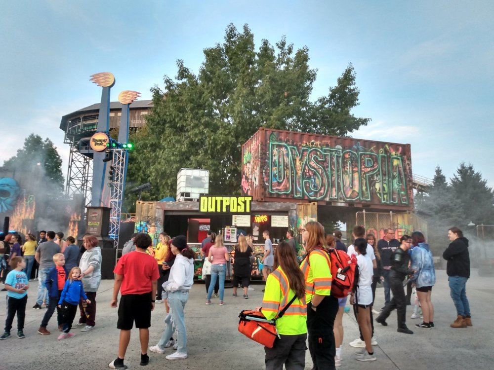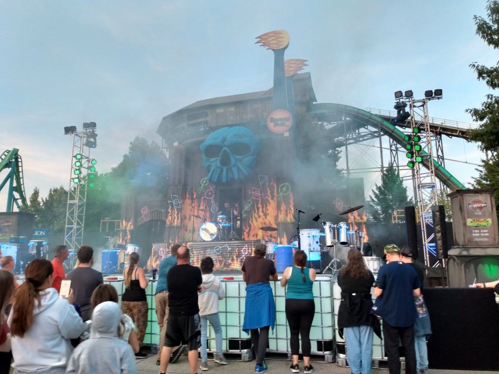 Photo TR: Haunt Friday, September 16th, My busy schedule this fall only allowed me one trip to Dorney Park this Halloween Season, and it was on the opening night of Haunt. I arrived shortly after park opening at 6:00. My first stop was the security checkpoint. As I mentioned above, Dorney Park (along with KD, KI, and probably a bunch of other CF parks) have instituted a bag restriction policy this year: Nothing bigger than 6.5" x 4.5" x 2" is permitted inside the park. Ladies, I don't need to tell you how absolutely impossible it is to find any kind of bag that is that small. This closest I could find was this, with dimensions of 6.8" by 4.5." Surely they wouldn't be measuring, and this extremely slight overage would be allowed, right? Nope, not at all. They have a wooden box that is sized to the allowed dimensions, and if the bag doesn't fit, it's not allowed. The person checking bags asked two other people for confirmation, and the decision was "You've gotta return it to your car." Seriously, if you wanted a "no bags allowed period" policy, just state that. If anyone has any suggestions of a small purse that meets these inane requirements, please let me know for future trips to CF parks. That out of the way, I made my way inside, and redeemed my season Fast Lane pass, which (as it did last year), also includes Fright Lane. Grabbed a quick ride on Talon (two train wait for row 7). I said it last year, and its more true this year: This thing needs a paint job. I double-backed up to the gift shop, to see if they sold any bags that comply with their policy - of course they don't - and grabbed a pretzel from Auntie Anne's. After a quick photo of one of the bars... ...I was back in the Hydra plaza area to catch the beginning of the Illuminightmares show, which despite its name, is really just drummers playing over some backing tracks with some dancers. Meh. At least they reused the stage from last year's opening ceremony show. I made my way down through the CarnEvil scare zone, which is a little tired by this point, but I did find the bubble machine to be a nice change from the ever-present fog machines. I hopped on Demon Drop (walk on, solo ride); I always forget how intense these first-gen Intamin towers are. Then it was time for my first haunted maze of the 2022 season: Roadside Stop and Chop. Yes, they've finally stopped calling it Cornstalkers! This maze mixes up a few different themes, to good effect. You start in the above pictured building, which is done up to represent a hillbilly rest stop on a highway, then proceed into a small section of corn maze. You then alternate between butcher-shop style areas, corn mazes, and other "redneck" themed areas, until you get the end. There was even a human petting zoo! Very well done, and a ton of actors (at least 30). I don't have any idea what this says, but thought it looked cool, so here's a picture. Tell me this isn't supposed to be Oogie Boogie from The Nightmare Before Christmas. Pretty sure that's a Disney property, CF. Thunderhawk's lights are still running in a steady-burn, as opposed to the chaser pattern of years past. My next haunted area was The Lair, which is kinda a cross between a maze and a scare zone, in that there's only one way in but there's no queue or grouping. Well done, again with a ton of actors. Towards the back of the park, I took in Trick or Treat, which seems better in terms of artistry from years passed, but still too many unadorned black hallways. In contrast to the previous mazes, there were only 10-15 actors in this one. I also grabbed a walk through Necropolis, which is a graveyard setup in the field next to the old Dinosaurs Alive walkway. Marked improvement from last year (the path was much more clearly marked). Decent amount of actors here. Yes, there is still no activity at the old Laser/Stinger site. Next up it was time for Enigma... ...which, just like last year (noticing a pattern here?) was a good concept with okay execution. Not a lot of actors in here either (only counted 7), but I guess it doesn't need them since most of the point is the disorienting visuals. Another of the bars... ...and a picture of the menu. Only what was listed is available; no custom cocktails here. I blame Pennsylvania's weird alcohol rules. After a quick ride on Possessed (1 cycle wait for row 12, of course no holding brake), I took in the Skeleton Crew show after a reccomendation from an employee who said it was "all new this year." It was not. The show is comprised of four different acts: and aerialist, a hoop-roller, a fire-twirler, and the trademark "guys falling off the building and bouncing." Good enough I guess, but not anything I hadn't seen before. The pirate area is very well done though. As is the Hollow, with all of the jack-o-lanterns. I guess maybe that wasn't Oogie Boogie before, since they had a few more of those things set up elsewhere without trademarked characters. The next maze up was Tourist Trap, which by this time (around 8:45), the mazes had started to develop some lines. I found this pretty well done, the maze was very long with a lot of actors and great artistry. That said, this house has been around for a long, long time, and it might be time for a re-theme. Next up was Blood on the Bayou, which from the barker and beads all over the front, you might think had been modified to be a Mardi Gras theme.... ...but alas, was pretty much unaffected from last year. Notably, this one had a 7 minute wait with Fright Lane due to the merge point. This one was very good, as it usually is, with over 40 actors and a ton of different well done scenes. Blackout, the pitch-black maze, was not open tonight, so that about wrapped up my activities. I took a walk through the Dystopia scare zone, which I had thought would be better at night than it was... ...and grabbed some pictures of the Dorney Park Haunt staples... ...and made my way out and started my drive home. Overall, I'm glad I started my Halloween-in-parks seas