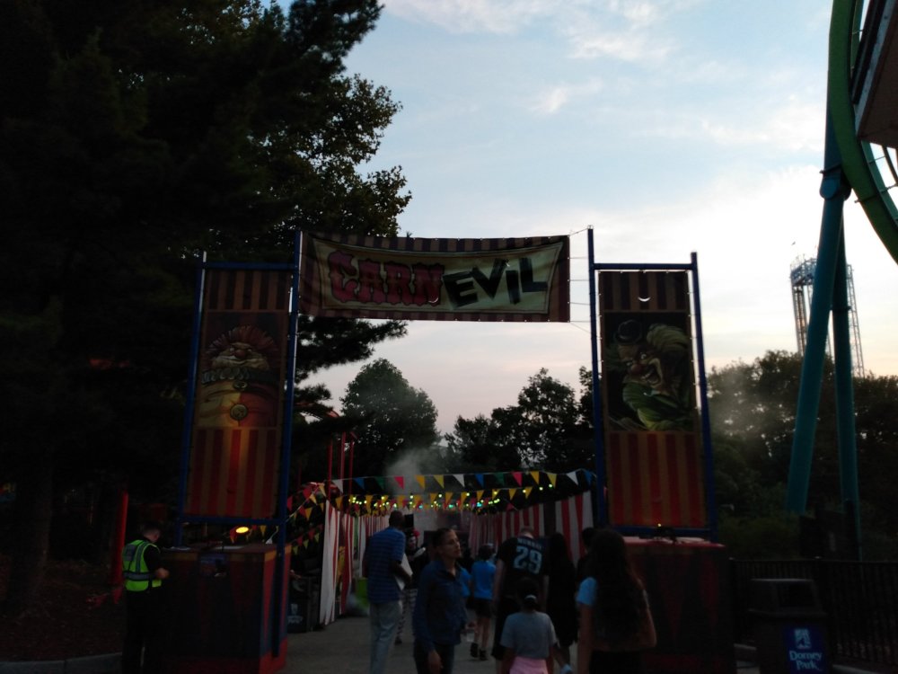 Day 2: Sunday, October 25th. I was back at the park 15 minutes prior to the opening of the gates on Sunday, to be greeted with quite the crowd. Thankfully, this was not indicative of the crowd levels throughout the day, which stayed quite light. To kill time prior to entry, I took a walk over to the designated smoking zone and snapped the same picture that everyone takes of Dominator: At opening, I made my way inside the park, grabbed my FL+ and Premium All Day Dining writstbands, and snapped this picture of the tower, with both demon eyes lit up (this will be important later). Walking down International Street, I took a quick picture of one of many wooden jack-o-lanterns that lined the fountain. First on the agenda for today was Dominator, open during the standard half-hour not-early-entry period. A one-train wait for back row, left wing. Notably not as rattle-y as I recall from the past. I tried to get another shot of the train at the crest of the loop, and missed it once again. At the full park opening at noon, I headed over to Woodstock Express to find it closed with some maintenance workers fiddling with the ride, so I instead made my way down to the Outpost Cafe, one of the new restaurants for this year. I opted for the Citrus Fried Chicken with sides of mac & cheese and fry bread... ...which was not only a much bigger portion than I imagined (I couldn't even finish all of the chicken), but was also delicious. For a normal guest price of $19, I guess it better be haha. Very impressive, KD. I then took advantage of the non-existent lines and hopped on Reptilian again, twice! One-train waits for both the front row and back row. Man, this ride is so good. Poor Volcano queue/station building... Hey, look at that, the scrambler has lights now! Sadly, later in the night I would learn that they're not even LEDs :(. The only other thing left to remind us of what once was... Next up was another ride on I305. A 13-minute-wait for front row, the best place to ride this and any other coaster that's all about speed. Grabbed a few pictures of the Site X scare zone, in the day time: Some more of the decorations surrounding the fountain. Boo! Change this already! Am I the only one who remembers when the line for Days of Thunder would get so long, they needed to use this bridge to route the queue to the overflow area on the other side of the pathway? The entrance to No Vacancy: Condemned. A better picture of the giant skull. Shenandoah Lumber Company log flume was running today! It would close with the arrival of Haunt later on. A better shot of the horse-and-carriage. Unlike last year, when Grizzly ran during the day but closed at Haunt, this year it appears to be closed all together. Preparations for Titan track or RMC? The world may never know. Though in actuality, we all know the answer is a decided "no." Entrance to Grimm Woods... ..and one of the spooky trees out front. I always loved this feature, though they didn't do any kind of Halloween decoration on it this year. Riff Raff stage in daylight. I'm not sure if I preferred this to the "on-top-of-shipping-containers" of last year. Next on the rides agenda was... I've never noticed this ACE Landmark plaque before, somehow. Holy crap, it was actually racing! I also never noticed they returned the paint scheme of old, which was obviously done a few years ago. ..,nor have I noticed the non-body-color covers for the restraint locks. Anyway, this was a train-and-a-half wait for the left side (which I hadn't seen open in quite a while). Great ride, very smooth, and we won by like a whole train length (the lift synchronizer was working). Enjoy a fun video using my proper camera and clamp-having tripod. M4H02952_Trim.mp4 Closed for wind. Entrance to Blood on the Bayou, in daylight. 90 minutes had passed since my last meal, so it was time for another! I stopped in the Jukebox Diner and grabbed a double-cheeseburger with fries. Burger was decent (not as dry as they usually are at this location), but the fries were great and seasoned with something. Next up was my #2 at this park, Twisted Timbers! About to do its thing... ...And there it goes... Two-train-wait for the front row (I told you crowds stayed light!), and awesome as always. I'm warming to the stupid locker system, especially now that I realized I don't have to remove everything out of my pockets, only the big metal stuff. I was playing around with the clamp tripod again, so enjoy M4H02963_Trim.mp4 The Ferris wheel doesn't look as depressing in the day. Now, I'm not a huge carousel connoisseur like @bert425is, but I did take some time to appreciate the one here at Kings Dominion. Some history: Some details: They even have an old-style ticket booth! Daytime shot of the outside of Trick or Treat. The always-cool signs for Candy Apple Grove. Sorry, Kings Island, I get the history behind Coney Mall, but this is a much nicer rendition of a classic park midway. Following are a whole bunch of pictures of the Cleaver Brothers Carnival scare zone, including every booth and decoration. Jack is back! As is the bar truck... But Drop Zone is closed for the year. I grabbed a quick walk-on ride on Bad Apple (their Troika) and continued down Candy Apple Grove. I get it that the Pizza Parlor and Dodgem are park-originals, but they could use a little love. As could the Wave Swinger, which was my next ride. One-cycle wait for what's always a nice relaxing way to catch some breeze. Enjoy yet another video. M4H03009_Trim.mp4 Everyone loves the singing mushrooms! Even the unattended brat that knocked over my camera mid-filming. Seriously folks, if you chose to reproduce, keep your kids on a tether (literally if you have to). M4H03013_Trim.mp4 Snoopy looking festive as always. Some shots of the Uprising scare zone. And the awesome flower clock. Spiders in the light. A map posted at the entrance to Jungle X-Pedition. Didn't see any hints for the Volanco-site's future, can you? Flight of Fear was next. Part of me pref