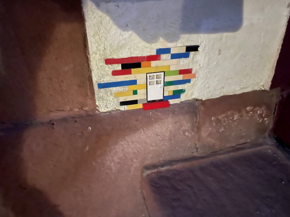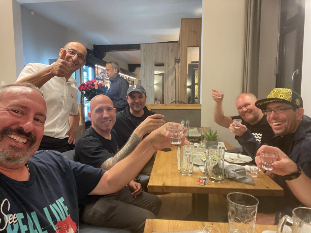 Day 4, part III - we shortly arrived at the Hotel Löwengarten in Speyer, Germany and got checked in and settled into the room. the view from our room. . . the rain had stopped completely. . (it had been drizzling when we got to the hotel), so a group of folks was going out to explore the town's nightlife (a couple of groups actually). . tho one group of folks seemed more interested in the local pub rather than just food I synced up with mostly the folks I had hung around with all day, plus a couple of others, and we set out to wander the streets and find someplace for dinner. a bunch of pics while we wandered around this beautiful German town looking for a place to eat: really loved the architecture around here! ooo. . a central square. This looks busy, and promising. straight ahead was a place that seemed to be a local brewhouse that also had food. we headed that way to take a look at what was offered, and see what kind of food. the menu looked really good, so we decided to try it out. The owner (nor staff) spoke very little English, but he was thrilled to have a group come in on what was a rainy evening and I'm sure kept folks in. the group of us tonight. clockwise Ltr: Ian, Jon, James, AJ, Ryan, Andrew, and myself and we were being blessed (I think?) by this guy in the alcove over our tables luckily Ryan spoke enough German to get us seated, and to translate what some of the offerings were (some of us also used google translate on the menu) While most went for Beer -- I mean, we were in Germany - I'm not a big Beer fan, so went for a Riesling. the owner asked me if I wanted small or large, so I said large. yup. .this is what came out. . a TUMBLER of Riesling. and yes, I was absolutely feeling it by the end of the meal. .LOL Cheers!!! I had munched at Tripsdrill, and at Holiday Park, and wasn't super hungry, so I did the Octopus appetizer. it was absolutely amazing, one of the best things I had on the trip, and grilled just perfect! James had, I think, one of the Schnitzel varieties (as did several others) tho I think Ian had a pita ? (in Germany?) but oh yes, we saved room for desert. . I mean. . . . I had the Apfelstrudel. . . it was SO good. and so rich, I recall sharing it with folks. the owner came over after our meal and brought us several rounds of shots. they were licorice flavor (which i *hate*). . but since he brought them as a gift, I went ahead and drank it. . .then he brought over another round for the table. they were gifts, as he was happy to have tourist customers, so we sucked it up and drank them (tho those that don't drink passed along the shots to others, since it's rude NOT to take them). i think the 1st one might have been Underberg, since that's a liquor that promotes digestion . . yes, I looked up "German liquor that tastes like licorice". . . I was most definitely feeling my tumbler of wine (and the shots) as we made our way back to the hotel - as it was finally getting dark. (not many pics, as they came out blurry. . gee . . I wonder why????? ) but I made sure to take a pic of this tiny fairy door - near someone's normal sized front door - as we passed by. and tons of cigarette machines. . on almost every corner. the amount of stickers on it was very punk tho, and pleased me finally getting up to the room, and ready to crash after a long day, I finally remembered to snap a pic of the room: Decent size, and comfy beds. . we were only here overnight tho, as we checked out in the morning prior to heading back to Holiday Park to enjoy the full park. decent size bathroom and enough space to spread out - even if just overnight. drunk bert, with nose strip on to prevent snoring (James said it doesn't work. . LOL. . but hey, I was tipsy), sending a good night pic home to Nick () and then turned in for the night. it had been a great day, and we still had so much of the trip left ahead of us!4 points