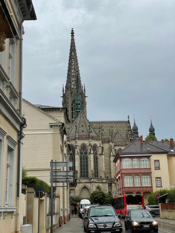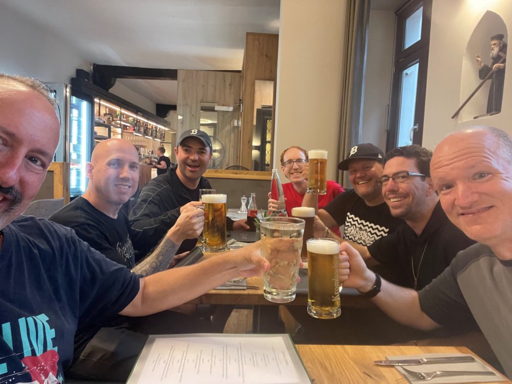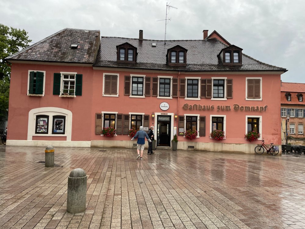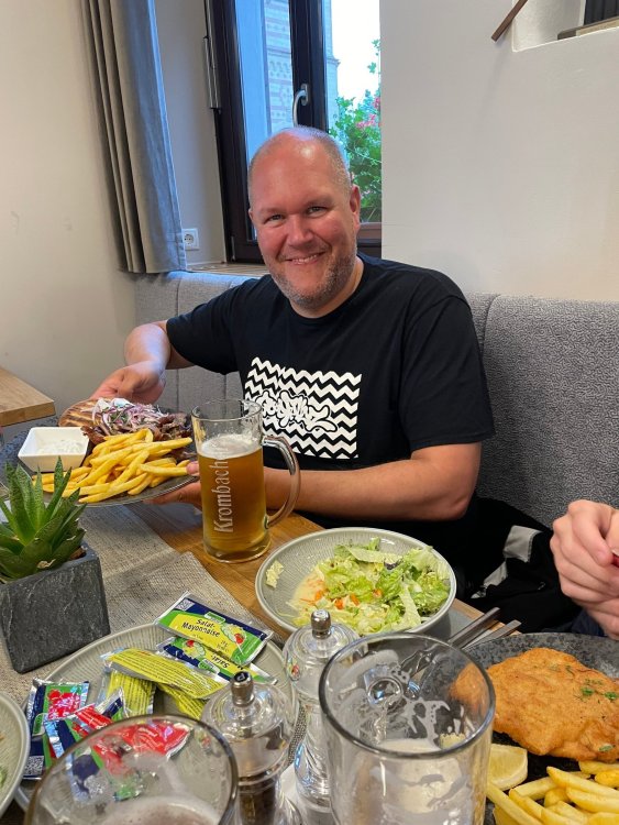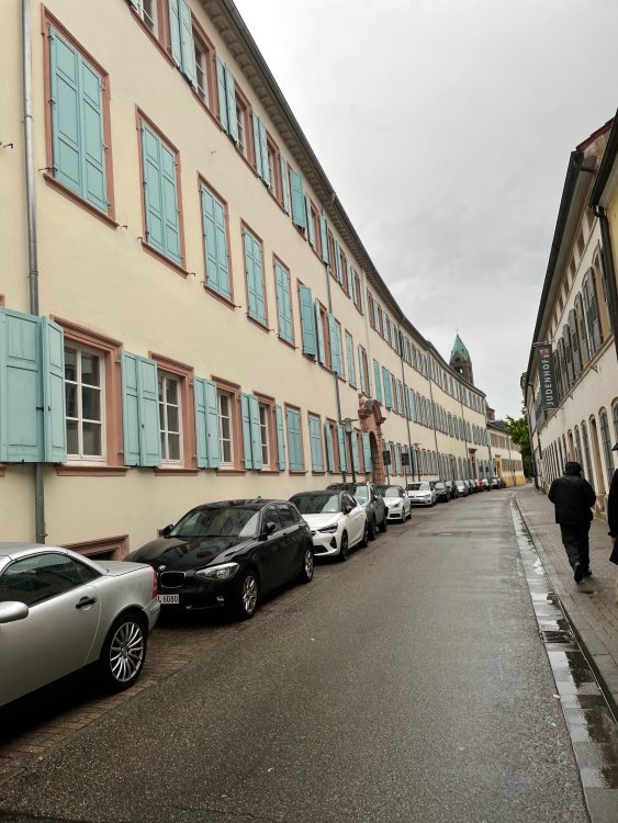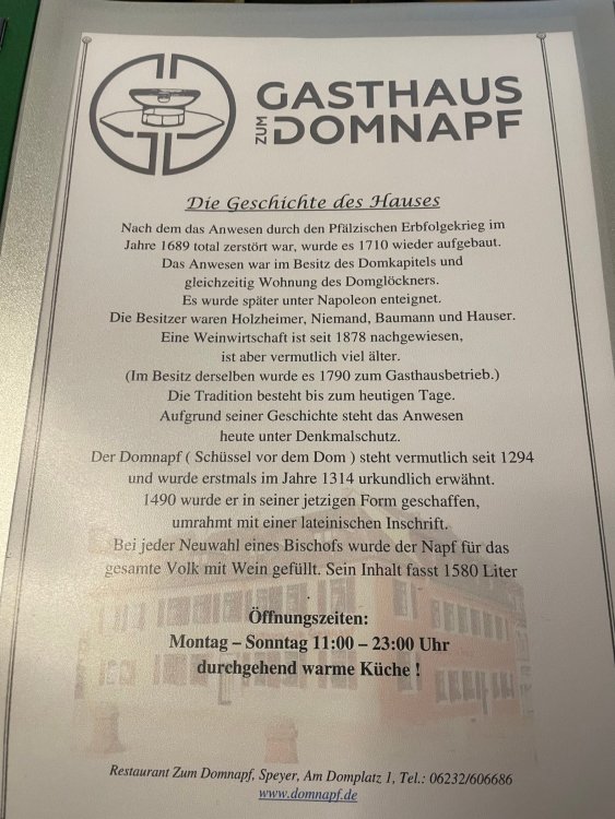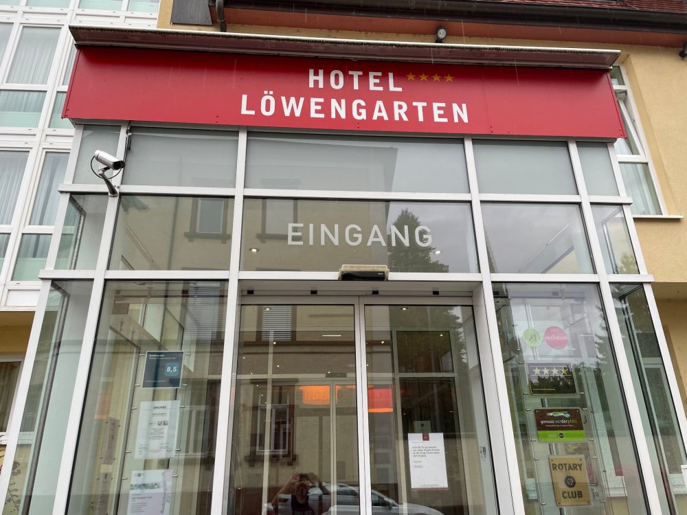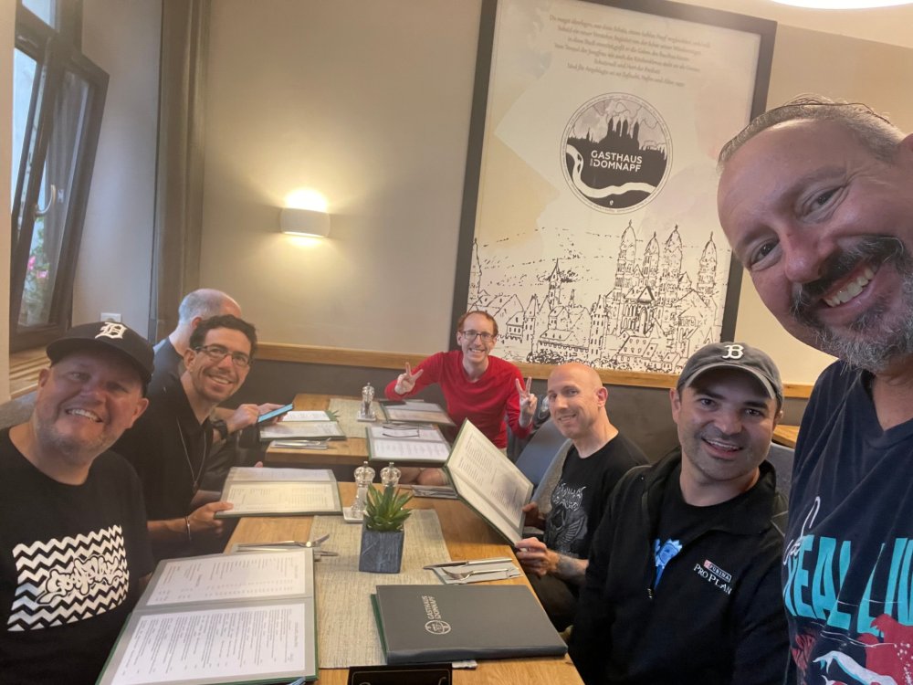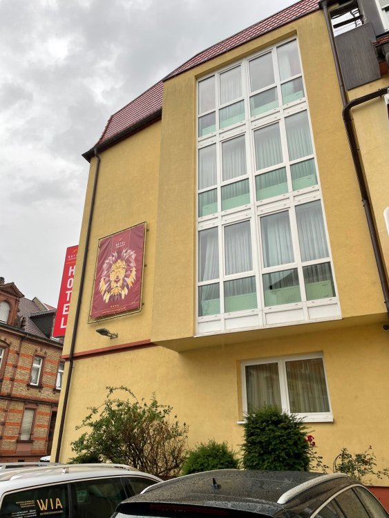 Day 4, part III - we shortly arrived at the Hotel Löwengarten in Speyer, Germany and got checked in and settled into the room. the view from our room. . . the rain had stopped completely. . (it had been drizzling when we got to the hotel), so a group of folks was going out to explore the town's nightlife (a couple of groups actually). . tho one group of folks seemed more interested in the local pub rather than just food I synced up with mostly the folks I had hung around with all day, plus a couple of others, and we set out to wander the streets and find someplace for dinner. a bunch of pics while we wandered around this beautiful German town looking for a place to eat: really loved the architecture around here! ooo. . a central square. This looks busy, and promising. straight ahead was a place that seemed to be a local brewhouse that also had food. we headed that way to take a look at what was offered, and see what kind of food. the menu looked really good, so we decided to try it out. The owner (nor staff) spoke very little English, but he was thrilled to have a group come in on what was a rainy evening and I'm sure kept folks in. the group of us tonight. clockwise Ltr: Ian, Jon, James, AJ, Ryan, Andrew, and myself and we were being blessed (I think?) by this guy in the alcove over our tables luckily Ryan spoke enough German to get us seated, and to translate what some of the offerings were (some of us also used google translate on the menu) While most went for Beer -- I mean, we were in Germany - I'm not a big Beer fan, so went for a Riesling. the owner asked me if I wanted small or large, so I said large. yup. .this is what came out. . a TUMBLER of Riesling. and yes, I was absolutely feeling it by the end of the meal. .LOL Cheers!!! I had munched at Tripsdrill, and at Holiday Park, and wasn't super hungry, so I did the Octopus appetizer. it was absolutely amazing, one of the best things I had on the trip, and grilled just perfect! James had, I think, one of the Schnitzel varieties (as did several others) tho I think Ian had a pita ? (in Germany?) but oh yes, we saved room for desert. . I mean. . . . I had the Apfelstrudel. . . it was SO good. and so rich, I recall sharing it with folks. the owner came over after our meal and brought us several rounds of shots. they were licorice flavor (which i *hate*). . but since he brought them as a gift, I went ahead and drank it. . .then he brought over another round for the table. they were gifts, as he was happy to have tourist customers, so we sucked it up and drank them (tho those that don't drink passed along the shots to others, since it's rude NOT to take them). i think the 1st one might have been Underberg, since that's a liquor that promotes digestion . . yes, I looked up "German liquor that tastes like licorice". . . I was most definitely feeling my tumbler of wine (and the shots) as we made our way back to the hotel - as it was finally getting dark. (not many pics, as they came out blurry. . gee . . I wonder why????? ) but I made sure to take a pic of this tiny fairy door - near someone's normal sized front door - as we passed by. and tons of cigarette machines. . on almost every corner. the amount of stickers on it was very punk tho, and pleased me finally getting up to the room, and ready to crash after a long day, I finally remembered to snap a pic of the room: Decent size, and comfy beds. . we were only here overnight tho, as we checked out in the morning prior to heading back to Holiday Park to enjoy the full park. decent size bathroom and enough space to spread out - even if just overnight. drunk bert, with nose strip on to prevent snoring (James said it doesn't work. . LOL. . but hey, I was tipsy), sending a good night pic home to Nick () and then turned in for the night. it had been a great day, and we still had so much of the trip left ahead of us!4 points