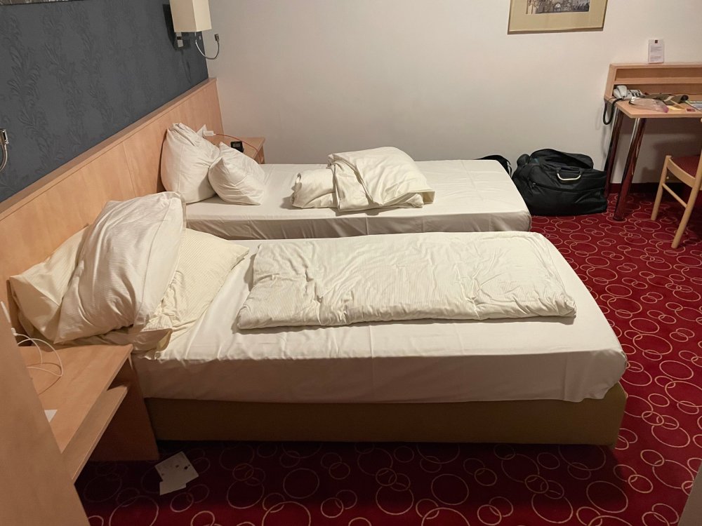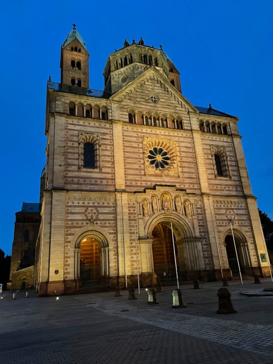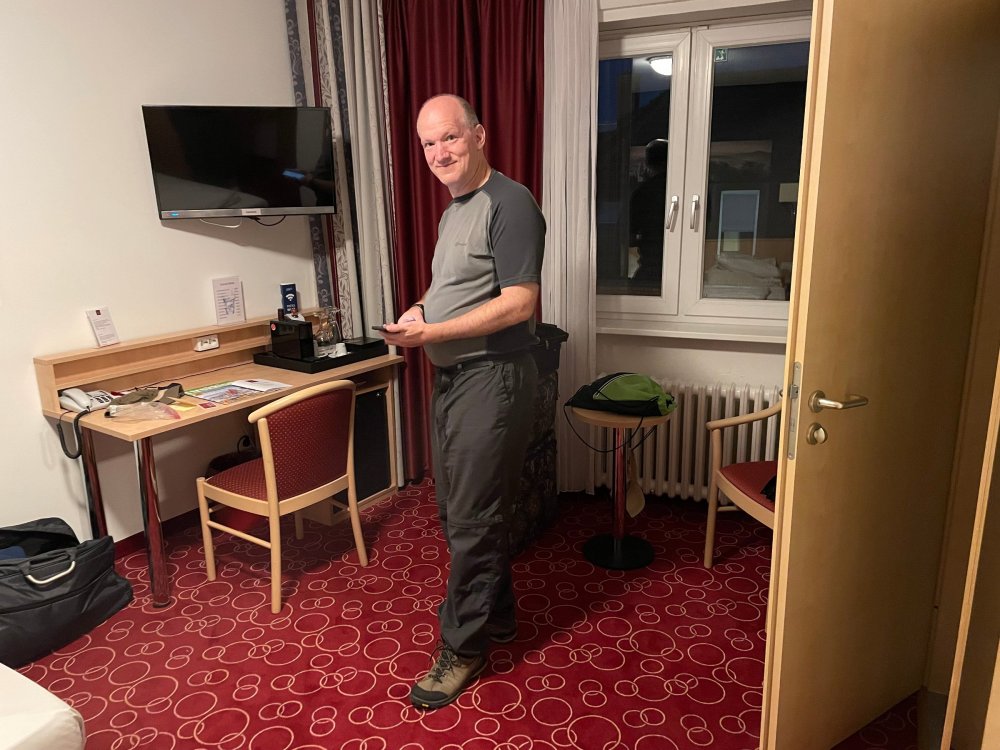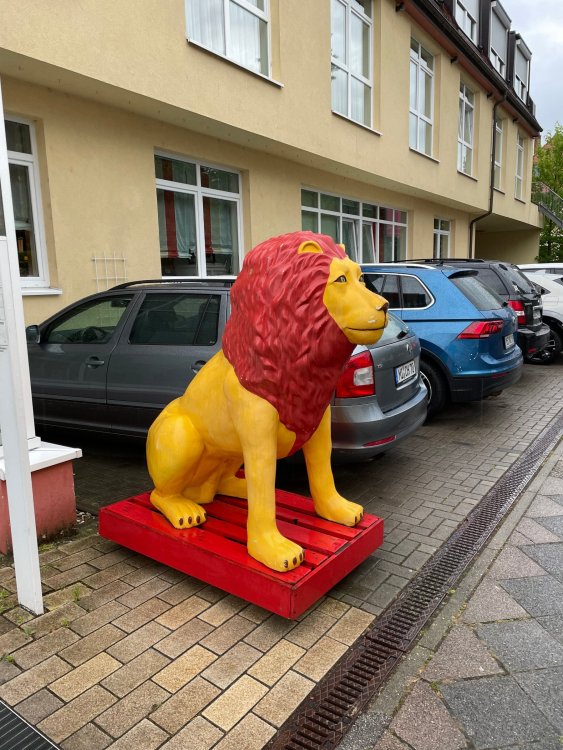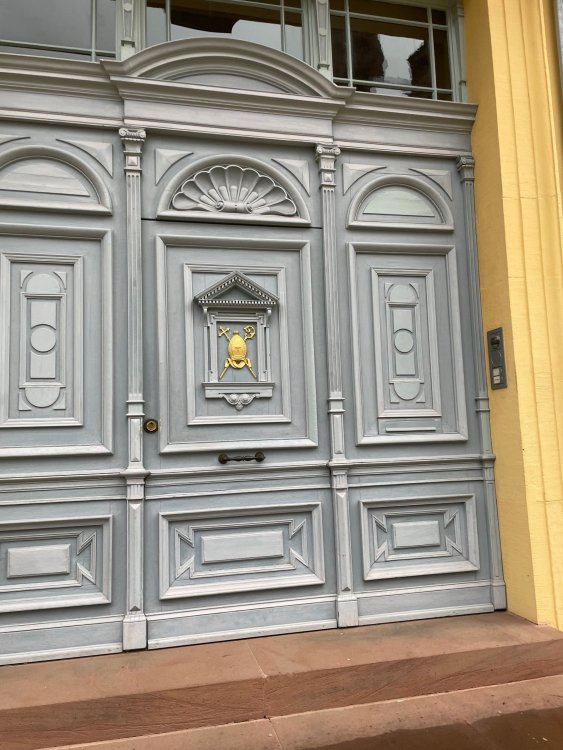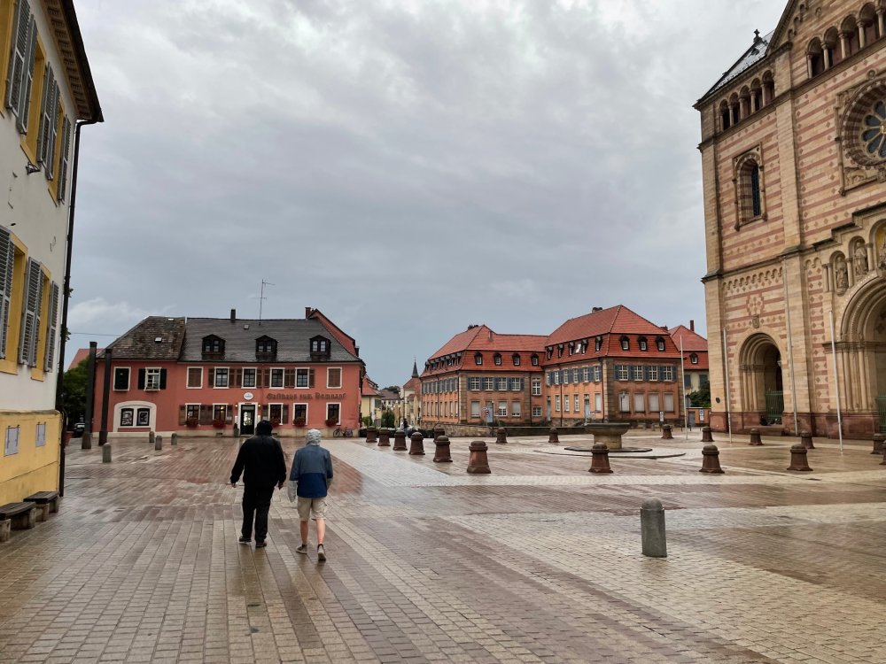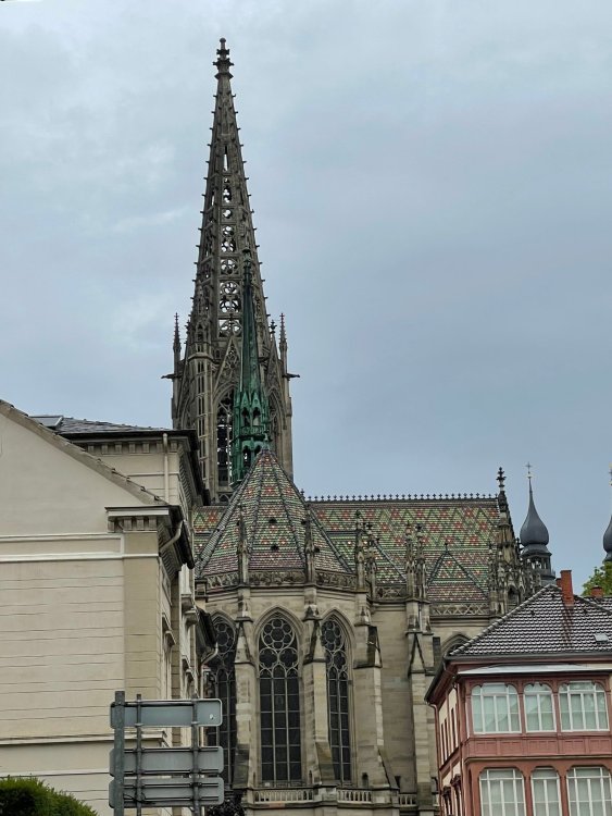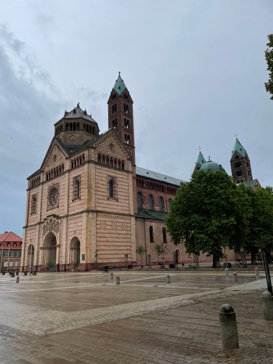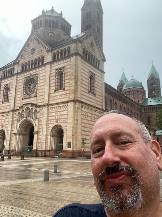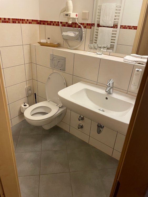 Day 4, part III - we shortly arrived at the Hotel Löwengarten in Speyer, Germany and got checked in and settled into the room. the view from our room. . . the rain had stopped completely. . (it had been drizzling when we got to the hotel), so a group of folks was going out to explore the town's nightlife (a couple of groups actually). . tho one group of folks seemed more interested in the local pub rather than just food I synced up with mostly the folks I had hung around with all day, plus a couple of others, and we set out to wander the streets and find someplace for dinner. a bunch of pics while we wandered around this beautiful German town looking for a place to eat: really loved the architecture around here! ooo. . a central square. This looks busy, and promising. straight ahead was a place that seemed to be a local brewhouse that also had food. we headed that way to take a look at what was offered, and see what kind of food. the menu looked really good, so we decided to try it out. The owner (nor staff) spoke very little English, but he was thrilled to have a group come in on what was a rainy evening and I'm sure kept folks in. the group of us tonight. clockwise Ltr: Ian, Jon, James, AJ, Ryan, Andrew, and myself and we were being blessed (I think?) by this guy in the alcove over our tables luckily Ryan spoke enough German to get us seated, and to translate what some of the offerings were (some of us also used google translate on the menu) While most went for Beer -- I mean, we were in Germany - I'm not a big Beer fan, so went for a Riesling. the owner asked me if I wanted small or large, so I said large. yup. .this is what came out. . a TUMBLER of Riesling. and yes, I was absolutely feeling it by the end of the meal. .LOL Cheers!!! I had munched at Tripsdrill, and at Holiday Park, and wasn't super hungry, so I did the Octopus appetizer. it was absolutely amazing, one of the best things I had on the trip, and grilled just perfect! James had, I think, one of the Schnitzel varieties (as did several others) tho I think Ian had a pita ? (in Germany?) but oh yes, we saved room for desert. . I mean. . . . I had the Apfelstrudel. . . it was SO good. and so rich, I recall sharing it with folks. the owner came over after our meal and brought us several rounds of shots. they were licorice flavor (which i *hate*). . but since he brought them as a gift, I went ahead and drank it. . .then he brought over another round for the table. they were gifts, as he was happy to have tourist customers, so we sucked it up and drank them (tho those that don't drink passed along the shots to others, since it's rude NOT to take them). i think the 1st one might have been Underberg, since that's a liquor that promotes digestion . . yes, I looked up "German liquor that tastes like licorice". . . I was most definitely feeling my tumbler of wine (and the shots) as we made our way back to the hotel - as it was finally getting dark. (not many pics, as they came out blurry. . gee . . I wonder why????? ) but I made sure to take a pic of this tiny fairy door - near someone's normal sized front door - as we passed by. and tons of cigarette machines. . on almost every corner. the amount of stickers on it was very punk tho, and pleased me finally getting up to the room, and ready to crash after a long day, I finally remembered to snap a pic of the room: Decent size, and comfy beds. . we were only here overnight tho, as we checked out in the morning prior to heading back to Holiday Park to enjoy the full park. decent size bathroom and enough space to spread out - even if just overnight. drunk bert, with nose strip on to prevent snoring (James said it doesn't work. . LOL. . but hey, I was tipsy), sending a good night pic home to Nick () and then turned in for the night. it had been a great day, and we still had so much of the trip left ahead of us!4 points
