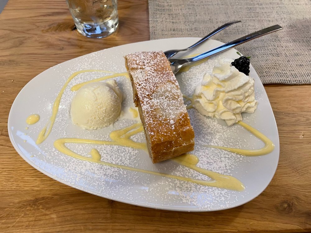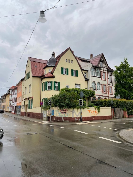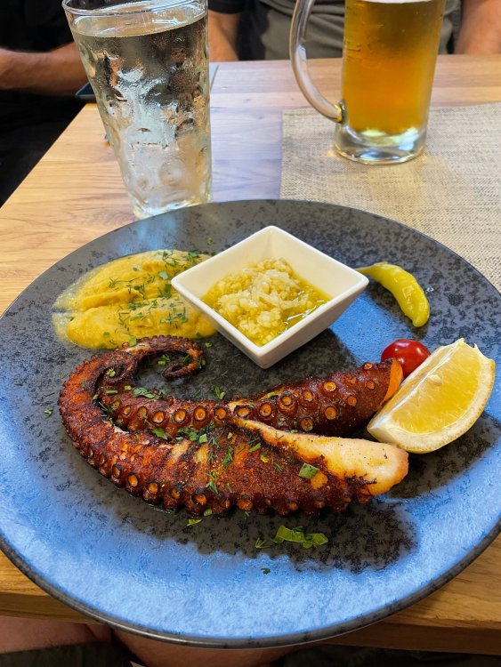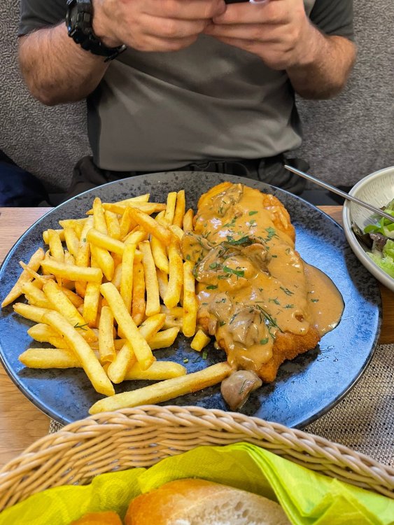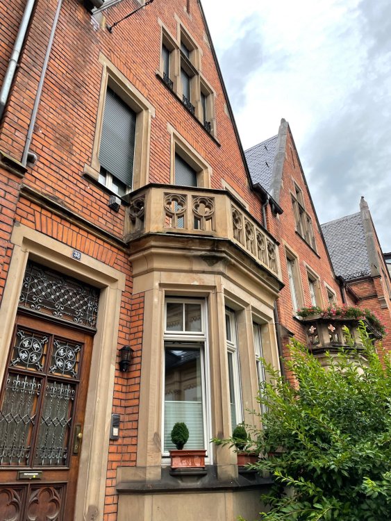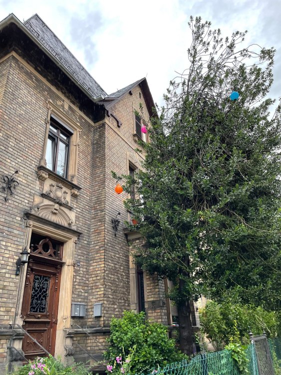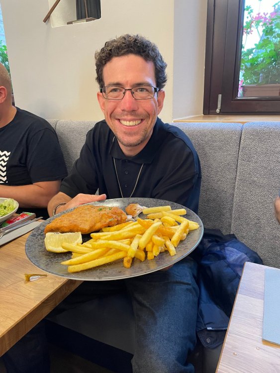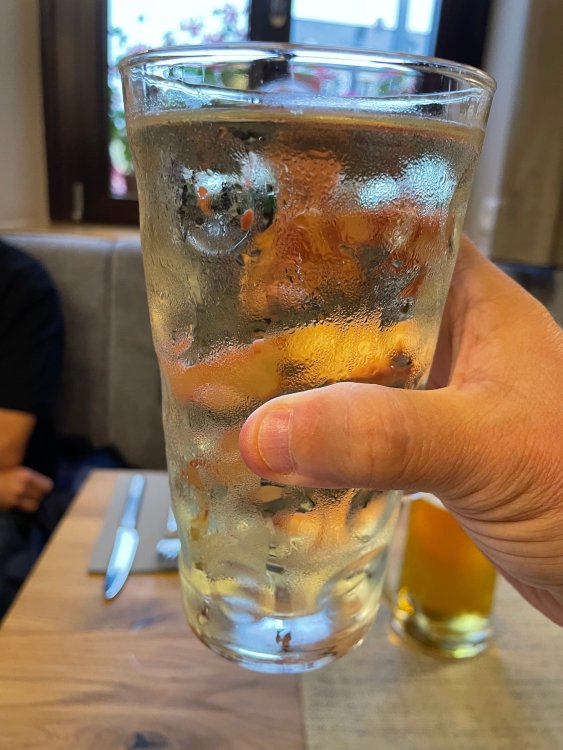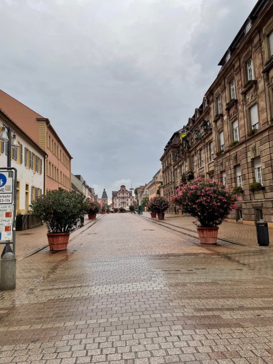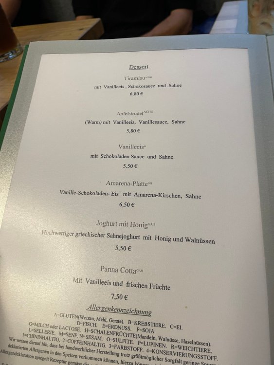 Day 4, part III - we shortly arrived at the Hotel Löwengarten in Speyer, Germany and got checked in and settled into the room. the view from our room. . . the rain had stopped completely. . (it had been drizzling when we got to the hotel), so a group of folks was going out to explore the town's nightlife (a couple of groups actually). . tho one group of folks seemed more interested in the local pub rather than just food I synced up with mostly the folks I had hung around with all day, plus a couple of others, and we set out to wander the streets and find someplace for dinner. a bunch of pics while we wandered around this beautiful German town looking for a place to eat: really loved the architecture around here! ooo. . a central square. This looks busy, and promising. straight ahead was a place that seemed to be a local brewhouse that also had food. we headed that way to take a look at what was offered, and see what kind of food. the menu looked really good, so we decided to try it out. The owner (nor staff) spoke very little English, but he was thrilled to have a group come in on what was a rainy evening and I'm sure kept folks in. the group of us tonight. clockwise Ltr: Ian, Jon, James, AJ, Ryan, Andrew, and myself and we were being blessed (I think?) by this guy in the alcove over our tables luckily Ryan spoke enough German to get us seated, and to translate what some of the offerings were (some of us also used google translate on the menu) While most went for Beer -- I mean, we were in Germany - I'm not a big Beer fan, so went for a Riesling. the owner asked me if I wanted small or large, so I said large. yup. .this is what came out. . a TUMBLER of Riesling. and yes, I was absolutely feeling it by the end of the meal. .LOL Cheers!!! I had munched at Tripsdrill, and at Holiday Park, and wasn't super hungry, so I did the Octopus appetizer. it was absolutely amazing, one of the best things I had on the trip, and grilled just perfect! James had, I think, one of the Schnitzel varieties (as did several others) tho I think Ian had a pita ? (in Germany?) but oh yes, we saved room for desert. . I mean. . . . I had the Apfelstrudel. . . it was SO good. and so rich, I recall sharing it with folks. the owner came over after our meal and brought us several rounds of shots. they were licorice flavor (which i *hate*). . but since he brought them as a gift, I went ahead and drank it. . .then he brought over another round for the table. they were gifts, as he was happy to have tourist customers, so we sucked it up and drank them (tho those that don't drink passed along the shots to others, since it's rude NOT to take them). i think the 1st one might have been Underberg, since that's a liquor that promotes digestion . . yes, I looked up "German liquor that tastes like licorice". . . I was most definitely feeling my tumbler of wine (and the shots) as we made our way back to the hotel - as it was finally getting dark. (not many pics, as they came out blurry. . gee . . I wonder why????? ) but I made sure to take a pic of this tiny fairy door - near someone's normal sized front door - as we passed by. and tons of cigarette machines. . on almost every corner. the amount of stickers on it was very punk tho, and pleased me finally getting up to the room, and ready to crash after a long day, I finally remembered to snap a pic of the room: Decent size, and comfy beds. . we were only here overnight tho, as we checked out in the morning prior to heading back to Holiday Park to enjoy the full park. decent size bathroom and enough space to spread out - even if just overnight. drunk bert, with nose strip on to prevent snoring (James said it doesn't work. . LOL. . but hey, I was tipsy), sending a good night pic home to Nick () and then turned in for the night. it had been a great day, and we still had so much of the trip left ahead of us!4 points
