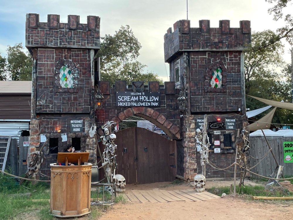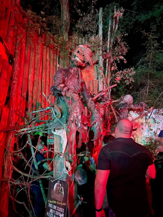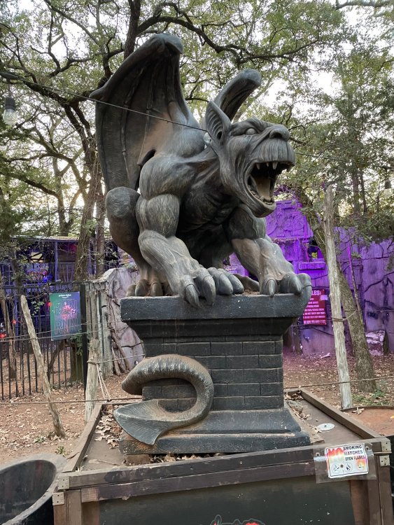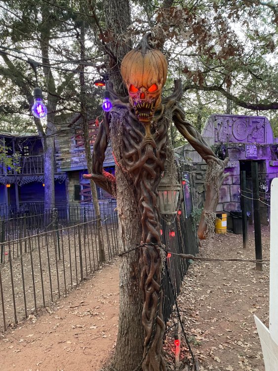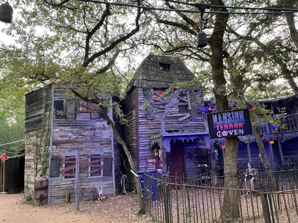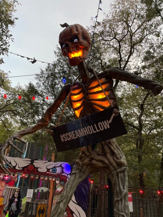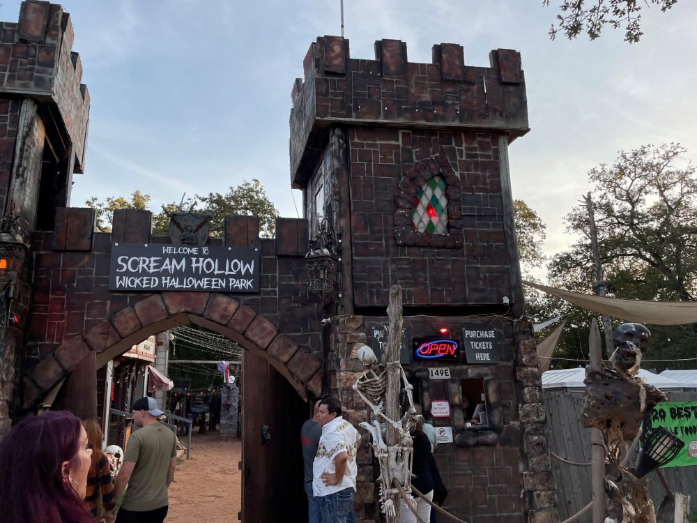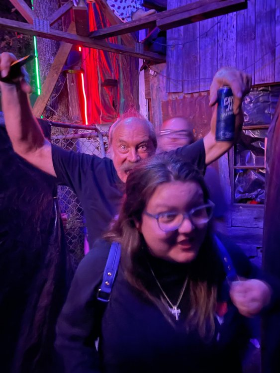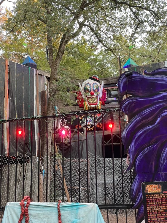 I know I'm in the middle of my massive Trip Report on the trip I took to Europe hitting parks and having fun with TPR. . . but interrupting that to gush about this fantastic thing I did last night. and hey, 'tis the season, right? my friends have been really trying to keep me pretty occupied, so I don't go under due to the grief of losing my spouse back in July. With Halloween quickly approaching, they've been booking me up every Weekend - with last weekend at FrightFest at SFFT, and two weeks before that Howl-O-Scream at SWSA. although I've lived in Austin for well over 35 years, I still have yet to do some of the "local" attractions that have popped up over the last couple of decades. (tho I'm really looking forward to COTALand opening up, as I'm sure I'll do that a LOT once they get more out there - tho I did go to the track/COTA occasionally with my late spouse for races and/or concerts). what made me think of COTA (Circuit of the Americas)? Well, it's F1 weekend here in Austin, but we also passed it last night on our way out to Scream Hollow. I'd seen Scream Hollow mentioned on the Travel Chanel, but wasn't really sure what it was, other than a "spooky" attraction. A haunted house for Halloween. Well, I was certainly mistaken. Located ~35 minutes from Austin, between Bastrop & Smithville - down a long, pretty deserted looking road (that passes right in front of "the Gas Station". . . where they filmed scenes from the original Texas Chainsaw Massacre - and has been turned in to Slaughter BBQ & gift shop - so of course we stopped in there too on the way. . .LOL) is what's basically a permanent "Ren-fair" installation that's basically a theme park dedicated to all things "scare the shit out of you" the official tag for the place is "Wicked Halloween Park" - but I think my description better sums it up. The owners live in a big castle (spookily lit at night) that overlooks the property. And it's quite a large property - encompassing a Halloween Museum, several food stands, drink stands, gift shop, stage for live music, 4 very large houses, and a common area that's decked out in scary decorations & lights - not to mention the scare actors roaming freely among the patrons, very often scaring the crap out of them by sneaking up behind. tho I called it a "theme park" the only "ride" they have is the Haunted Hayride - which is groups of 20 or so pulled behind a tractor thru the woods as creatures come at you from all sides. It's brilliant, and had the longest line of the night (at about a 30 minute wait, and was still worth it). . . but damn this place is super immersive. You aren't allowed to take pictures or film inside the houses, and although I did get permission from the owner's Son, when i was introduced to him by my friend Amy (who is the one who really convinced me to go last night), I only took a few in the houses. Because really. . you need to experience them yourself. the Four houses are all really well done, with tons of long dark hallways, really impressive "gotchas" sprinkled thruout, my overall impression? Food: what we had was really good - tho they were out of a few things, and as it got later in the evening, and the place hit capacity (think the Manager told me it was 3000), many food items on the menus were sold out. Oh, we still found stuff to eat (the voodoo fries - french fries covered in Queso, pico, and brisket were fantastic, and are a great "sponge" to sop up an alcohol drank). And the Pizza seemed really popular and was still selling right up until closing time. the prices are super reasonable too. But if you are gonna eat, eat early if possible - maybe the 1st hour they open, but before the houses really open. Drinks: well below "park" prices, with water and soda only $2, and most drinks/beer in the $6 range. I didn't notice any mixed drinks - but there are several bars, and it wouldn't surprise me if at least one of them was pouring by hand. . . tho vast majority of the crowd was drinking Beer, or canned Margaritas (surprisingly quite good), or Cider (locally made. . the Honey Cider is so good!). the Haunts themselves/Scare actors: As many places are these days ? They are very short staffed - resulting in only a few scare actors in the houses (that should have over a dozen - there were tons of nooks and crannies where I would think a scare actor would hide to scare guests). But that means way fewer jump scares and you can enjoy the long (and really detailed) effects in the houses. Each of the 4 main houses has at least one stand out feature that makes that house worth going thru. and these are not "quick" houses - each one took at least 12-15 minutes to go thru. And in *more* than one of them, we got lost and had to backtrack to find the correct way to go in order to move forward - while a scare actor watched us from above and taunted/laughed at us. the only place there were "enough" scare actors is on the Haunted Hayride, which is where they clearly needed to put the most - it's a very large area - and they have been promoting as a new attraction (the storyline on the Haunted Hayride involved the Wendigo in the woods that has been killing people). So no issue at all with the lack of "in house" scares. . I still feel like we absolutely were terrified in each house, at least a few times. It’s a good time Entertainment: as noted, there are some scare actors roaming the grounds oustide of the houses, but the biggest entertainment aspect is right at the front of the property - next to the main bar/food stand: a stage with live music. That has a DJ spinning between sets, so there's always music coming from the front of the grounds. I saw quite a few folks dancing out on the floor in front of the state, so people really seemed to like it. Price: tho you can buy a ticket for just admission, or just admission and one attraction. . . the way to go is the combo ticket. Which we got on Saturday night. For only ~$40, you get access to the grounds (pretty cool on their own)