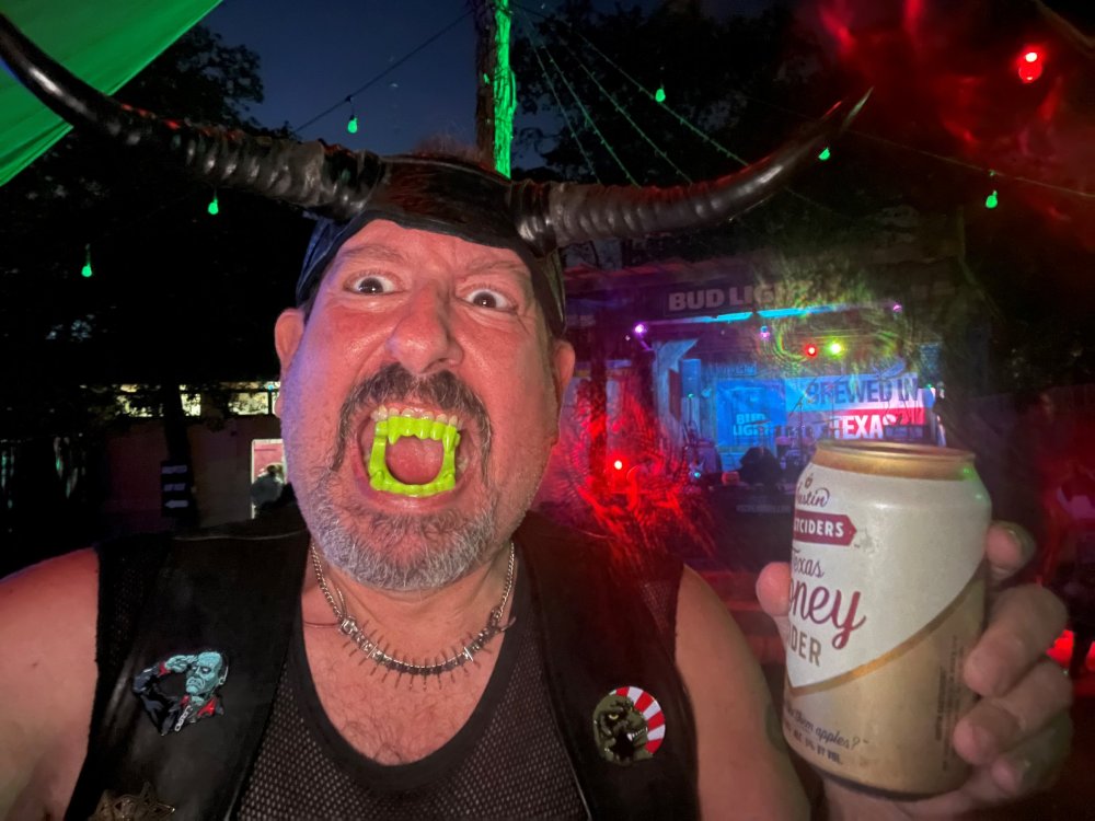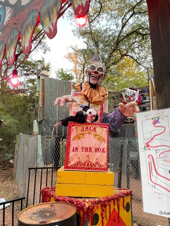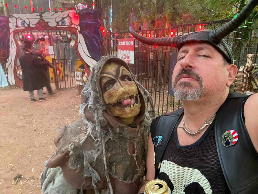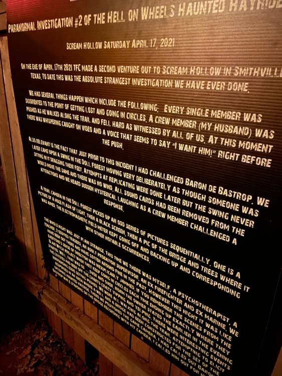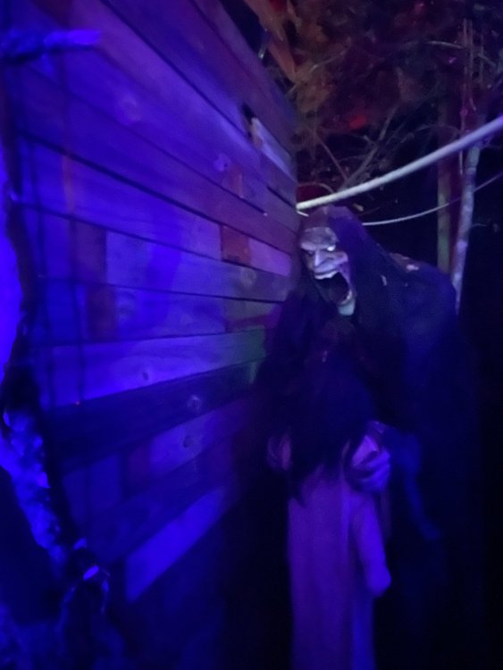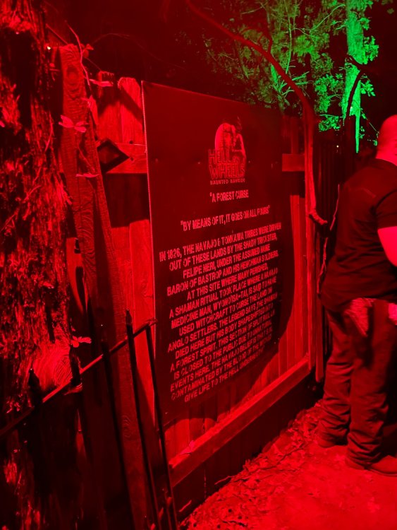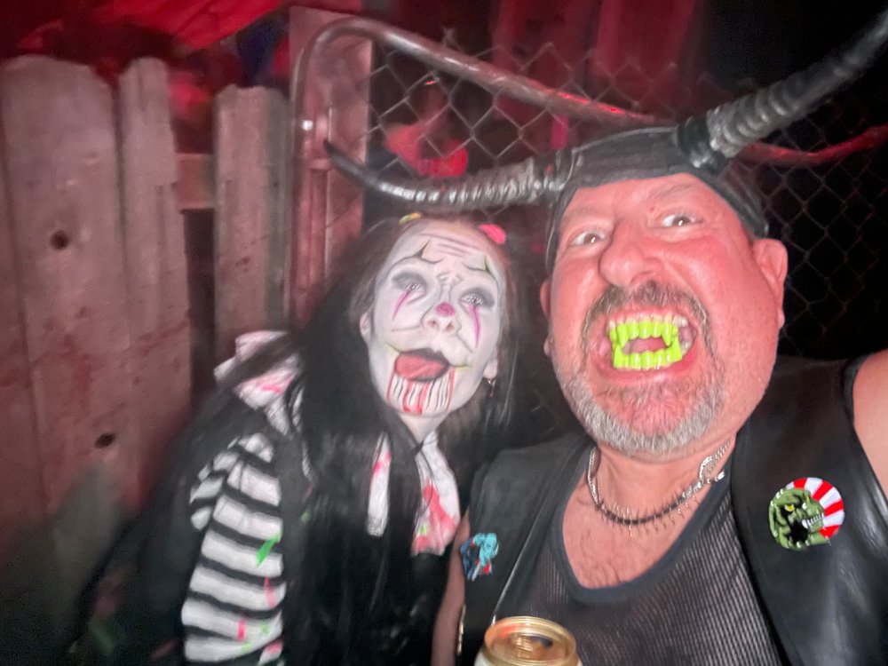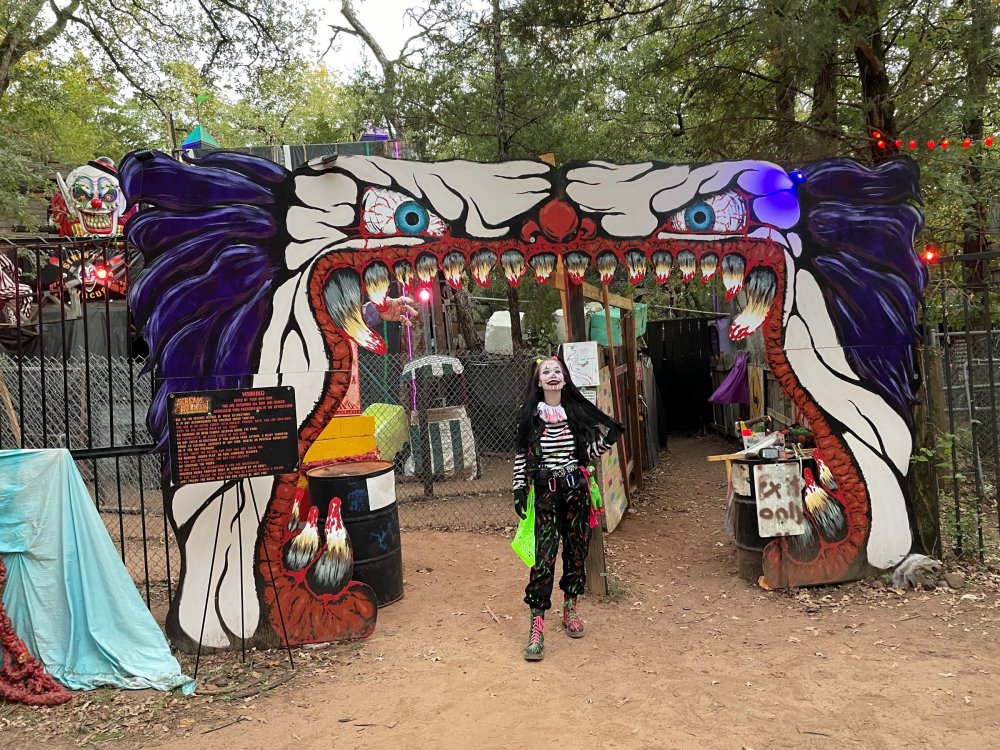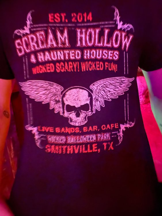 I know I'm in the middle of my massive Trip Report on the trip I took to Europe hitting parks and having fun with TPR. . . but interrupting that to gush about this fantastic thing I did last night. and hey, 'tis the season, right? my friends have been really trying to keep me pretty occupied, so I don't go under due to the grief of losing my spouse back in July. With Halloween quickly approaching, they've been booking me up every Weekend - with last weekend at FrightFest at SFFT, and two weeks before that Howl-O-Scream at SWSA. although I've lived in Austin for well over 35 years, I still have yet to do some of the "local" attractions that have popped up over the last couple of decades. (tho I'm really looking forward to COTALand opening up, as I'm sure I'll do that a LOT once they get more out there - tho I did go to the track/COTA occasionally with my late spouse for races and/or concerts). what made me think of COTA (Circuit of the Americas)? Well, it's F1 weekend here in Austin, but we also passed it last night on our way out to Scream Hollow. I'd seen Scream Hollow mentioned on the Travel Chanel, but wasn't really sure what it was, other than a "spooky" attraction. A haunted house for Halloween. Well, I was certainly mistaken. Located ~35 minutes from Austin, between Bastrop & Smithville - down a long, pretty deserted looking road (that passes right in front of "the Gas Station". . . where they filmed scenes from the original Texas Chainsaw Massacre - and has been turned in to Slaughter BBQ & gift shop - so of course we stopped in there too on the way. . .LOL) is what's basically a permanent "Ren-fair" installation that's basically a theme park dedicated to all things "scare the shit out of you" the official tag for the place is "Wicked Halloween Park" - but I think my description better sums it up. The owners live in a big castle (spookily lit at night) that overlooks the property. And it's quite a large property - encompassing a Halloween Museum, several food stands, drink stands, gift shop, stage for live music, 4 very large houses, and a common area that's decked out in scary decorations & lights - not to mention the scare actors roaming freely among the patrons, very often scaring the crap out of them by sneaking up behind. tho I called it a "theme park" the only "ride" they have is the Haunted Hayride - which is groups of 20 or so pulled behind a tractor thru the woods as creatures come at you from all sides. It's brilliant, and had the longest line of the night (at about a 30 minute wait, and was still worth it). . . but damn this place is super immersive. You aren't allowed to take pictures or film inside the houses, and although I did get permission from the owner's Son, when i was introduced to him by my friend Amy (who is the one who really convinced me to go last night), I only took a few in the houses. Because really. . you need to experience them yourself. the Four houses are all really well done, with tons of long dark hallways, really impressive "gotchas" sprinkled thruout, my overall impression? Food: what we had was really good - tho they were out of a few things, and as it got later in the evening, and the place hit capacity (think the Manager told me it was 3000), many food items on the menus were sold out. Oh, we still found stuff to eat (the voodoo fries - french fries covered in Queso, pico, and brisket were fantastic, and are a great "sponge" to sop up an alcohol drank). And the Pizza seemed really popular and was still selling right up until closing time. the prices are super reasonable too. But if you are gonna eat, eat early if possible - maybe the 1st hour they open, but before the houses really open. Drinks: well below "park" prices, with water and soda only $2, and most drinks/beer in the $6 range. I didn't notice any mixed drinks - but there are several bars, and it wouldn't surprise me if at least one of them was pouring by hand. . . tho vast majority of the crowd was drinking Beer, or canned Margaritas (surprisingly quite good), or Cider (locally made. . the Honey Cider is so good!). the Haunts themselves/Scare actors: As many places are these days ? They are very short staffed - resulting in only a few scare actors in the houses (that should have over a dozen - there were tons of nooks and crannies where I would think a scare actor would hide to scare guests). But that means way fewer jump scares and you can enjoy the long (and really detailed) effects in the houses. Each of the 4 main houses has at least one stand out feature that makes that house worth going thru. and these are not "quick" houses - each one took at least 12-15 minutes to go thru. And in *more* than one of them, we got lost and had to backtrack to find the correct way to go in order to move forward - while a scare actor watched us from above and taunted/laughed at us. the only place there were "enough" scare actors is on the Haunted Hayride, which is where they clearly needed to put the most - it's a very large area - and they have been promoting as a new attraction (the storyline on the Haunted Hayride involved the Wendigo in the woods that has been killing people). So no issue at all with the lack of "in house" scares. . I still feel like we absolutely were terrified in each house, at least a few times. It’s a good time Entertainment: as noted, there are some scare actors roaming the grounds oustide of the houses, but the biggest entertainment aspect is right at the front of the property - next to the main bar/food stand: a stage with live music. That has a DJ spinning between sets, so there's always music coming from the front of the grounds. I saw quite a few folks dancing out on the floor in front of the state, so people really seemed to like it. Price: tho you can buy a ticket for just admission, or just admission and one attraction. . . the way to go is the combo ticket. Which we got on Saturday night. For only ~$40, you get access to the grounds (pretty cool on their own)