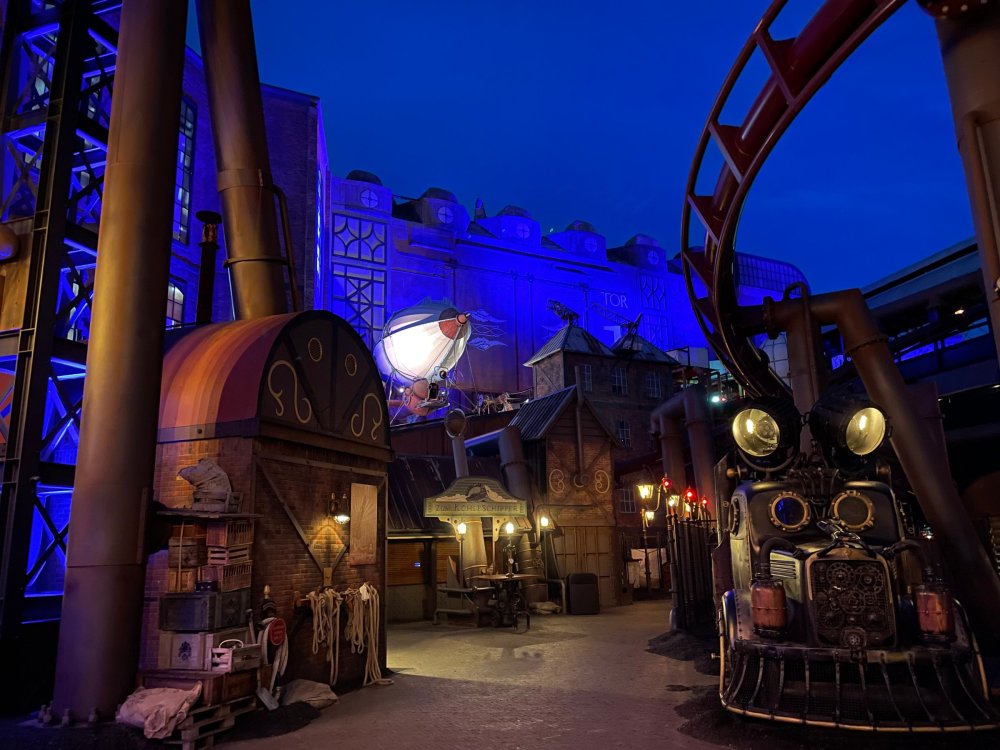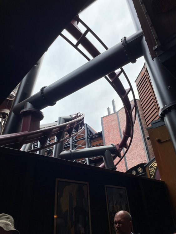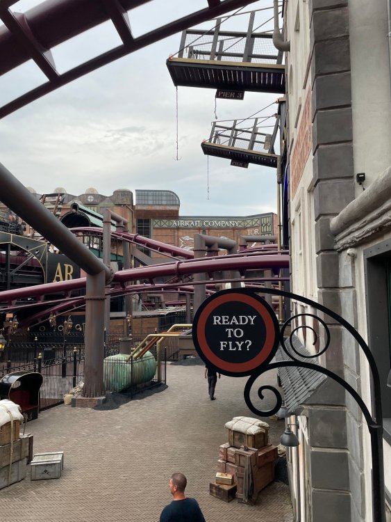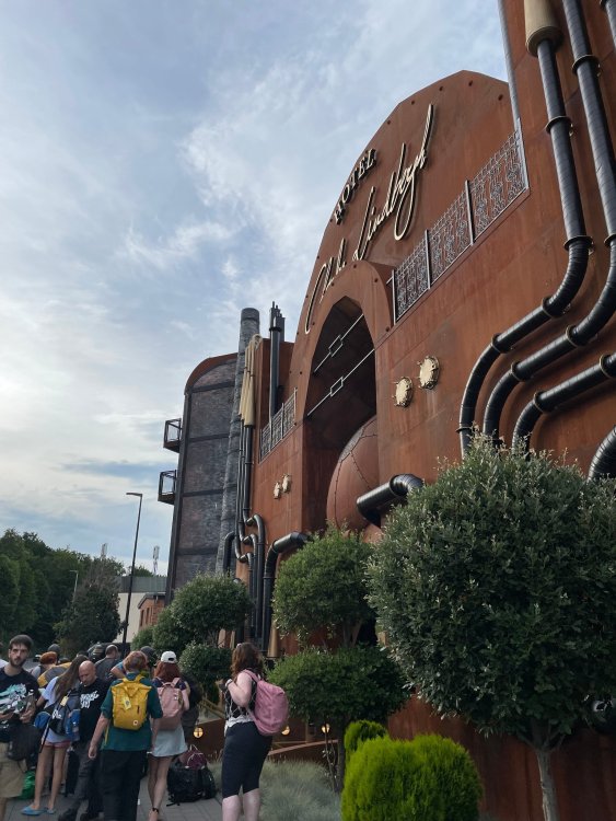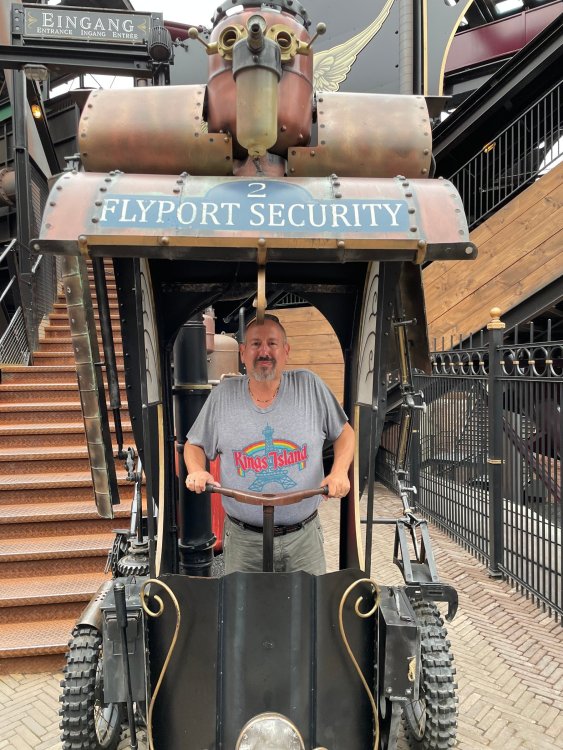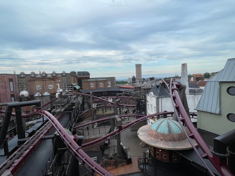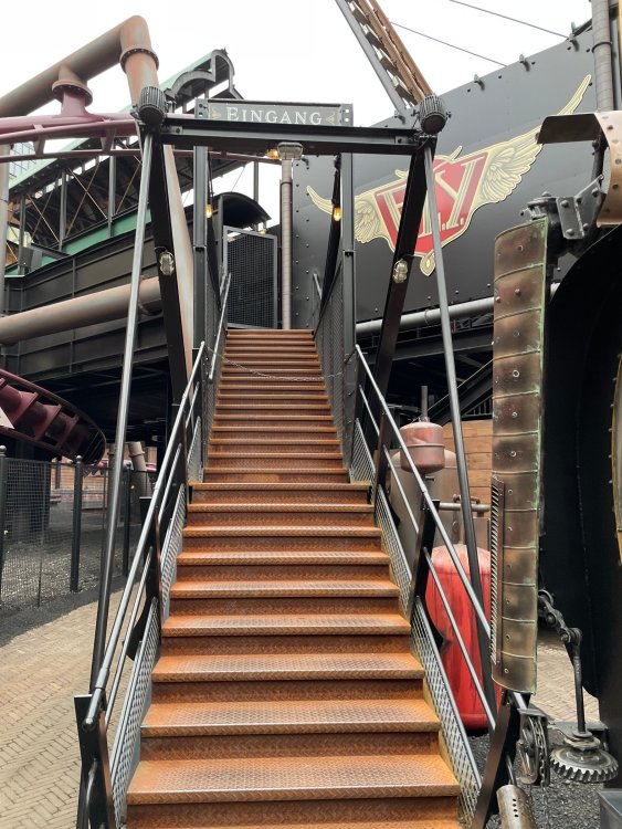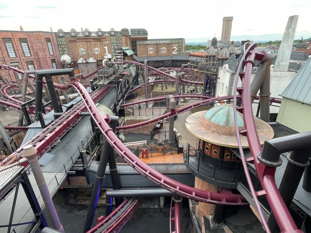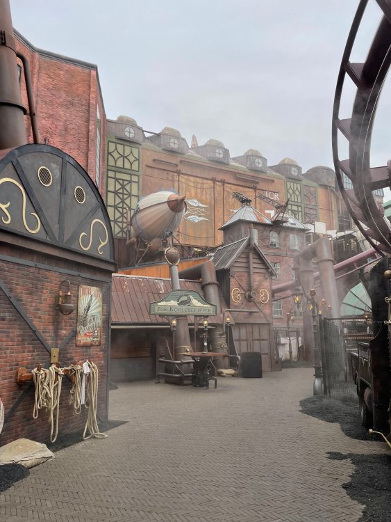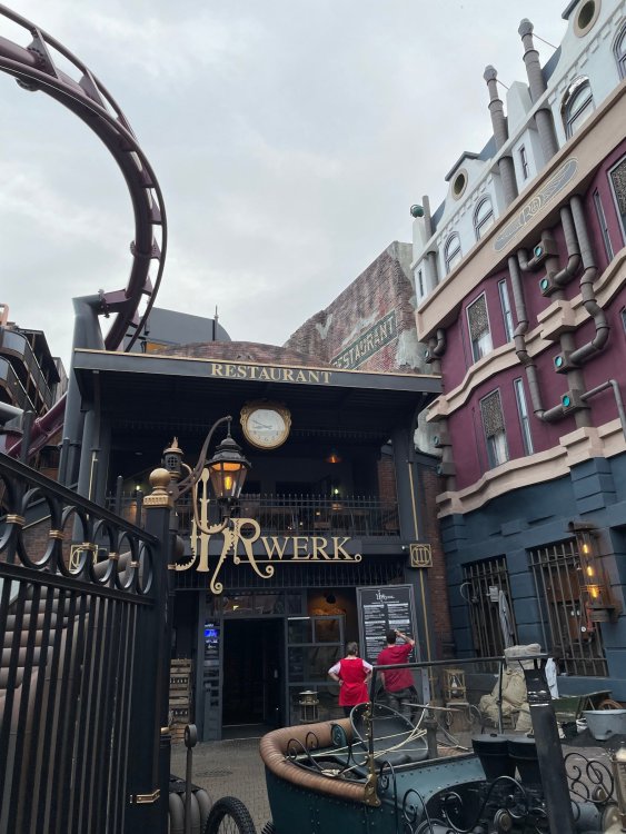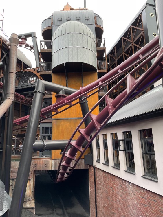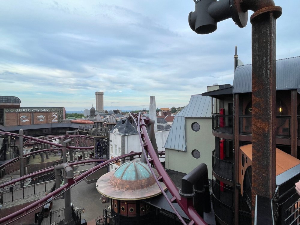 Day 5, part IV - the conclusion of the day: arriving at Phantasialand ! it had already been a packed (and thrilling) day, but we weren't done yet! Soon, we pulled up outside of Phantasialand (which is really well hidden from the surrounding area, as you couldn't really see any rides at all), stopped in front of our home for the next two nights: Hotel Charles Lindbergh - a fully immersive ON SITE boutique hotel that is heavily themed from the moment you walk inside. unloading bags from the bus and waiting outside for our room keys/directions. so I wandered and took some pics of the outside of the hotel facade as noted, it's heavily themed. you are an "Aeronaut". . . traveling thru time and space, and you've checked into this steampunk/time lost hotel to rest between time jumps. here's the lobby check in: these long hallways connect the lobby to the main "Pod A" (tower) of the hotel - which has, I believe, 4 "pods" of rooms. Although Pod A also has the access into Rookburgh. what is Rookburgh? well, Rookburgh is the themed area of Phantasialand where the new F.L.Y. coaster is. It's also where the Hotel is located, and guests at the hotel have access to the area after the park has been closed to guests. (no the coaster is not operating after hours. . . but holy crap is it cool to wander around that area, JUST with hotel guests - as you will see coming up). anyways - the walkway that would lead to Rookburgh/Pod A: and the way we went to get to our Pod C rooms OMG. . yeah, the coaster is RIGHT there. interacting very closely with the hotel. this is going to be so cool during the daytime operating hours! the coaster is literally outside the walkways to the rooms! love the old-timey / lost in timey tin ceiling tiles in the stairwells between floors. looking across at Pod B tower. . those are the back-side of rooms (ie: the bathroom windows) here's me looking out our bathroom window in Pod C and the view from said bathroom window: (went a little out of order). . . here's the door to our room and what the inside of the room looks like. Very small - in keeping with the theme. and a LITTLE cramped with two people plus luggage. But OMG, so cool, it doesn't matter. again, heavily themed (we didnt' turn the tv to anything other than the "old time static" broadcast it was on when we came in the whole time). James and I standing in doorway to get a pic of the walkway across to Pod B (and the access to the rooftop viewing platform that only guests of the hotel have access to) Bathroom. Small, but decent. again, the theming is that you're an Aeronaut only resting briefly before your next jaunt. ok. . settled into the room. . it's time to stretch our legs before dinner (which is included in the Restaurant attached to the hotel. (the only area of the hotel that during the day, non hotel guests have access to). from the end of our pod walkway, you get an EXCELLENT overview of Rookburgh area, and the F.L.Y. coaster and how much it weaves in and out of the theming in the area. SO well themed. . other than Mystery Castle - the tower off to the right in the distance - you can't see anything else of the park other than Rookburgh. They really put some thought & design into this theming! the steps under the rounded turret on the right are the ones that lead down to the Hotel Entrance into Rookburgh snapping pics, as we walk over to Pod A and head up the steps to the Hotel Exclusive viewing area. . . up on the viewing area, we bumped into Andy (the Great Zo), who had the same thought to come up and see the view/take pics. so we took a pic of all of us. the view from up here is SPECTACULAR. and even up here, other than Mystery Castle, you can't really see any other parts of this park! Pics taken. . let's head down into Rookburgh popper, since we still have about 30 minutes until dinner seating. such an amazing job with the Steampunk/time lost theming. . the private gate out of the hotel into the park. and looking back into the hotel entrance - during the day, there is a staff member stationed here that only will allow Hotel guests in and out of this gate. down the steps and into the deserted Rookburgh. the park had closed a couple of hours earlier, so we were the only ones there. . one of THE best reasons to splurge and stay onsite here. the theming is incredible, and it's so cool that you can see it / touch it/ take pics of it - without hundreds of people around! fully immersive. . . one of the "exit gates" into the other sections of the park. . .tho as noted, the park closes off this area at park close, to keep Hotel Guests inside Rookburgh and maintain the "Aeromaut" role-playing. . . the special gate for F.L.Y. that we would use our hotel passes at tomorrow or the next day. the main / standby line entrance for the ride. (which by the way is an AMAZE-BALLS flying coaster. . that some in the group didn't realize was a "flying" coaster until the seats tilted face down on the main lift/launch. . LOL). security stands here during the day. but off hours? yup, photo op! and I absolutely adore how they keep all the theming on even after park close in this area. steam and lights stay on until well after 11pm for hotel guests to enjoy the area/atmosphere. another "gate" that would lead to the indoor section where Winjas is located (tho oddly, these doors never opened while we were there. . so maybe they just don't use these any longer, as the other entrance - thru the tunnel - is way more immersive into the Rookburgh area) peeking across/thru the coaster track & theming, you can see folks sitting in the private Bar patio in our hotel. . only hotel guests have access to this bar/patio. (based on that blue shirt? I *think* that's Daniel sitting there?) tho it would be cool if they operated this coaster after hours for hotel guests? I can totally understand why they do NOT. can you imagine the noise in the rooms? I mean look how close it gets to the pods. Instead they give hotel guests "skip the line" / "special Hotel entranc