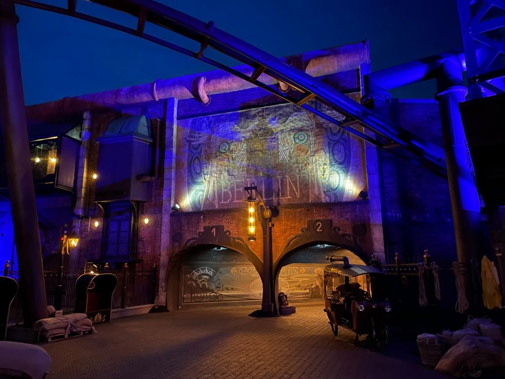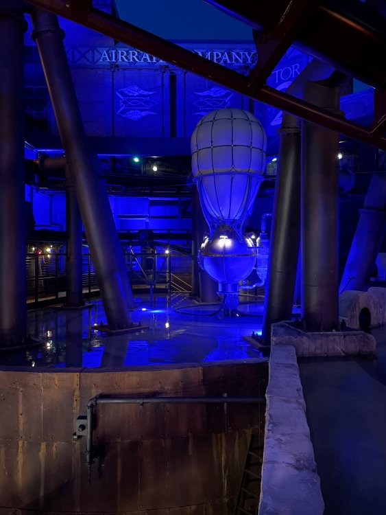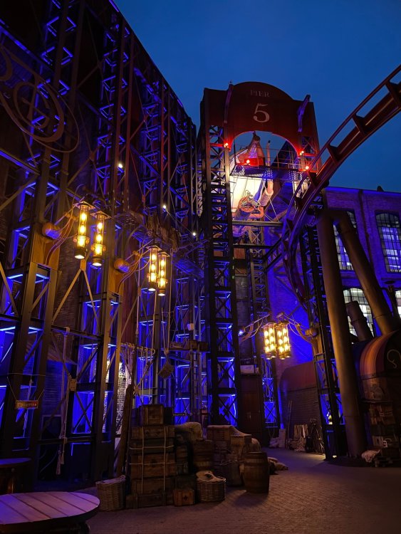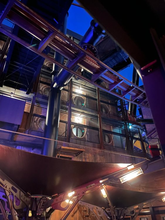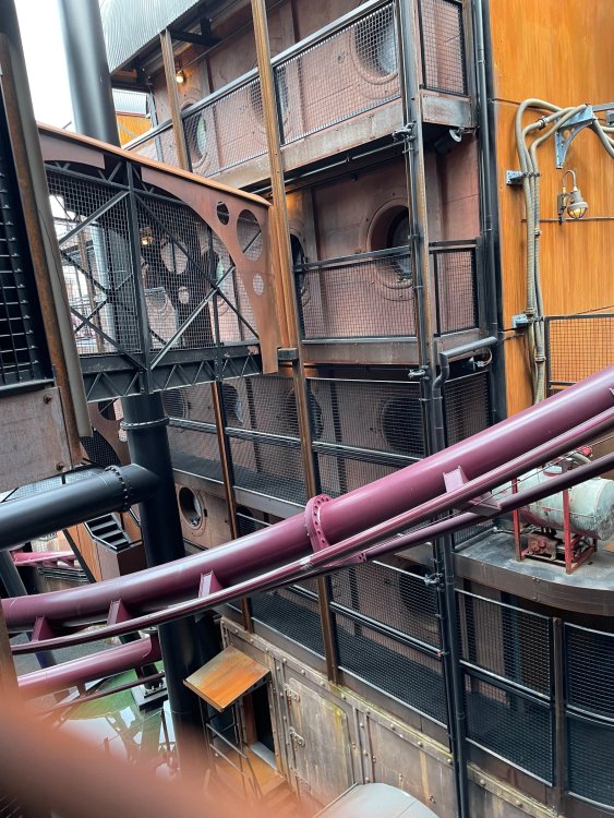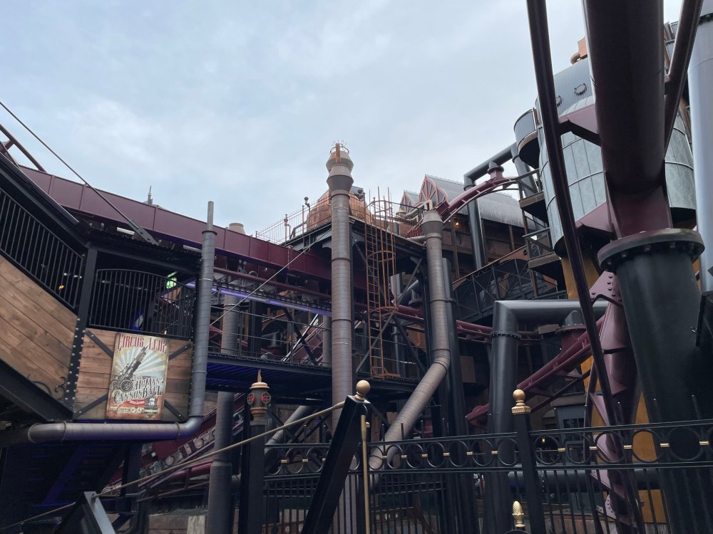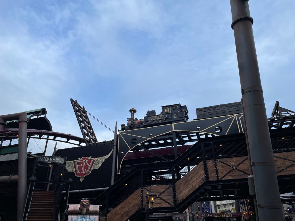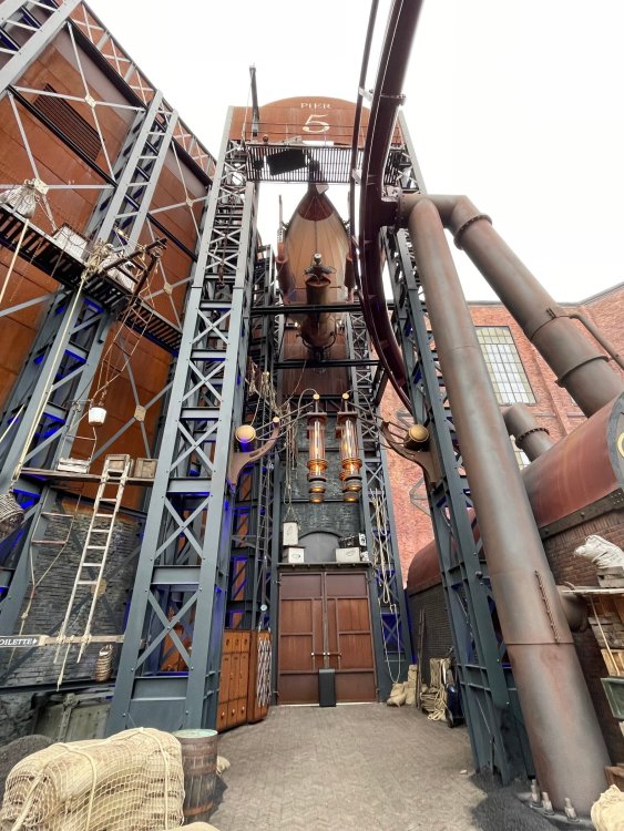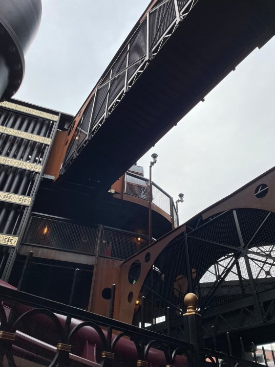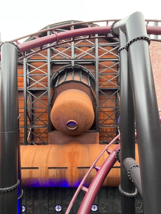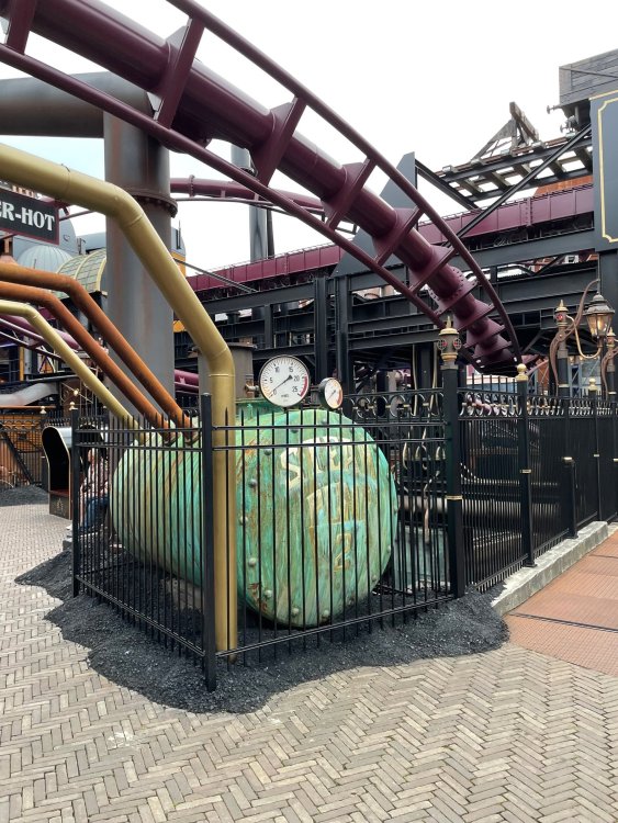 Day 5, part IV - the conclusion of the day: arriving at Phantasialand ! it had already been a packed (and thrilling) day, but we weren't done yet! Soon, we pulled up outside of Phantasialand (which is really well hidden from the surrounding area, as you couldn't really see any rides at all), stopped in front of our home for the next two nights: Hotel Charles Lindbergh - a fully immersive ON SITE boutique hotel that is heavily themed from the moment you walk inside. unloading bags from the bus and waiting outside for our room keys/directions. so I wandered and took some pics of the outside of the hotel facade as noted, it's heavily themed. you are an "Aeronaut". . . traveling thru time and space, and you've checked into this steampunk/time lost hotel to rest between time jumps. here's the lobby check in: these long hallways connect the lobby to the main "Pod A" (tower) of the hotel - which has, I believe, 4 "pods" of rooms. Although Pod A also has the access into Rookburgh. what is Rookburgh? well, Rookburgh is the themed area of Phantasialand where the new F.L.Y. coaster is. It's also where the Hotel is located, and guests at the hotel have access to the area after the park has been closed to guests. (no the coaster is not operating after hours. . . but holy crap is it cool to wander around that area, JUST with hotel guests - as you will see coming up). anyways - the walkway that would lead to Rookburgh/Pod A: and the way we went to get to our Pod C rooms OMG. . yeah, the coaster is RIGHT there. interacting very closely with the hotel. this is going to be so cool during the daytime operating hours! the coaster is literally outside the walkways to the rooms! love the old-timey / lost in timey tin ceiling tiles in the stairwells between floors. looking across at Pod B tower. . those are the back-side of rooms (ie: the bathroom windows) here's me looking out our bathroom window in Pod C and the view from said bathroom window: (went a little out of order). . . here's the door to our room and what the inside of the room looks like. Very small - in keeping with the theme. and a LITTLE cramped with two people plus luggage. But OMG, so cool, it doesn't matter. again, heavily themed (we didnt' turn the tv to anything other than the "old time static" broadcast it was on when we came in the whole time). James and I standing in doorway to get a pic of the walkway across to Pod B (and the access to the rooftop viewing platform that only guests of the hotel have access to) Bathroom. Small, but decent. again, the theming is that you're an Aeronaut only resting briefly before your next jaunt. ok. . settled into the room. . it's time to stretch our legs before dinner (which is included in the Restaurant attached to the hotel. (the only area of the hotel that during the day, non hotel guests have access to). from the end of our pod walkway, you get an EXCELLENT overview of Rookburgh area, and the F.L.Y. coaster and how much it weaves in and out of the theming in the area. SO well themed. . other than Mystery Castle - the tower off to the right in the distance - you can't see anything else of the park other than Rookburgh. They really put some thought & design into this theming! the steps under the rounded turret on the right are the ones that lead down to the Hotel Entrance into Rookburgh snapping pics, as we walk over to Pod A and head up the steps to the Hotel Exclusive viewing area. . . up on the viewing area, we bumped into Andy (the Great Zo), who had the same thought to come up and see the view/take pics. so we took a pic of all of us. the view from up here is SPECTACULAR. and even up here, other than Mystery Castle, you can't really see any other parts of this park! Pics taken. . let's head down into Rookburgh popper, since we still have about 30 minutes until dinner seating. such an amazing job with the Steampunk/time lost theming. . the private gate out of the hotel into the park. and looking back into the hotel entrance - during the day, there is a staff member stationed here that only will allow Hotel guests in and out of this gate. down the steps and into the deserted Rookburgh. the park had closed a couple of hours earlier, so we were the only ones there. . one of THE best reasons to splurge and stay onsite here. the theming is incredible, and it's so cool that you can see it / touch it/ take pics of it - without hundreds of people around! fully immersive. . . one of the "exit gates" into the other sections of the park. . .tho as noted, the park closes off this area at park close, to keep Hotel Guests inside Rookburgh and maintain the "Aeromaut" role-playing. . . the special gate for F.L.Y. that we would use our hotel passes at tomorrow or the next day. the main / standby line entrance for the ride. (which by the way is an AMAZE-BALLS flying coaster. . that some in the group didn't realize was a "flying" coaster until the seats tilted face down on the main lift/launch. . LOL). security stands here during the day. but off hours? yup, photo op! and I absolutely adore how they keep all the theming on even after park close in this area. steam and lights stay on until well after 11pm for hotel guests to enjoy the area/atmosphere. another "gate" that would lead to the indoor section where Winjas is located (tho oddly, these doors never opened while we were there. . so maybe they just don't use these any longer, as the other entrance - thru the tunnel - is way more immersive into the Rookburgh area) peeking across/thru the coaster track & theming, you can see folks sitting in the private Bar patio in our hotel. . only hotel guests have access to this bar/patio. (based on that blue shirt? I *think* that's Daniel sitting there?) tho it would be cool if they operated this coaster after hours for hotel guests? I can totally understand why they do NOT. can you imagine the noise in the rooms? I mean look how close it gets to the pods. Instead they give hotel guests "skip the line" / "special Hotel entranc