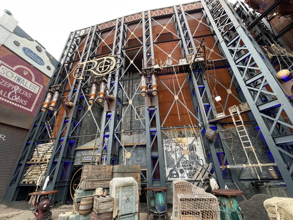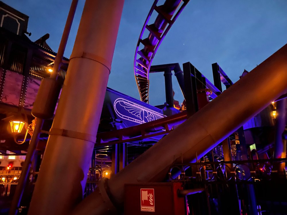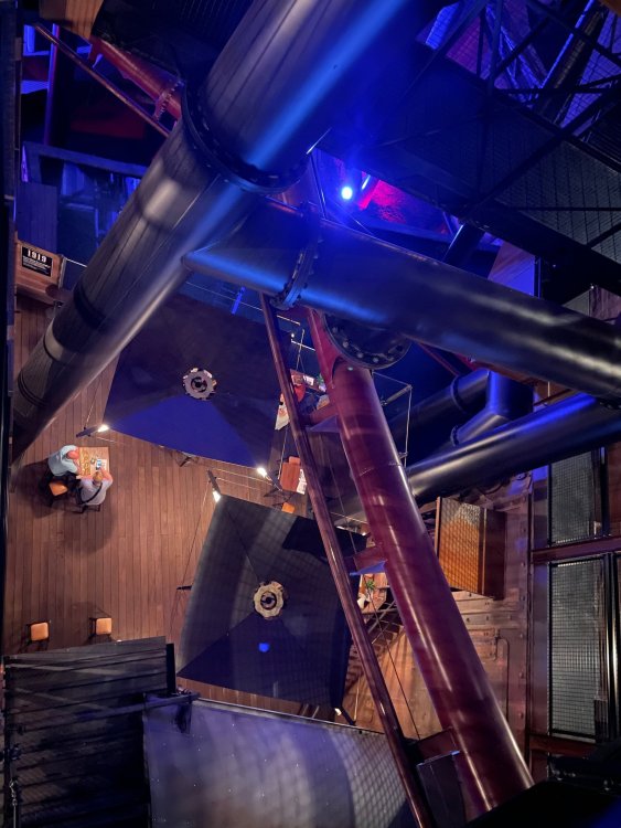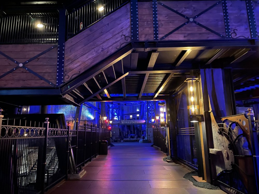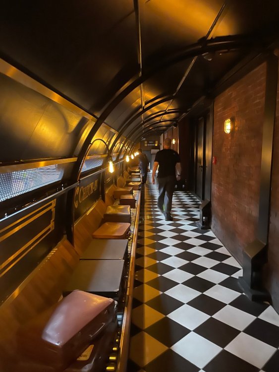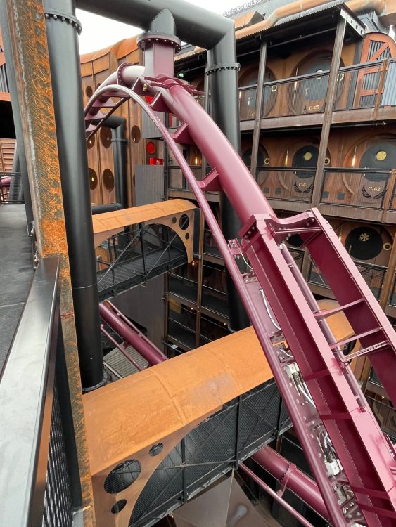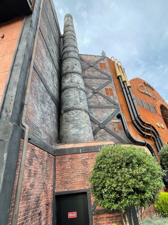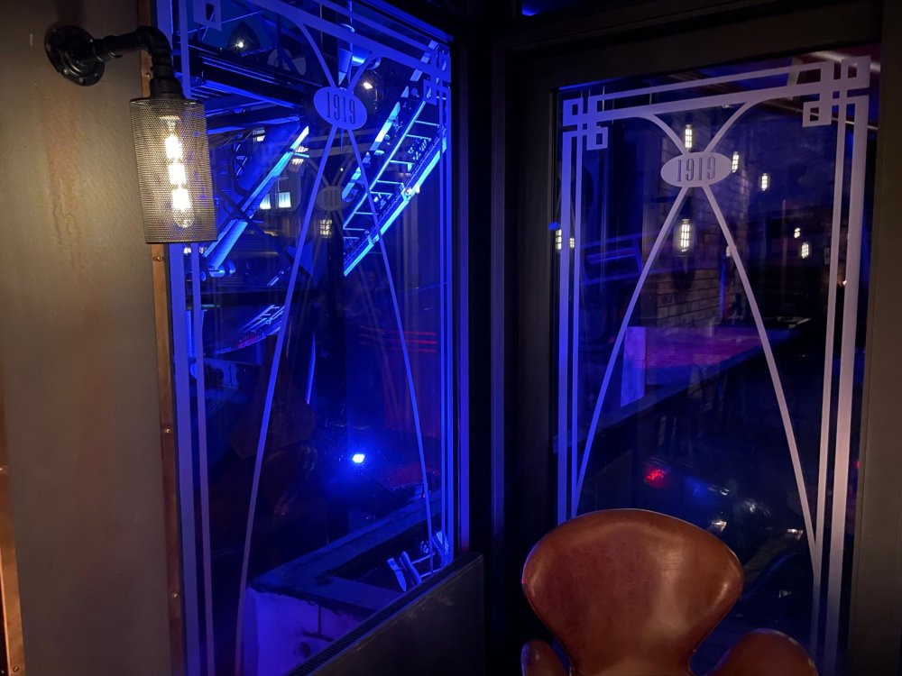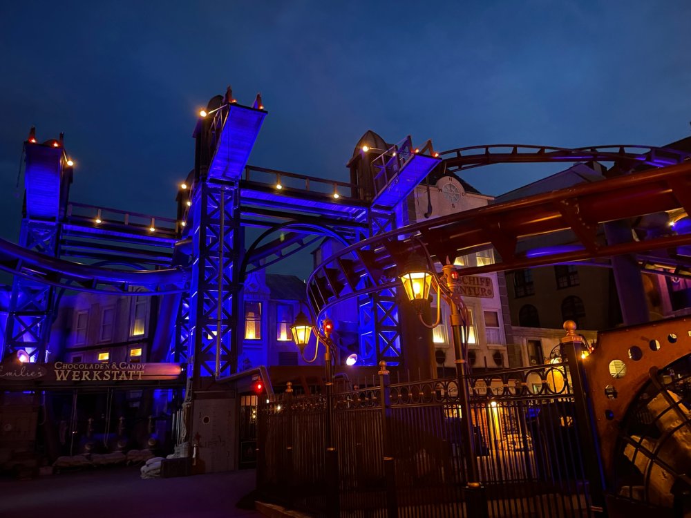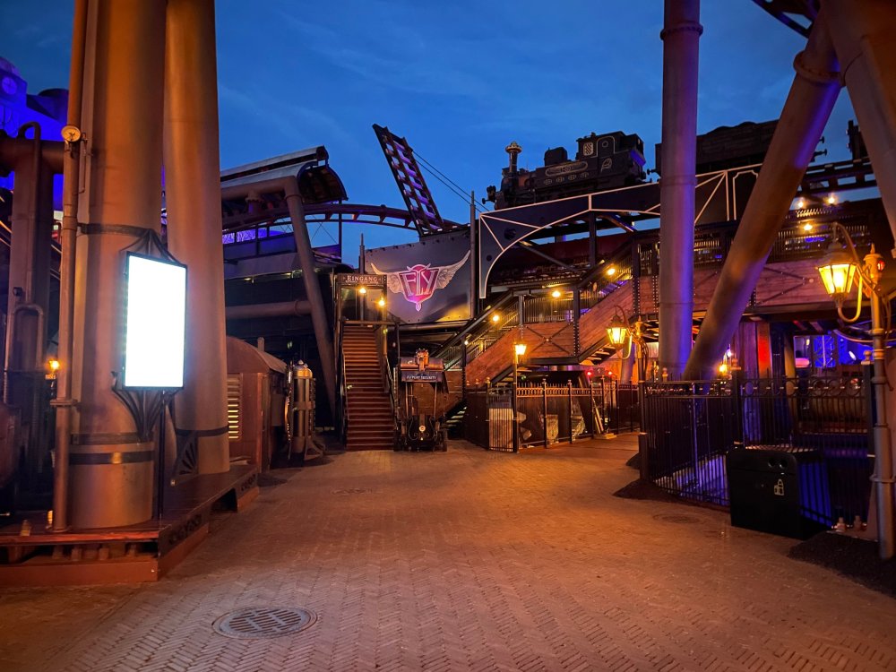 Day 5, part IV - the conclusion of the day: arriving at Phantasialand ! it had already been a packed (and thrilling) day, but we weren't done yet! Soon, we pulled up outside of Phantasialand (which is really well hidden from the surrounding area, as you couldn't really see any rides at all), stopped in front of our home for the next two nights: Hotel Charles Lindbergh - a fully immersive ON SITE boutique hotel that is heavily themed from the moment you walk inside. unloading bags from the bus and waiting outside for our room keys/directions. so I wandered and took some pics of the outside of the hotel facade as noted, it's heavily themed. you are an "Aeronaut". . . traveling thru time and space, and you've checked into this steampunk/time lost hotel to rest between time jumps. here's the lobby check in: these long hallways connect the lobby to the main "Pod A" (tower) of the hotel - which has, I believe, 4 "pods" of rooms. Although Pod A also has the access into Rookburgh. what is Rookburgh? well, Rookburgh is the themed area of Phantasialand where the new F.L.Y. coaster is. It's also where the Hotel is located, and guests at the hotel have access to the area after the park has been closed to guests. (no the coaster is not operating after hours. . . but holy crap is it cool to wander around that area, JUST with hotel guests - as you will see coming up). anyways - the walkway that would lead to Rookburgh/Pod A: and the way we went to get to our Pod C rooms OMG. . yeah, the coaster is RIGHT there. interacting very closely with the hotel. this is going to be so cool during the daytime operating hours! the coaster is literally outside the walkways to the rooms! love the old-timey / lost in timey tin ceiling tiles in the stairwells between floors. looking across at Pod B tower. . those are the back-side of rooms (ie: the bathroom windows) here's me looking out our bathroom window in Pod C and the view from said bathroom window: (went a little out of order). . . here's the door to our room and what the inside of the room looks like. Very small - in keeping with the theme. and a LITTLE cramped with two people plus luggage. But OMG, so cool, it doesn't matter. again, heavily themed (we didnt' turn the tv to anything other than the "old time static" broadcast it was on when we came in the whole time). James and I standing in doorway to get a pic of the walkway across to Pod B (and the access to the rooftop viewing platform that only guests of the hotel have access to) Bathroom. Small, but decent. again, the theming is that you're an Aeronaut only resting briefly before your next jaunt. ok. . settled into the room. . it's time to stretch our legs before dinner (which is included in the Restaurant attached to the hotel. (the only area of the hotel that during the day, non hotel guests have access to). from the end of our pod walkway, you get an EXCELLENT overview of Rookburgh area, and the F.L.Y. coaster and how much it weaves in and out of the theming in the area. SO well themed. . other than Mystery Castle - the tower off to the right in the distance - you can't see anything else of the park other than Rookburgh. They really put some thought & design into this theming! the steps under the rounded turret on the right are the ones that lead down to the Hotel Entrance into Rookburgh snapping pics, as we walk over to Pod A and head up the steps to the Hotel Exclusive viewing area. . . up on the viewing area, we bumped into Andy (the Great Zo), who had the same thought to come up and see the view/take pics. so we took a pic of all of us. the view from up here is SPECTACULAR. and even up here, other than Mystery Castle, you can't really see any other parts of this park! Pics taken. . let's head down into Rookburgh popper, since we still have about 30 minutes until dinner seating. such an amazing job with the Steampunk/time lost theming. . the private gate out of the hotel into the park. and looking back into the hotel entrance - during the day, there is a staff member stationed here that only will allow Hotel guests in and out of this gate. down the steps and into the deserted Rookburgh. the park had closed a couple of hours earlier, so we were the only ones there. . one of THE best reasons to splurge and stay onsite here. the theming is incredible, and it's so cool that you can see it / touch it/ take pics of it - without hundreds of people around! fully immersive. . . one of the "exit gates" into the other sections of the park. . .tho as noted, the park closes off this area at park close, to keep Hotel Guests inside Rookburgh and maintain the "Aeromaut" role-playing. . . the special gate for F.L.Y. that we would use our hotel passes at tomorrow or the next day. the main / standby line entrance for the ride. (which by the way is an AMAZE-BALLS flying coaster. . that some in the group didn't realize was a "flying" coaster until the seats tilted face down on the main lift/launch. . LOL). security stands here during the day. but off hours? yup, photo op! and I absolutely adore how they keep all the theming on even after park close in this area. steam and lights stay on until well after 11pm for hotel guests to enjoy the area/atmosphere. another "gate" that would lead to the indoor section where Winjas is located (tho oddly, these doors never opened while we were there. . so maybe they just don't use these any longer, as the other entrance - thru the tunnel - is way more immersive into the Rookburgh area) peeking across/thru the coaster track & theming, you can see folks sitting in the private Bar patio in our hotel. . only hotel guests have access to this bar/patio. (based on that blue shirt? I *think* that's Daniel sitting there?) tho it would be cool if they operated this coaster after hours for hotel guests? I can totally understand why they do NOT. can you imagine the noise in the rooms? I mean look how close it gets to the pods. Instead they give hotel guests "skip the line" / "special Hotel entranc