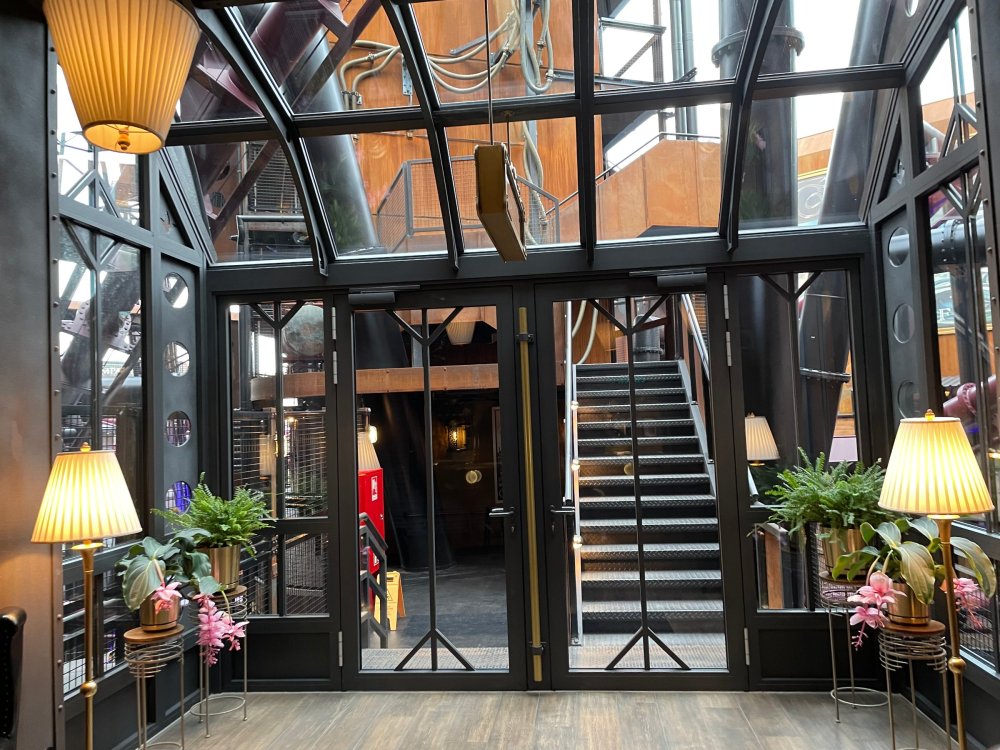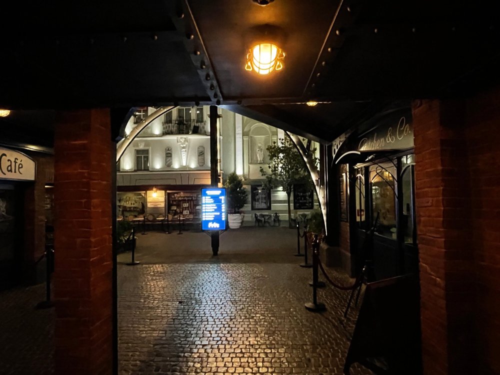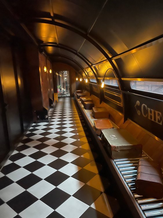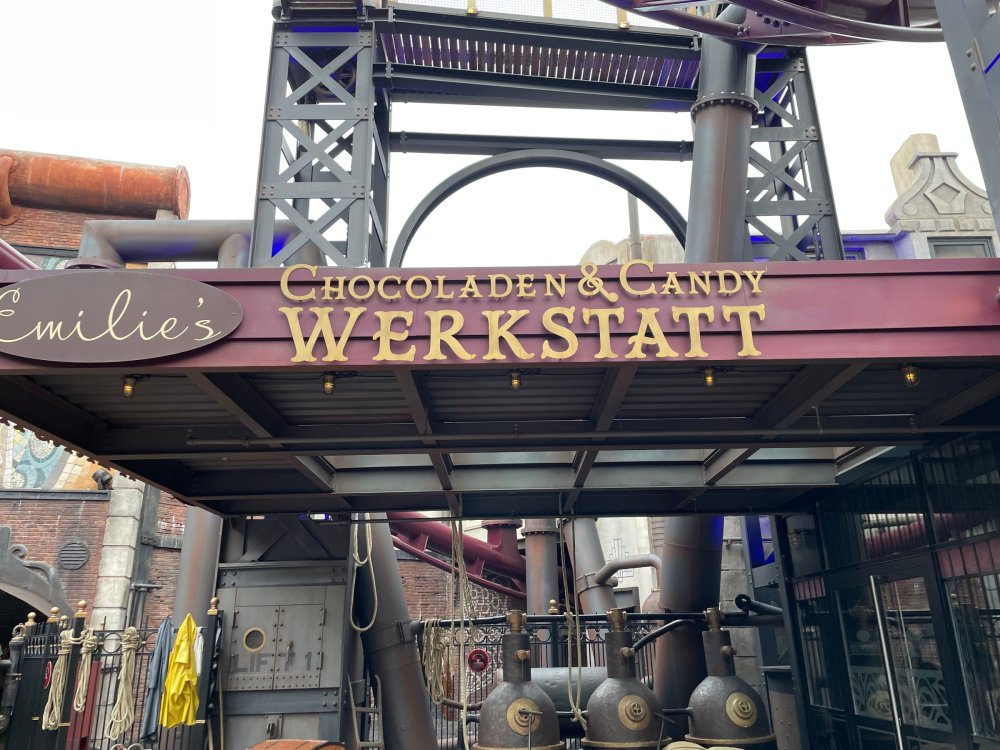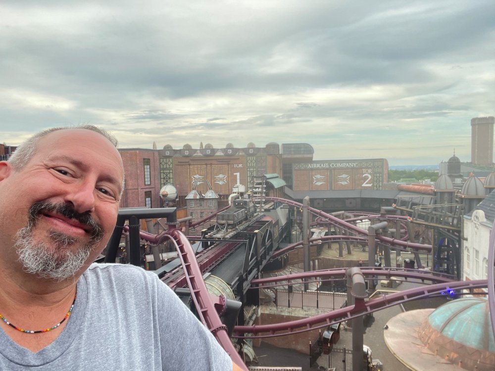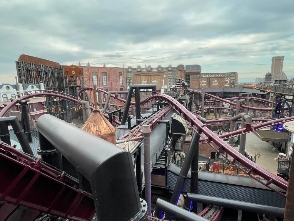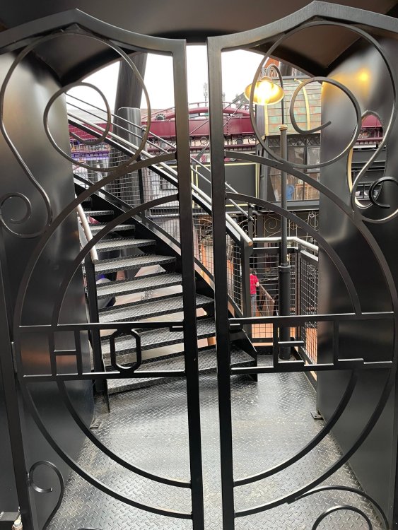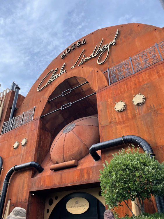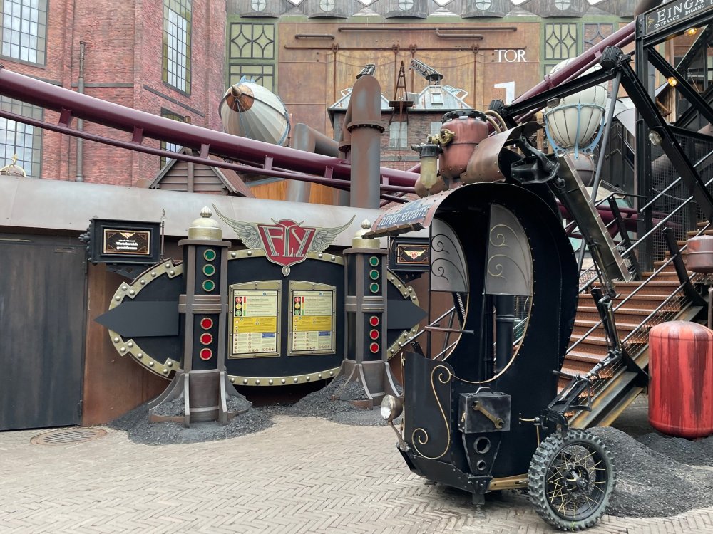 Day 5, part IV - the conclusion of the day: arriving at Phantasialand ! it had already been a packed (and thrilling) day, but we weren't done yet! Soon, we pulled up outside of Phantasialand (which is really well hidden from the surrounding area, as you couldn't really see any rides at all), stopped in front of our home for the next two nights: Hotel Charles Lindbergh - a fully immersive ON SITE boutique hotel that is heavily themed from the moment you walk inside. unloading bags from the bus and waiting outside for our room keys/directions. so I wandered and took some pics of the outside of the hotel facade as noted, it's heavily themed. you are an "Aeronaut". . . traveling thru time and space, and you've checked into this steampunk/time lost hotel to rest between time jumps. here's the lobby check in: these long hallways connect the lobby to the main "Pod A" (tower) of the hotel - which has, I believe, 4 "pods" of rooms. Although Pod A also has the access into Rookburgh. what is Rookburgh? well, Rookburgh is the themed area of Phantasialand where the new F.L.Y. coaster is. It's also where the Hotel is located, and guests at the hotel have access to the area after the park has been closed to guests. (no the coaster is not operating after hours. . . but holy crap is it cool to wander around that area, JUST with hotel guests - as you will see coming up). anyways - the walkway that would lead to Rookburgh/Pod A: and the way we went to get to our Pod C rooms OMG. . yeah, the coaster is RIGHT there. interacting very closely with the hotel. this is going to be so cool during the daytime operating hours! the coaster is literally outside the walkways to the rooms! love the old-timey / lost in timey tin ceiling tiles in the stairwells between floors. looking across at Pod B tower. . those are the back-side of rooms (ie: the bathroom windows) here's me looking out our bathroom window in Pod C and the view from said bathroom window: (went a little out of order). . . here's the door to our room and what the inside of the room looks like. Very small - in keeping with the theme. and a LITTLE cramped with two people plus luggage. But OMG, so cool, it doesn't matter. again, heavily themed (we didnt' turn the tv to anything other than the "old time static" broadcast it was on when we came in the whole time). James and I standing in doorway to get a pic of the walkway across to Pod B (and the access to the rooftop viewing platform that only guests of the hotel have access to) Bathroom. Small, but decent. again, the theming is that you're an Aeronaut only resting briefly before your next jaunt. ok. . settled into the room. . it's time to stretch our legs before dinner (which is included in the Restaurant attached to the hotel. (the only area of the hotel that during the day, non hotel guests have access to). from the end of our pod walkway, you get an EXCELLENT overview of Rookburgh area, and the F.L.Y. coaster and how much it weaves in and out of the theming in the area. SO well themed. . other than Mystery Castle - the tower off to the right in the distance - you can't see anything else of the park other than Rookburgh. They really put some thought & design into this theming! the steps under the rounded turret on the right are the ones that lead down to the Hotel Entrance into Rookburgh snapping pics, as we walk over to Pod A and head up the steps to the Hotel Exclusive viewing area. . . up on the viewing area, we bumped into Andy (the Great Zo), who had the same thought to come up and see the view/take pics. so we took a pic of all of us. the view from up here is SPECTACULAR. and even up here, other than Mystery Castle, you can't really see any other parts of this park! Pics taken. . let's head down into Rookburgh popper, since we still have about 30 minutes until dinner seating. such an amazing job with the Steampunk/time lost theming. . the private gate out of the hotel into the park. and looking back into the hotel entrance - during the day, there is a staff member stationed here that only will allow Hotel guests in and out of this gate. down the steps and into the deserted Rookburgh. the park had closed a couple of hours earlier, so we were the only ones there. . one of THE best reasons to splurge and stay onsite here. the theming is incredible, and it's so cool that you can see it / touch it/ take pics of it - without hundreds of people around! fully immersive. . . one of the "exit gates" into the other sections of the park. . .tho as noted, the park closes off this area at park close, to keep Hotel Guests inside Rookburgh and maintain the "Aeromaut" role-playing. . . the special gate for F.L.Y. that we would use our hotel passes at tomorrow or the next day. the main / standby line entrance for the ride. (which by the way is an AMAZE-BALLS flying coaster. . that some in the group didn't realize was a "flying" coaster until the seats tilted face down on the main lift/launch. . LOL). security stands here during the day. but off hours? yup, photo op! and I absolutely adore how they keep all the theming on even after park close in this area. steam and lights stay on until well after 11pm for hotel guests to enjoy the area/atmosphere. another "gate" that would lead to the indoor section where Winjas is located (tho oddly, these doors never opened while we were there. . so maybe they just don't use these any longer, as the other entrance - thru the tunnel - is way more immersive into the Rookburgh area) peeking across/thru the coaster track & theming, you can see folks sitting in the private Bar patio in our hotel. . only hotel guests have access to this bar/patio. (based on that blue shirt? I *think* that's Daniel sitting there?) tho it would be cool if they operated this coaster after hours for hotel guests? I can totally understand why they do NOT. can you imagine the noise in the rooms? I mean look how close it gets to the pods. Instead they give hotel guests "skip the line" / "special Hotel entranc