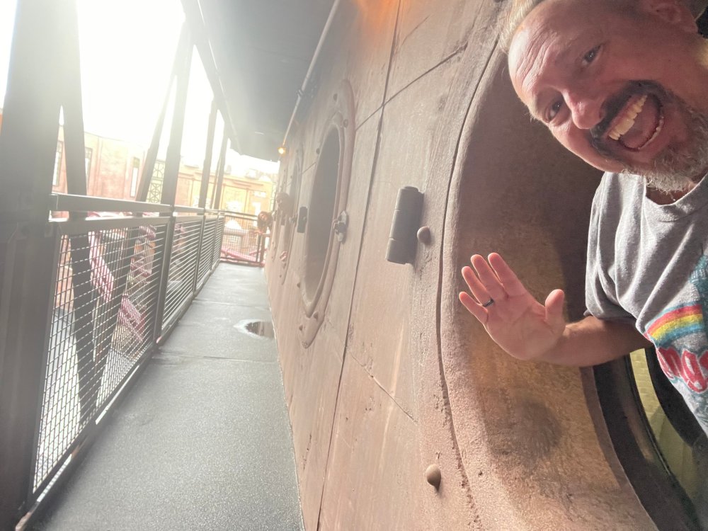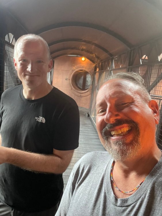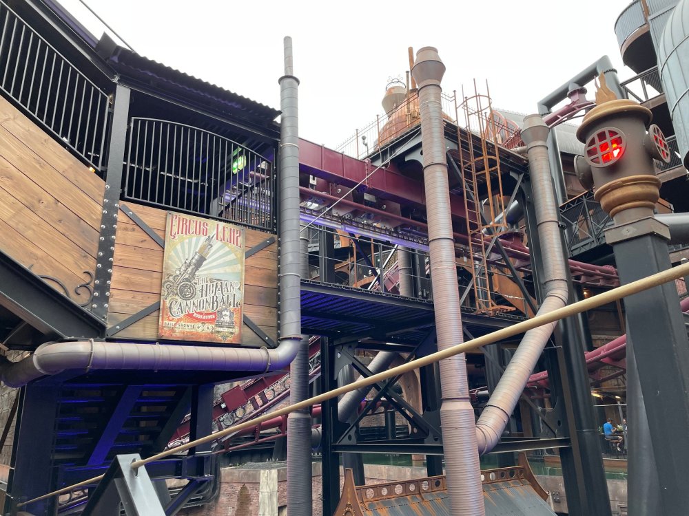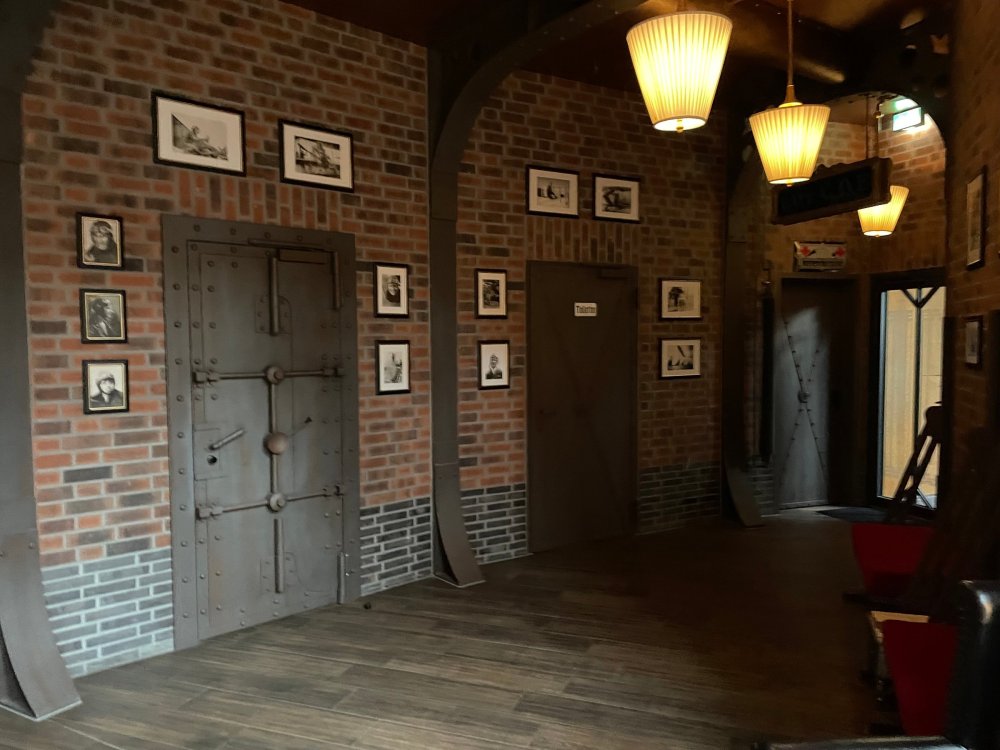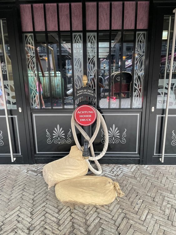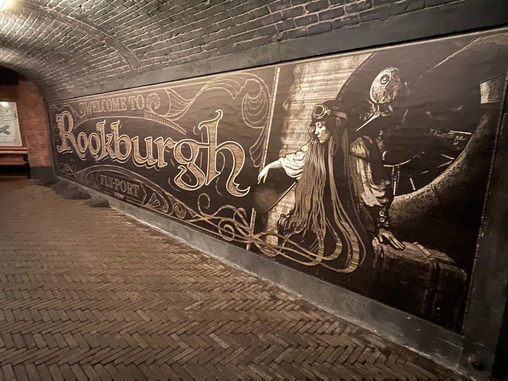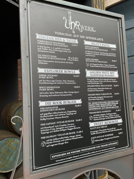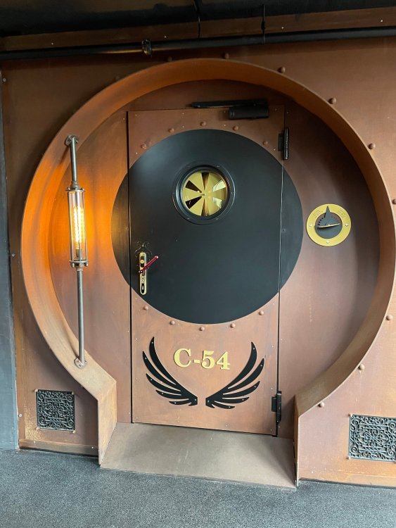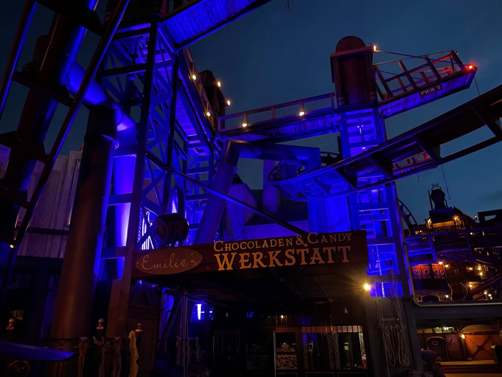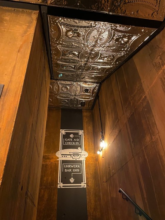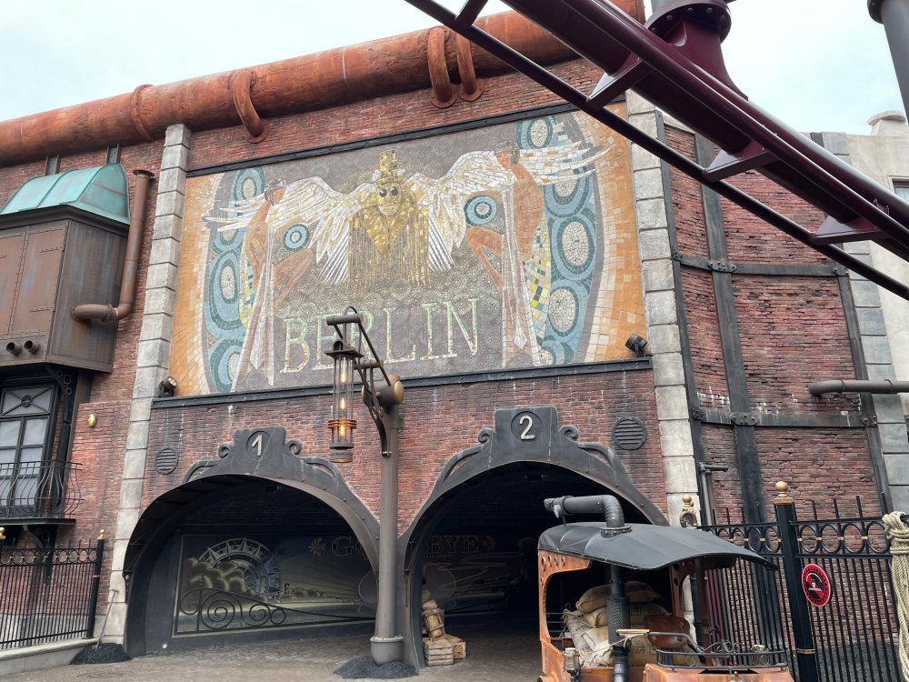 Day 5, part IV - the conclusion of the day: arriving at Phantasialand ! it had already been a packed (and thrilling) day, but we weren't done yet! Soon, we pulled up outside of Phantasialand (which is really well hidden from the surrounding area, as you couldn't really see any rides at all), stopped in front of our home for the next two nights: Hotel Charles Lindbergh - a fully immersive ON SITE boutique hotel that is heavily themed from the moment you walk inside. unloading bags from the bus and waiting outside for our room keys/directions. so I wandered and took some pics of the outside of the hotel facade as noted, it's heavily themed. you are an "Aeronaut". . . traveling thru time and space, and you've checked into this steampunk/time lost hotel to rest between time jumps. here's the lobby check in: these long hallways connect the lobby to the main "Pod A" (tower) of the hotel - which has, I believe, 4 "pods" of rooms. Although Pod A also has the access into Rookburgh. what is Rookburgh? well, Rookburgh is the themed area of Phantasialand where the new F.L.Y. coaster is. It's also where the Hotel is located, and guests at the hotel have access to the area after the park has been closed to guests. (no the coaster is not operating after hours. . . but holy crap is it cool to wander around that area, JUST with hotel guests - as you will see coming up). anyways - the walkway that would lead to Rookburgh/Pod A: and the way we went to get to our Pod C rooms OMG. . yeah, the coaster is RIGHT there. interacting very closely with the hotel. this is going to be so cool during the daytime operating hours! the coaster is literally outside the walkways to the rooms! love the old-timey / lost in timey tin ceiling tiles in the stairwells between floors. looking across at Pod B tower. . those are the back-side of rooms (ie: the bathroom windows) here's me looking out our bathroom window in Pod C and the view from said bathroom window: (went a little out of order). . . here's the door to our room and what the inside of the room looks like. Very small - in keeping with the theme. and a LITTLE cramped with two people plus luggage. But OMG, so cool, it doesn't matter. again, heavily themed (we didnt' turn the tv to anything other than the "old time static" broadcast it was on when we came in the whole time). James and I standing in doorway to get a pic of the walkway across to Pod B (and the access to the rooftop viewing platform that only guests of the hotel have access to) Bathroom. Small, but decent. again, the theming is that you're an Aeronaut only resting briefly before your next jaunt. ok. . settled into the room. . it's time to stretch our legs before dinner (which is included in the Restaurant attached to the hotel. (the only area of the hotel that during the day, non hotel guests have access to). from the end of our pod walkway, you get an EXCELLENT overview of Rookburgh area, and the F.L.Y. coaster and how much it weaves in and out of the theming in the area. SO well themed. . other than Mystery Castle - the tower off to the right in the distance - you can't see anything else of the park other than Rookburgh. They really put some thought & design into this theming! the steps under the rounded turret on the right are the ones that lead down to the Hotel Entrance into Rookburgh snapping pics, as we walk over to Pod A and head up the steps to the Hotel Exclusive viewing area. . . up on the viewing area, we bumped into Andy (the Great Zo), who had the same thought to come up and see the view/take pics. so we took a pic of all of us. the view from up here is SPECTACULAR. and even up here, other than Mystery Castle, you can't really see any other parts of this park! Pics taken. . let's head down into Rookburgh popper, since we still have about 30 minutes until dinner seating. such an amazing job with the Steampunk/time lost theming. . the private gate out of the hotel into the park. and looking back into the hotel entrance - during the day, there is a staff member stationed here that only will allow Hotel guests in and out of this gate. down the steps and into the deserted Rookburgh. the park had closed a couple of hours earlier, so we were the only ones there. . one of THE best reasons to splurge and stay onsite here. the theming is incredible, and it's so cool that you can see it / touch it/ take pics of it - without hundreds of people around! fully immersive. . . one of the "exit gates" into the other sections of the park. . .tho as noted, the park closes off this area at park close, to keep Hotel Guests inside Rookburgh and maintain the "Aeromaut" role-playing. . . the special gate for F.L.Y. that we would use our hotel passes at tomorrow or the next day. the main / standby line entrance for the ride. (which by the way is an AMAZE-BALLS flying coaster. . that some in the group didn't realize was a "flying" coaster until the seats tilted face down on the main lift/launch. . LOL). security stands here during the day. but off hours? yup, photo op! and I absolutely adore how they keep all the theming on even after park close in this area. steam and lights stay on until well after 11pm for hotel guests to enjoy the area/atmosphere. another "gate" that would lead to the indoor section where Winjas is located (tho oddly, these doors never opened while we were there. . so maybe they just don't use these any longer, as the other entrance - thru the tunnel - is way more immersive into the Rookburgh area) peeking across/thru the coaster track & theming, you can see folks sitting in the private Bar patio in our hotel. . only hotel guests have access to this bar/patio. (based on that blue shirt? I *think* that's Daniel sitting there?) tho it would be cool if they operated this coaster after hours for hotel guests? I can totally understand why they do NOT. can you imagine the noise in the rooms? I mean look how close it gets to the pods. Instead they give hotel guests "skip the line" / "special Hotel entranc
