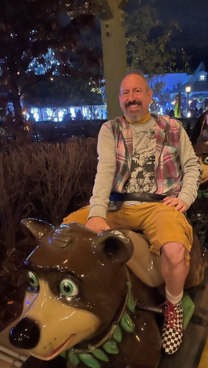 So Sunday we woke up and the weather cooperated in that it wasn't wet. . but it HAD gotten very cold. Park opened at 11. . but no one was in a huge rush to get to the park (all wiped out from yesterday) and besides, we were watching the temps and waiting for it to climb up high enough that things would actually operate. so I killed a little bit of time taking some morning pics. these were on almost every light switch, and I hadn't noticed them until this morning. OH MY! a better shot of the spiral staircase leading up to the upstairs loft (with the queen bunk beds, bathroom, pool table, deck, and arcade game) in front of the cabin keeping Amy company while she smoked view from the parking spot. from our decks we saw Flying Eagle start to cycle, so we headed to the park - with Cinnamon Bread on our minds - and got there just around 12:15 if I'm not mistaken. as we were headed to the Cinnamon Bread, we saw Lightning Rod had a 5 minute wait. . so we detoured over that way, and got in line. and as we climbed the stairs, heard a groan from above us, and people started exiting past us out of the line. We asked what happened, and LR had a roll back. and the people were stuck at the launch. we waited a moment to see if they could resolve, but when they started walking out to the train to evac? we called it and just went over to get Cinnamon Bread (as the digital signs in the park said LR was temporarily unavailable). got pics of the train sitting at the bottom of the launch tho - not blurry, as it wasn't moving how had I not seen the weird statues thruout the park yesterday?? kids riding on trees all over in this section while headed to the Grist Mill for Cinnamon Bread there was still a line - even tho the park was EMPTY (due to the cold). . but way shorter than last night. So we got in line. YUM!!! it was so cold, we actually went to the BarBQue place across the walkway - with the heated dining area- where some in the group bought food, so we could sit and eat in the heated area. so good! (and reheated well. . since I ended up taking 1/2 of my loaf home and it still tasted great 2 days later, after 5 minutes in a 350 oven). proof I had official Dollywood Cinnamon Bread we continued around the park, and I think we may have stopped at Blazing Fury for another ride. . but today really was about getting the few things missed yesterday, and Londyn shopping and riding the kiddie stuff. so really 1st on the list was Firechaser Express. not a walk on, but only 15 minute wait today. it's a fun family coaster, that looks way more extreme (and high) than it is. The backwards section is short, but memorable, and I enjoyed it. Didn't think it was great enough to get back in line to ride again, but I'm glad I got to ride it. Amy had missed out on Mystery Mine last night, as only Joseph and I had ridden it - so we headed that direction next. stopping for Photo Ops as I passed them tho, of course the old section of track still remaining is behind this tower. That "U" shaped wave turn. it's weird they left it.. but also, I kinda like it. we didnt' get to ride tho, because as we walked up, we saw them walking people from the back area (a group of girls) and the front of the ride was closed off. hurm. . . Oh well, I had gotten to ride it yesterday, and the only thing I really had remaining on my list was DropLine (which is close by). No one else wanted to ride, so I got in the walk on line. . and the group of girls we had seen coming out of Mystery Mine ended up right behind me. So I asked them if they had been evacced, and they freaked out telling me yes! and from the Vertical lift. that they had used a cherry picker to get them out of the train, and it freaked them out. but the park had given them skip the line passes. (not that it mattered, it was so cold park was dead). So that's two now that had to have people walked from down coasters - I have to assume the cold weather was affecting? anyways, DropLine was fun - tho very short. and it does have the added seatbelt restraint now. And oddly, the operator was discussing the Orlando drop tower incident with the guys sitting next to me on the ride (it came up because one of them was telling his friend someone had been injured on this ride and that's why it had been closed earlier this year). more polar bears around DropLine's setting. . which I hadn't noticed yesterday, as they were just glowing blobs by the time we came by here in the evening. I like this pic tho as you can see Thunderhead and the new Bear Mountain coaster in the background (along with the flyers). it really was a bit too cold to ride anything, and folks were just meandering. . . . luckily LOTS of photo ops all over the park. i particularly love this pic. Thru the trees! I wanted a daytime ride on Thunderhead even tho it was cold, and others were willing. . .so we headed over that way to get our ride. Londyn was excited because Whistle Stop Chaser is right next to it. . so she got to ride that 3 times. . . riding with most of us in the group. here's my turn. . pic courtesy of Xander. and then we go to go on Thunderhead. SUCH a great coaster, tho it was running a bit rougher during the daytime than it had been the night before. I still think it was fantastic, but some in the group said it hurt their back a bit. whee!!! more photo ops. . . we knew with the light crowd today, we wouldn't have any issue getting into the "headline" show, and sure enough, it wasn't a full auditorium for Christmas in the Smokies. it's an indoor theater, for an ~1 hour show. . so we went for it. very well done, with some really nice voices, and carols. (and way less Jesus-y than I had expected (I thought it was the story of Jesus, really). . . Amy said for that we'd have to watch the Nativity show) the show is. . . odd tho. it starts out with a story - folks coming home to the Smokies for Christmas, and visiting family, and singing. . then they all go sledding. . . then there's a cabin inside a church. . then Jesus is 
