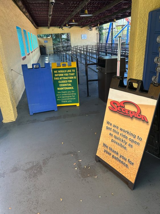 Small update from today. Crowds were minimal as usual for this time of year. Only Cheetah Hunt was more than 15 minutes. Work being done on Falcon's Fury. That's a good sign and I hope it opens soon. I went to see what was going on at Scorpion. Some signs up at the entrance. Scorpion's 2nd train on the transfer track, I don't think I have seen that on any visit to the park in the last year and a half since I moved to FL.1 point