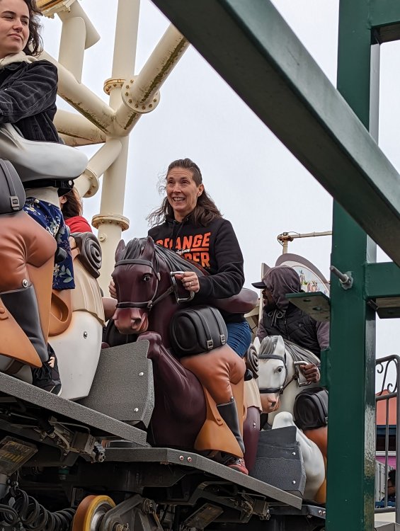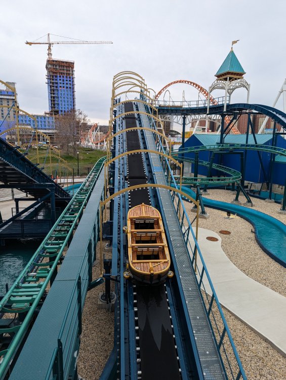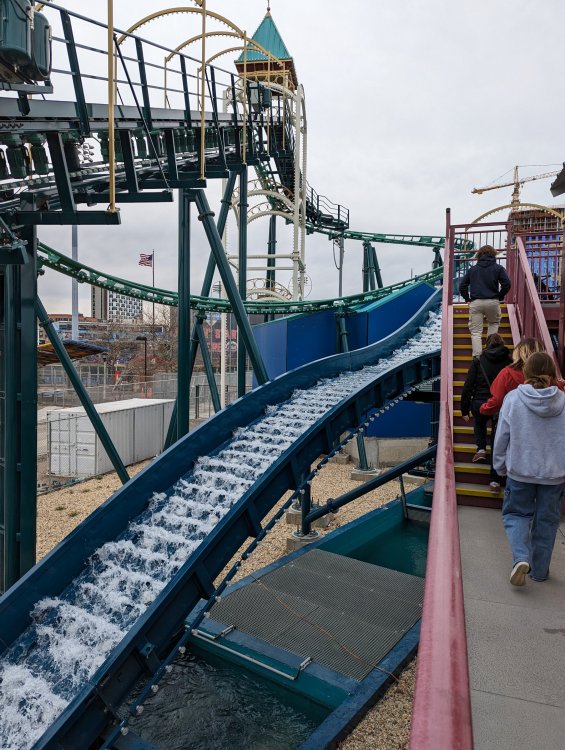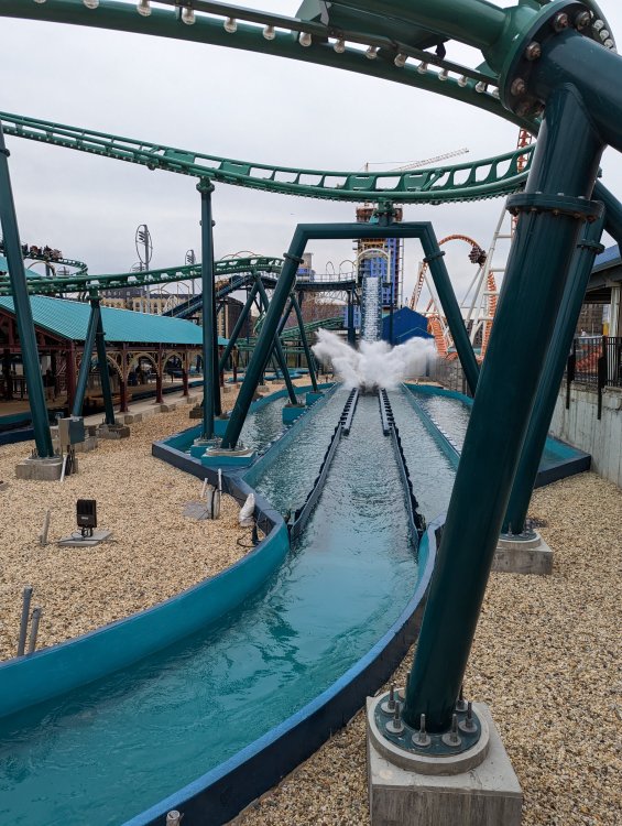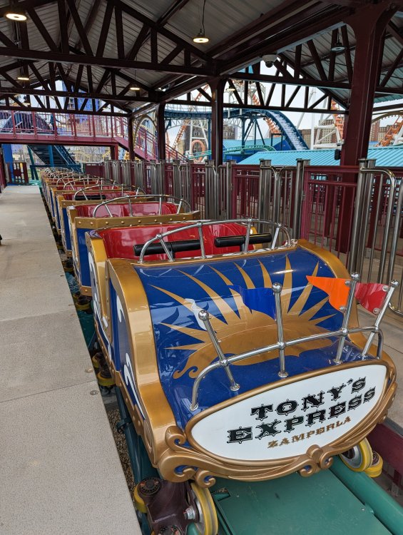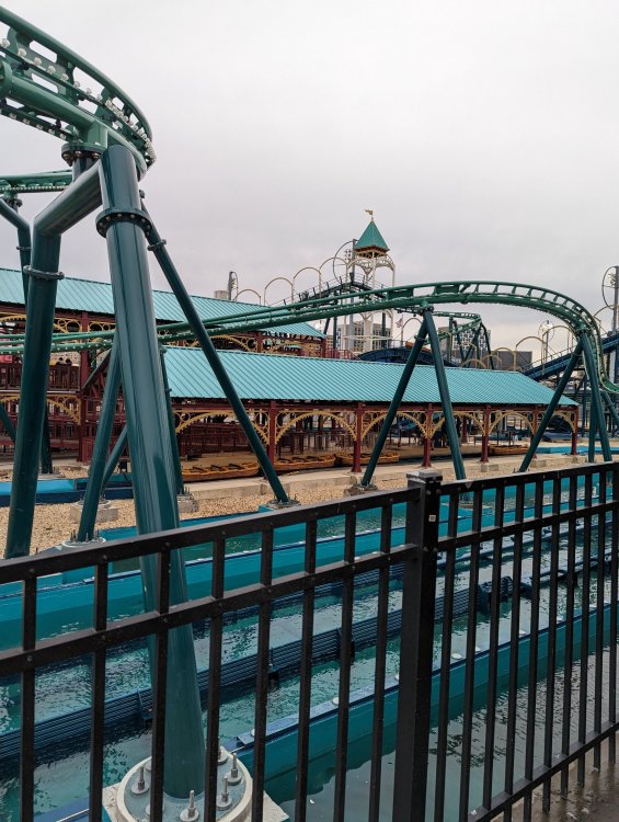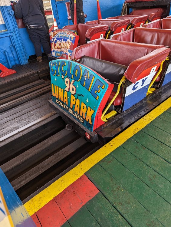 Got to experience Luna Park at Coney Island on opening day with the family (on our way to Sweeney Todd -- Broadway perfection). Two of us had been before and the other three hate NYC, so I had low expectations. I'm very glad to say we had a great day and the "other three" in the family really enjoyed the whole Coney Island area. [Quick note: from Connecticut/northeast, there is no good way to get there. We ended up driving in and I'm happy to say there is a lot of parking around Coney Island. The subway from the Times Square area to Coney is about an hour each way.] I did not get many pictures because I'm not a "trip reporter," though I avidly read them all. The new entrance plazas towards Tony's Express/Leti's Treasure are still under construction. Clockworkz and Zenobio were dismantled for maintenance (I would assume). Crowds were non-existent probably due to weather. We paid $65 for our 4-hour wristbands a couple days ahead online. At the gate they were selling for $75. I didn't look at individual rides/tickets. Cyclone is nearly 100 years old! On our way to the new area, we passed the mermaid painting ... ... who is wearing a Fremeni stillsuit? (nerd joke) So Tony's Express and Leti's Treasure share a large station structure. We saw maybe two people ride the flume -- we did not, because it was barely 50 degrees. The boats were coming back very wet ... We did ride Tony's Express twice, and I'd say it's a great kiddie/family coaster with a really nice helix finale over the flume: I got permission to walk to the front of the station (and I have to say, overall the employees at Luna Park, at least today, were really friendly!) The Leti's boats are also nicely done: As you exit Tony's you walk right by the double down drop on Leti's Oh, and we rode Thunderbolt once, it was having periodic maintenance issues during the day. No pictures, but 1) it doesn't suck as bad as I'd heard, and 2) the splash from the final drop on Leti's actually reaches into the station for the Thunderbolt. And one more thing: Soarin' Eagle was enjoyable! Rode it once before, hated it. Twice on this trip and actually thought it was fun. No idea why. Final picture is my wife enjoying the launch on Steeplechase (posted because I love the coaster cars and to show the launch is actually a bit more than expected!)1 point