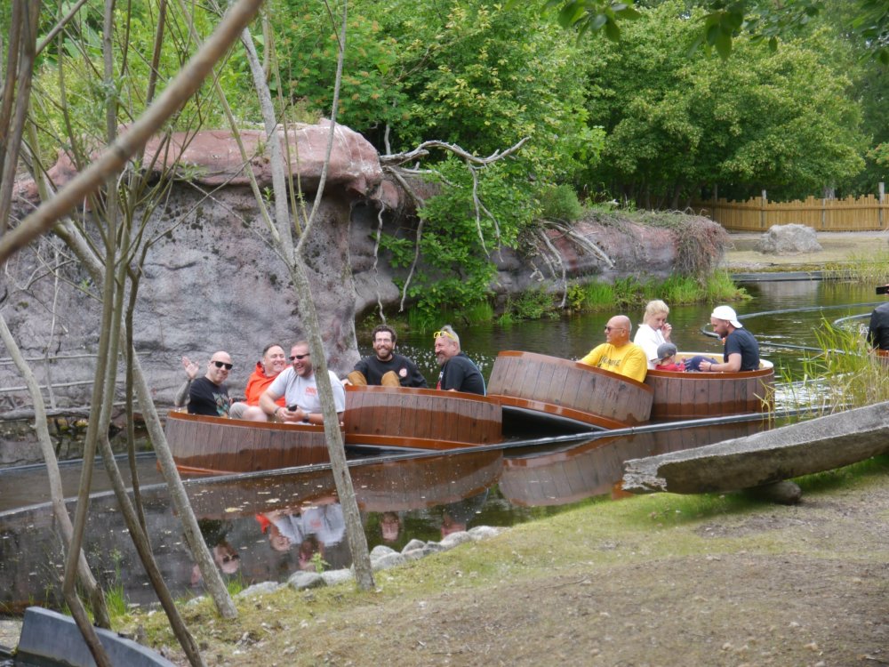 Day 16: Sunday, June 18th part 1 (of 2) - a park no one had ever been to, Furuvik - and a surprise bonus on the way back to the hotel! the next morning, we got up from our hotel, and filed onto the bus for a drive out of the city. and pulled up - right off what seemed to be a major highway - to a new park for everyone on the trip (including Robb & Elissa): Furuvik this is similar to Kolmarden in that it is mainly a zoo, but has some amusement rides and rollercoasters. . and it had been in the news fairly recently due to a horrific story regarding the Chimpanzees (that the park was known for - they were a main Chimpanzee research facility in Sweden prior to this) that escaped the enclosure and resulted in several injuries and the deaths of multiple primates. We did not ask about the story, and figured it would not be talked about - but it actually was mentioned by some of the park folks we talked to. and there was this memorial out front of the main entrance. (not sure if it was Furuvik sanctioned, but they were allowing it to be there - with the names of the 4 chimps that had died in Dec 2022). the actual main gates of the park. .and you can see front and center in the logo is a Chimp. . . looking back at the major roadway closeby before we went inside the park. it's a really large park, with some very lush areas. This was a theater we passed by on the way in, with a family show going on here during the day featuring the park's mascots: 5 cats. I never did get all of their names, but I WAS successful in meeting all 5 during our visit today I mentioned it's a large park? yup. .here's the park map oh.. did I mention the park Mascots are cats? yup. .they go ALL IN in places with the kitty cat theming. . a little hard to read, but I appreciate any park that attempts topiary/flower landscaping. Nice job by them. as I said, tho it's mostly a zoo, Furuvik does have an amusement park section (most over here in Scandi are identified by "Tivoli" areas). Based on this entrance area, it does appear that at one point the Amusement rides section was a separate ticket entry? but was all included now. various different rides over here. . some intense, some kiddie, but the majority of them "Family" rides. Sadly, this was the only Carousel on site tho. . . as a group tho, we headed for the Coasters first, as they were new to everyone! Lightning is a retro-looking family Vekoma Launch coaster, that was almost brand new - opening shortly before our visit. (I believe this sits where a Schwarzkopf Jet Star II used to be, named Rocket - that closed in 2021) nothing "EXTREME" here, but lots of twisty, twisty track. and a really fun retro station and train design. it went around twice, if I'm recalling correctly, and the 2nd time thru the station, it really pics up speed with the launch that increases the velocity the train already has going as it flies thru the station really great train design. . and part of the Control Panel for you freaks that like that. . . surprise surprise.. .Bumper Cars. (Swedes seem to LOVE their bumper cars). tho I did appreciate that this one had full "traveling Carnival" light package. . and every light worked. it was impressive when it got overcast how brightly this shined. a Disc-O and several games similar to we saw in Liseberg, where one could win a giant box of treats. next door was this wonderful shooting gallery - which for some reason you could win Octopus' at if you got a high enough score. I really enjoyed the choice of weapons. . tho I let down my Texas family by really sucking at shooting with most of the guns. this looked very similar to the one at Liseberg that had run the fairly tame program. . . simply called "Extreme" here. for sure wanted to ride it, but it required a certain number of riders before they could operate, so we'd have to come back later once the park opened to the public. instead, our guide, Dexter, led us over to the 2nd of the park's 3 roller coasters: Fireball - a Vekoma Family Boomerang. the theming here was quite nice, even if the ride wasn't an EXTREME ride. as a zoo, it's great that the "big" rides they have are mostly things the whole family can ride - even the smaller kids. whee!!! and next to it is a large shooting Dark ride - with some really amazing theming on the outside. but we didn't go to this one yet, there was still one more coaster here to get to as the park was opening up to general guests. Draken - a Zierer kiddie coaster but hey, new credit for everyone! as we got off our ride, and met to be released into the park (getting food vouchers, and being told what time to meet up later for the ride back). . I noticed - what's this? are those. . . mascots riding Draken with the 1st public riders? Yup! two of the 5 mascots found! make that 3 of the 5! and 4 of the 5 ! wow.. good timing to be there, just as the Mascots (well. . most of them) came out to start the day! now the park was open. . EXTREME had started running. we lined up - and tho still had to wait a little bit to get enough riders, were able to get a ride on it. Pretty intense, but I liked it. here's us on the ride - I believe pic courtesy of Erik, as we had to convince sMisty and Goldballs (as Erik calls him) to ride with us so we had enough people for the cycle. Despite my face, I liked it. and at the end of our ride, all the guys hopped off, causing the "arm" to raise up, leaving sMisty stuck in the seat way far off the ground (whoops!!) luckily, they have a step stool there, just for these situations all the big rides done (that I cared to ride), it was time for the spookhouse! fun animatronic in the queue line explaining how the guns work (in Swedish, but we figured it out). AMAZING boarding area. . . so cool. we were starting to get a little hungry, as we hadn't had much for breakfast this morning (I believe the Hotel had given us some pre-made bags, since we left so early, so didn't do the hotel breakfast this day). so we looked at the options for food, and most of the f