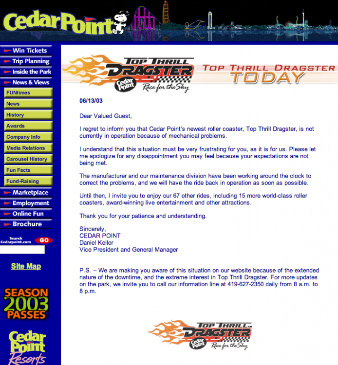 Well... that's from the old Dragster status page they had back in 2003 since TTD was closed more than 50% of the season, so Pipe Scream was just a Pipe Dream back then. -